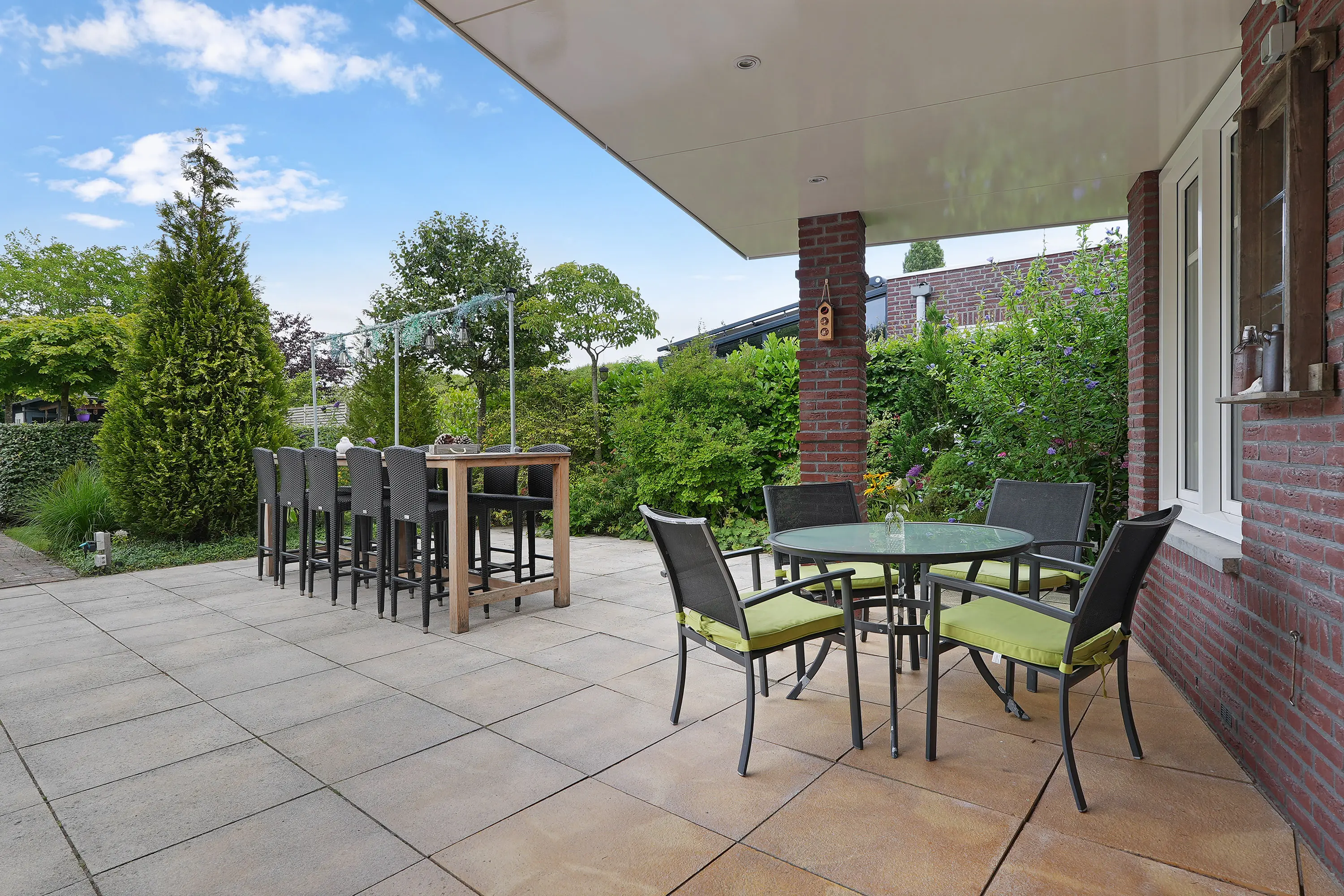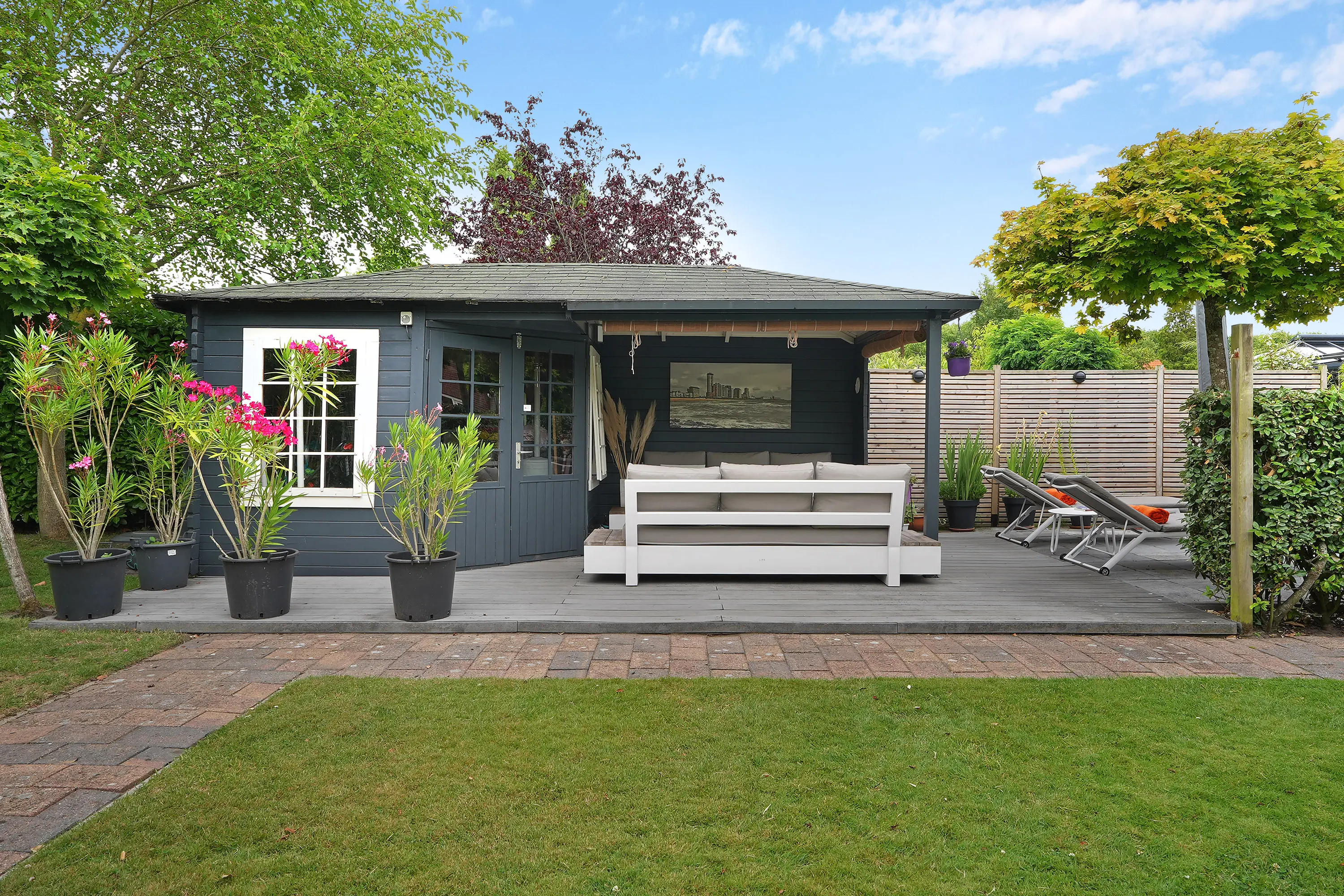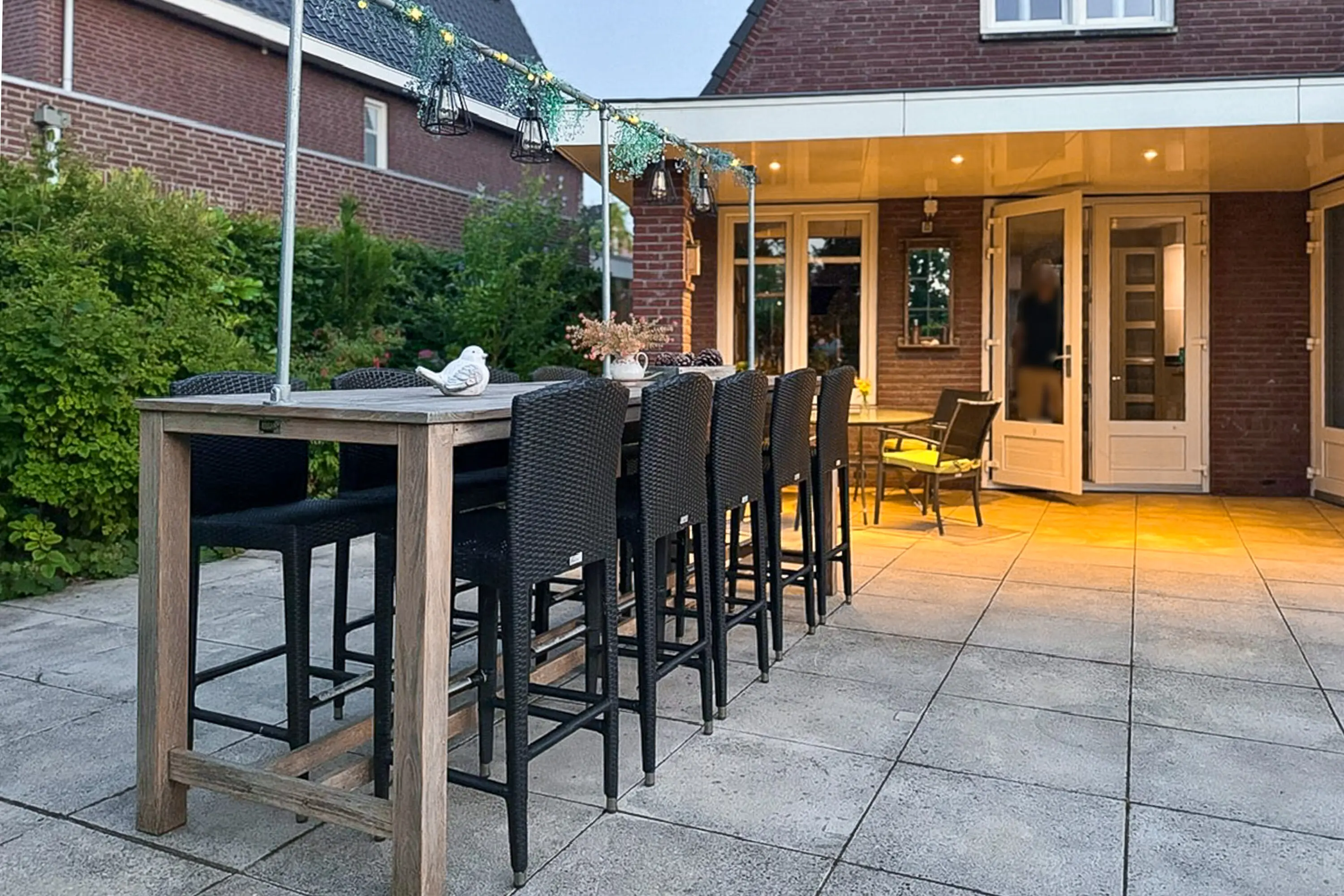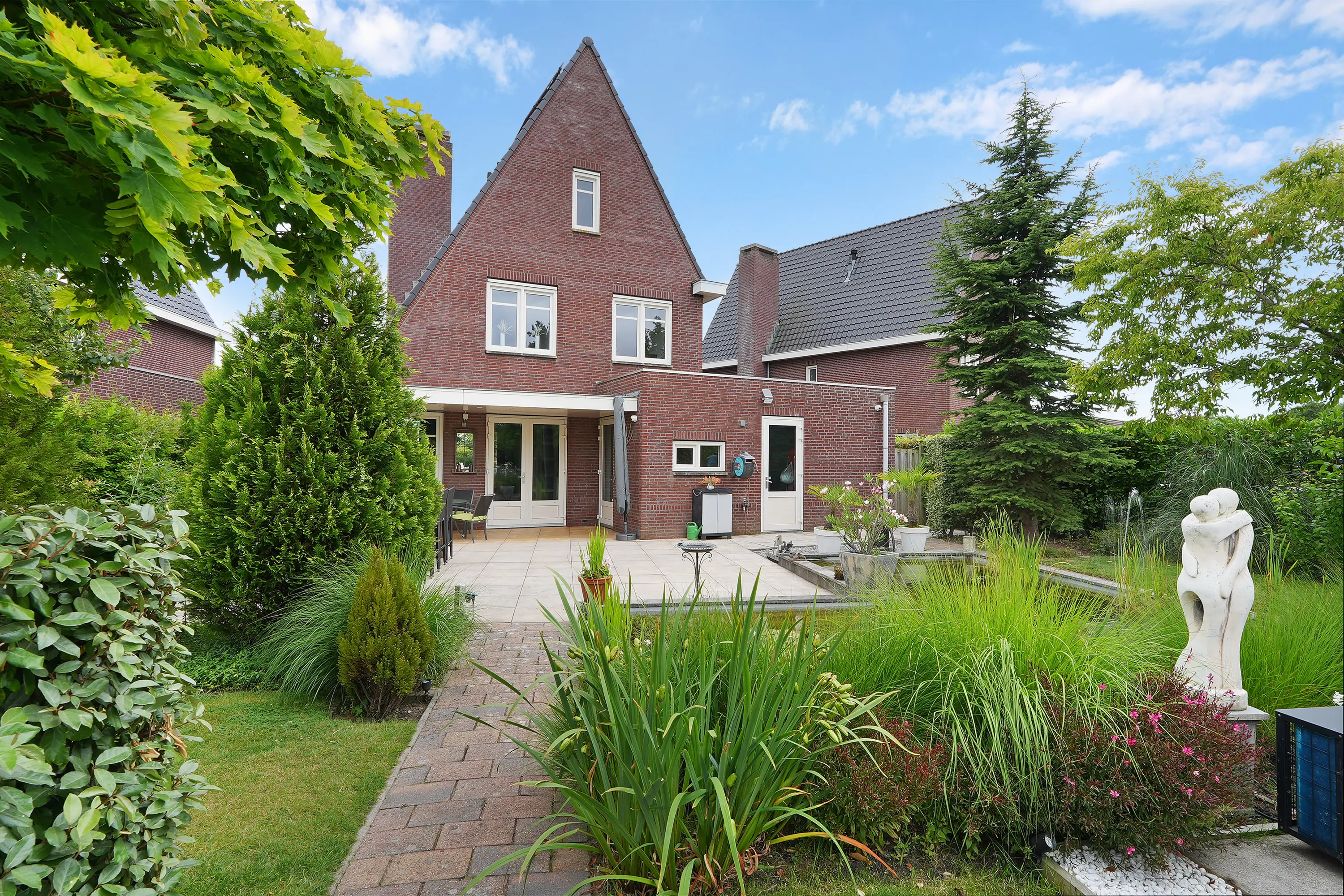 De tuin is bereikbaar door middel van openslaande deuren en bijzonder vrij gelegen met uitzicht op een groene bosrand. Dankzij de royale omvang geniet u hier van bijzonder veel privacy en zon, terwijl het weidse uitzicht op het omliggende groen zorgt voor een uniek gevoel van ruimte en rust. De tuin is onder architectuur aangelegd en zorgvuldig ingepland, met een fraaie balans tussen sierbestrating, groen en zitgelegenheden. Een heerlijke plek waar u het hele jaar door kunt ontspannen en genieten van het buitenleven. Direct aan de achtergevel bevindt zich een langwerpig overstek met tuinverlichting waar u heerlijk kunt genieten van een keurig aangelegd terras. Halverwege de tuin geniet u van een sfeervol tuinhuis met overkapping.