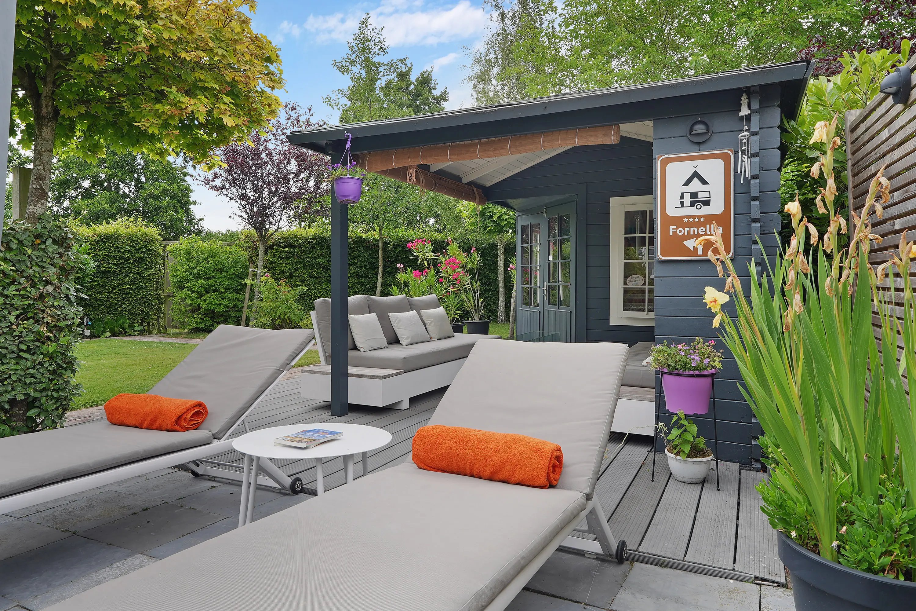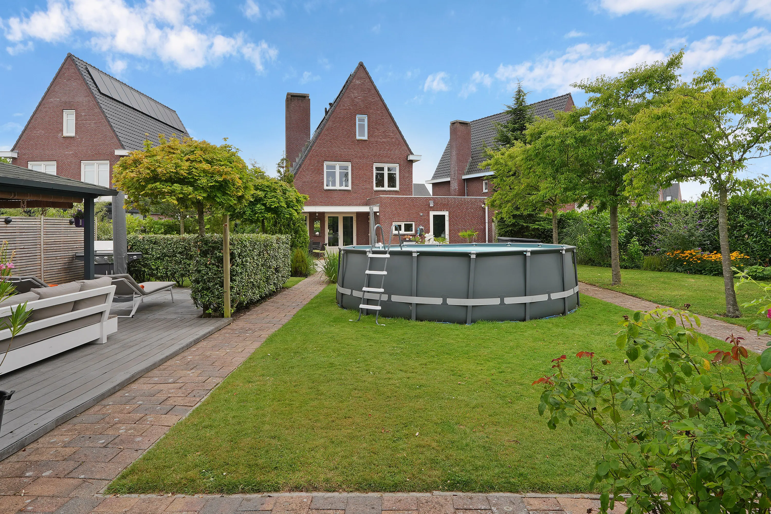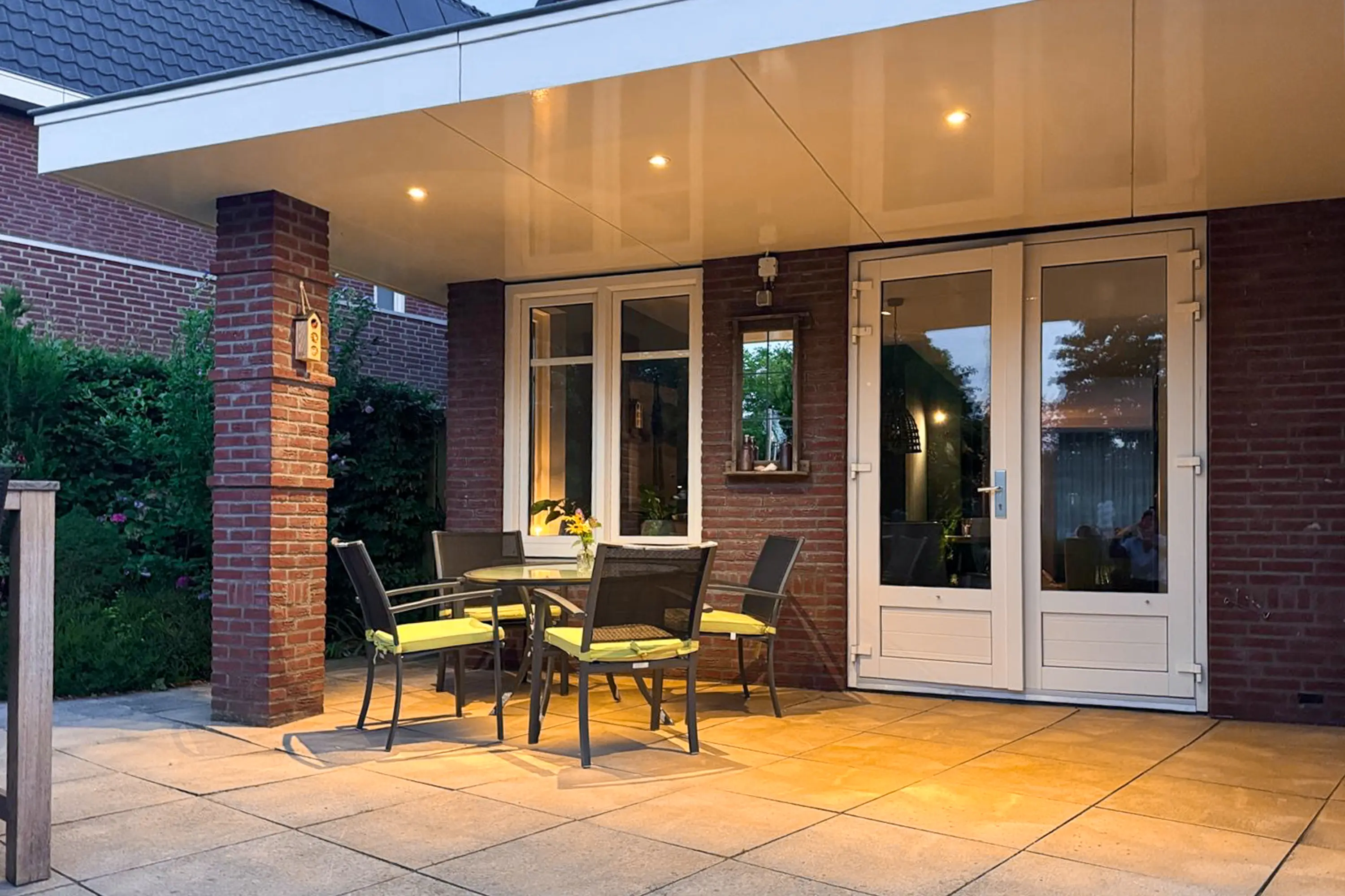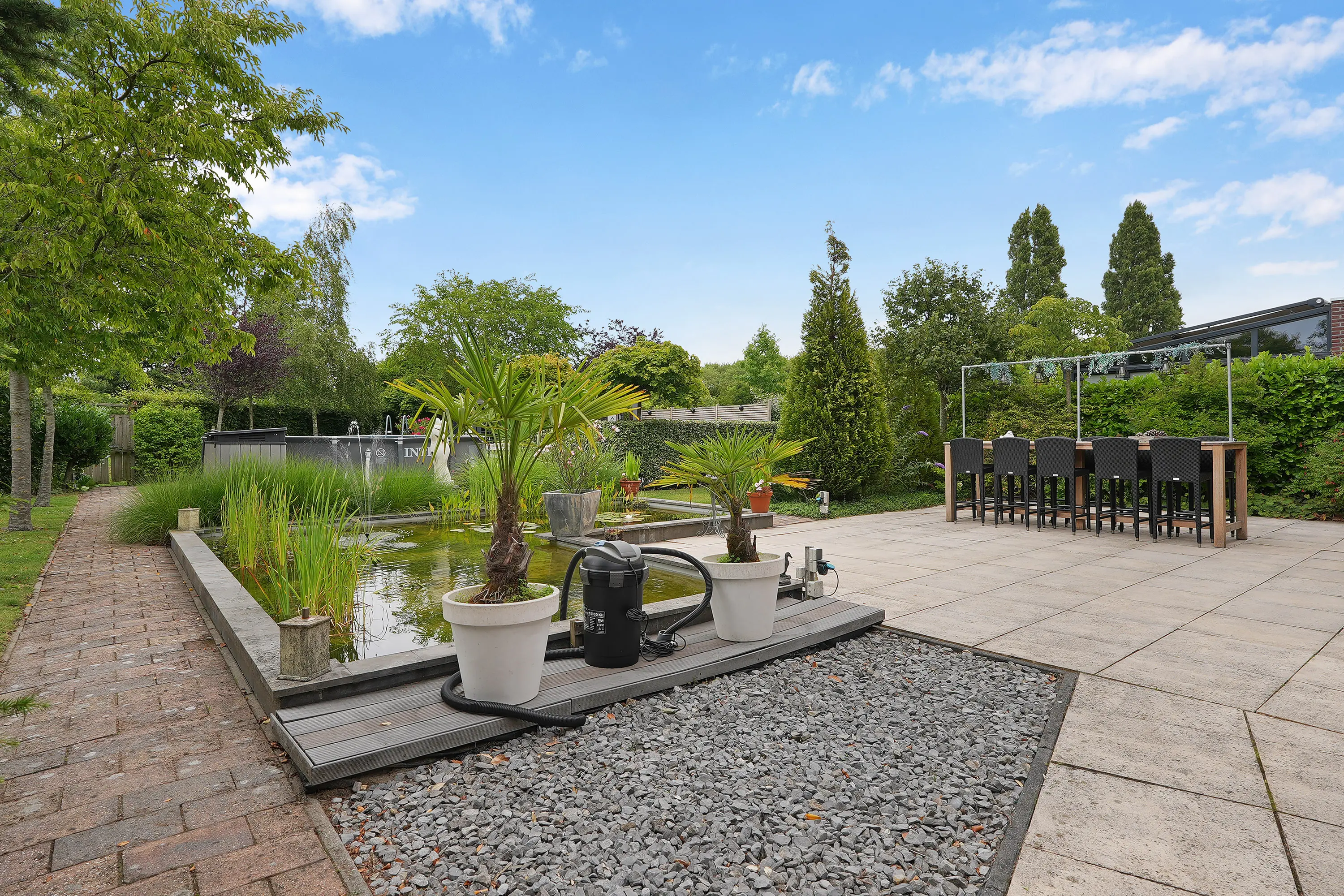 De tuin is bereikbaar door middel van openslaande deuren en bijzonder vrij gelegen met uitzicht op een groene bosrand. Dankzij de royale omvang geniet u hier van bijzonder veel privacy en zon, terwijl het weidse uitzicht op het omliggende groen zorgt voor een uniek gevoel van ruimte en rust. De tuin is onder architectuur aangelegd en zorgvuldig ingepland, met een fraaie balans tussen sierbestrating, groen en zitgelegenheden. Een heerlijke plek waar u het hele jaar door kunt ontspannen en genieten van het buitenleven. Direct aan de achtergevel bevindt zich een langwerpig overstek met tuinverlichting waar u heerlijk kunt genieten van een keurig aangelegd terras. Halverwege de tuin geniet u van een sfeervol tuinhuis met overkapping.