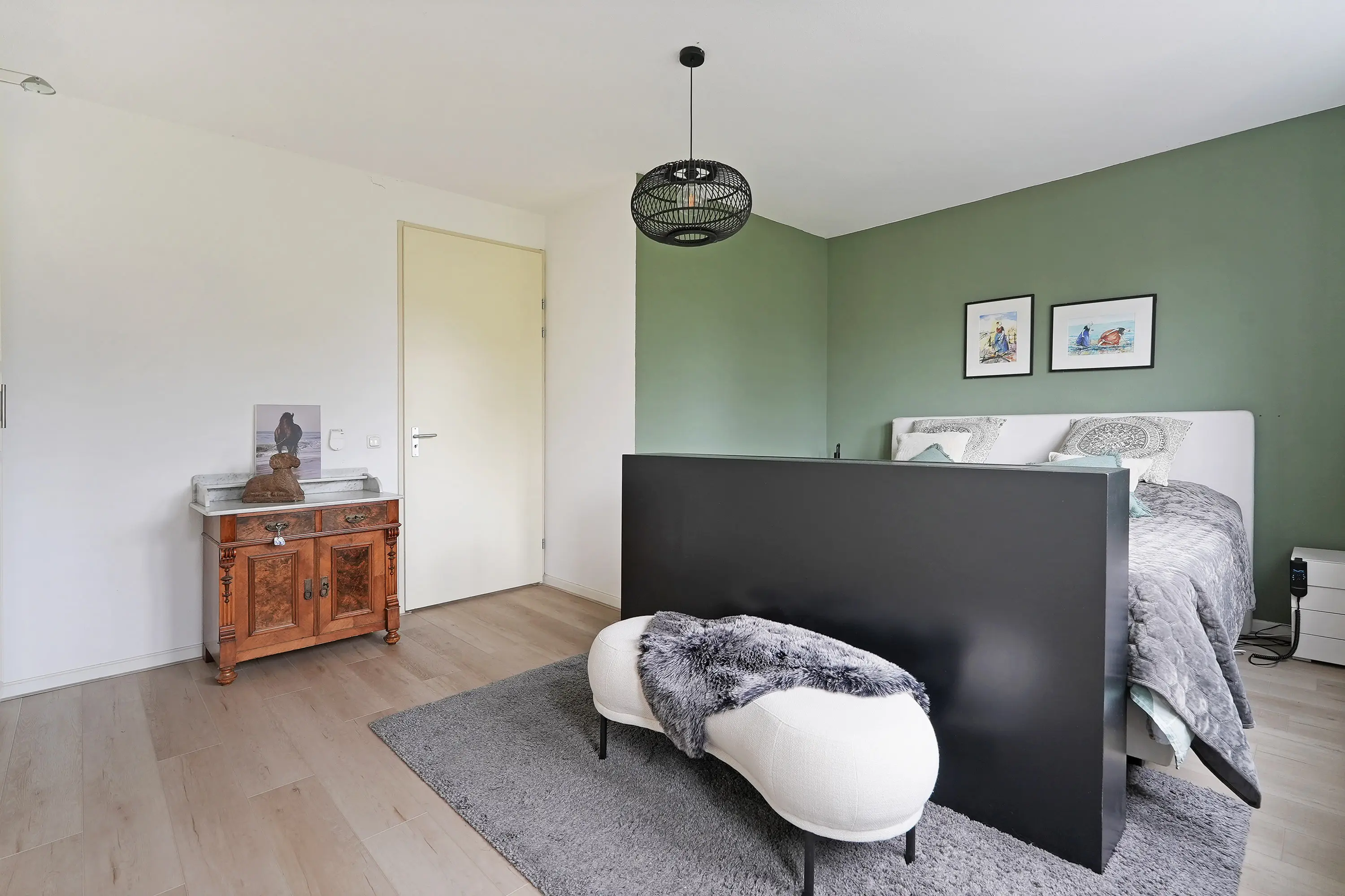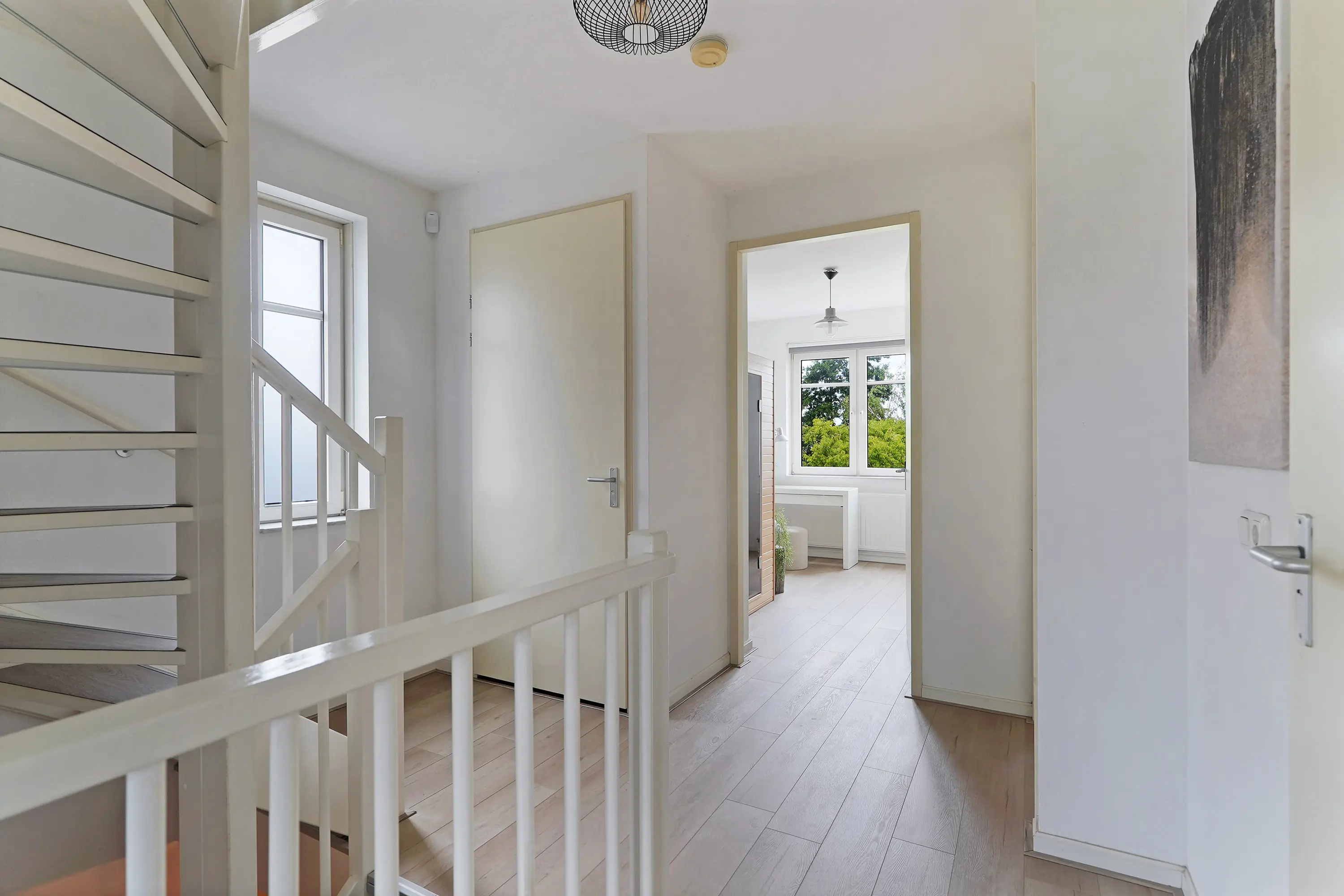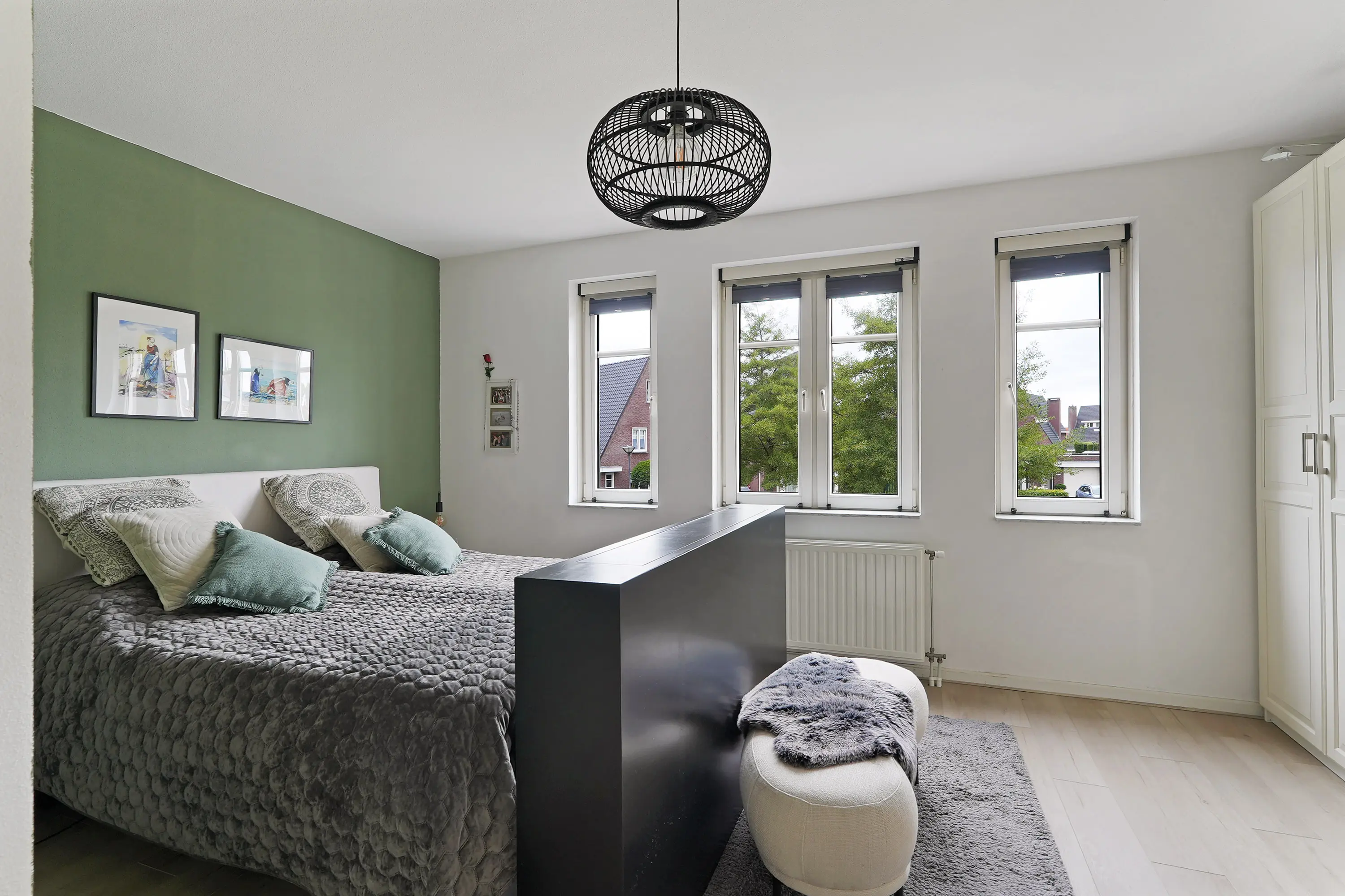 De degelijke trapopgang leidt u naar de eerste verdieping. Vanaf de ruime overloop heeft u toegang tot drie slaapkamers, allemaal royaal bemeten en licht. De ouderslaapkamer is zonder meer ideaal te noemen; een kamer van indrukwekkende omvang die de gehele breedte van de woning beslaat. Hier heeft u niet alleen ruimte voor een kingsize bed, maar ook voor een eigen loungehoek. De badkamer is prettig van formaat en beschikt over een ruime inloopdouche, dubbele wastafel en heel fijn; over natuurlijke lichtinval. Via de overloop is eveneens een separaat 2e toilet bereikbaar.