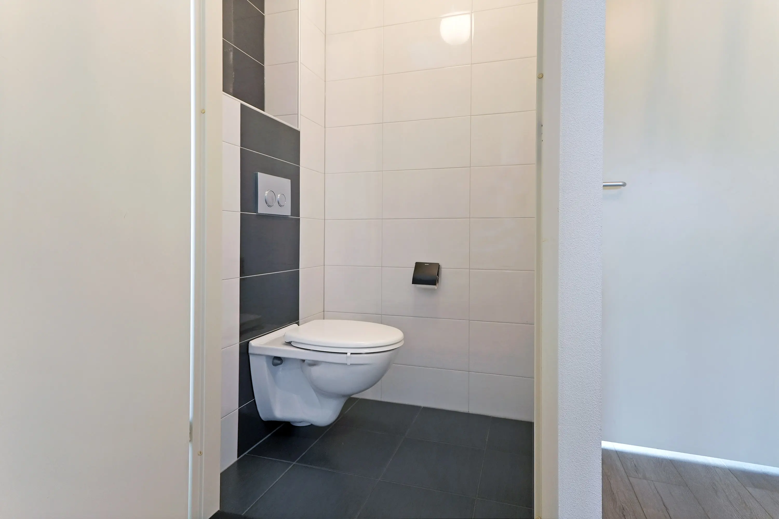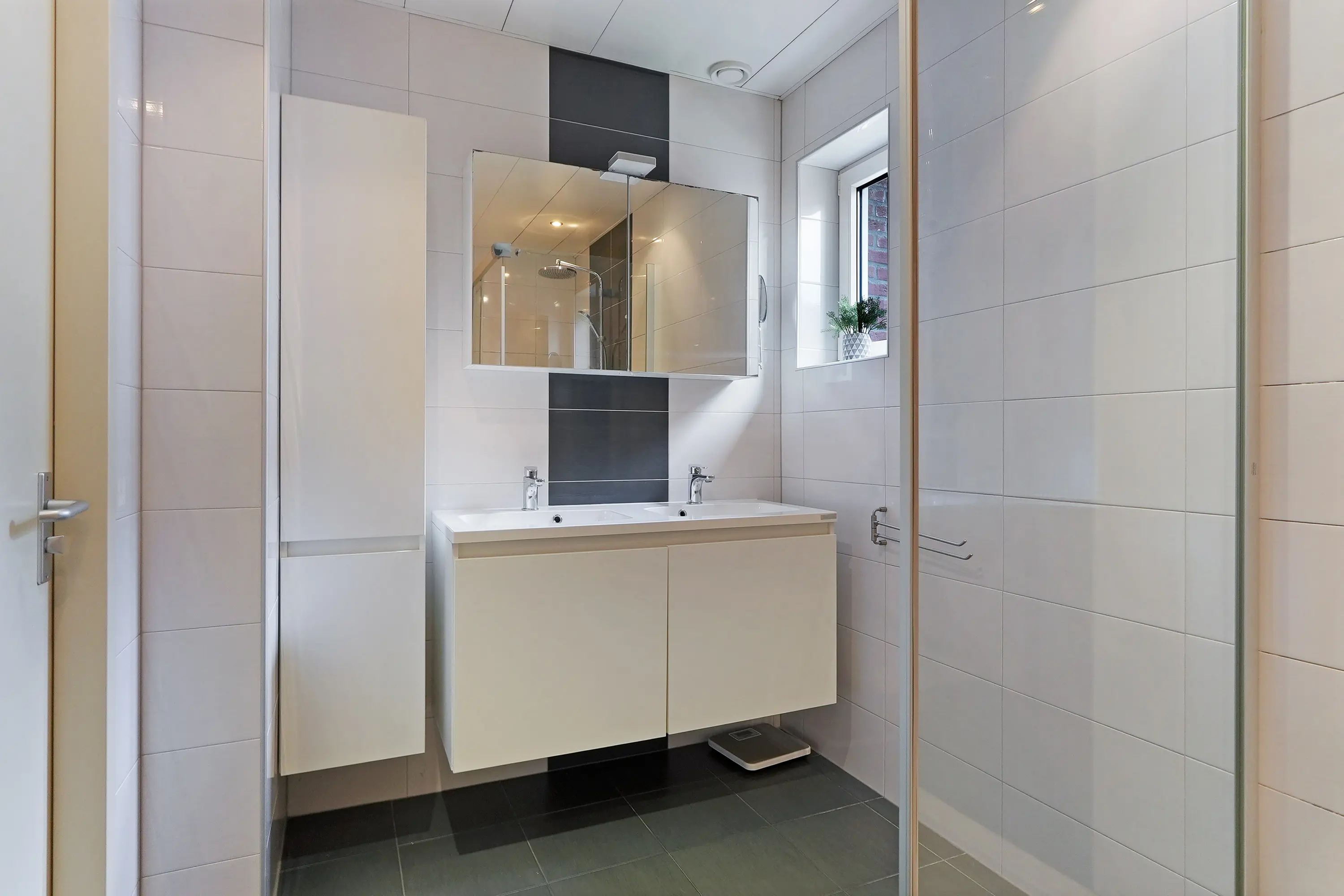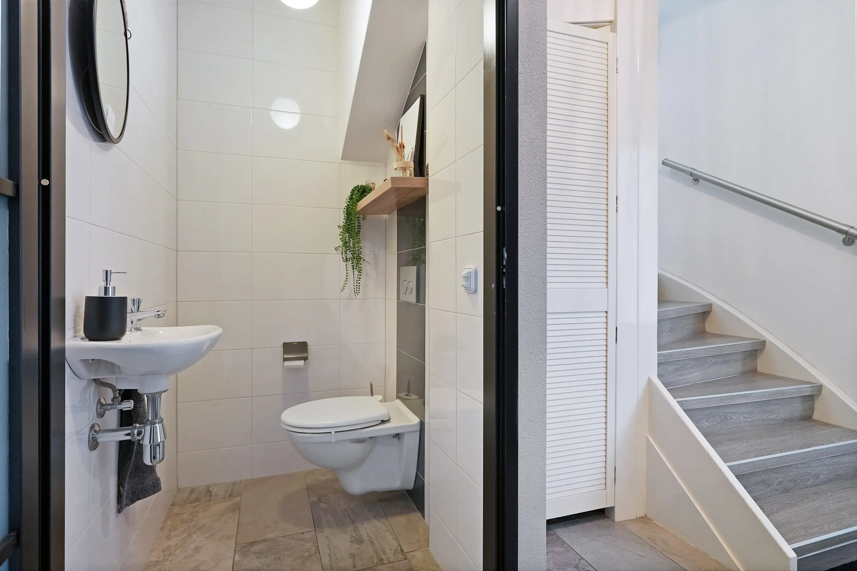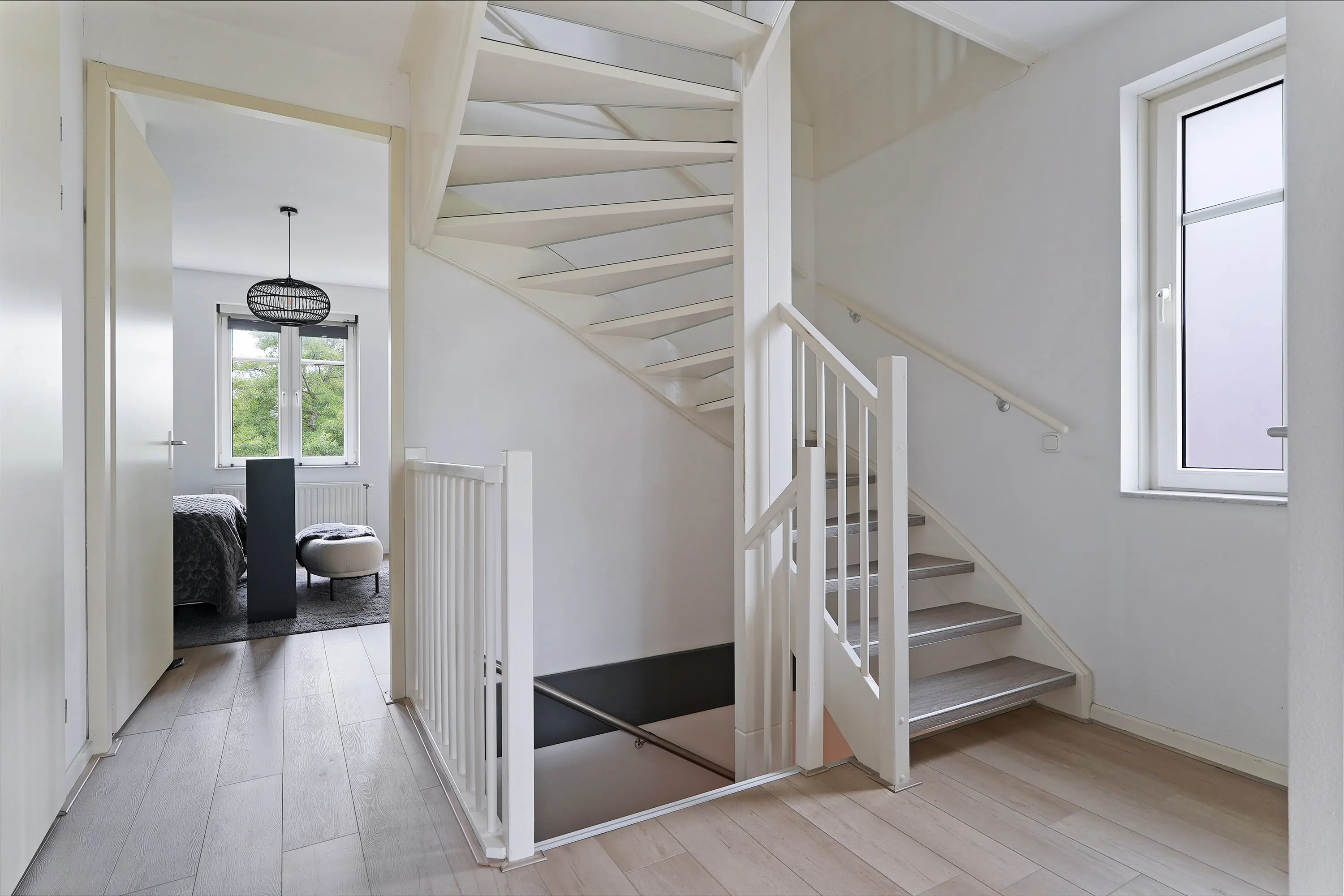 De degelijke trapopgang leidt u naar de eerste verdieping. Vanaf de ruime overloop heeft u toegang tot drie slaapkamers, allemaal royaal bemeten en licht. De ouderslaapkamer is zonder meer ideaal te noemen; een kamer van indrukwekkende omvang die de gehele breedte van de woning beslaat. Hier heeft u niet alleen ruimte voor een kingsize bed, maar ook voor een eigen loungehoek. De badkamer is prettig van formaat en beschikt over een ruime inloopdouche, dubbele wastafel en heel fijn; over natuurlijke lichtinval. Via de overloop is eveneens een separaat 2e toilet bereikbaar.