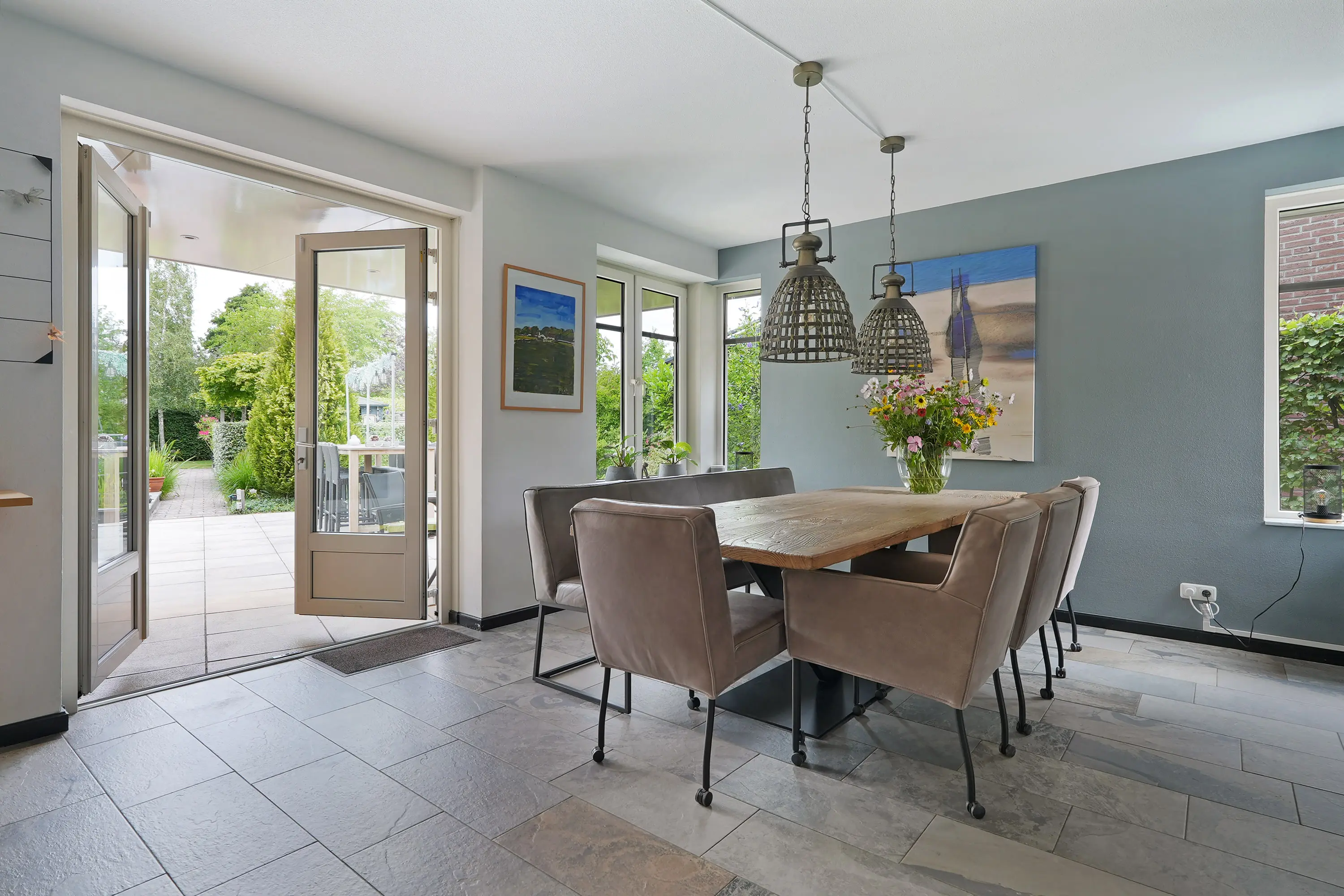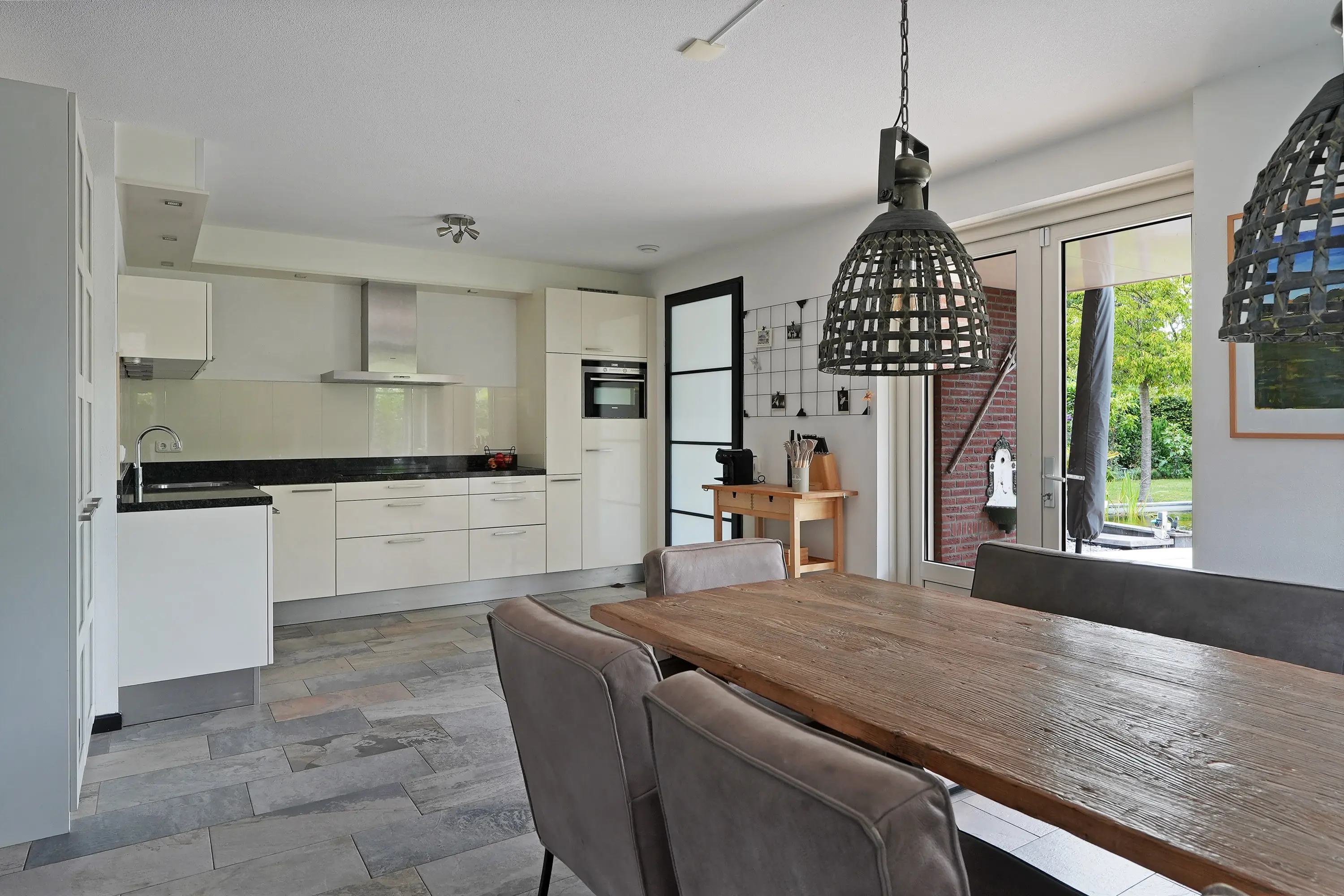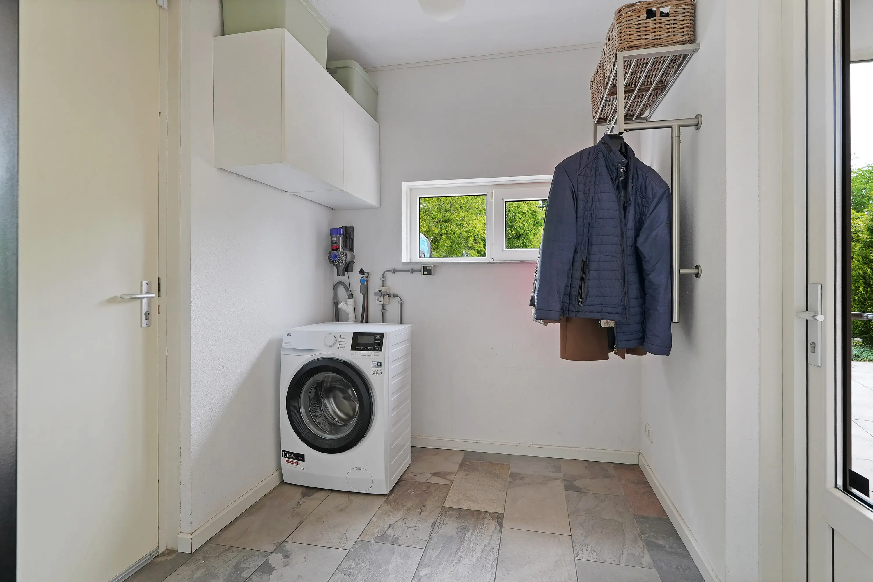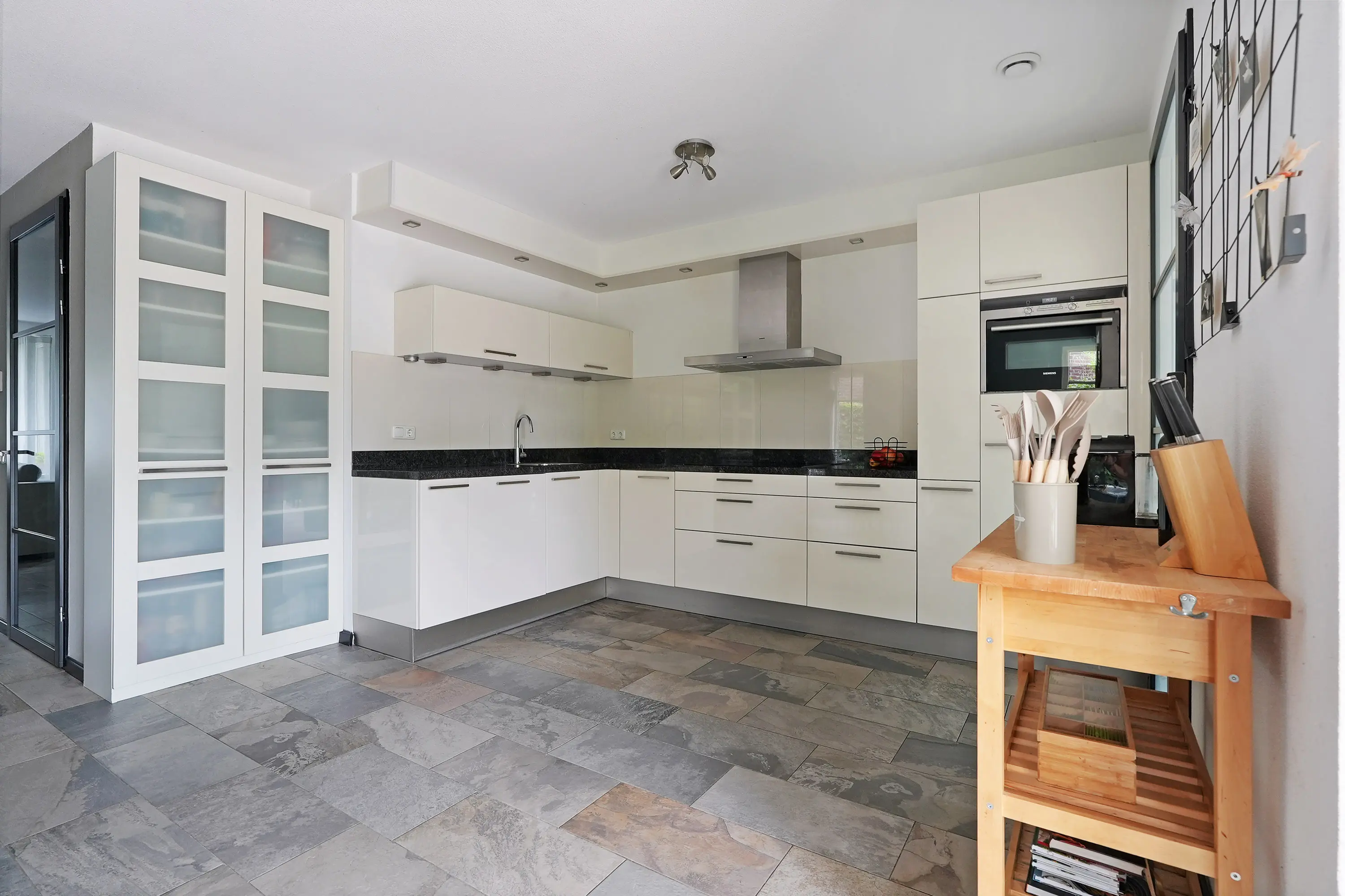 De royale woonkeuken treft u aan de tuinzijde. Door het ontwerp van de woning, waarbij de achterzijde breed is uitgevoerd, ervaart u veel leefruimte. De keuken is uitgevoerd in een ruime hoekopstelling met lichte kastfronten en een granieten werkblad. Uiteraard beschikt de keuken over de gewenste inbouwapparatuur. Aansluitend aan de woonkeuken bereikt u de bijkeuken, voorzien van wasmachine- en drogeropstelling. De bijkeuken is middels een interne verbinding verbonden met de geïsoleerde garage, welke eveneens op niveau is afgewerkt en voorzien van een geïsoleerde elektrische bedienbare sectionaal/deur. Via de openslaande deuren in de achtergevel bereikt u de riante en ideaal gesitueerde tuin.