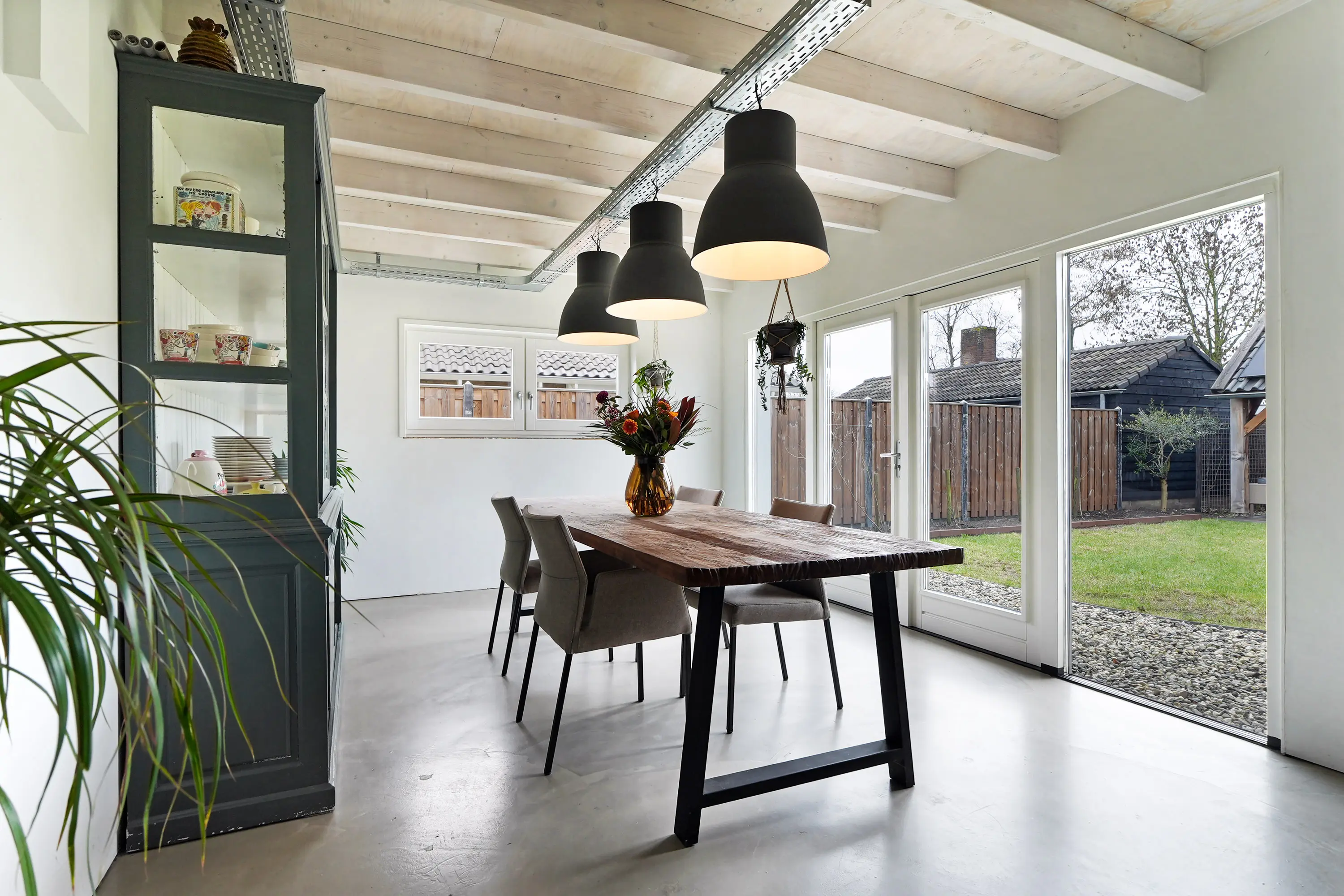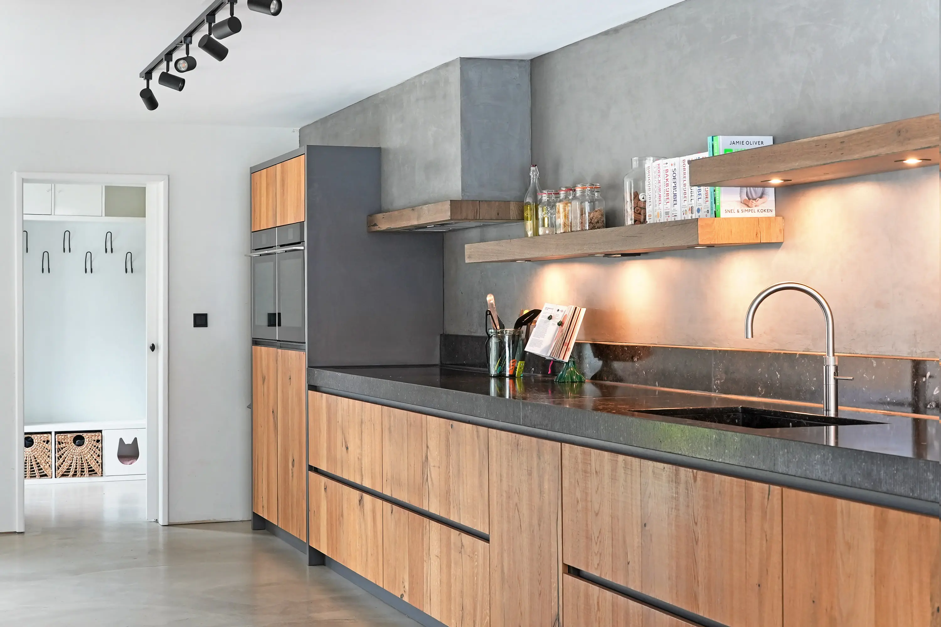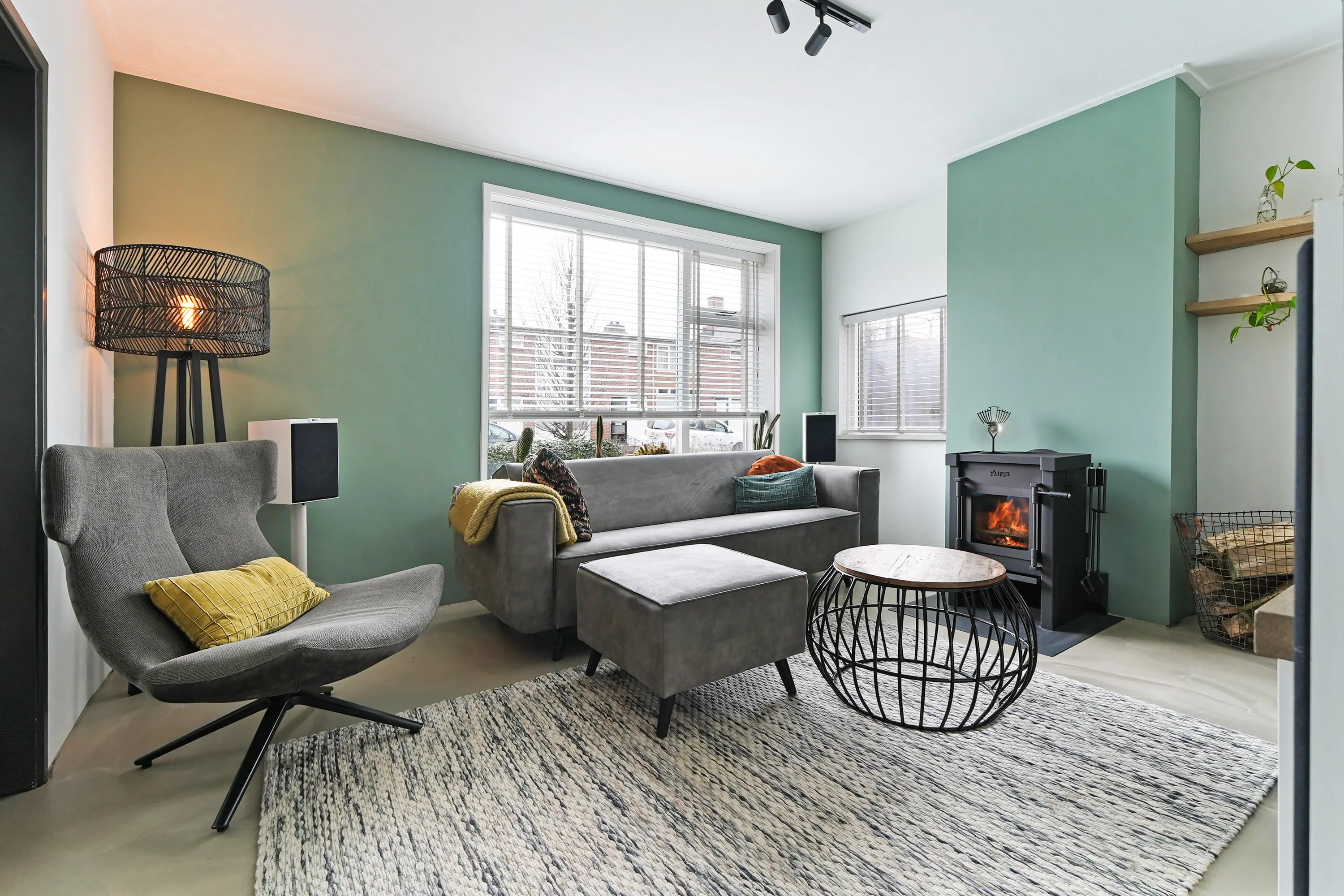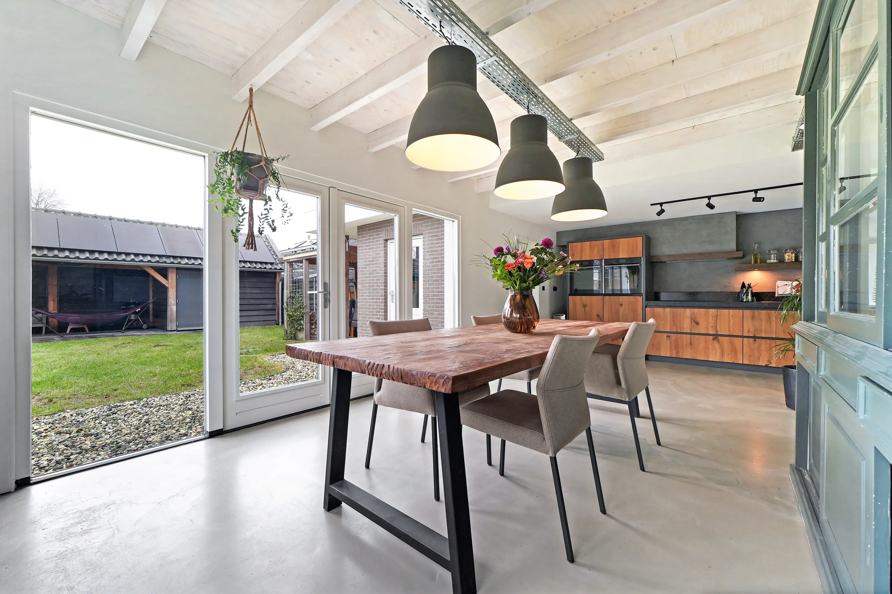 Entree in de smaakvolle hal met (uitgebreide) meterkast, chique toilet, kastruimte met warmtepomp, trapopgang naar de eerste verdieping. Vanuit de hal is zowel de royale woonkeuken als de woonkamer te bereiken. De woonkamer ademt direct bij binnenkomst ruimte en sfeer. De doorlopende gietvloer en charmante ensuite deuren verbinden de sfeervolle zithoek met houtkachel aan de voorzijde met de royale woonkeuken aan de tuinzijde. De plafondhoge raampartijen zorgen voor veel licht en een prachtig zicht op de tuin.