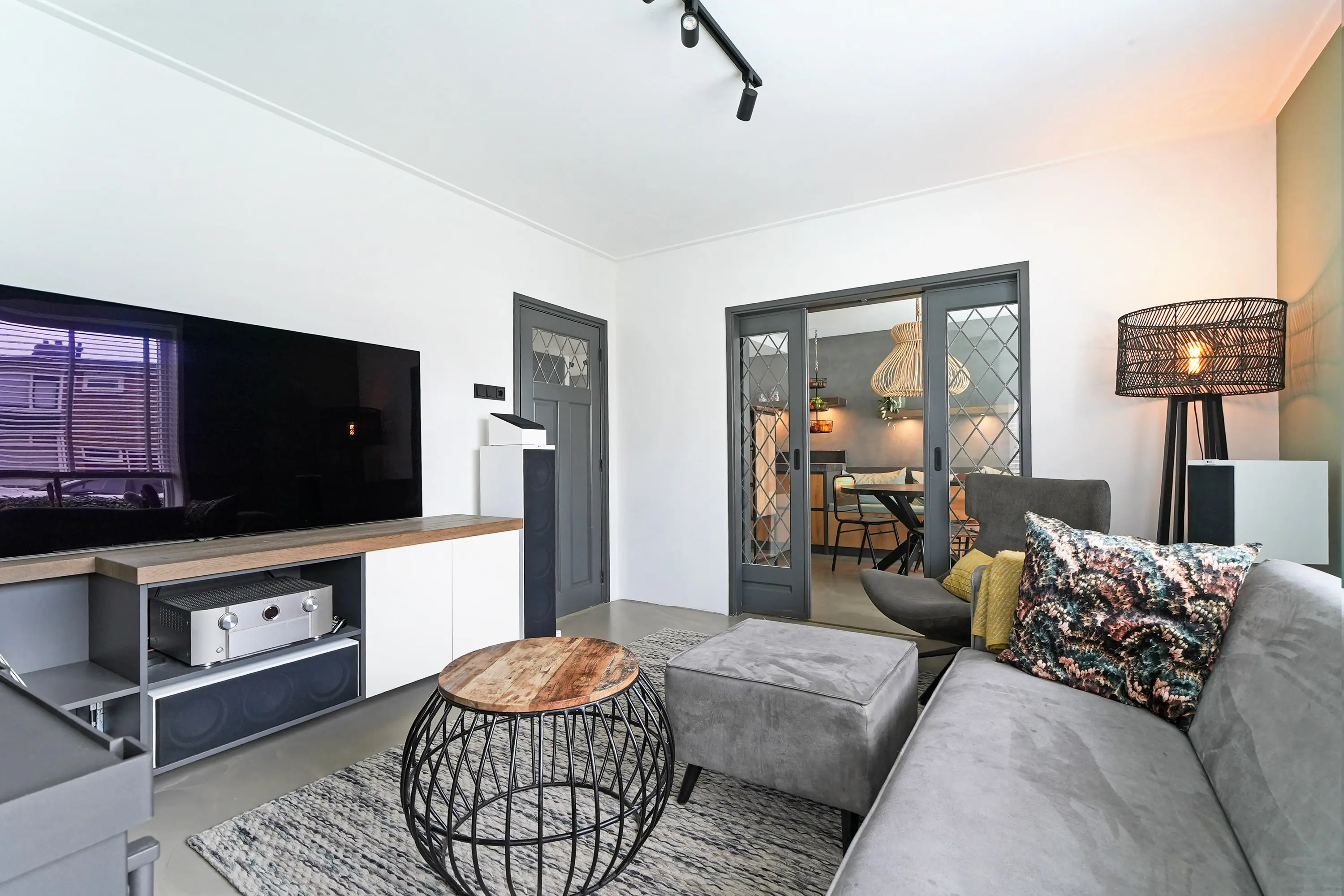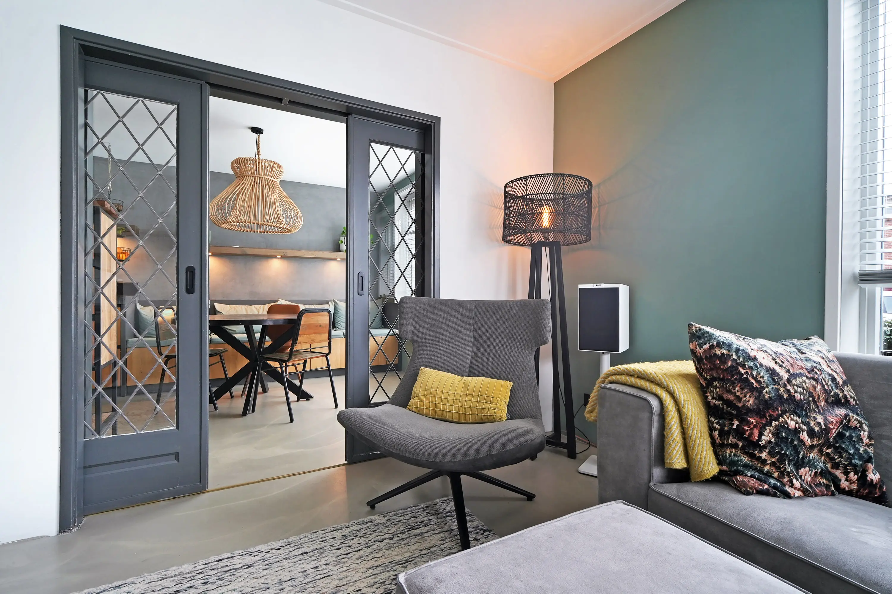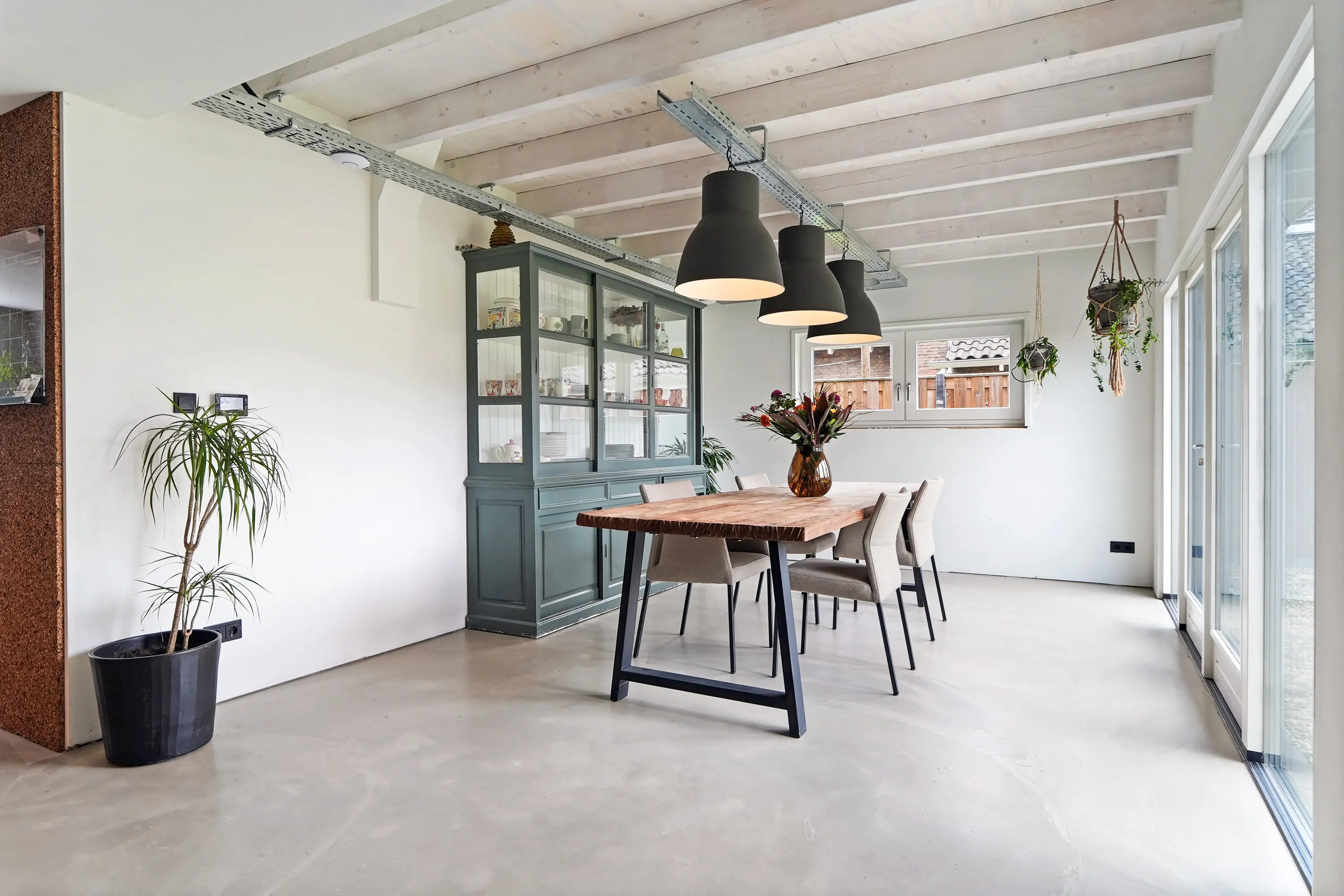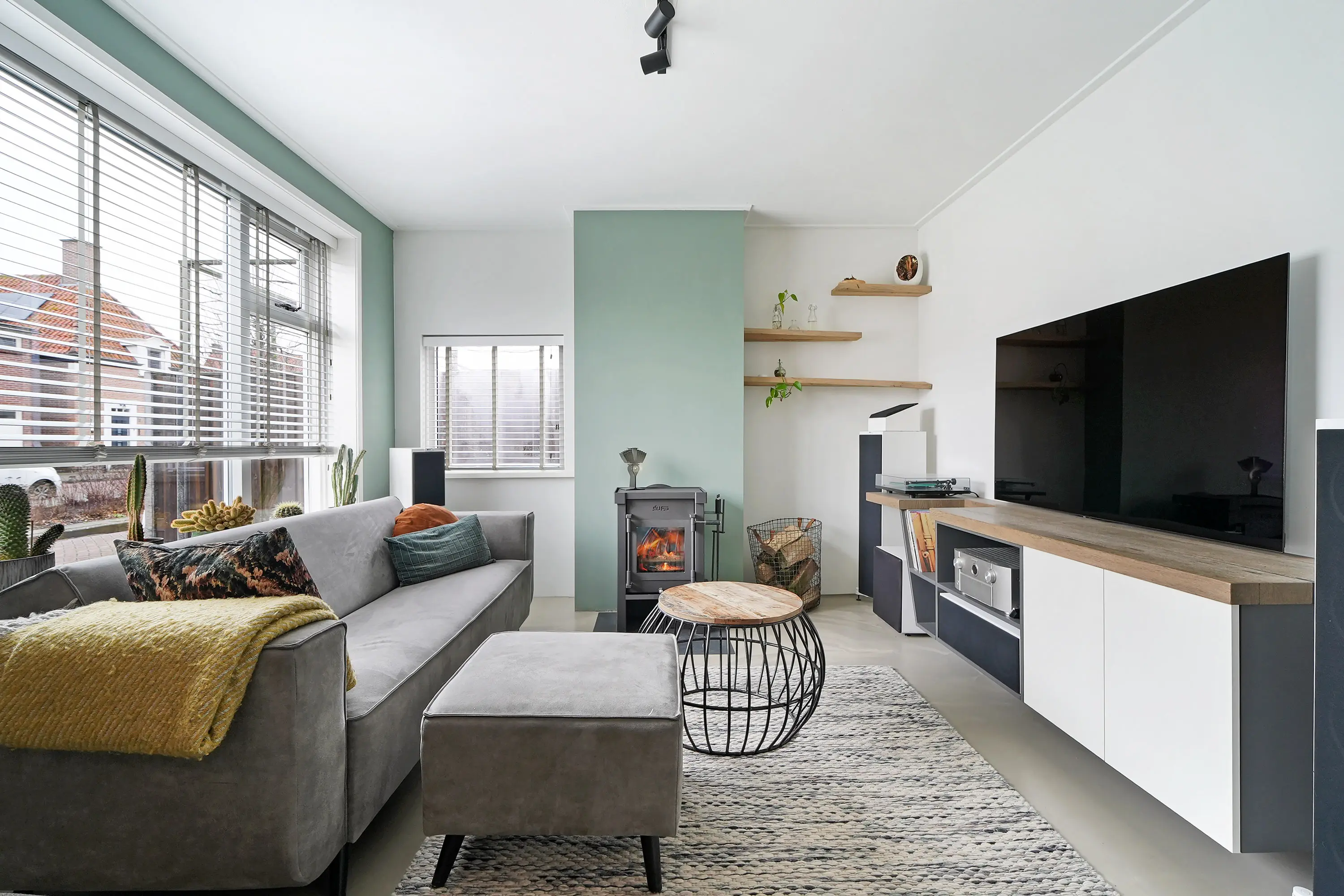 Entree in de smaakvolle hal met (uitgebreide) meterkast, chique toilet, kastruimte met warmtepomp, trapopgang naar de eerste verdieping. Vanuit de hal is zowel de royale woonkeuken als de woonkamer te bereiken. De woonkamer ademt direct bij binnenkomst ruimte en sfeer. De doorlopende gietvloer en charmante ensuite deuren verbinden de sfeervolle zithoek met houtkachel aan de voorzijde met de royale woonkeuken aan de tuinzijde. De plafondhoge raampartijen zorgen voor veel licht en een prachtig zicht op de tuin.