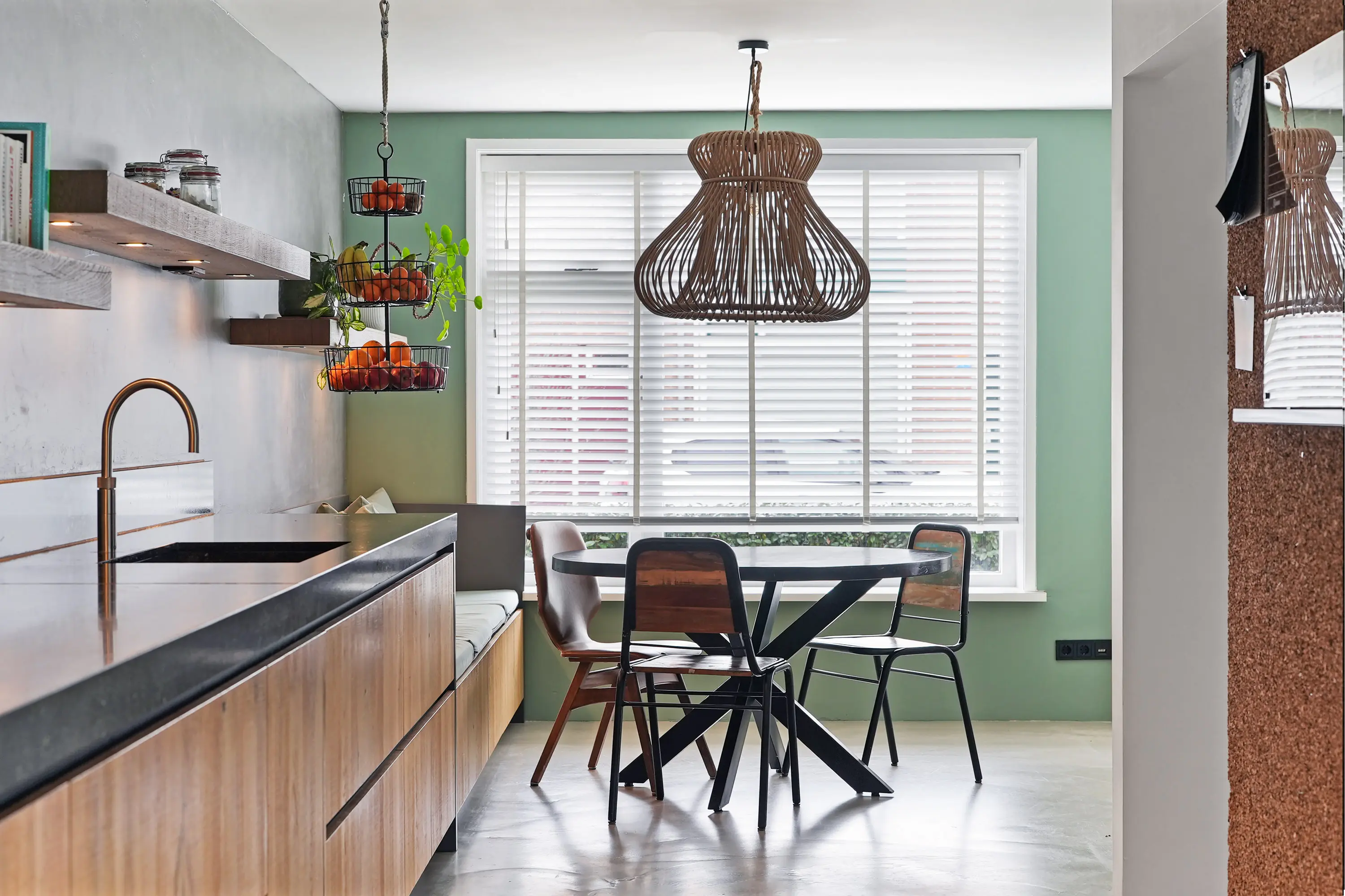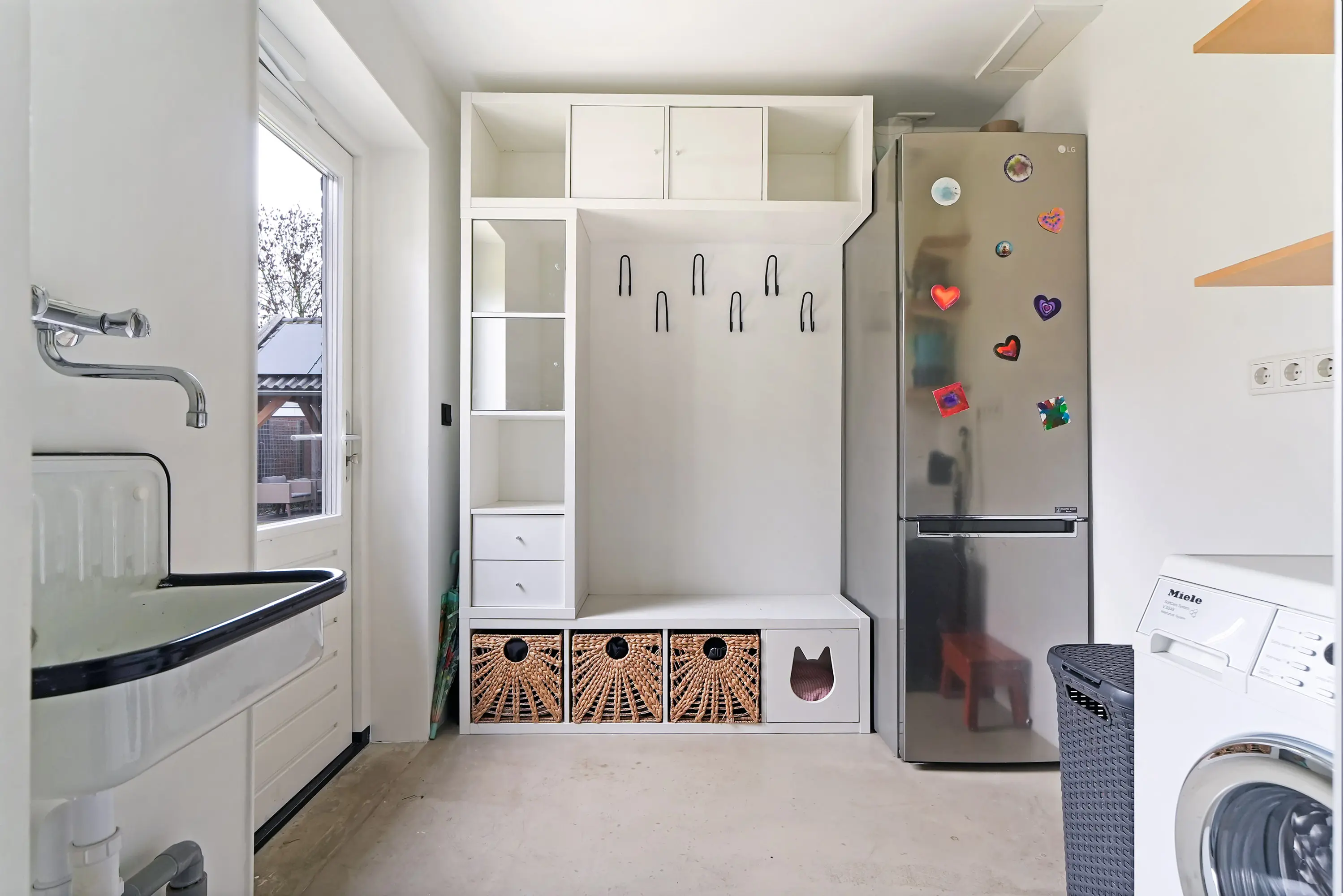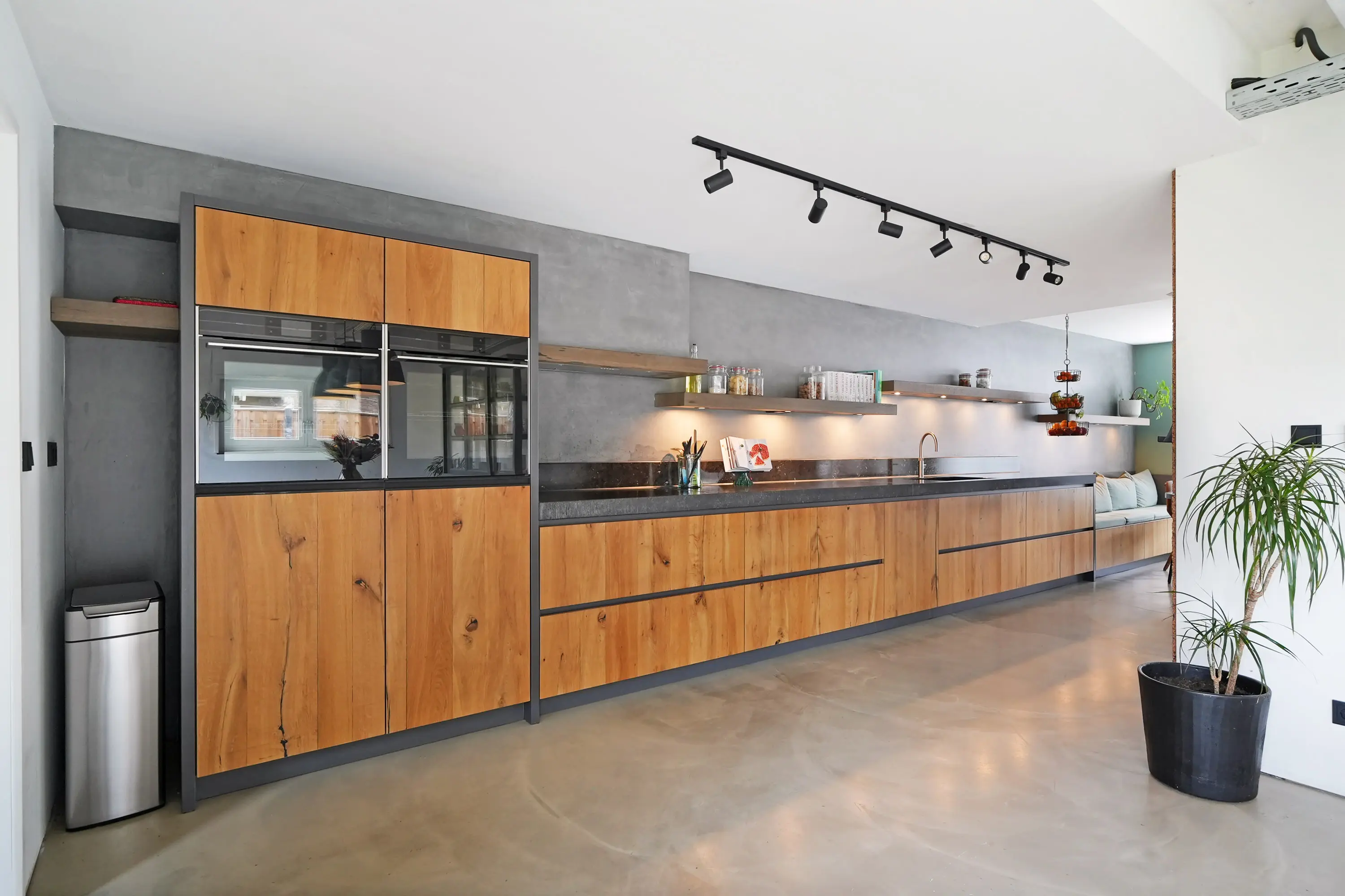 De royale woonkeuken aan de tuinzijde is voorzien van plafondhoge raampartijen, hoog balkenplafond en biedt daarmee een geweldige, wellicht de favoriete ruimte. De nieuwe houten keuken met natuurstenen werkblad is een echte eyecatcher en voorzien van hoogwaardige apparatuur, waaronder een inductiekookplaat, Quooker en stoomoven. Aangrenzend bevindt zich de praktische bijkeuken met gootsteen, kastenwand en aansluitingen voor witgoed. Zowel via de openslaande deuren in de woonkeuken als via de bijkeuken bereikt u de achtertuin.