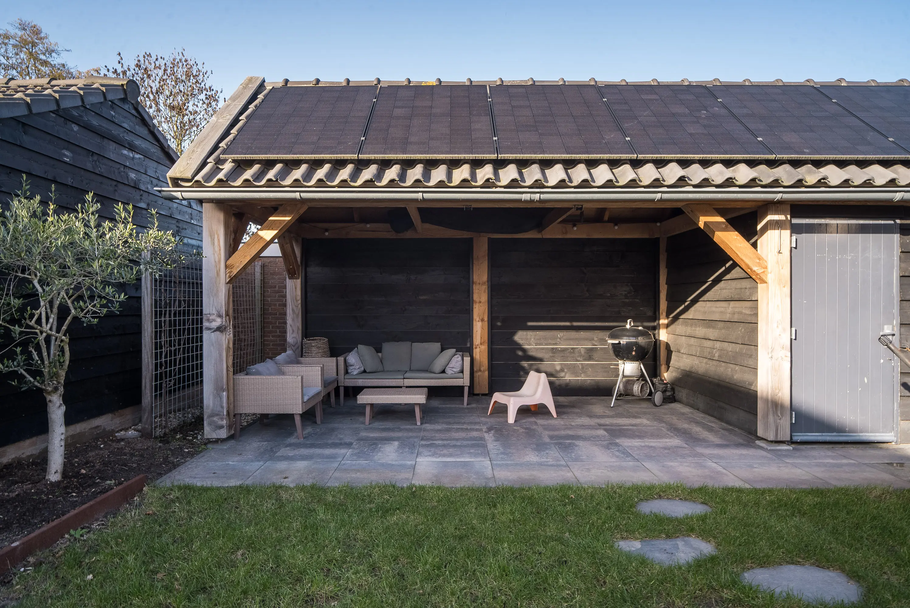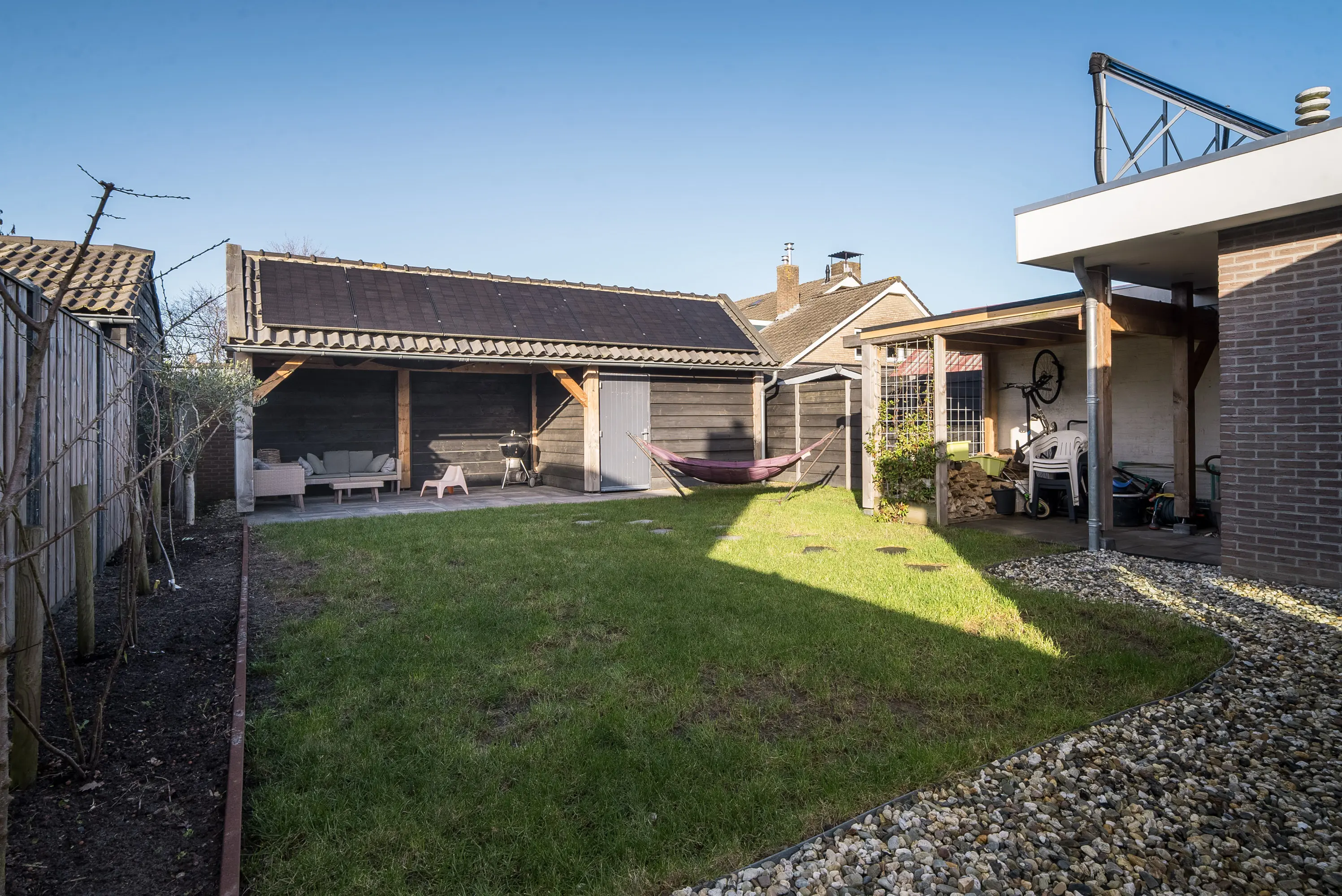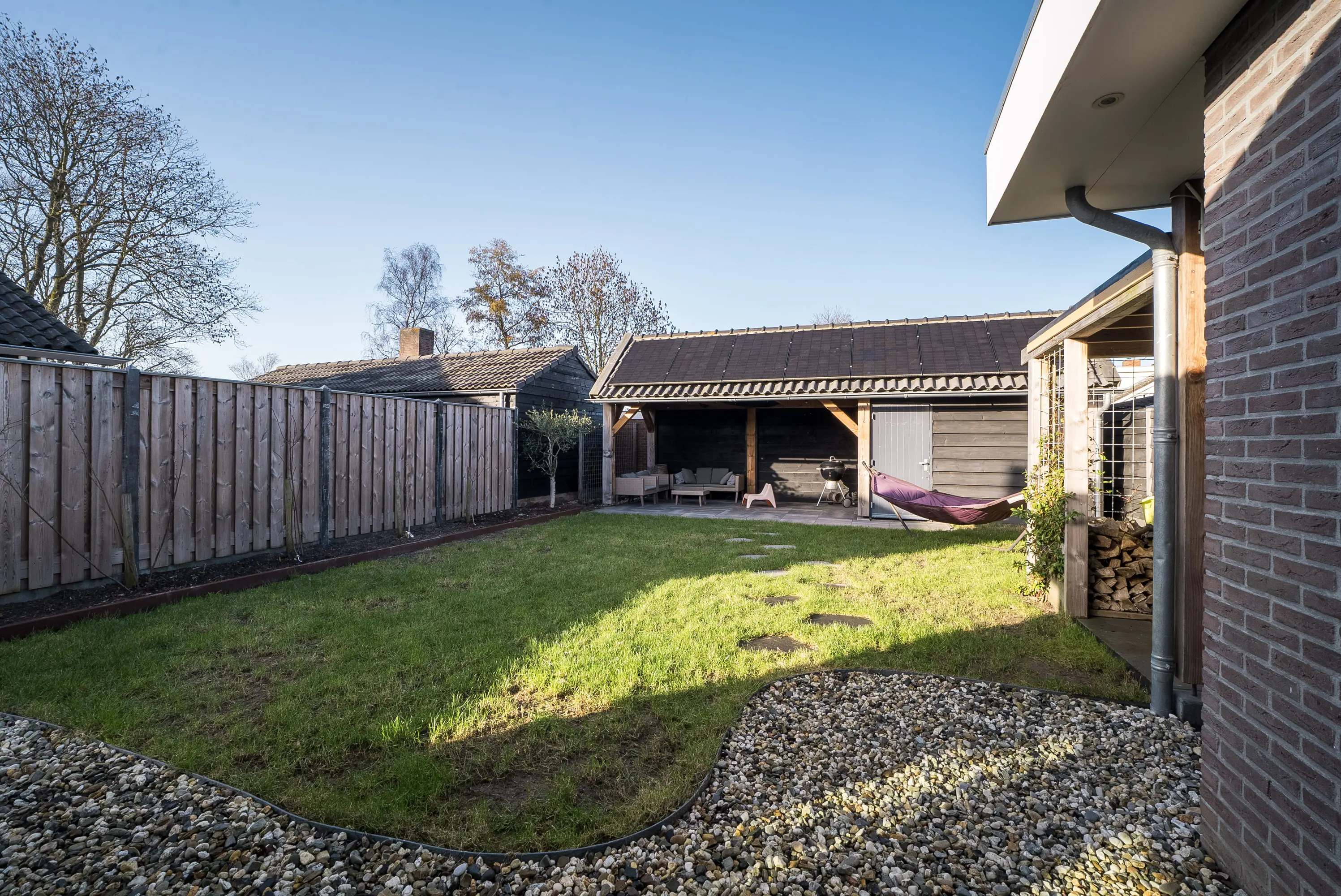 Via de eigen oprit en de toegangspoort langs de woning loopt de voortuin over in de beschutte achtertuin. De tuin is verzorgd aangelegd met een combinatie van gazon, een grindterras en bestrating onder de Douglas overkapping. Onder deze overkapping is het een fijne plek om buiten te zitten, bijvoorbeeld op warme avonden. Door het ontbreken van hoge bebouwing achter de tuin geniet u hier bovendien van veel privacy en een vrij uitzicht. Direct naast de overkapping staat een ruime schuur.