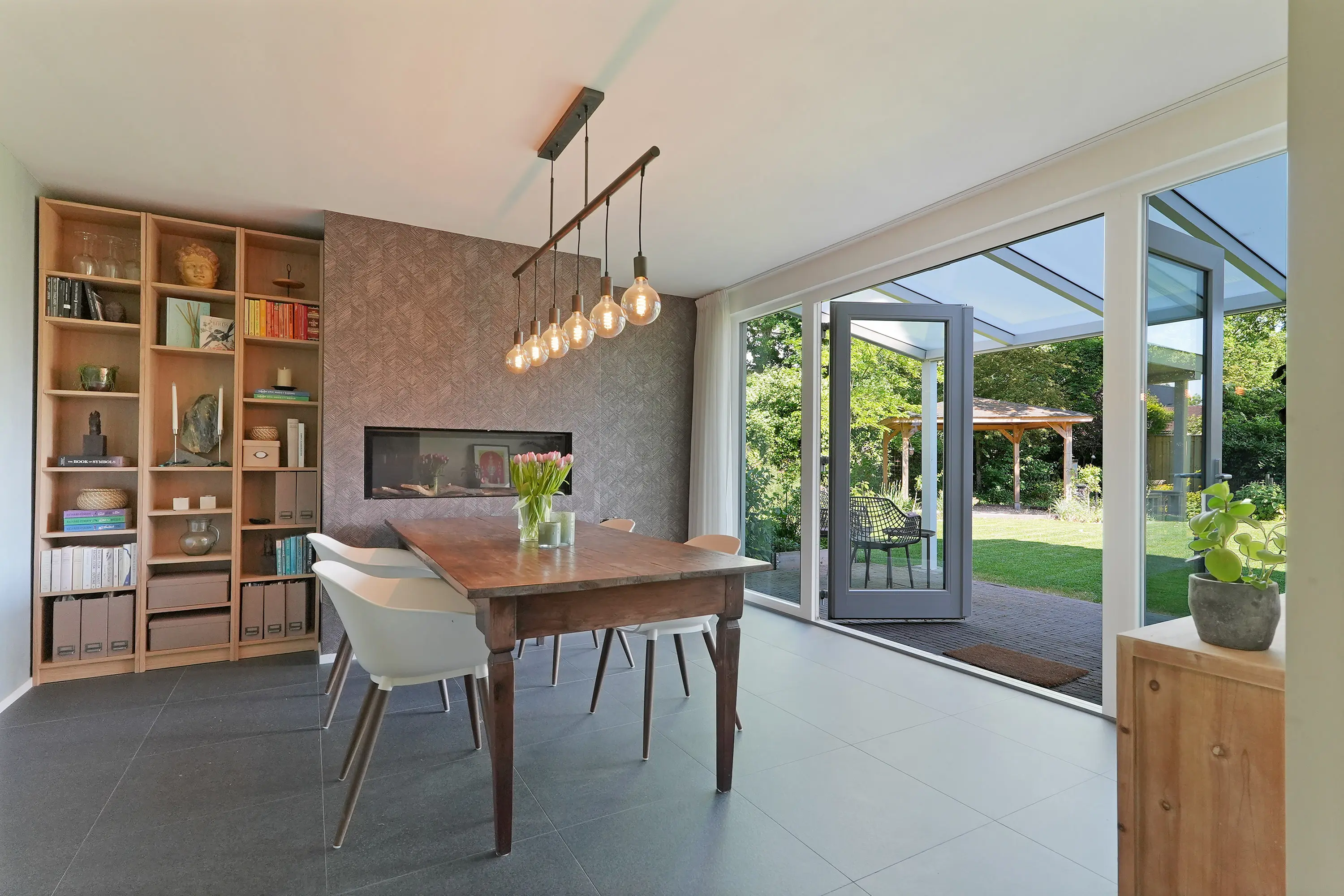 De open keuken is gesitueerd in het midden van de woning en is voorzien van diverse inbouwapparatuur, waaronder een kookplaat, afzuigkap, oven, vaatwasser en koel-/vriescombinatie. De keuken staat in directe verbinding met de sfeervolle, uitgebouwde eetkamer, die dankzij de en-suite indeling een aangename plek is voor zowel diners als ontspanning. De stijlvolle gashaard vormt een warm middelpunt van deze ruimte. Openslaande deuren en grote raampartijen zorgen voor veel daglicht en maken de overgang tussen binnen en buiten naadloos.