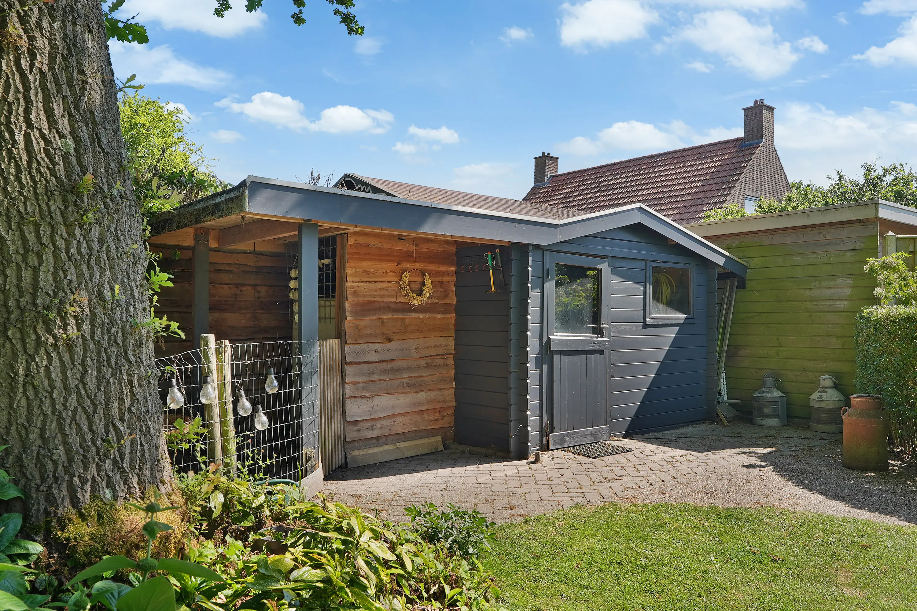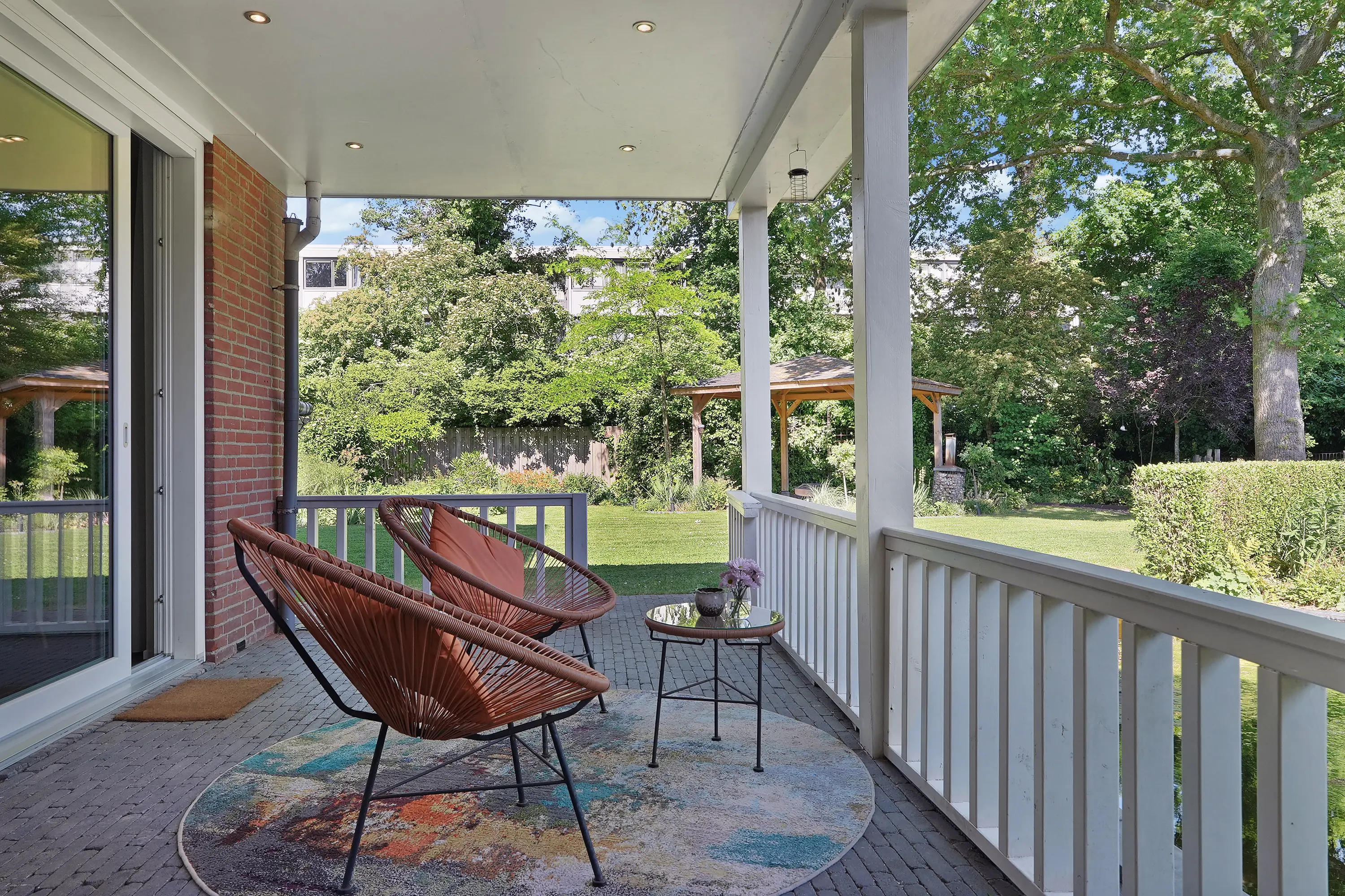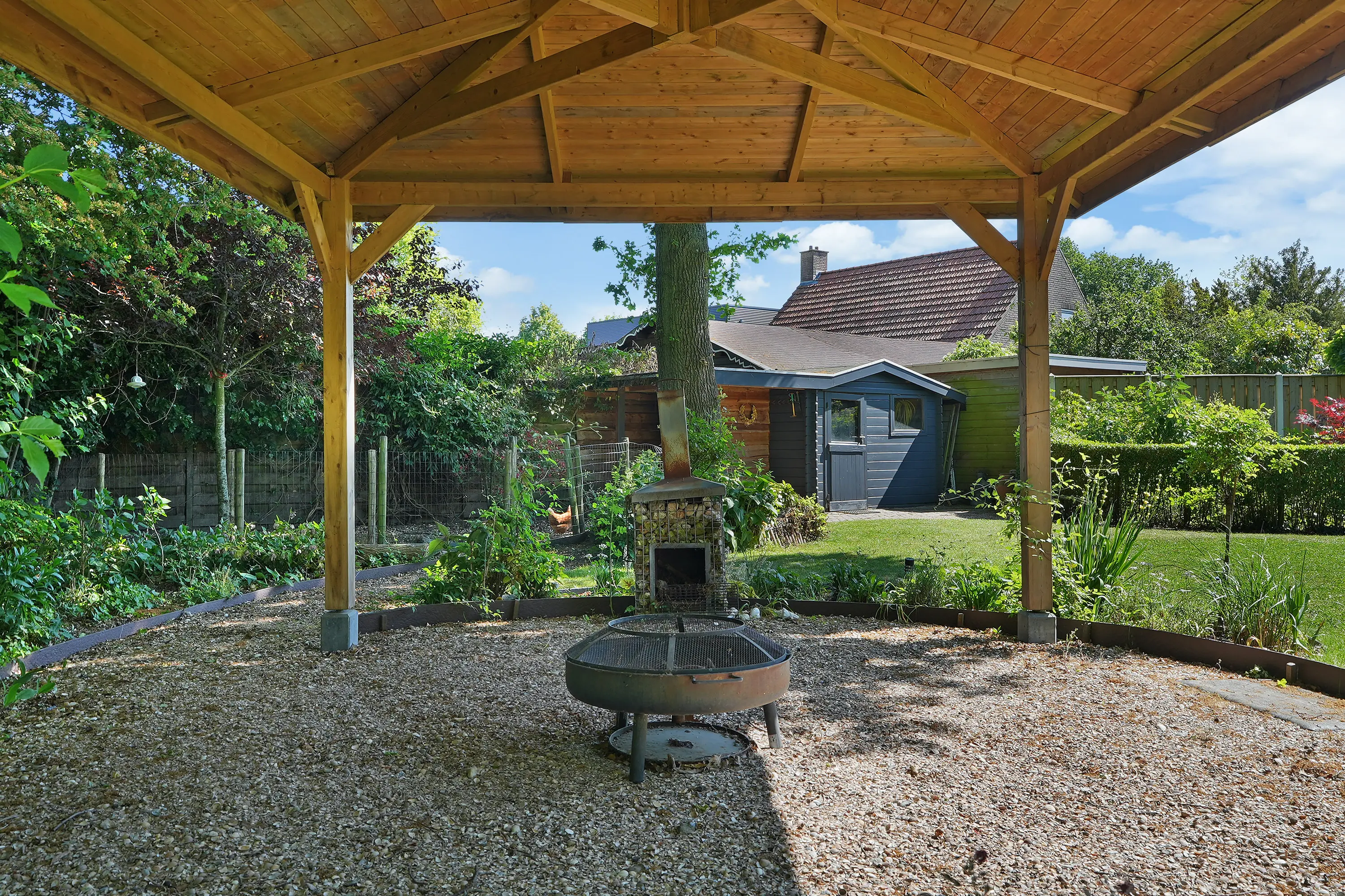 De tuin is met liefde en oog voor detail aangelegd. Direct aan de woning grenst een sfeervolle houten veranda, waar u tot laat in de avond beschut kunt zitten. Dit is de ideale plek voor een ontbijtje in de ochtendzon of een borrel met vrienden. Verderop in de tuin vindt u een charmant houten prieel: een intieme, schaduwrijke plek, perfect voor warme zomerdagen of als rustige leeshoek.