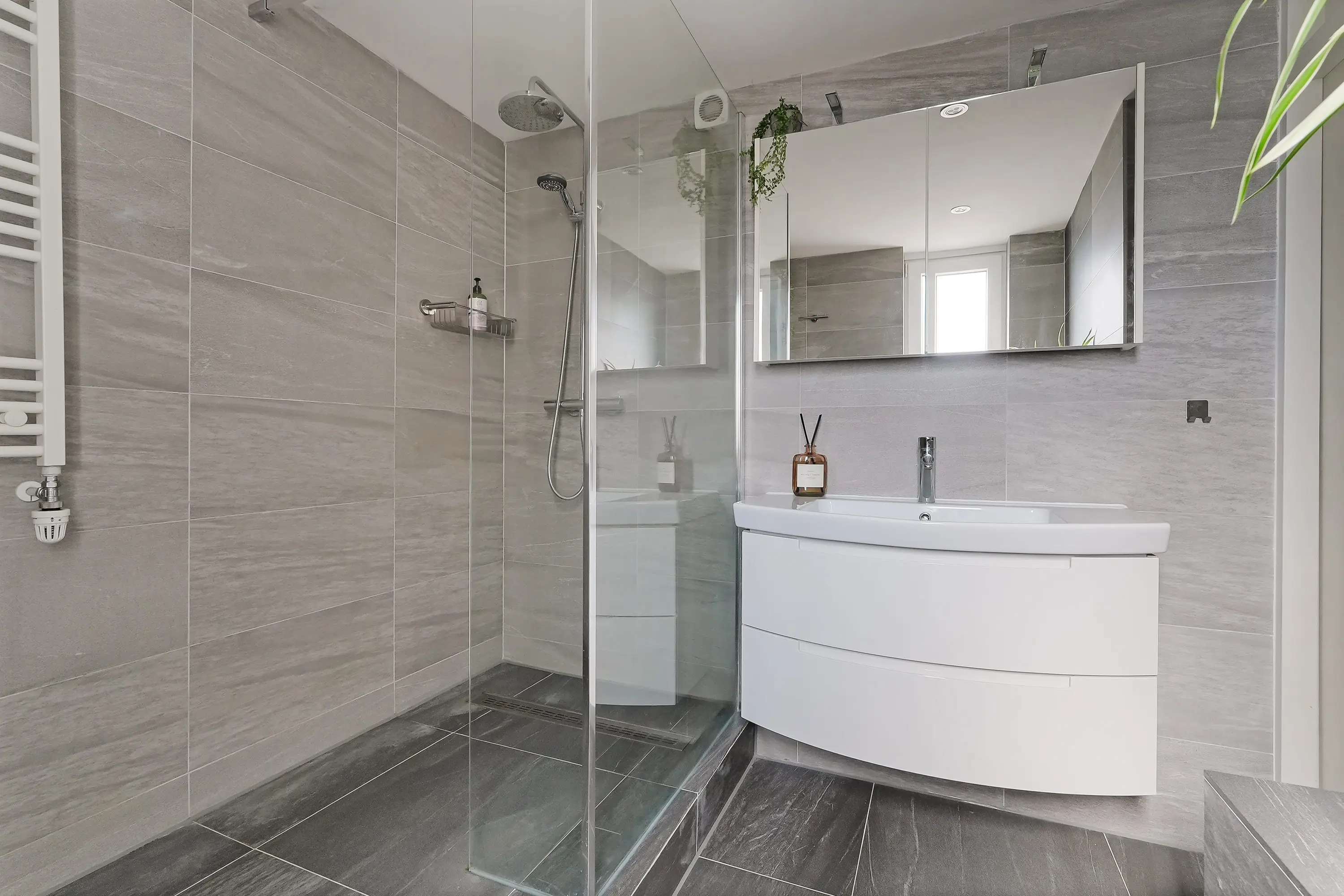 De recent vernieuwde badkamer heeft een moderne, strakke uitstraling en is voorzien van een inloopdouche met glazen wand, een stijlvol wastafelmeubel met opbergruimte en een tweede hangtoilet. De ruimte is tot in detail afgewerkt en biedt alles voor dagelijks comfort.