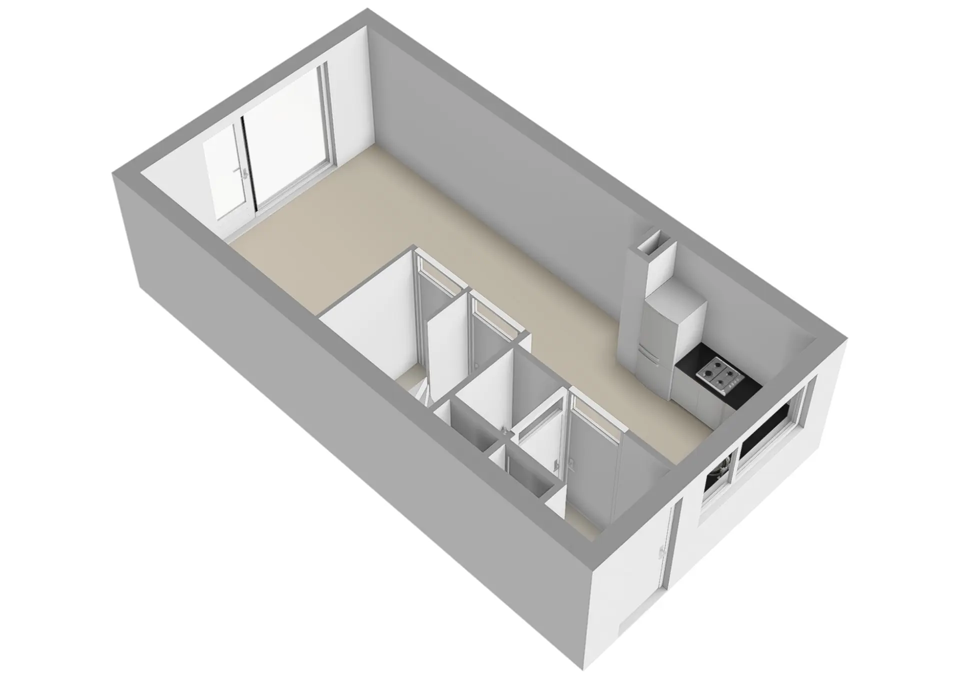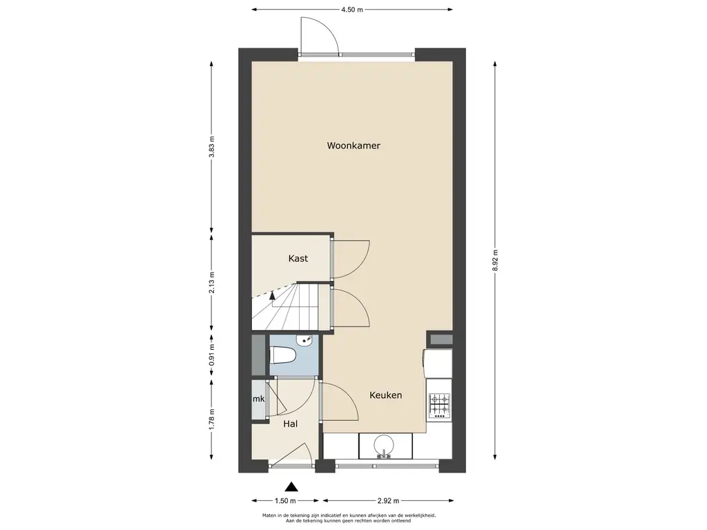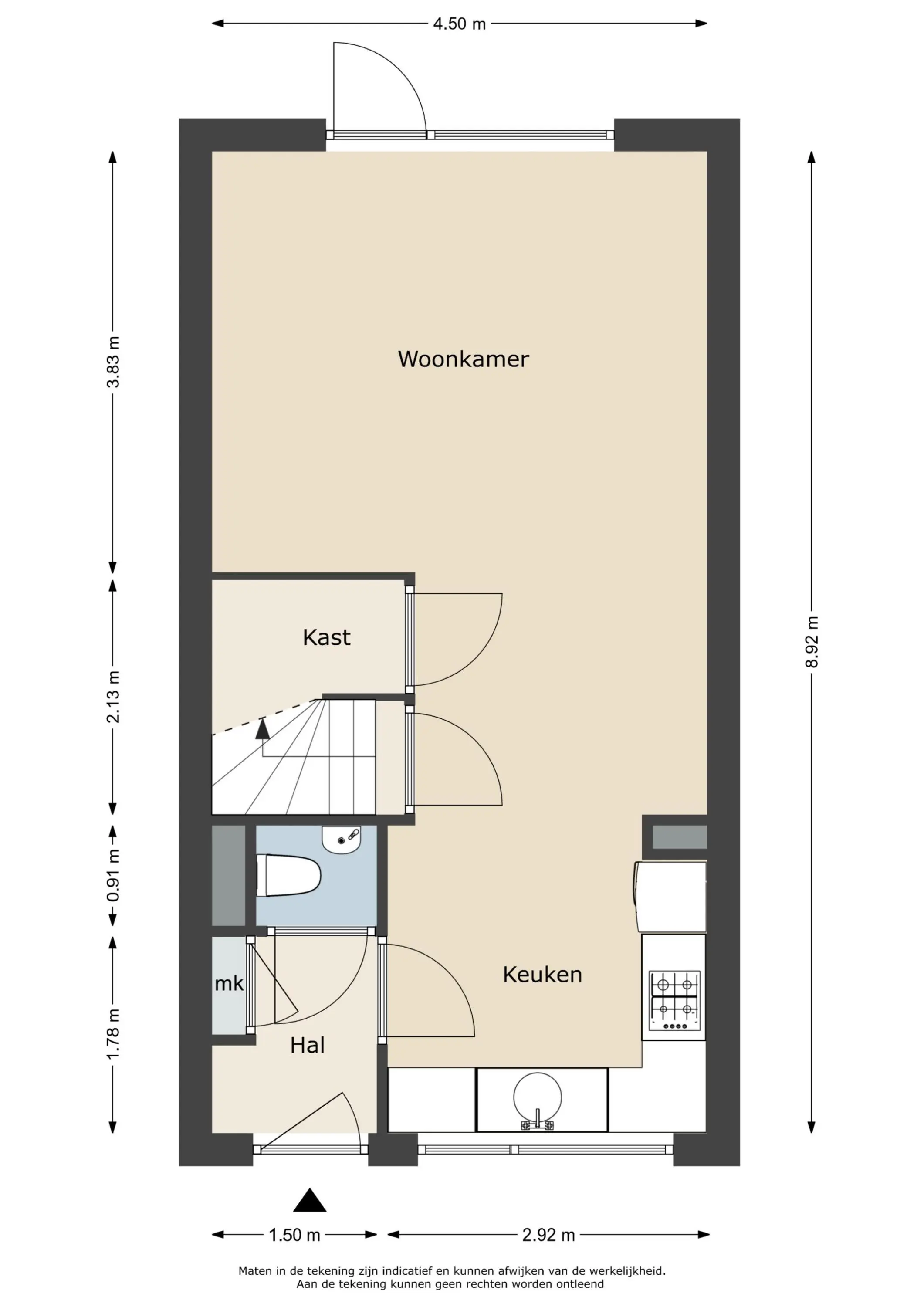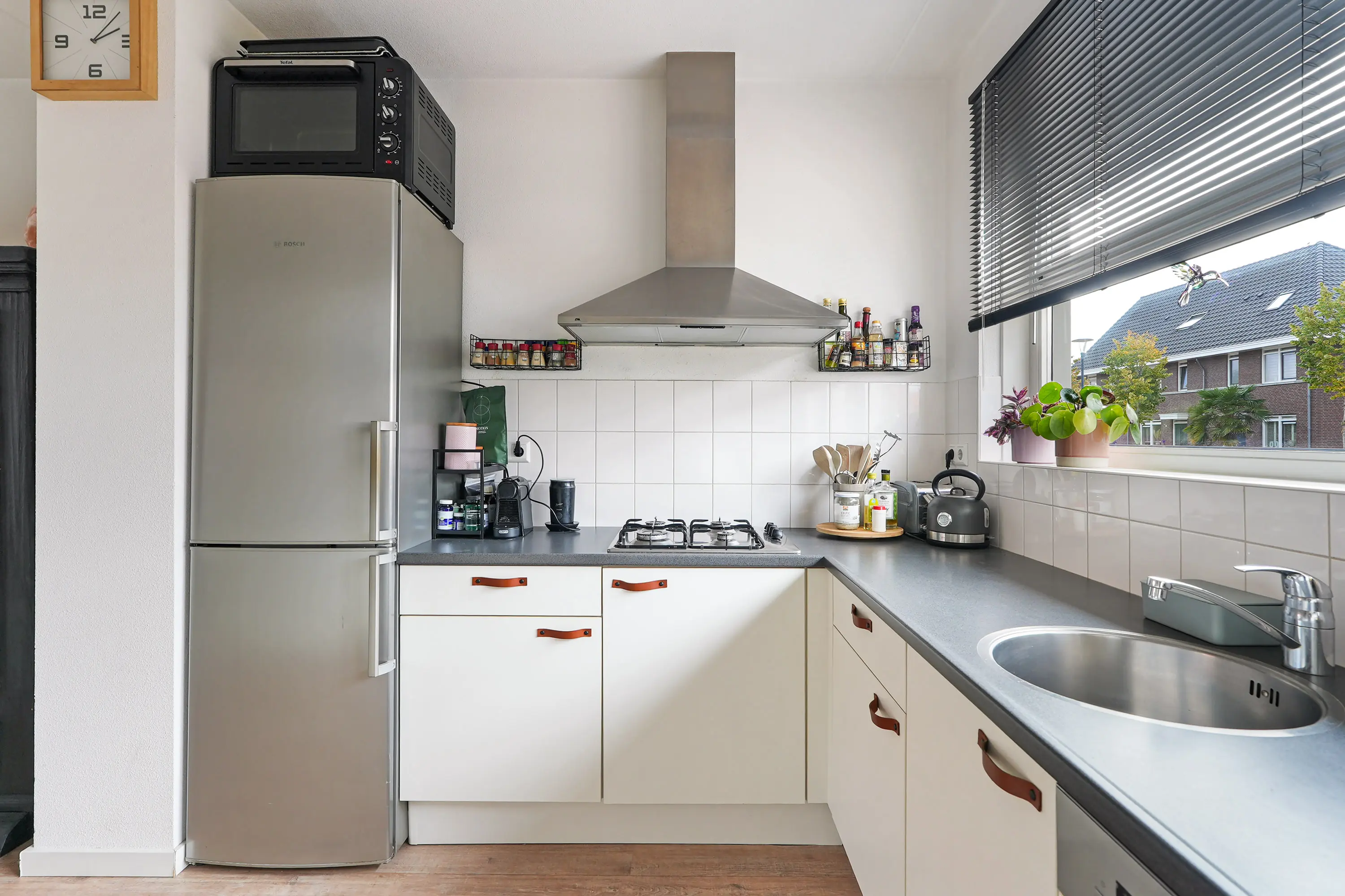 Entree in de hal met meterkast, garderobe, toilet en doorgang naar de woonkamer. Bij binnenkomst in de woonkamer treft u de zithoek aan de tuinzijde. Vanuit hier heeft u een prettig uitzicht op de diepe tuin. Halverwege de woonkamer treft u een praktische trapkast met volop bergruimte en de trapopgang naar de 1e verdieping. Aan de voorzijde bevindt zich de moderne open keuken, uitgevoerd in een hoekopstelling en voorzien van inbouwapparatuur zoals een gaskookplaat, vaatwasser en een losstaande koel-/vriescombinatie. Vanuit de woonkamer loopt u zo de tuin in.