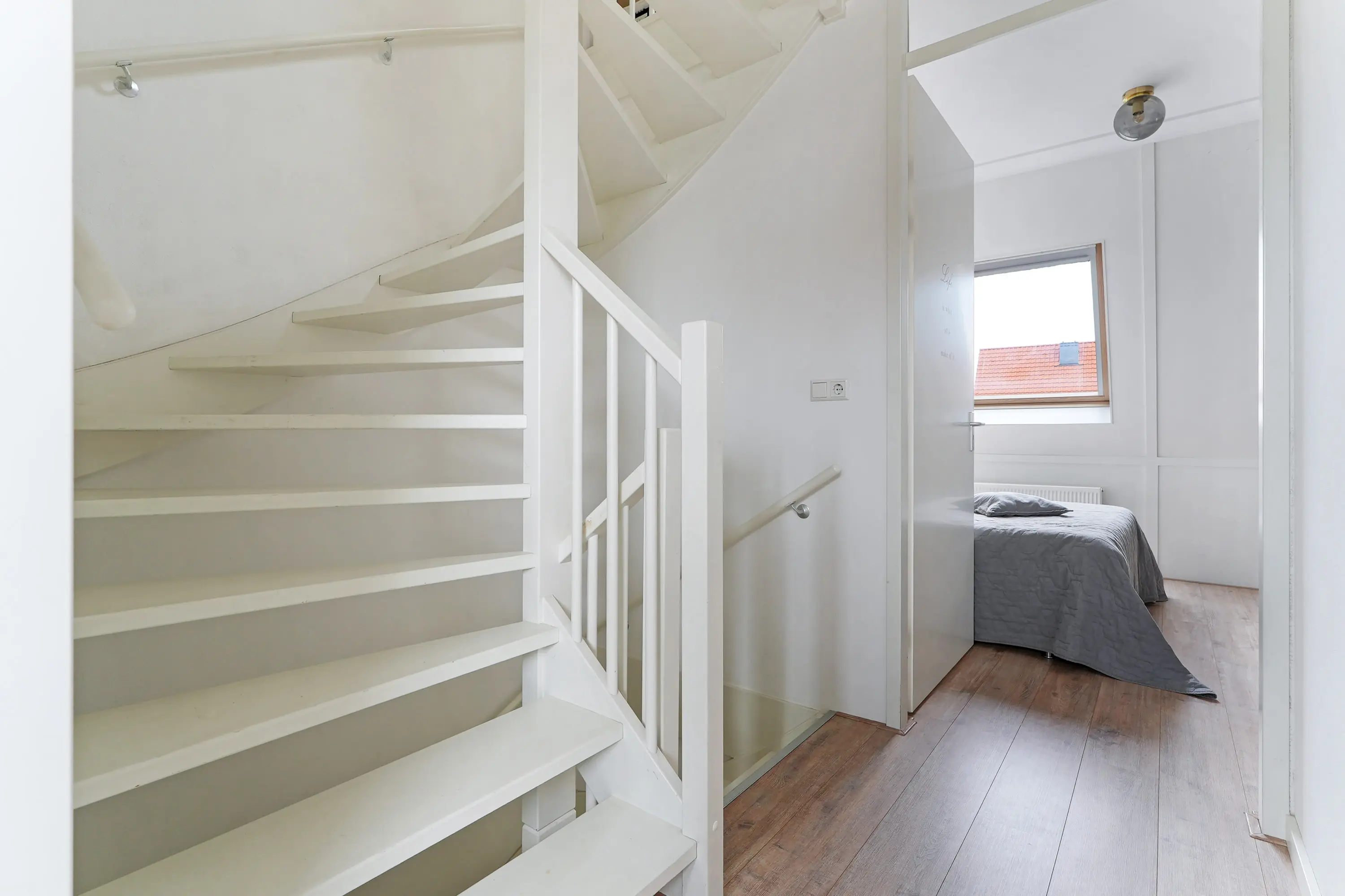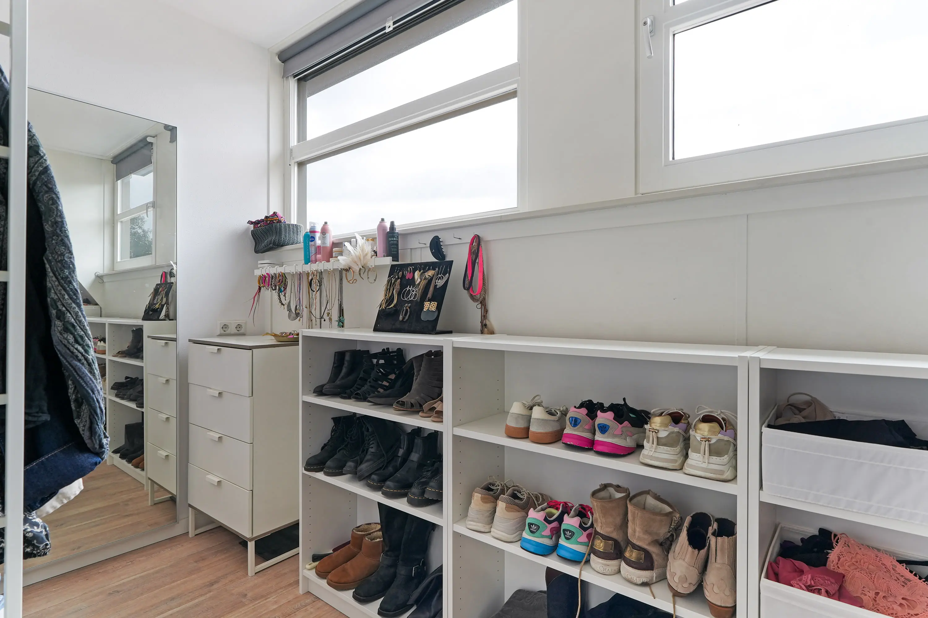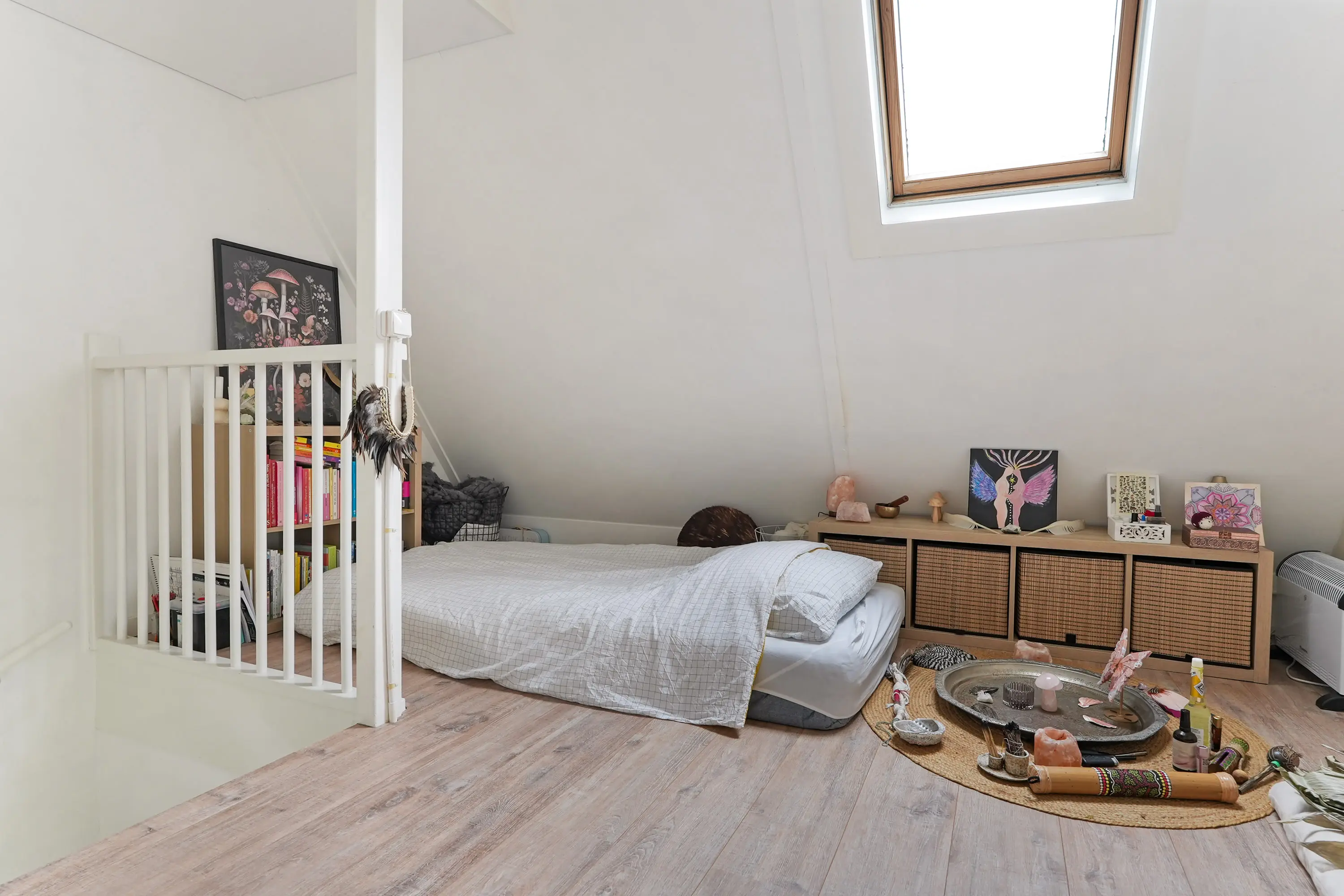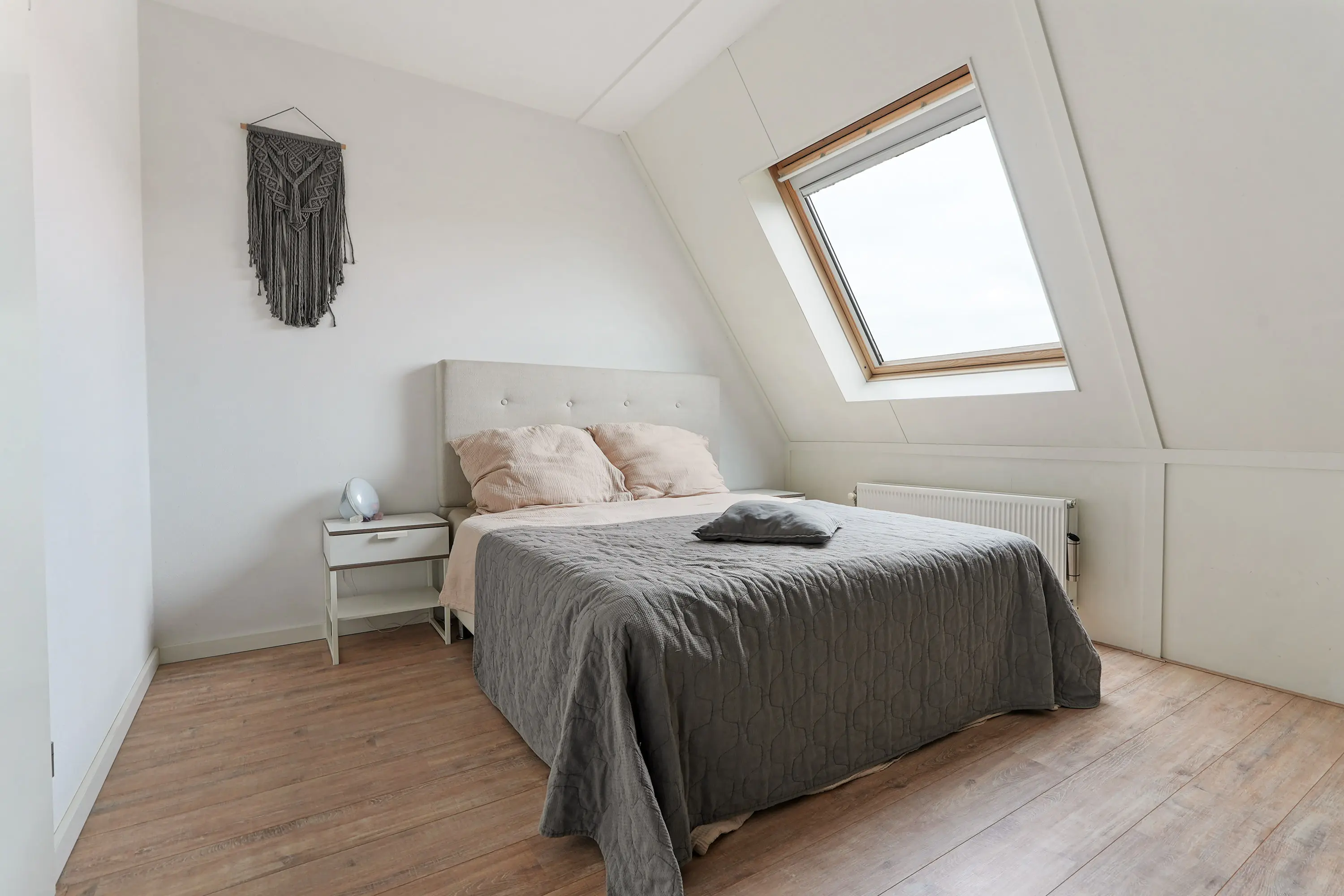 De overloop biedt toegang tot twee slaapkamers en de badkamer. De ouderslaapkamer bevindt zich aan de tuinzijde en is heerlijk licht door het grote dakraam. De tweede slaapkamer aan de voorzijde beschikt over een dakkapel en is momenteel in gebruik als inloopkast. De badkamer is neutraal uitgevoerd en voorzien van een inloopdouche, wastafel.