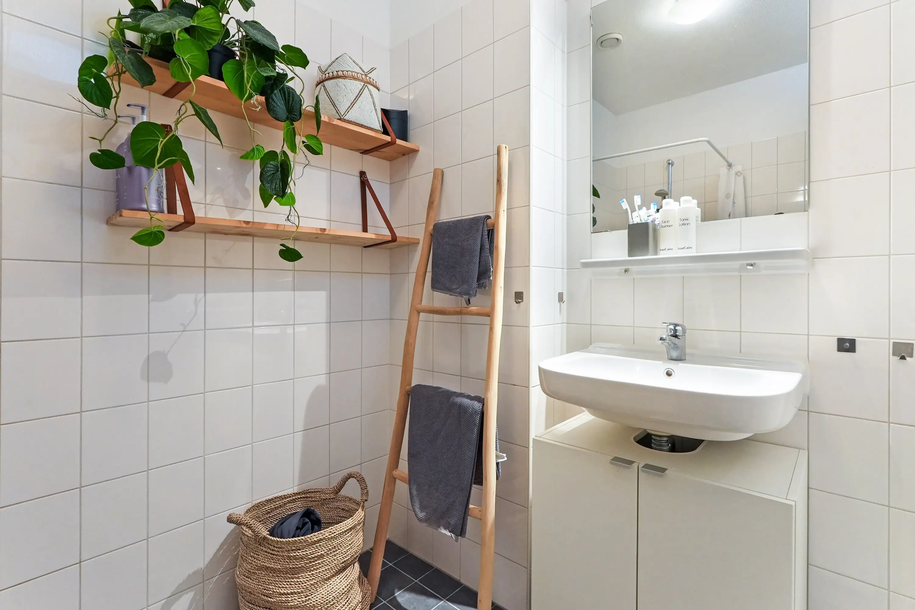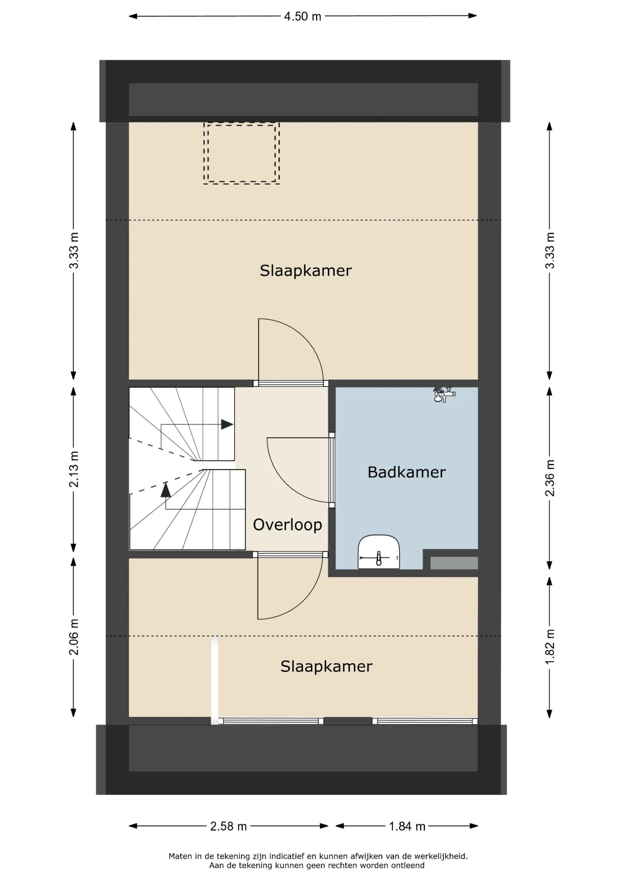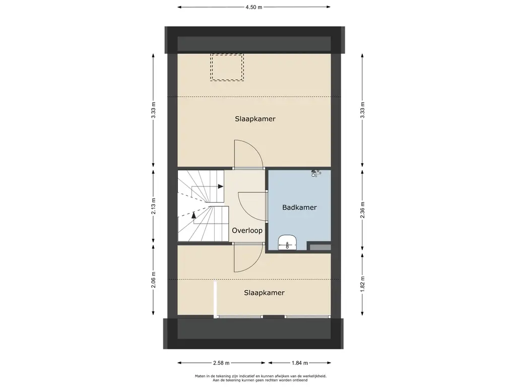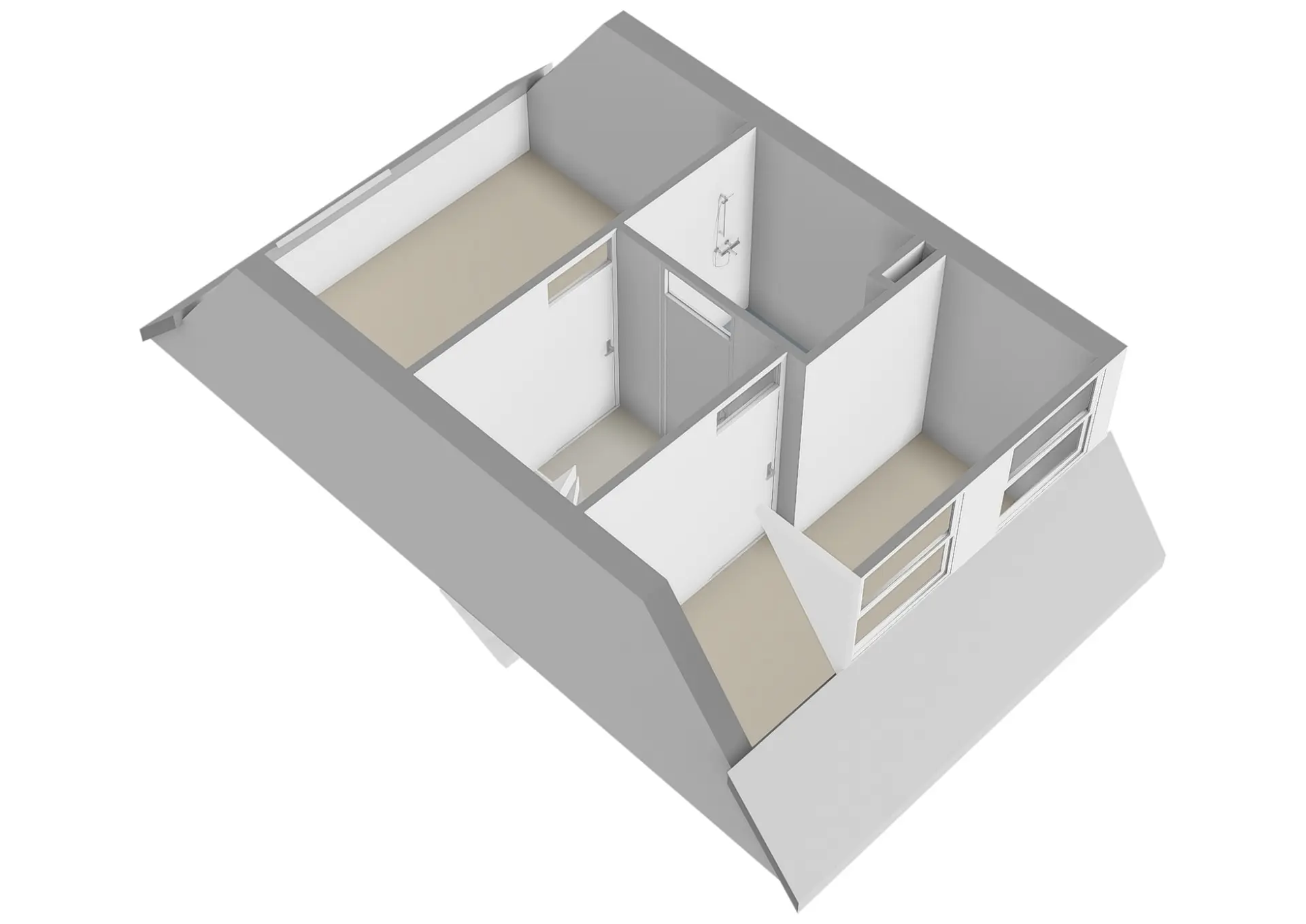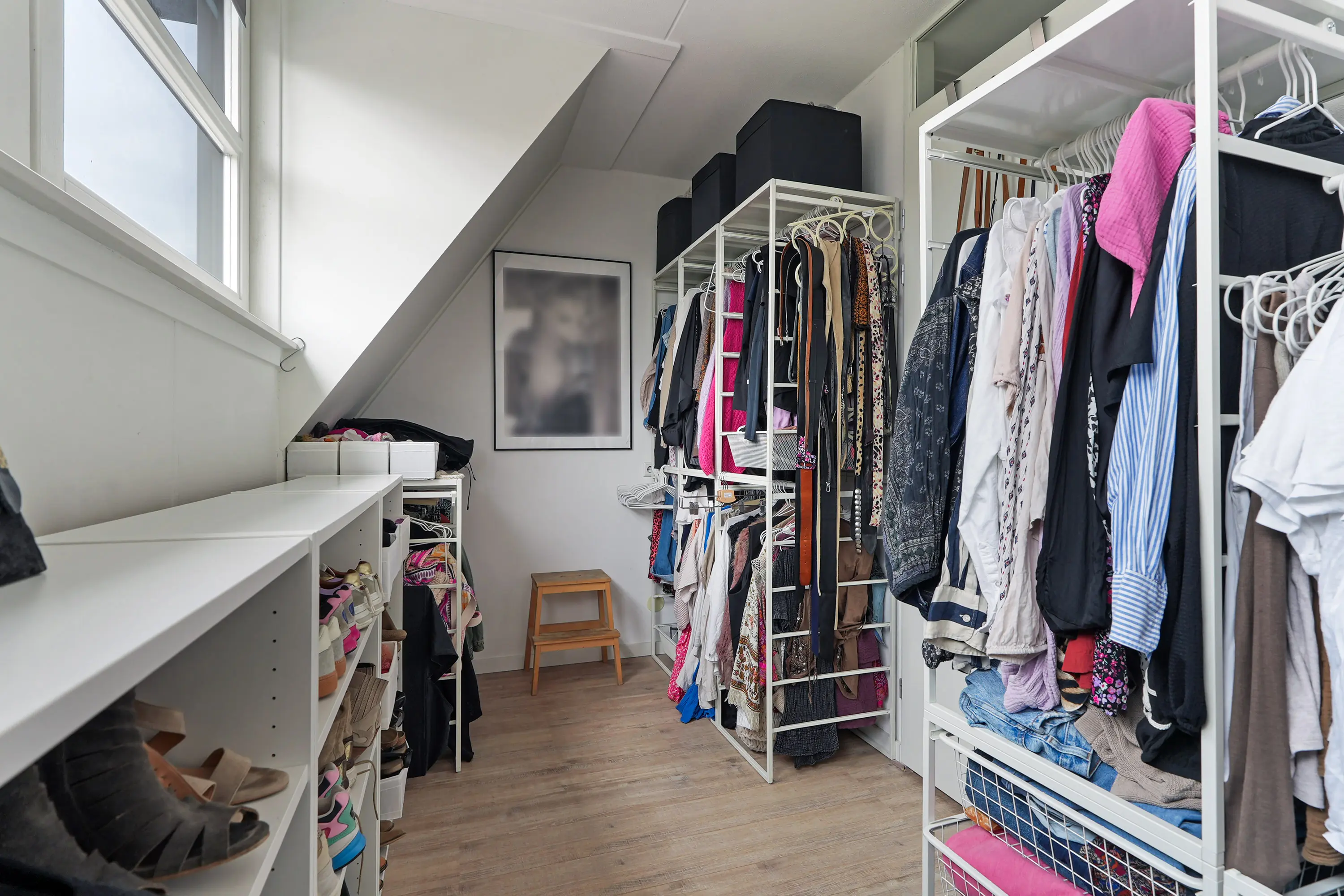 De overloop biedt toegang tot twee slaapkamers en de badkamer. De ouderslaapkamer bevindt zich aan de tuinzijde en is heerlijk licht door het grote dakraam. De tweede slaapkamer aan de voorzijde beschikt over een dakkapel en is momenteel in gebruik als inloopkast. De badkamer is neutraal uitgevoerd en voorzien van een inloopdouche, wastafel.