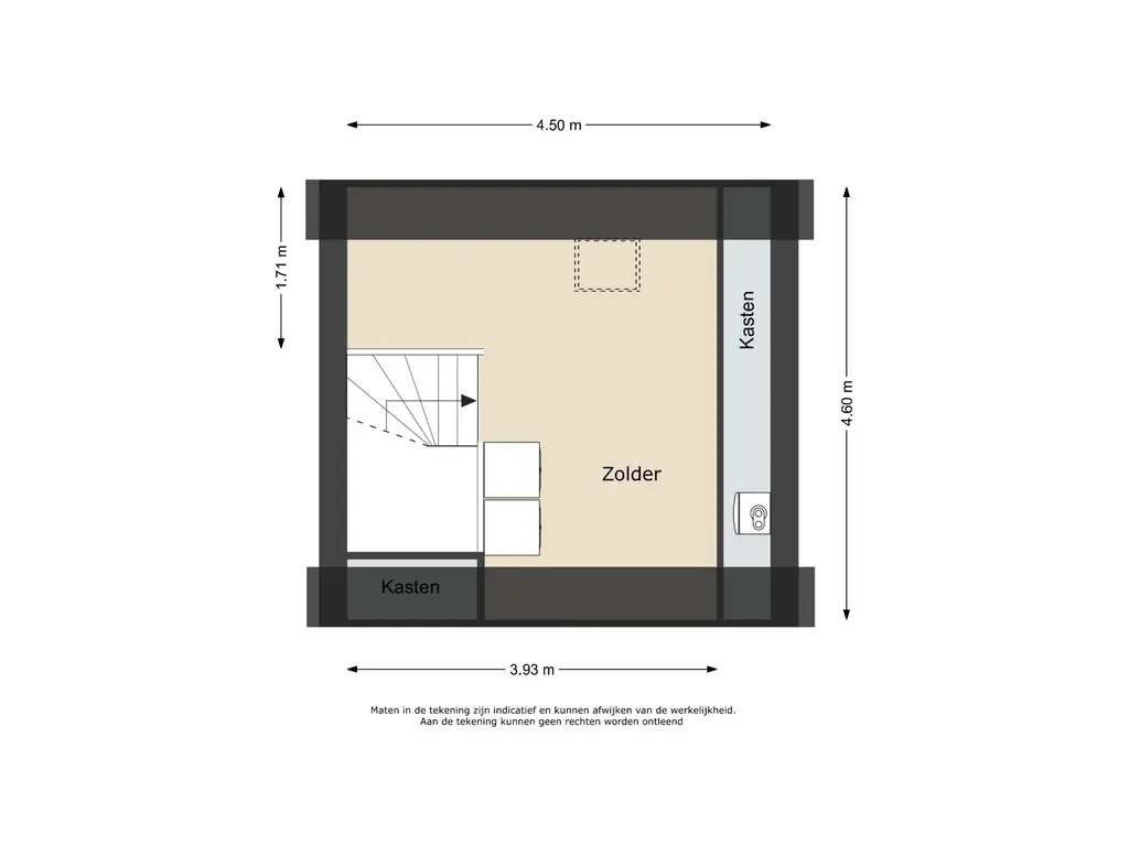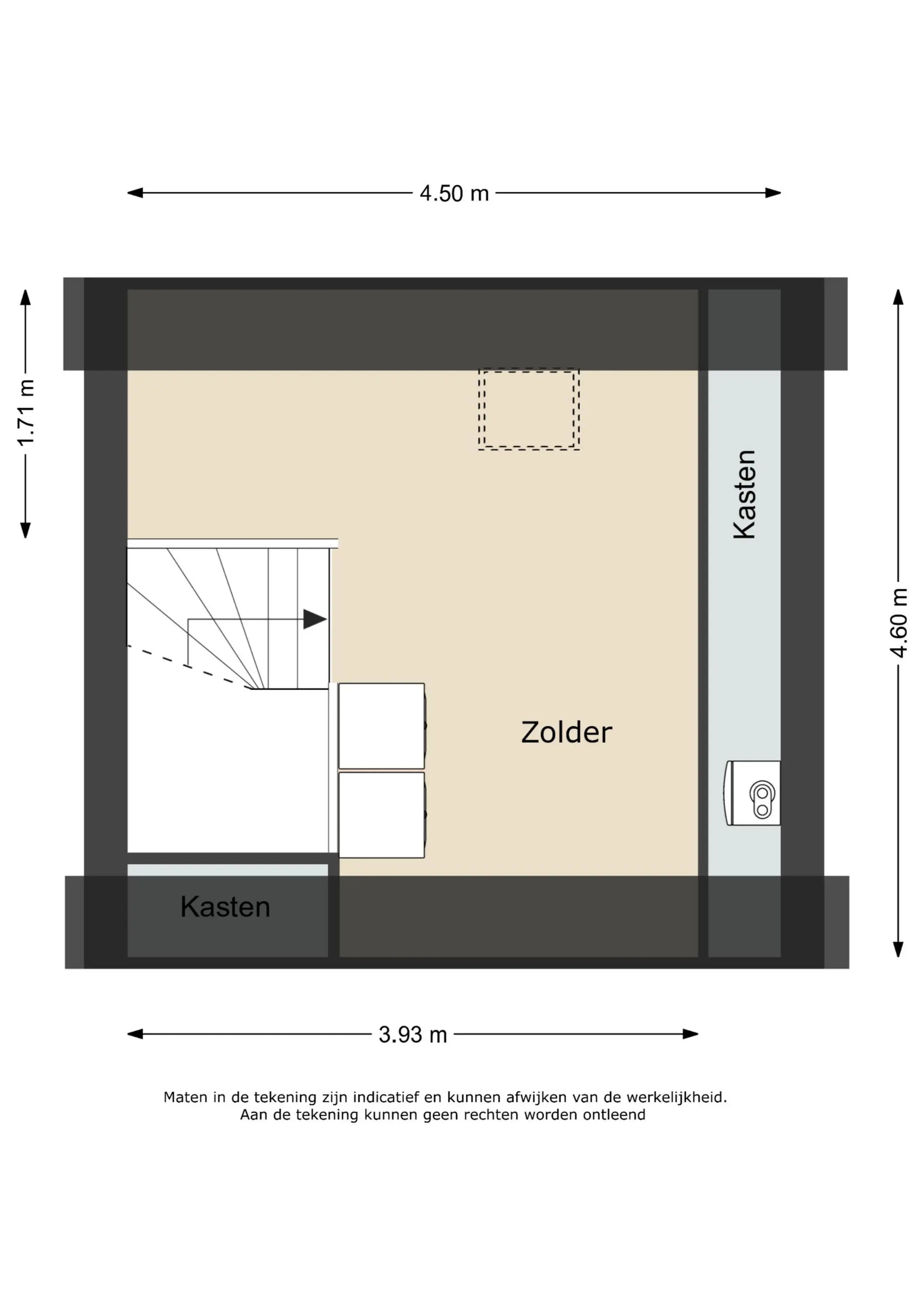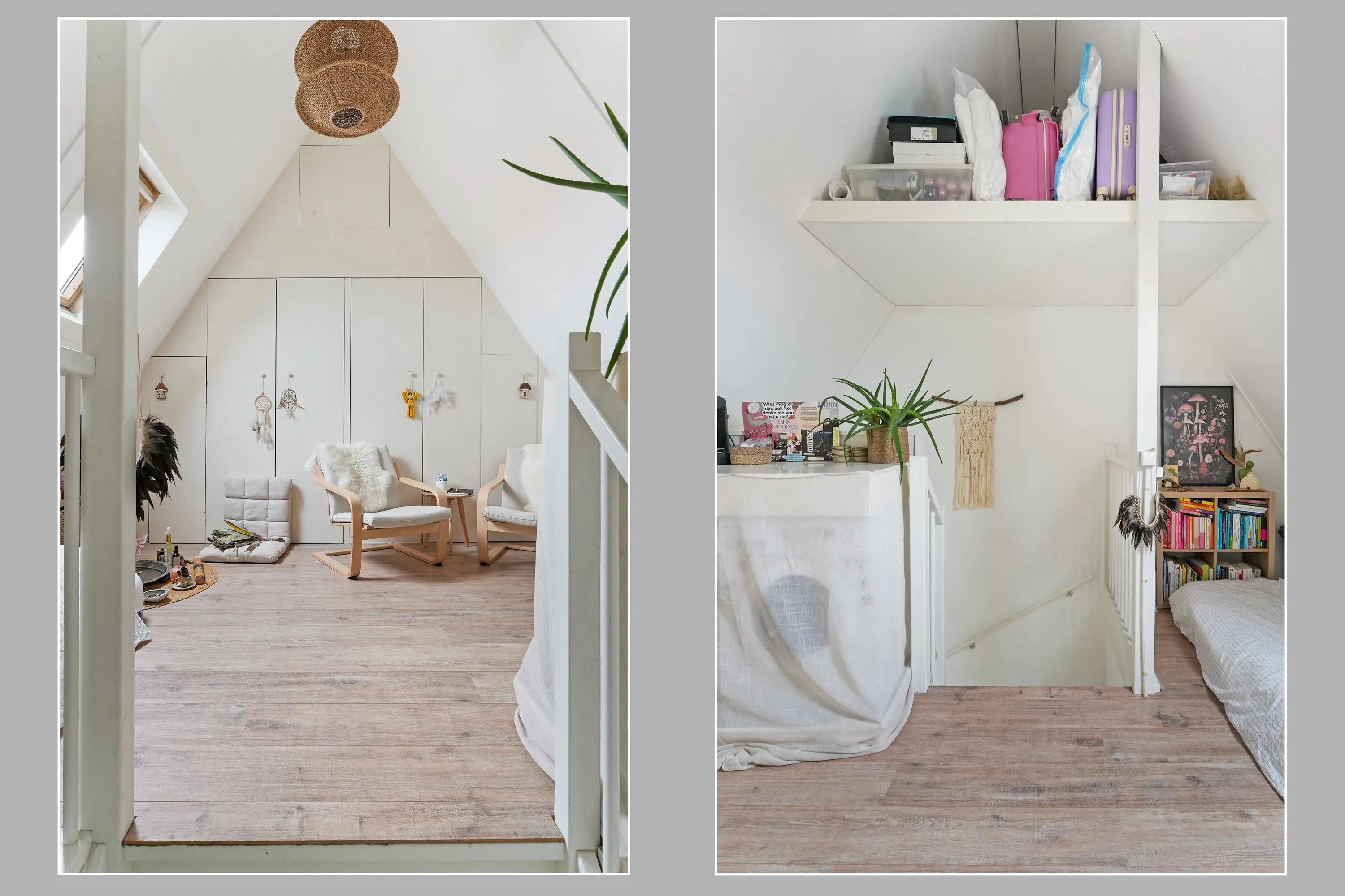 Via de vaste trap bereikt u de zolderverdieping. Dankzij het dakramen en de ingebouwde kastenwand is deze verdieping prima geschikt als derde slaapkamer, werkkamer of hobbyruimte. Verder treft u hier de cv-installatie, de wasmachine- en drogeropstelling en extra bergruimte achter de knieschotten.