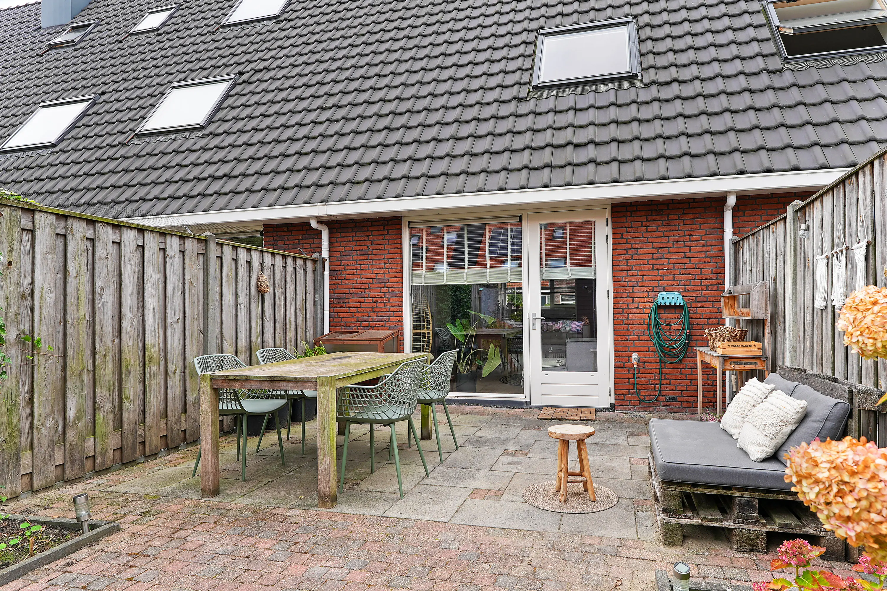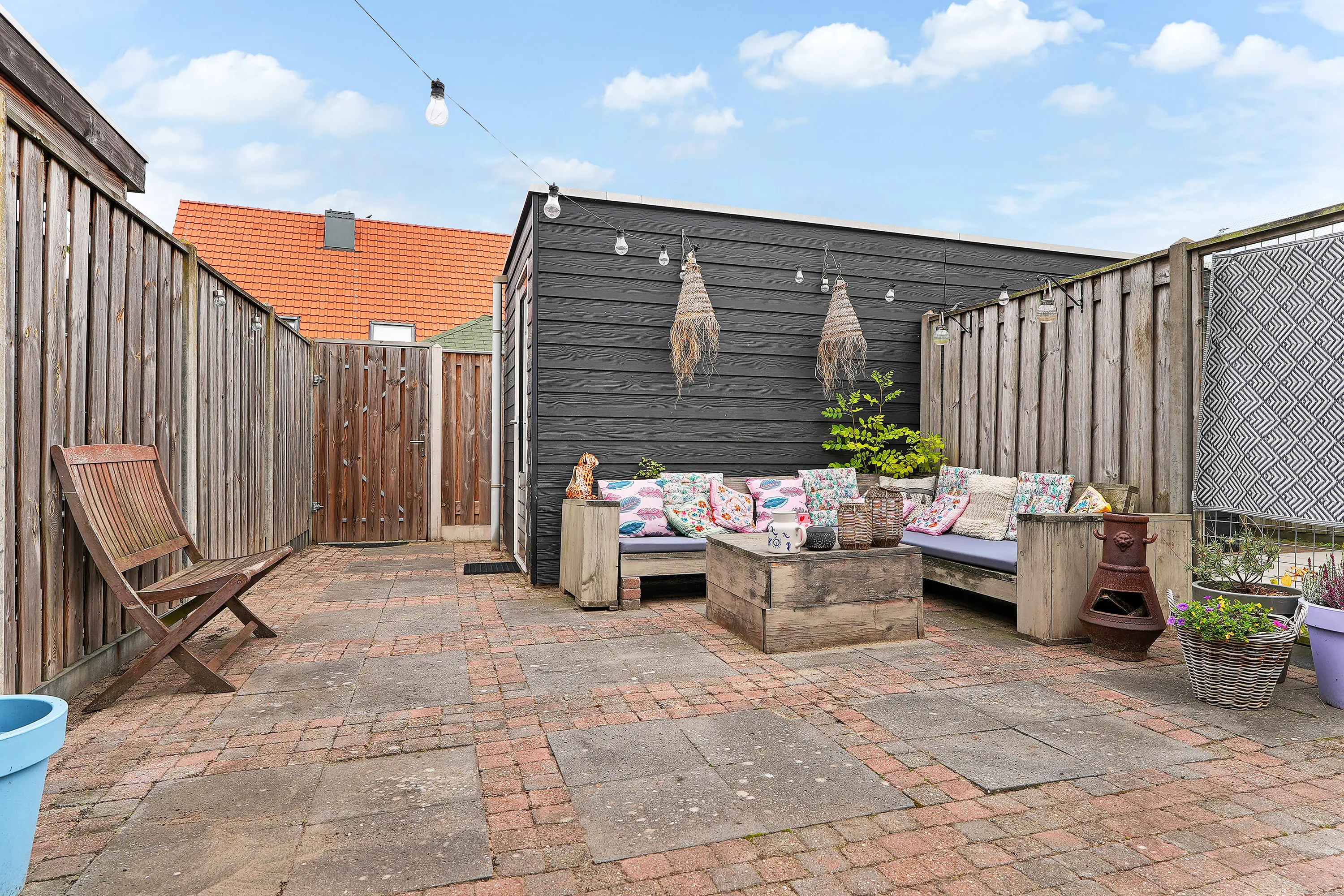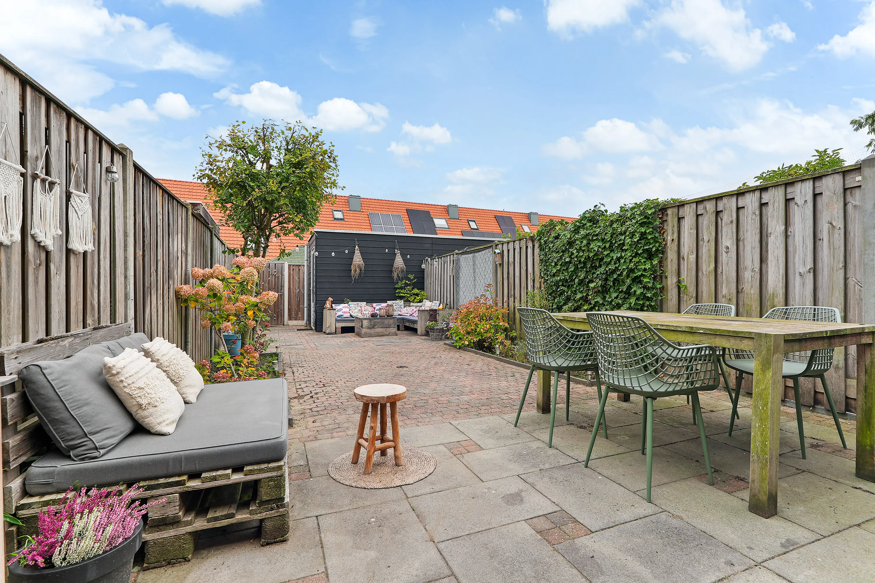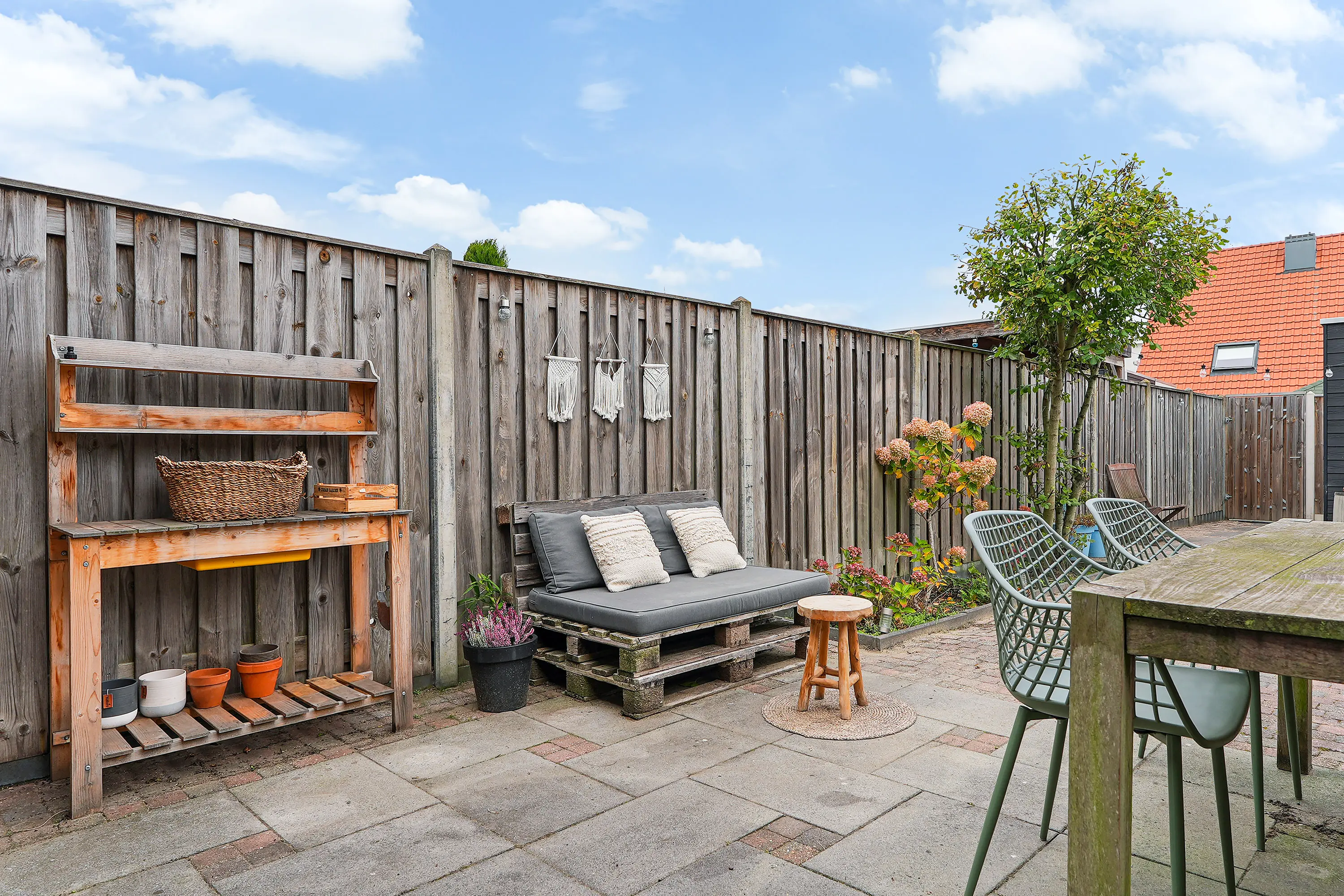 De diepe achtertuin is onderhoudsvriendelijk aangelegd met nette bestrating en groenborders. Achter in de tuin bevindt zich een houten berging met elektra, ideaal voor de fietsen of tuinspullen. Naast de berging treft u de poort die dienst doet als vrije achterom. Aan de voorzijde ligt een rustige straat met voornamelijk bestemmingsverkeer.