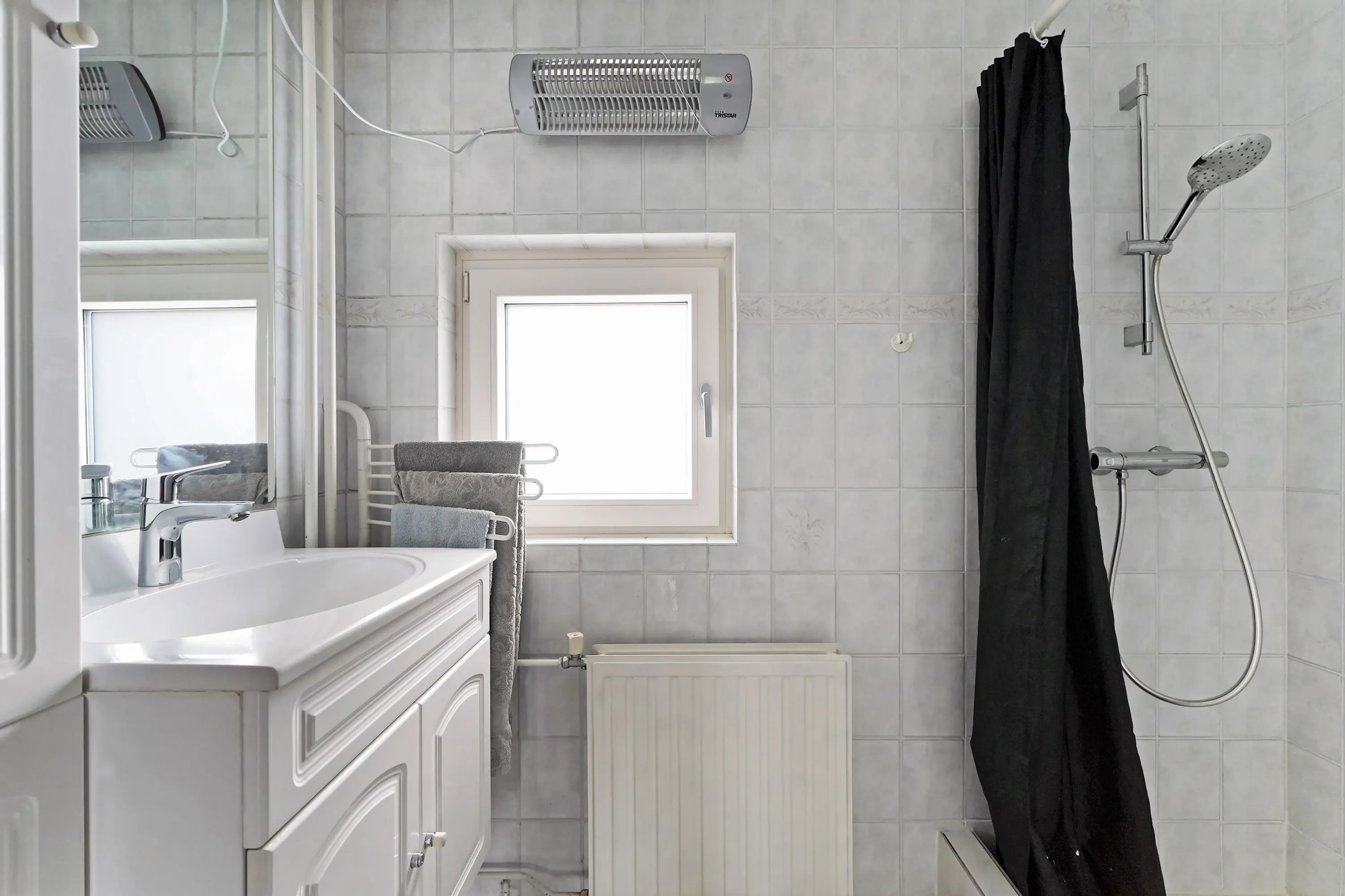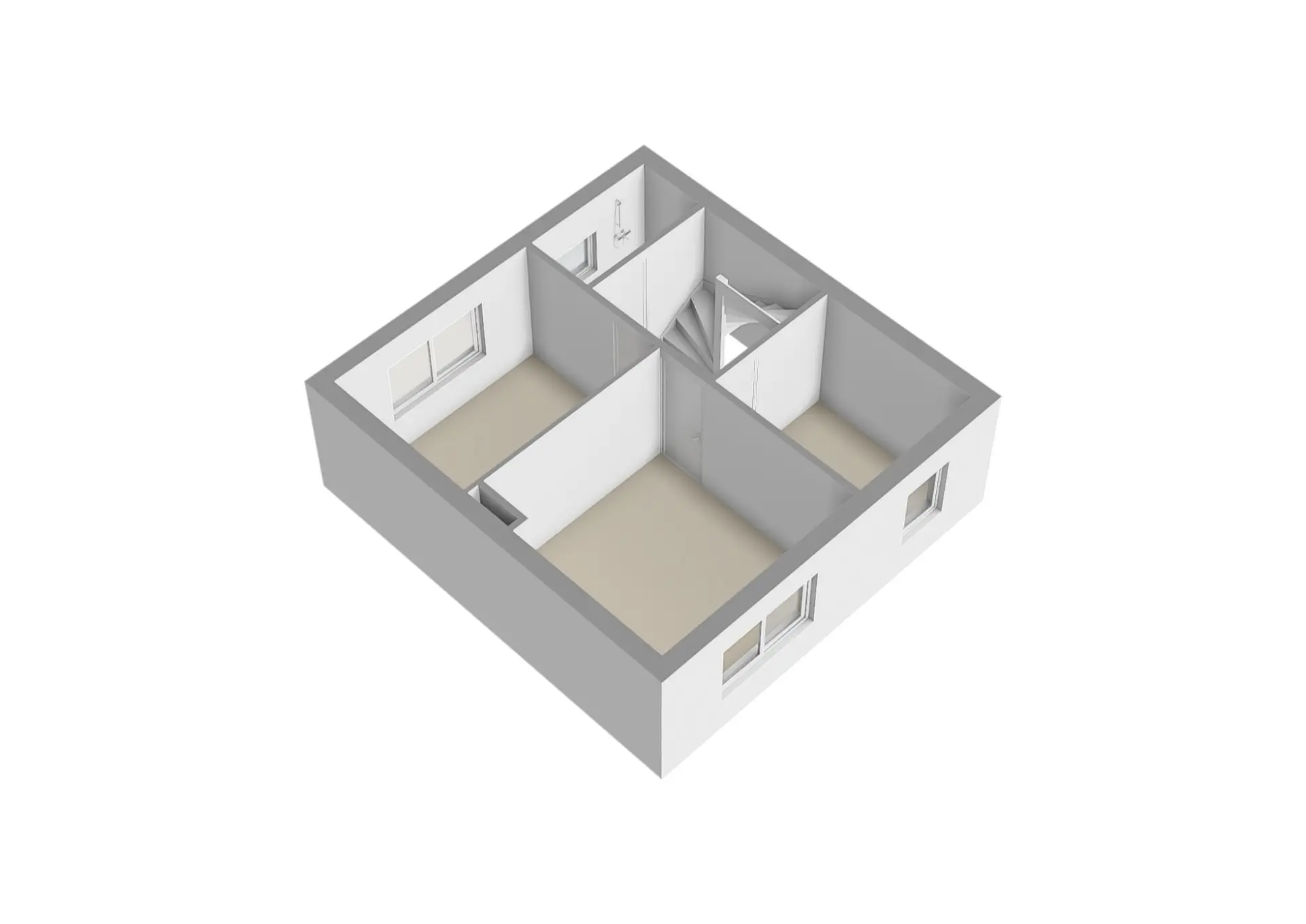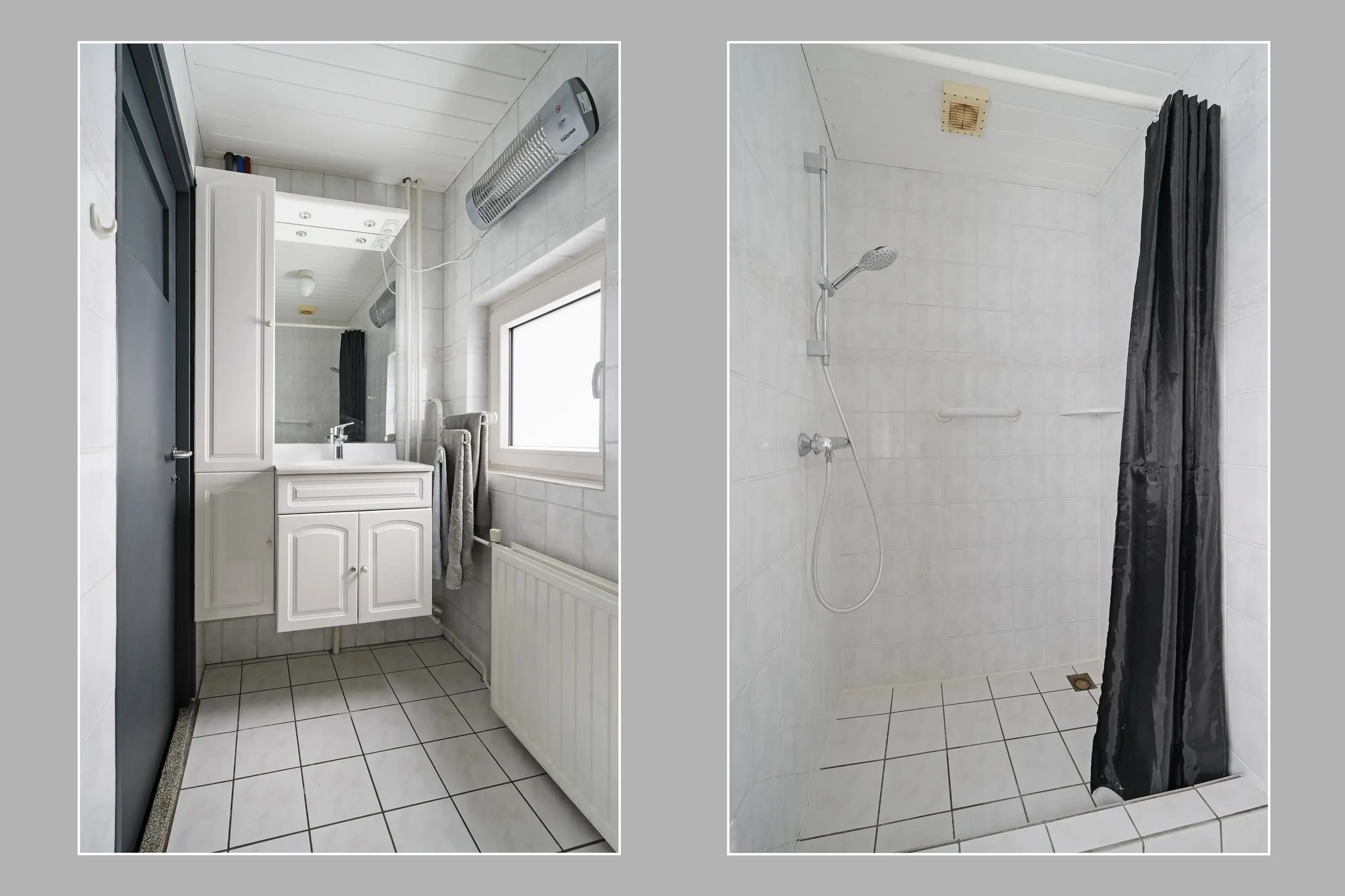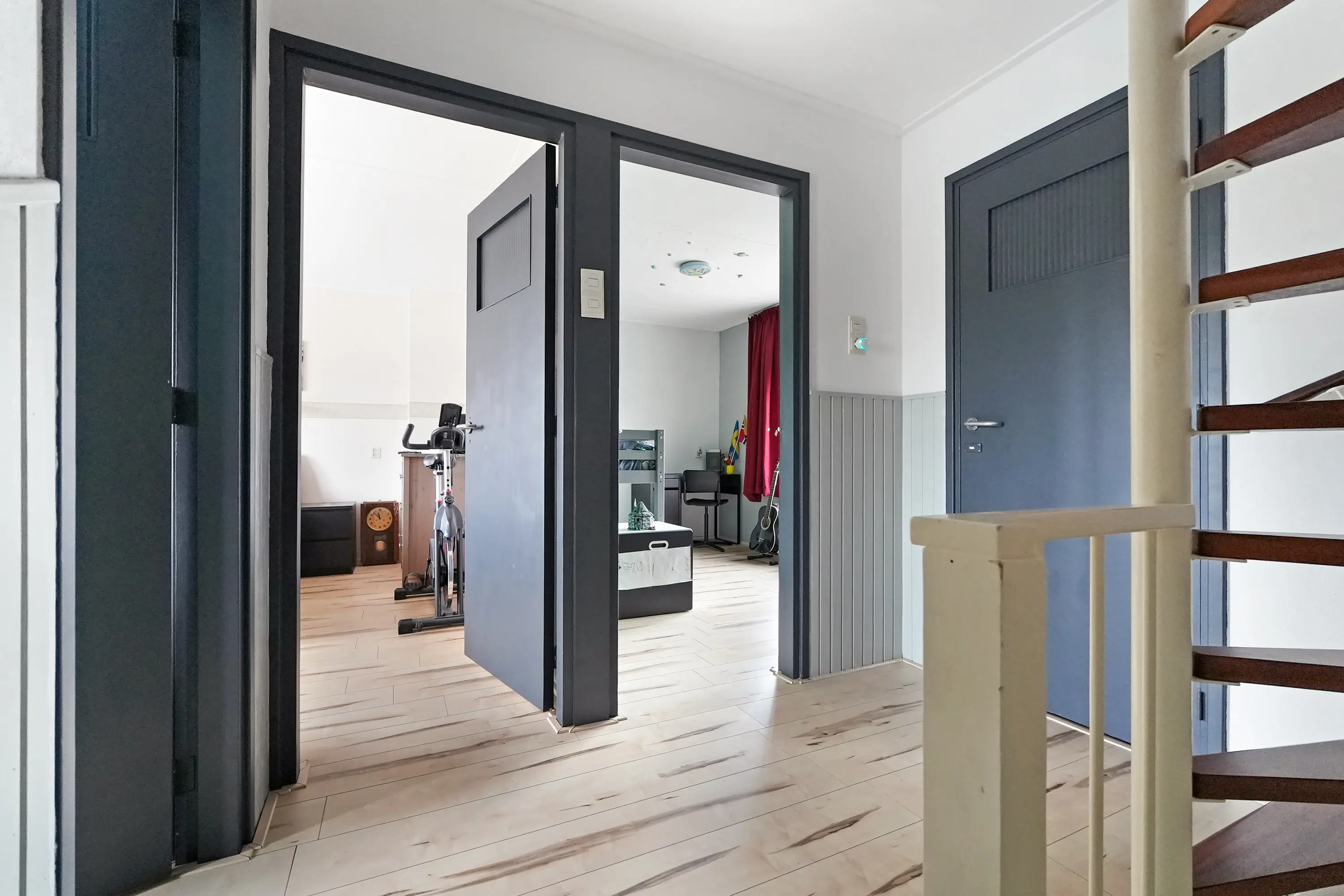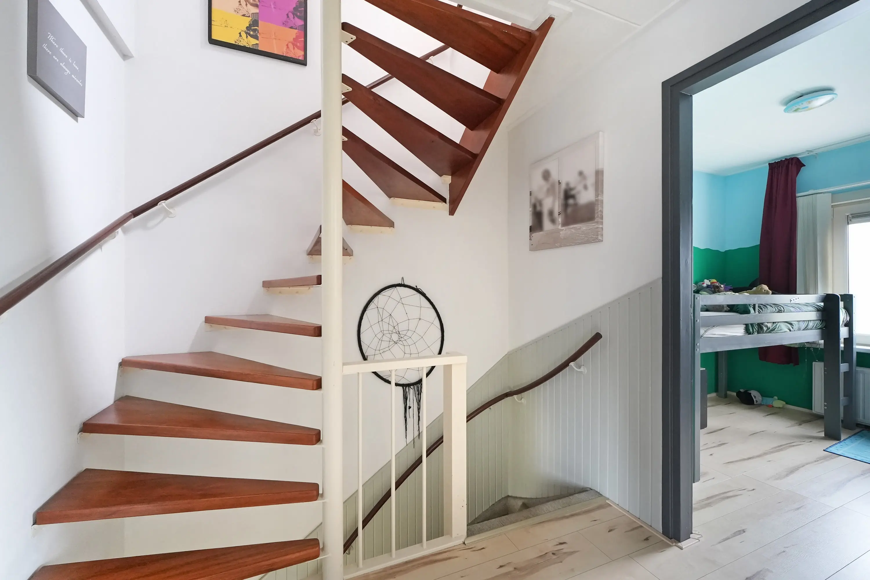 Overloop met vaste trap naar de 2e verdieping, drie mooie slaapkamers waarvan twee met rolluik en vervolgens een nette, volledig betegelde badkamer voorzien van wastafelmeubel en douche.