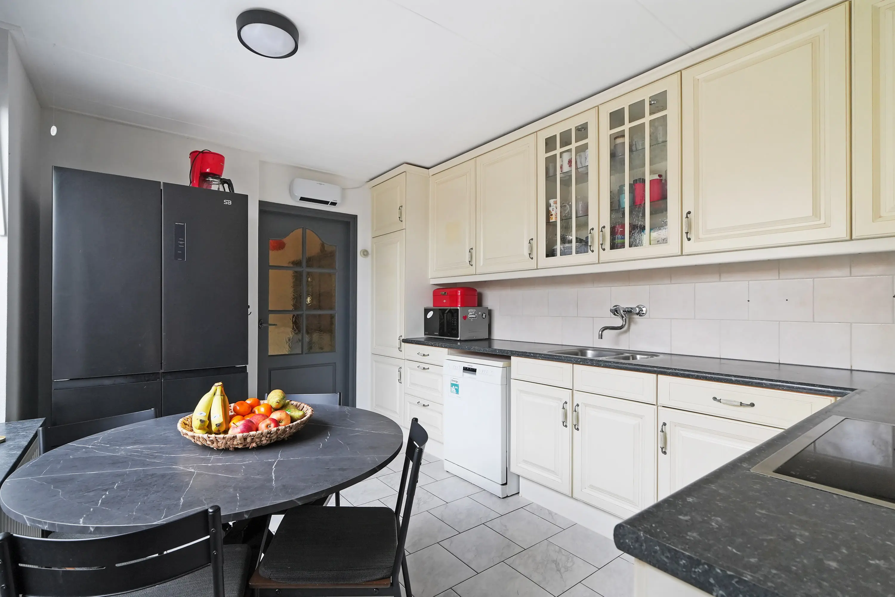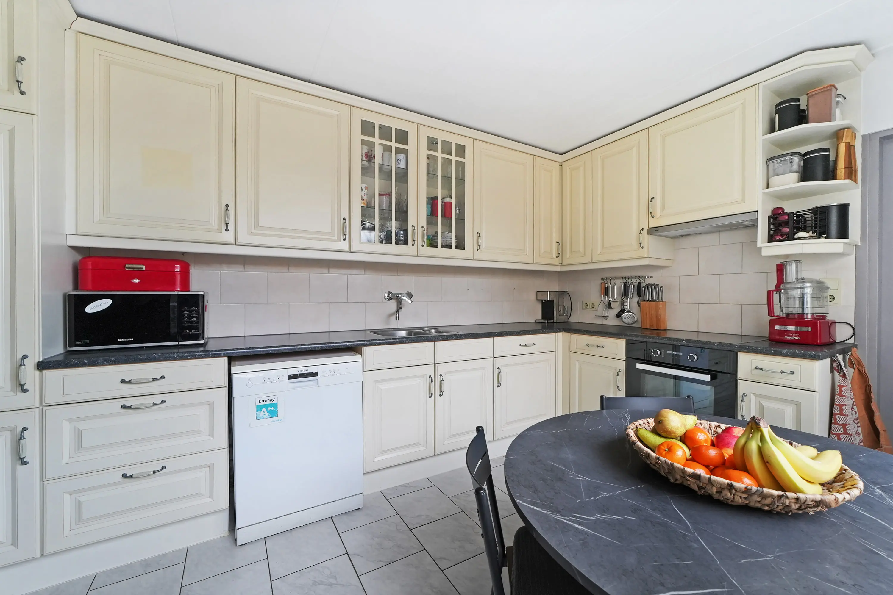 Hal, nette toilet met fonteintje, trap naar de 1e verdieping, trapkast, lichte doorzon woonkamer, dichte nette eetkeuken met de inrichting in een ruime hoekopstelling, boven- en onderkasten, boiler, toegang tot bijkeuken/berging en inbouwapparatuur: inductiekookplaat / wasemkap / oven. De aangrenzende bijkeuken/berging is voorzien van wasmachineaansluiting en kunststof tuindeur.