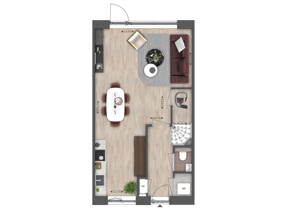 Bij binnenkomst passeer je een aparte kastruimte waar de warmtepomp wordt geplaatst, het toilet en vervolgens de trap naar de verdieping. Dan loop je de woonkamer met open keuken binnen. Gelijk tref je een handige trapkast die extra opbergruimte biedt voor allerhande spullen. Het zitgedeelte ligt aan de achterzijde en door de grote raampartij kijk je daar heerlijk de tuin in. De keukenopstelling is aan de voorzijde gepland en daar worden dan ook de aansluitingen voorzien.