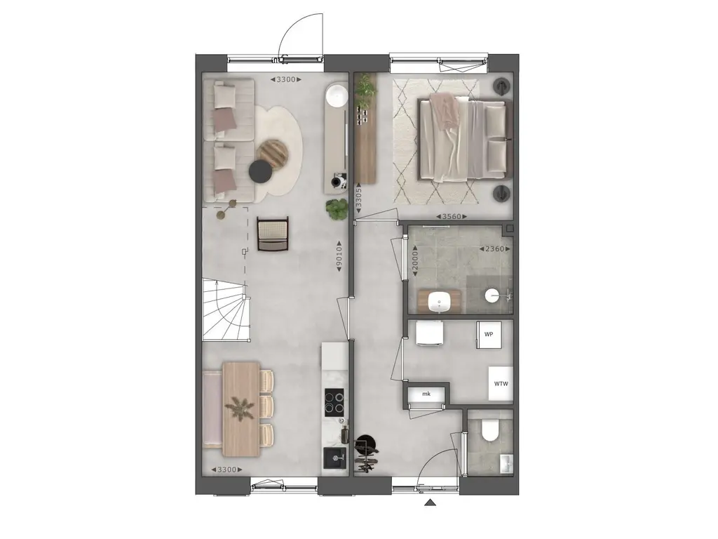 U vindt de keukenopstelling aan de voorzijde waar door de rechte opstelling ook ruimte is voor het plaatsen van de eettafel. De zithoek is aan de achterzijde gepland met uitzicht op de tuin. De open trap leidt naar de verdieping die niet is ingedeeld maar wat optioneel wel mogelijk is.