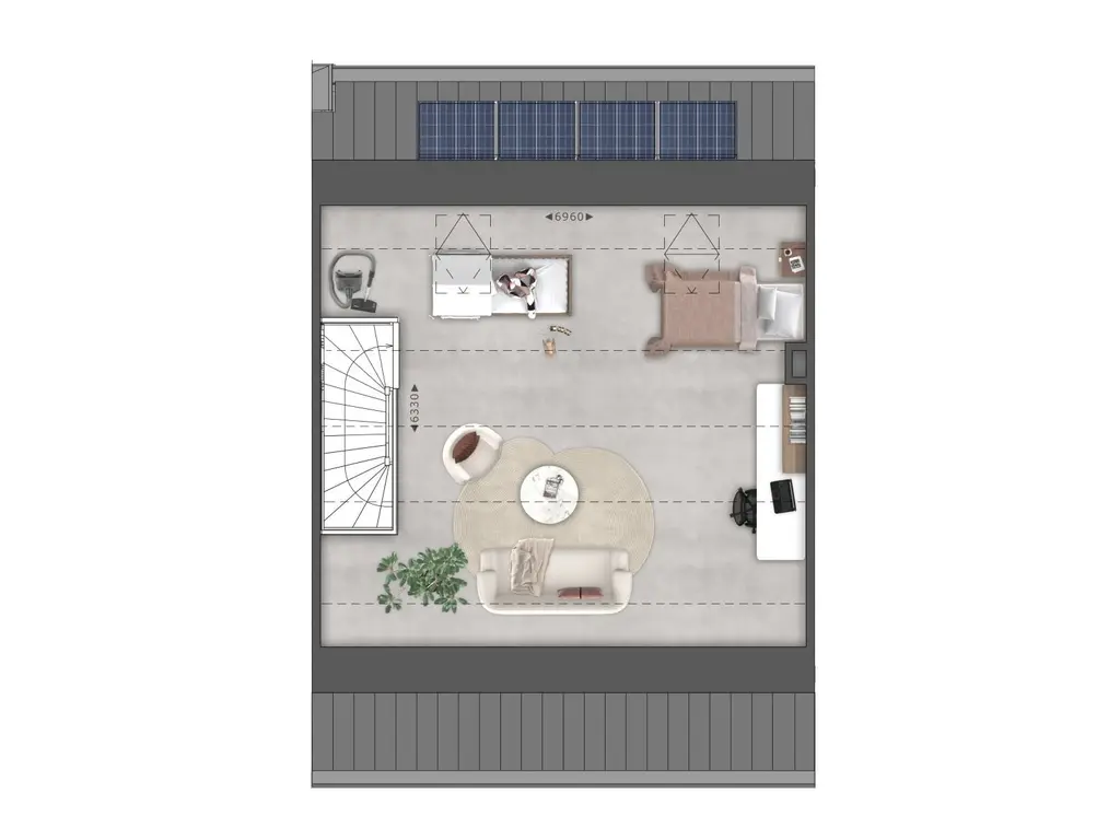 In de woonkamer met open keuken wordt door de open trap een natuurlijke maar toch luchtige scheiding gecreëerd tussen de zithoek en de keuken.
