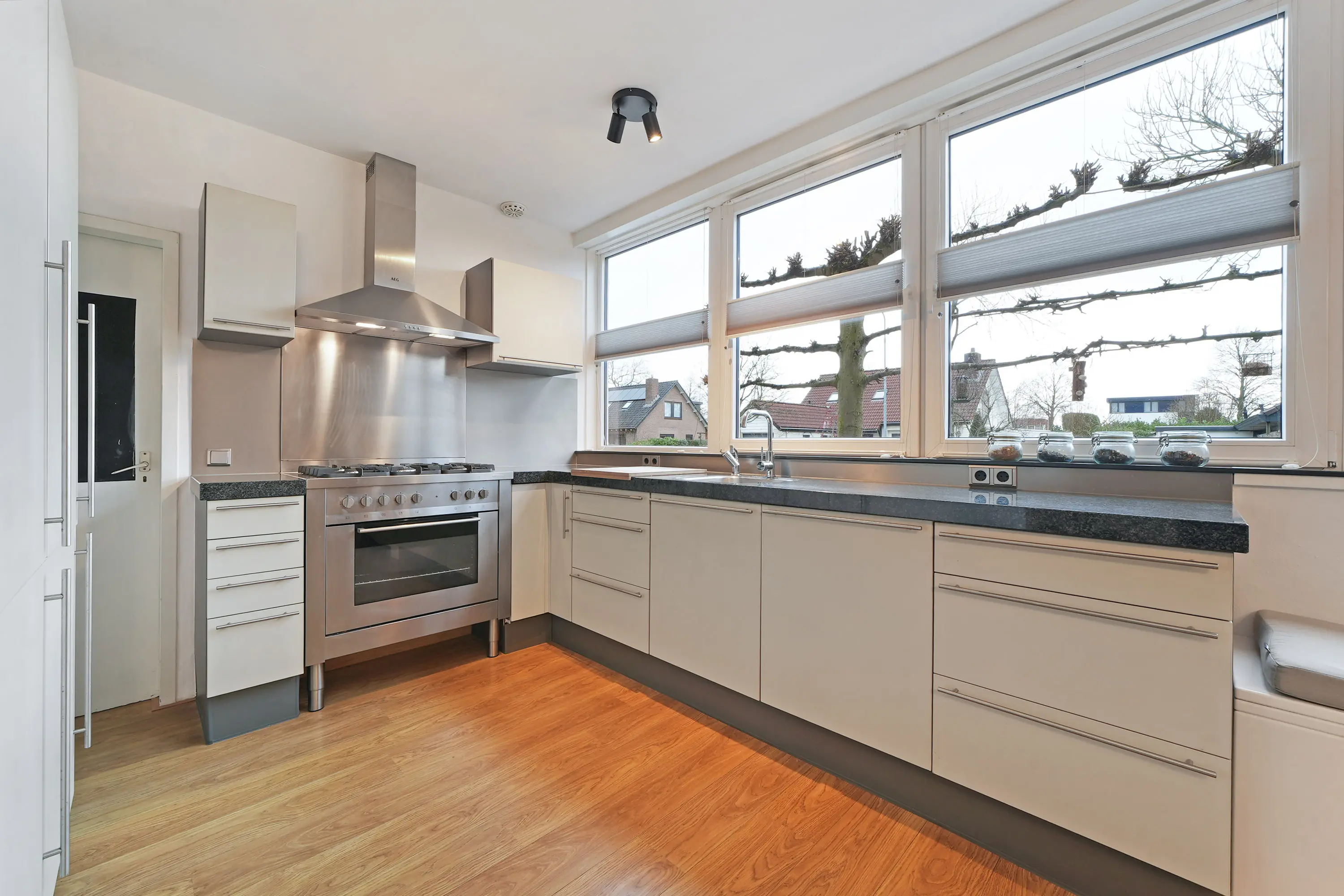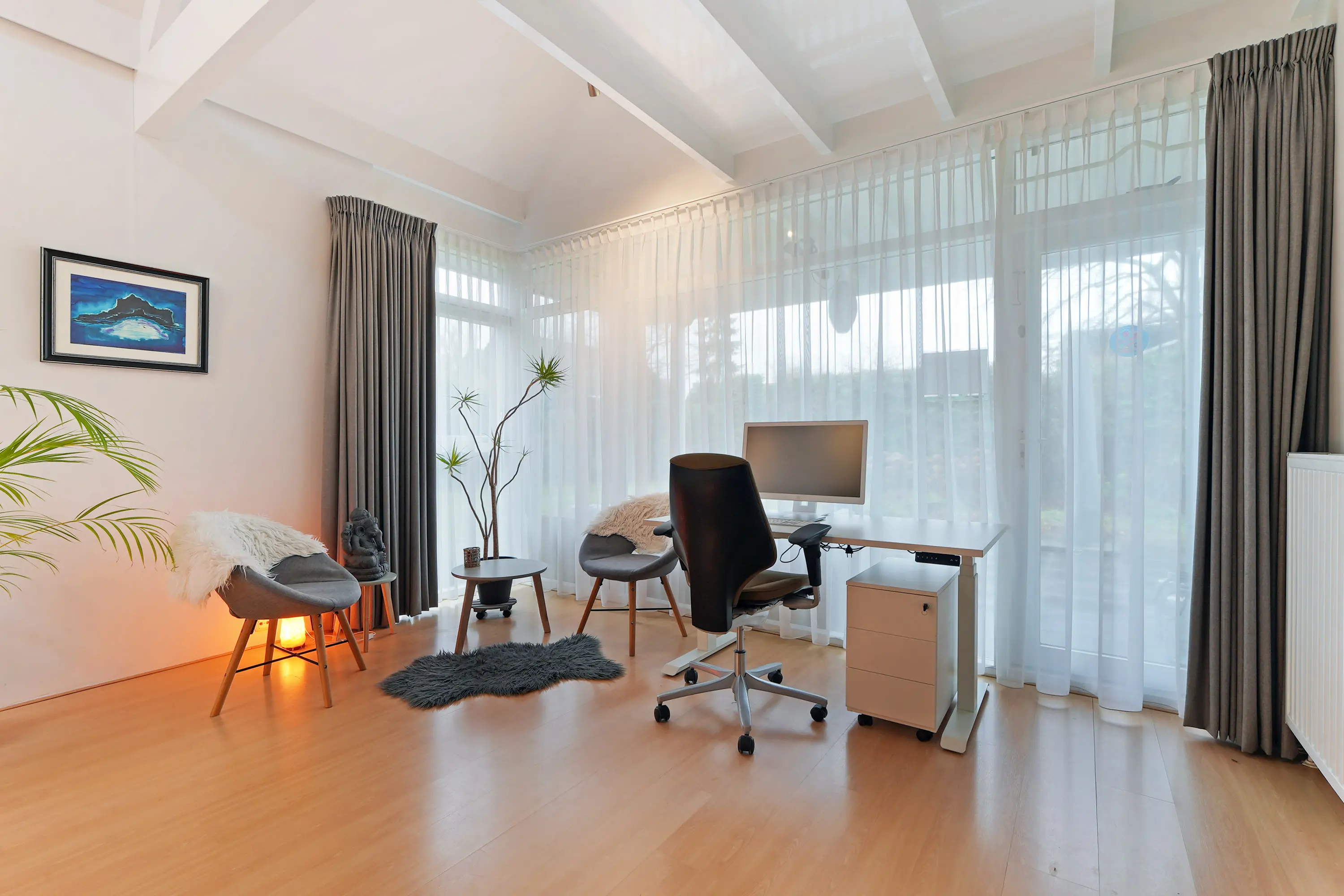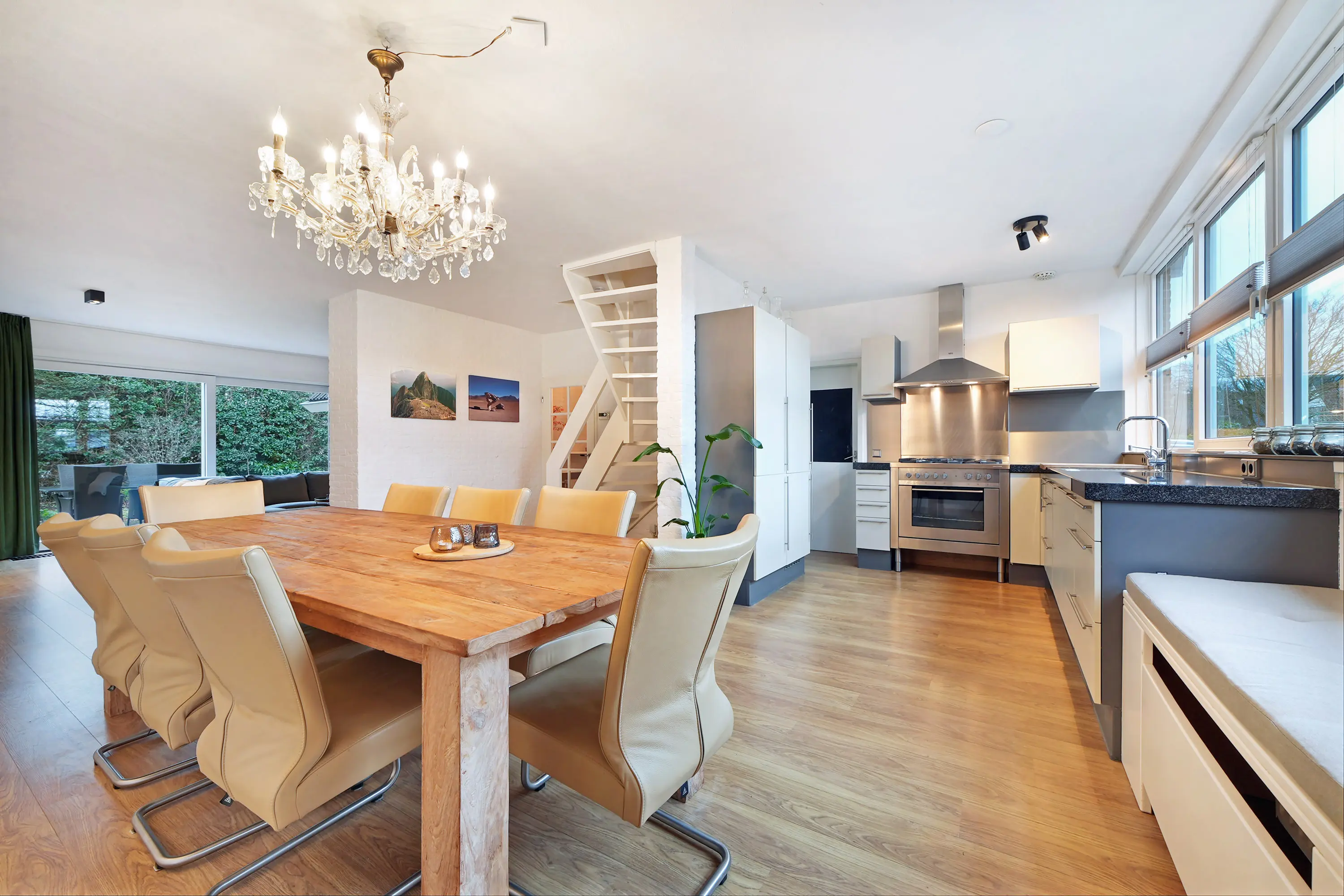 Hal, garderobe, luxe toilet met fonteintje, deur naar de ruime garage, lichte en tuingerichte woonkamer met gezellige gashaard en kunststof schuifpui naar de tuin. Via de woonkamer bereik je de praktijkruimte en de riante open woonkeuken met de inrichting in een hoekopstelling en inbouwapparatuur: 5-pits gaskookplaat / oven / wasemkap / vaatwasser / koelkast / vriezer en Quooker. Aansluitend aan de keuken bevindt zich de praktische bijkeuken met tuindeur, wasmachineaansluiting en opstelling zonneboiler en c.v.-ketel. De praktijk-/werkruimte is voorzien van tuindeur, lichtkoepel, inbouwkast en schuifdeur naar de volledig betegelde badkamer met toilet, douchecabine en wastafel.