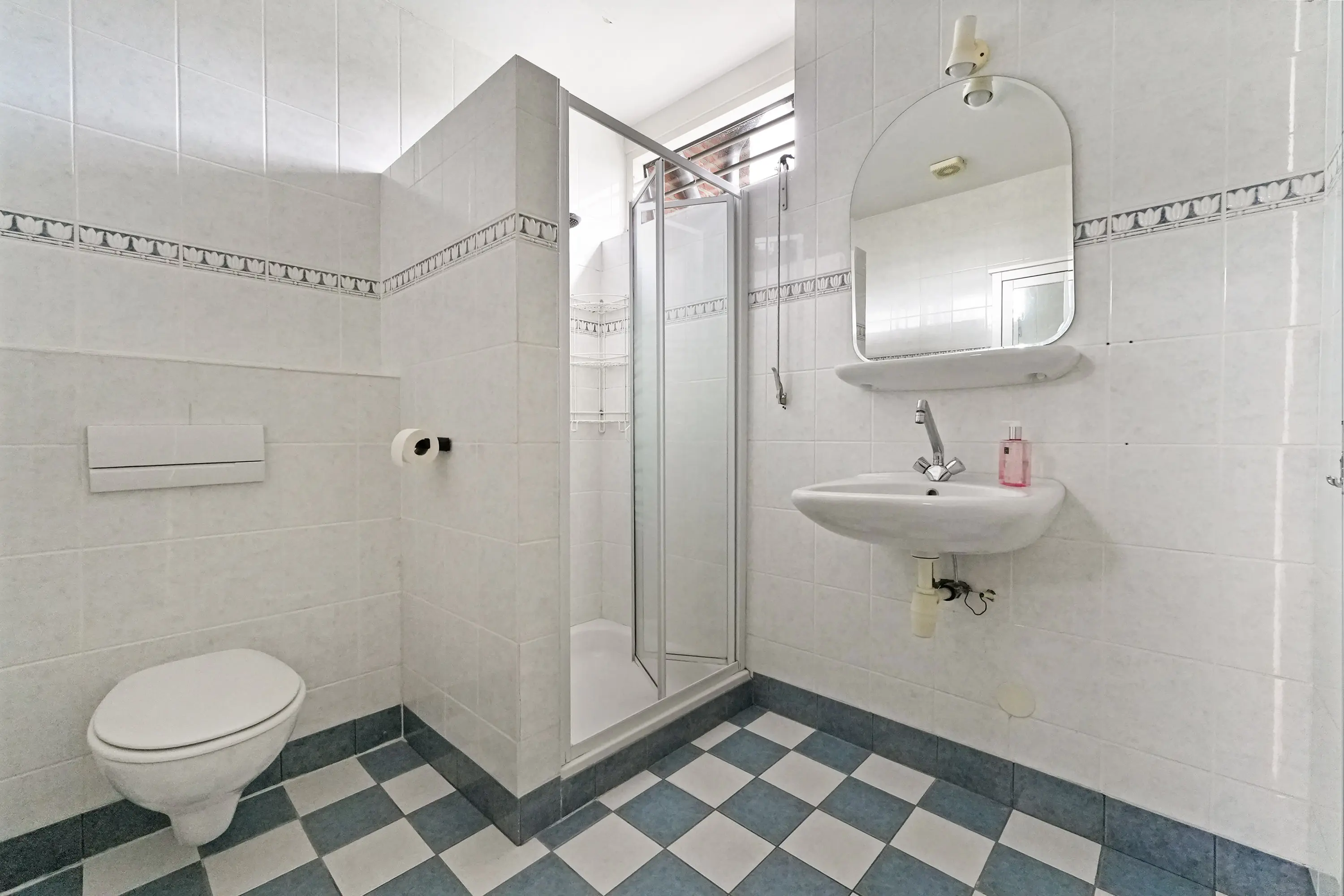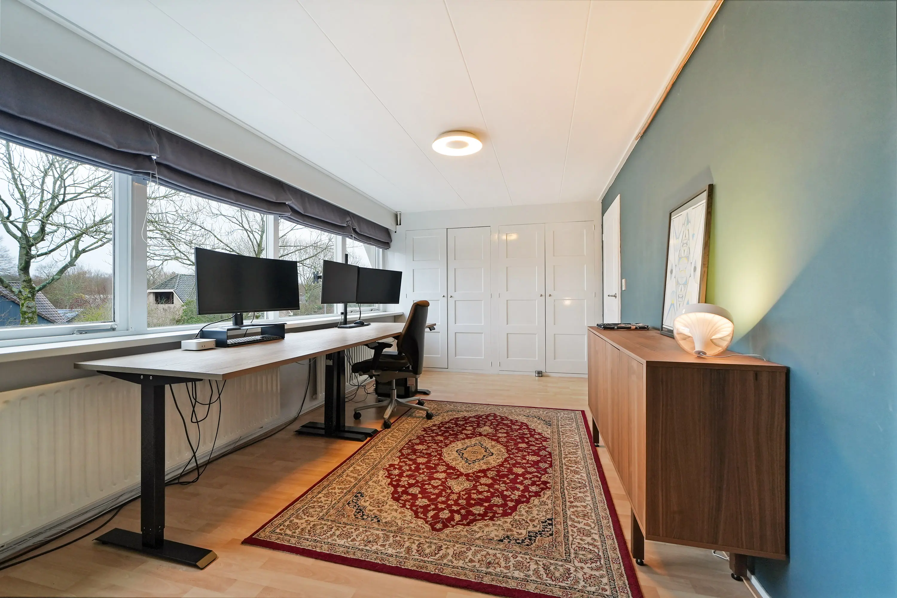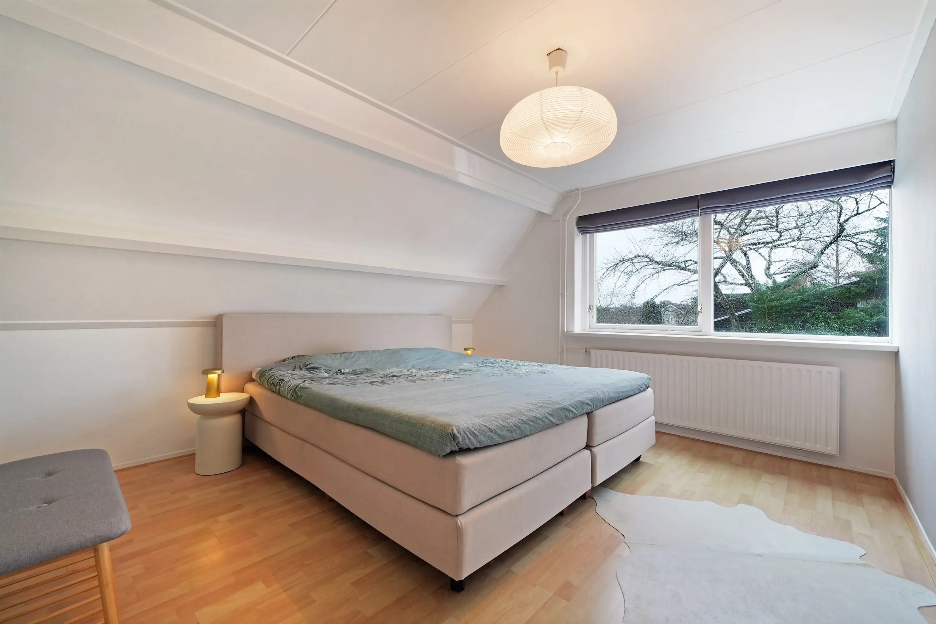 Via een trap in de woonkamer bereik je de overloop met vaste trap naar de 2e verdieping, dakraam en vaste kastruimte. Er zijn drie ruime slaapkamers waarvan één met ruime inbouwkast en de tweede, volledig betegelde badkamer is voorzien van bad-/douchecombinatie, toilet, wastafelmeubel, elektrische vloerverwarming en design-radiator.