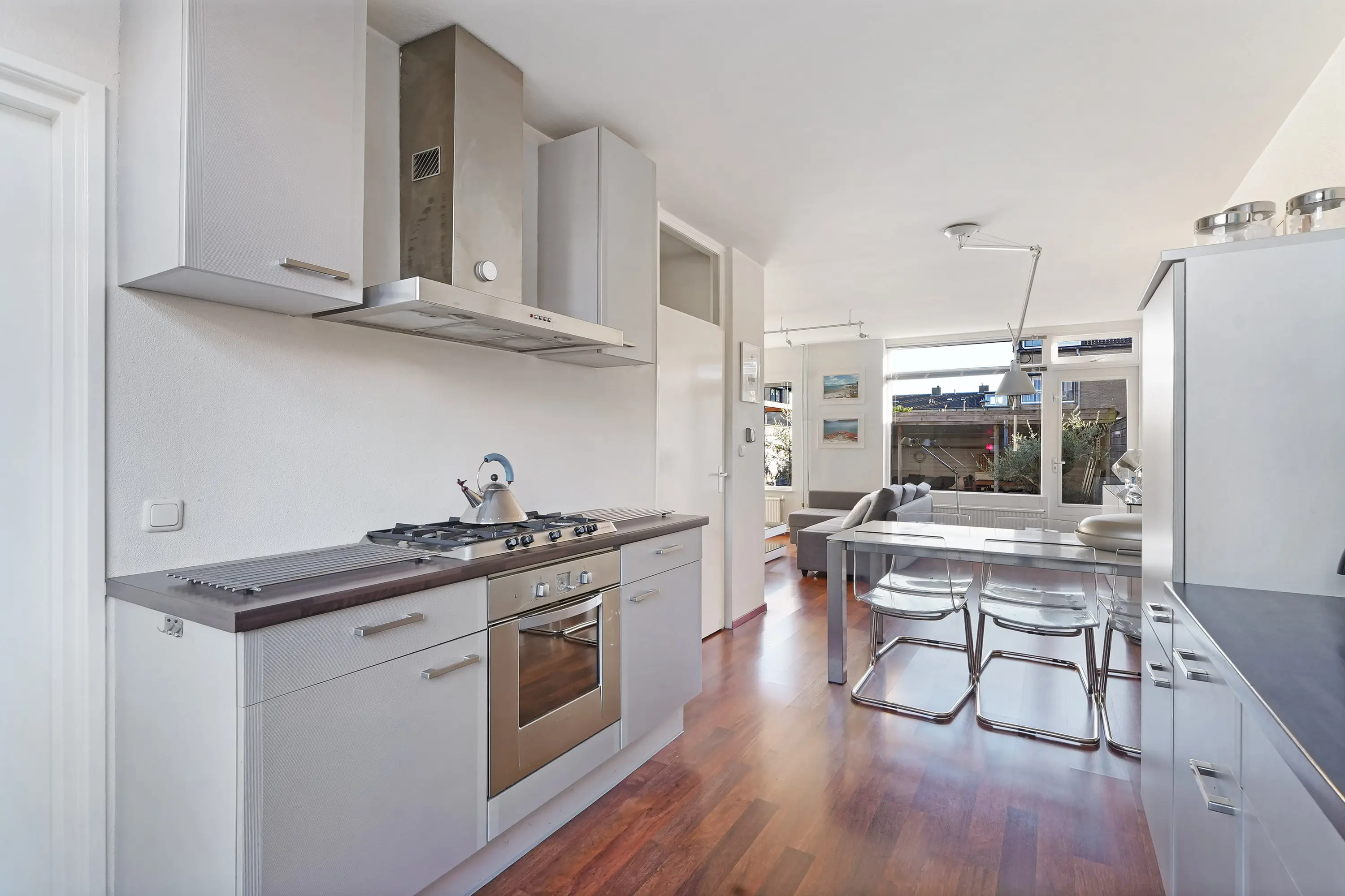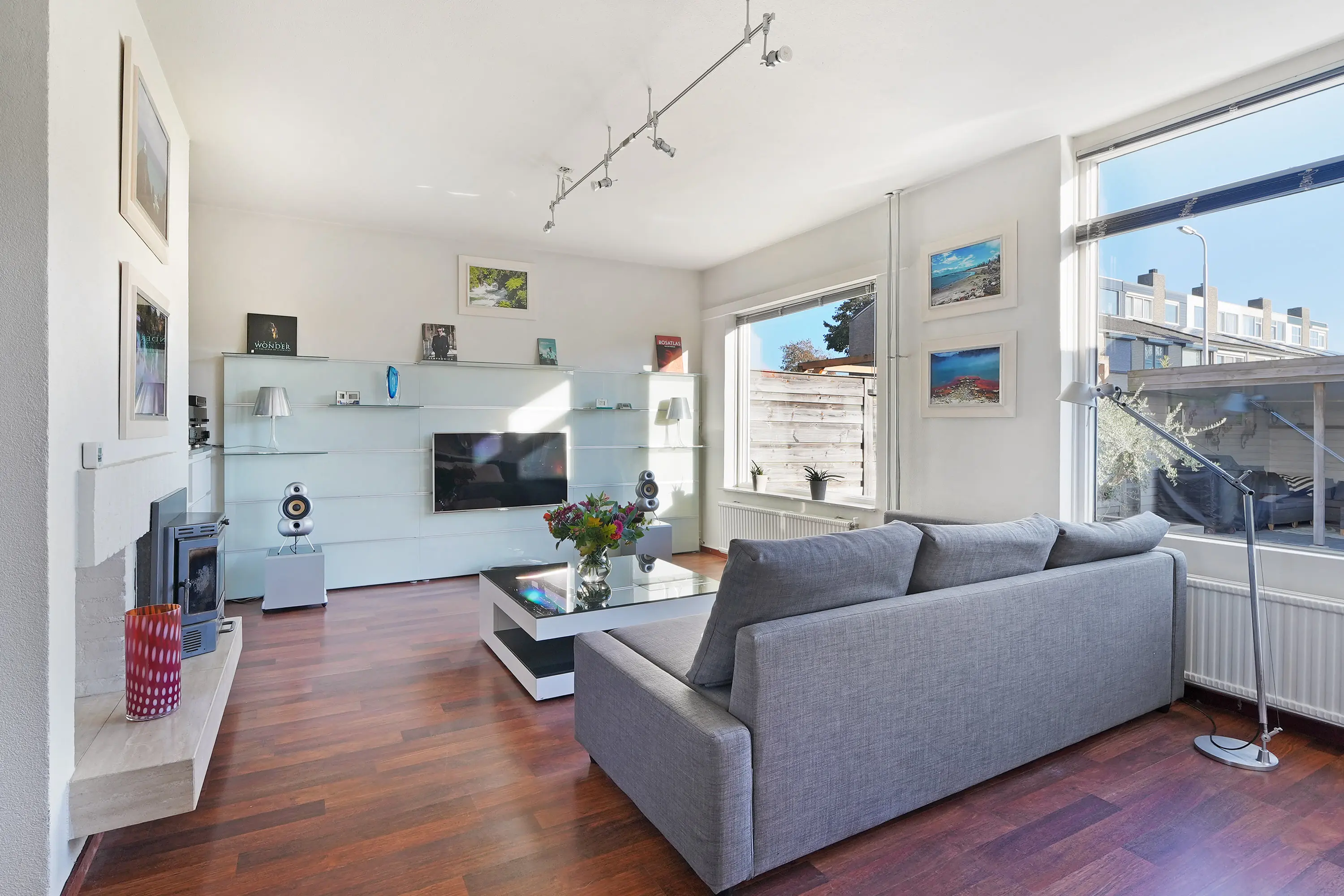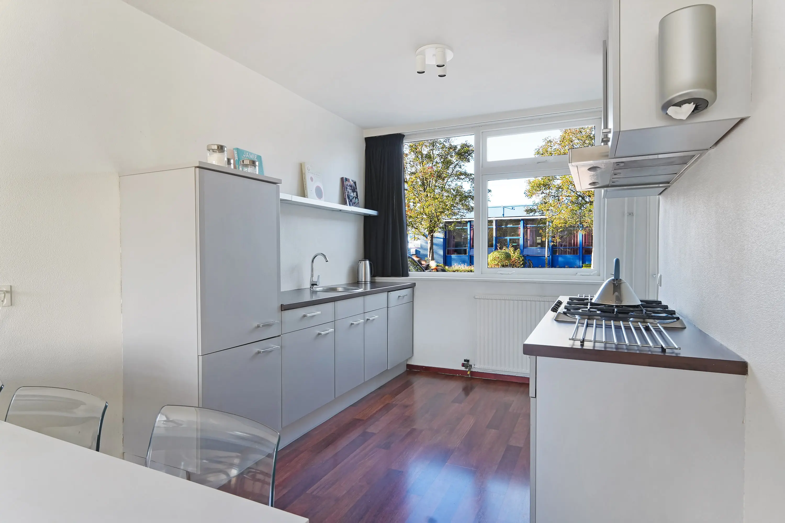 In de woonkamer valt direct de ruimtelijkheid en de fijne lichtinval op dankzij de grote raampartijen aan de tuinzijde. De zithoek bevindt zich aan de achterzijde en beschikt over een sfeervolle haard. De eethoek en de keuken liggen aan de voorzijde, waarbij de keuken is uitgevoerd in een parallelle opstelling: een licht en praktisch geheel.