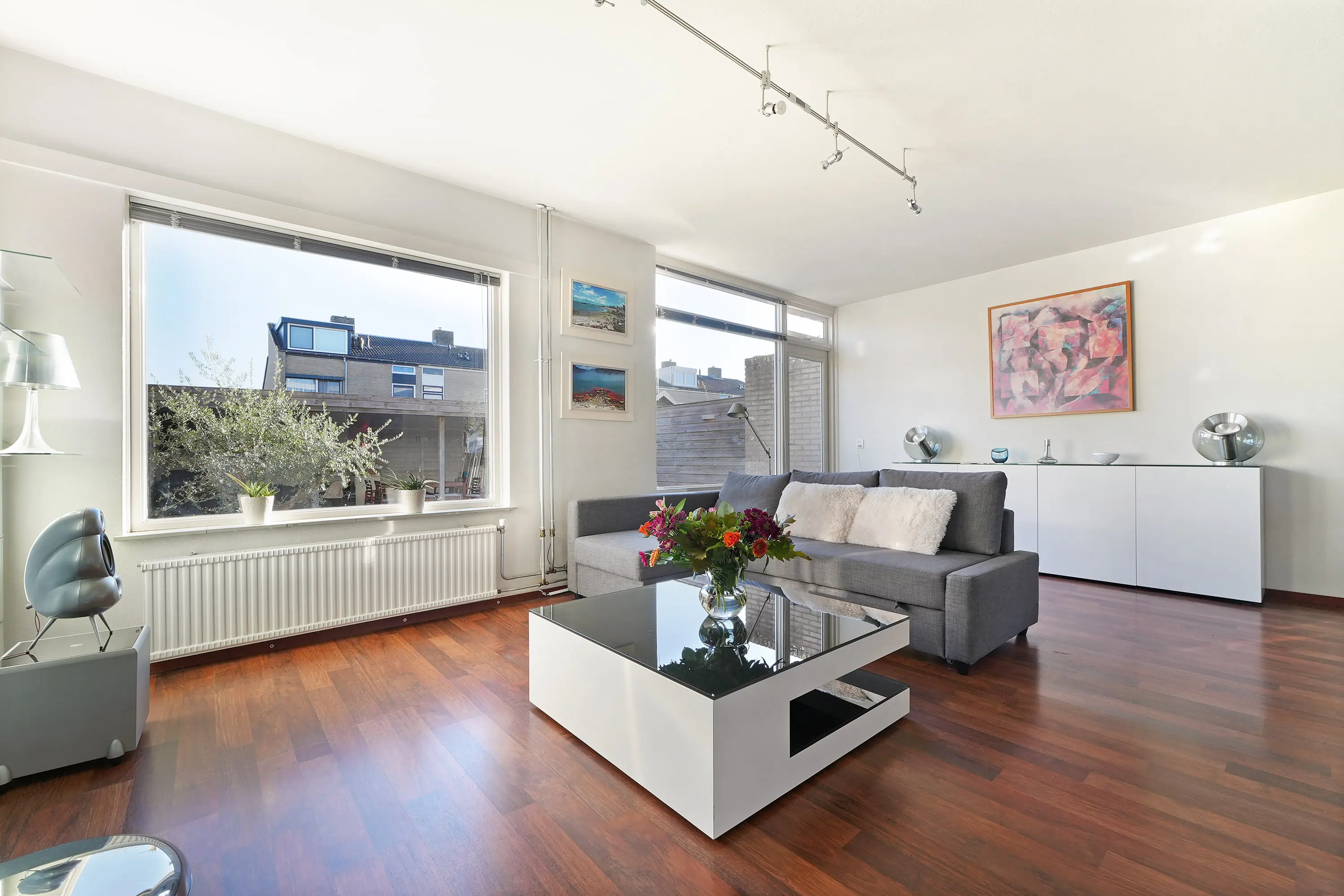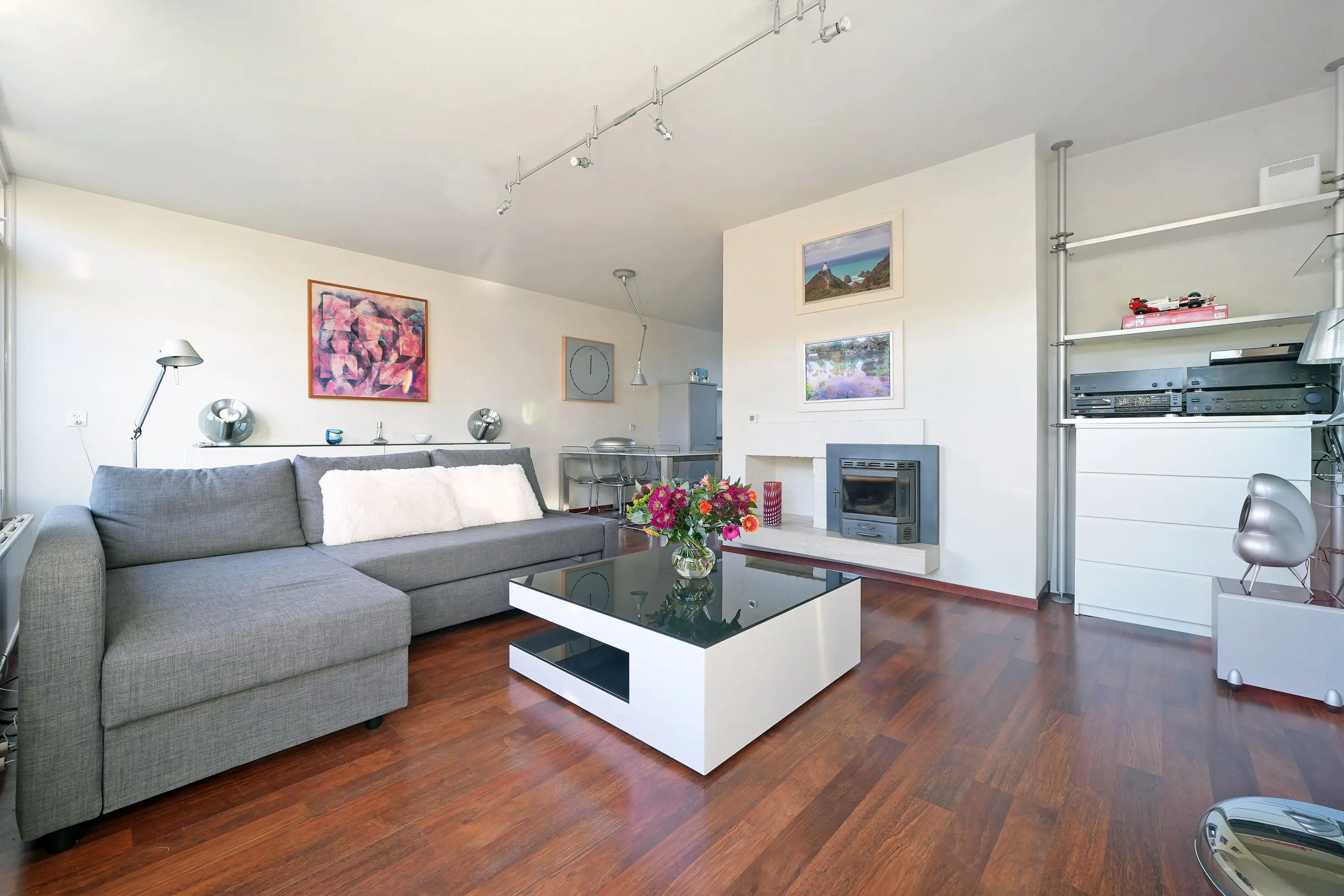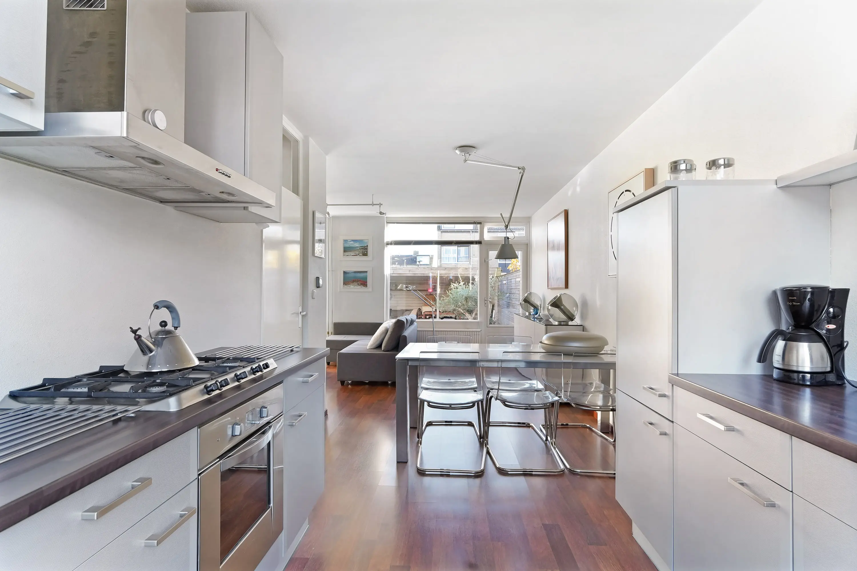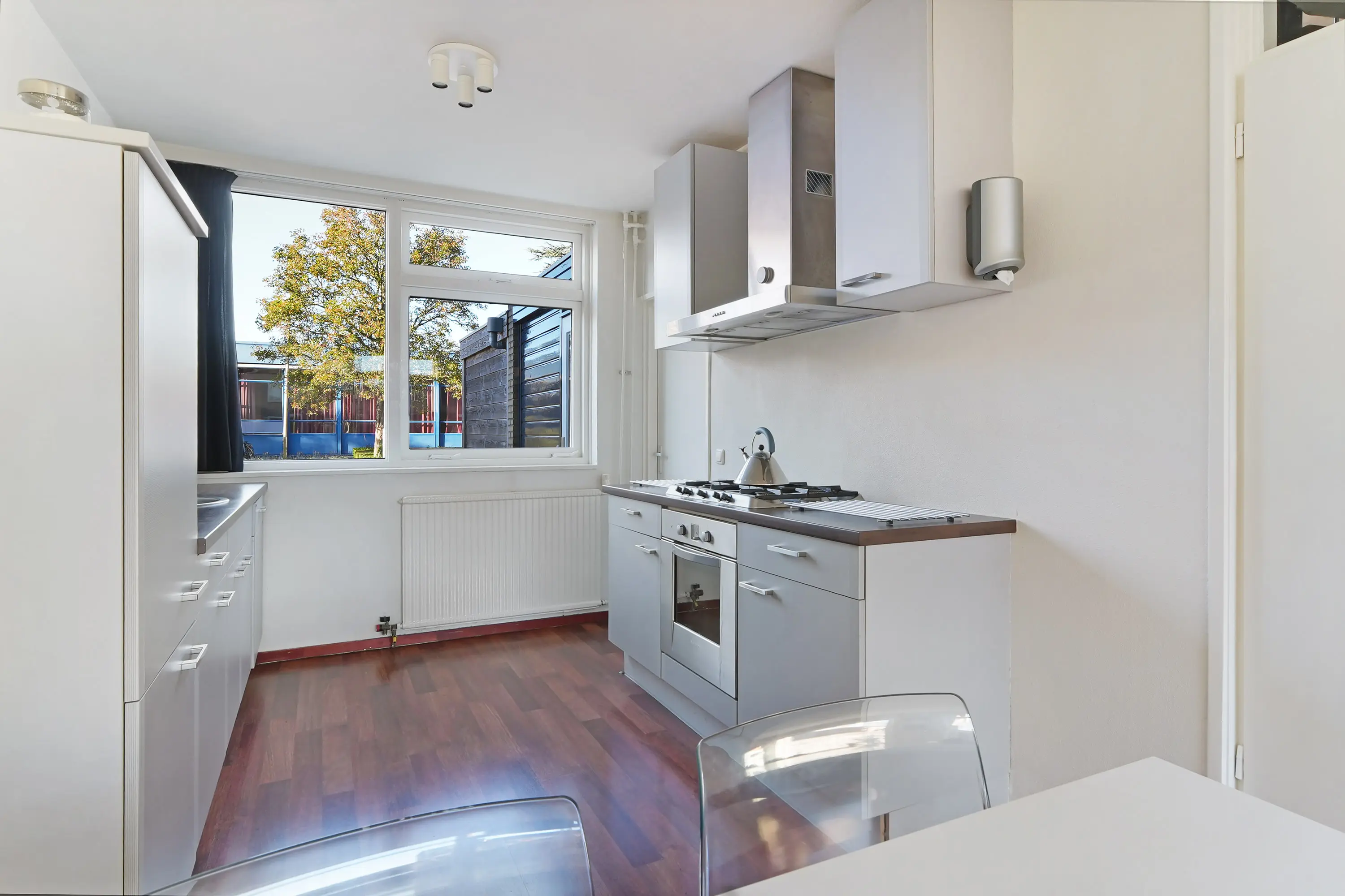 In de woonkamer valt direct de ruimtelijkheid en de fijne lichtinval op dankzij de grote raampartijen aan de tuinzijde. De zithoek bevindt zich aan de achterzijde en beschikt over een sfeervolle haard. De eethoek en de keuken liggen aan de voorzijde, waarbij de keuken is uitgevoerd in een parallelle opstelling: een licht en praktisch geheel.