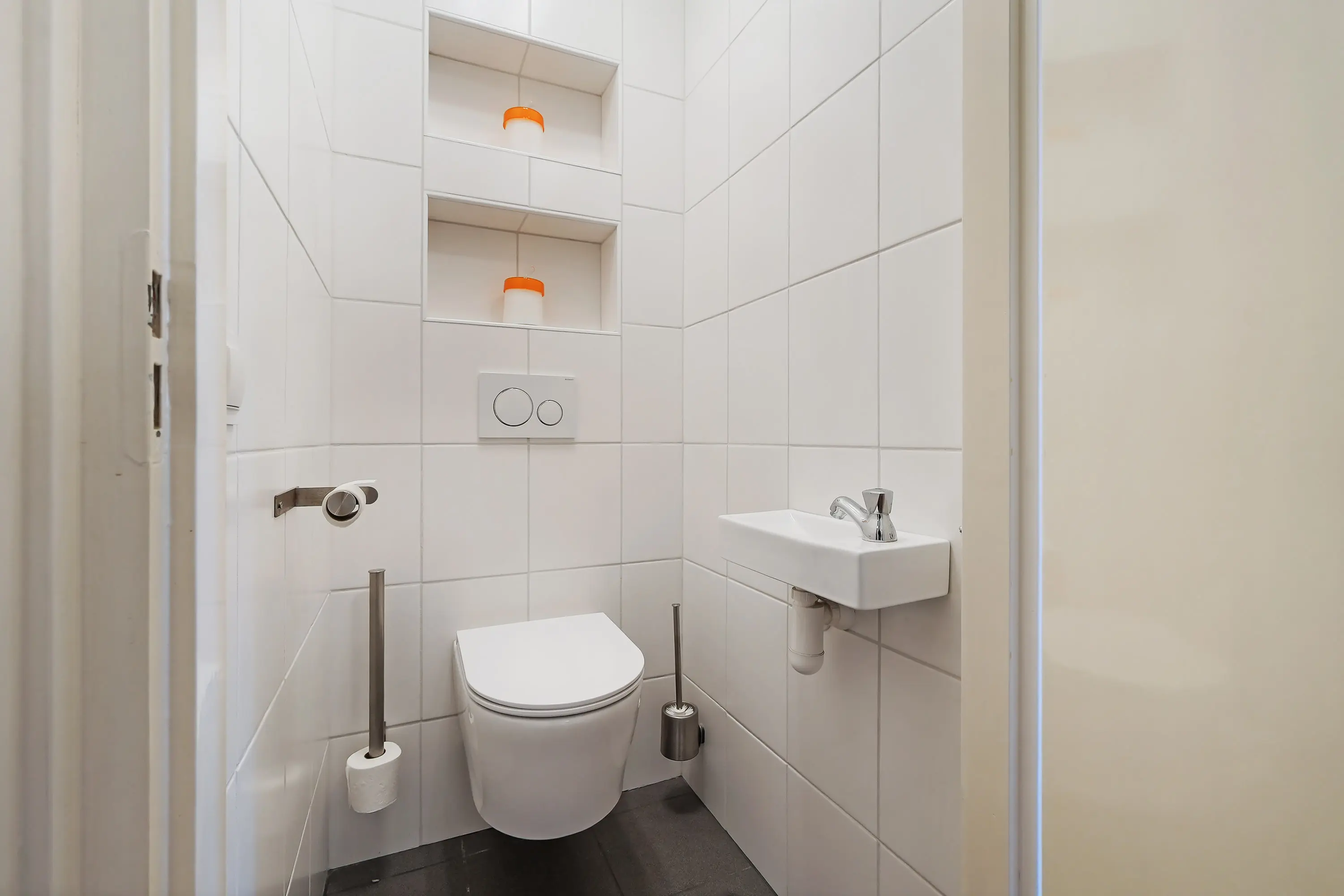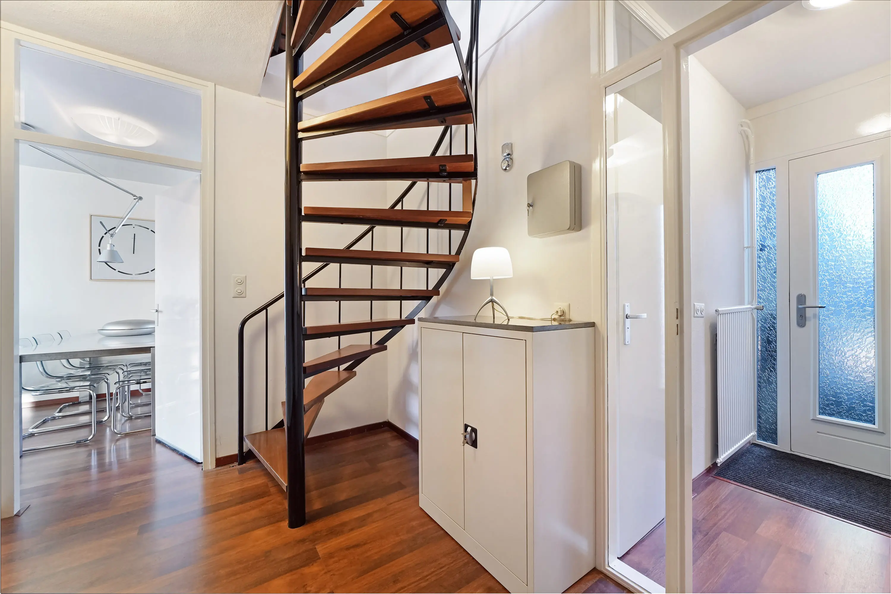 Entree in de hal met meterkast, toilet met fonteintje, open trapopgang naar de eerste verdieping en toegang tot de woonkamer.