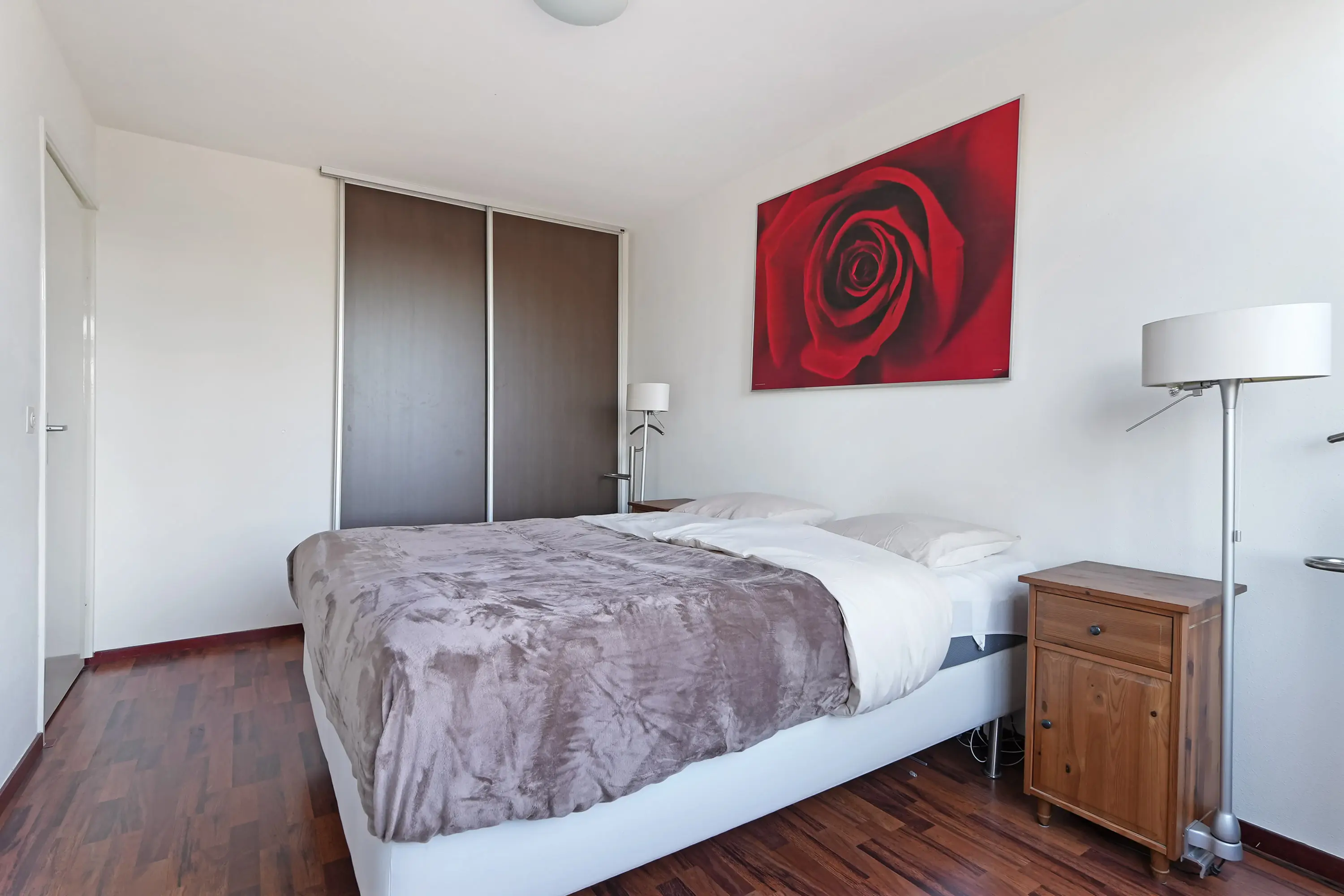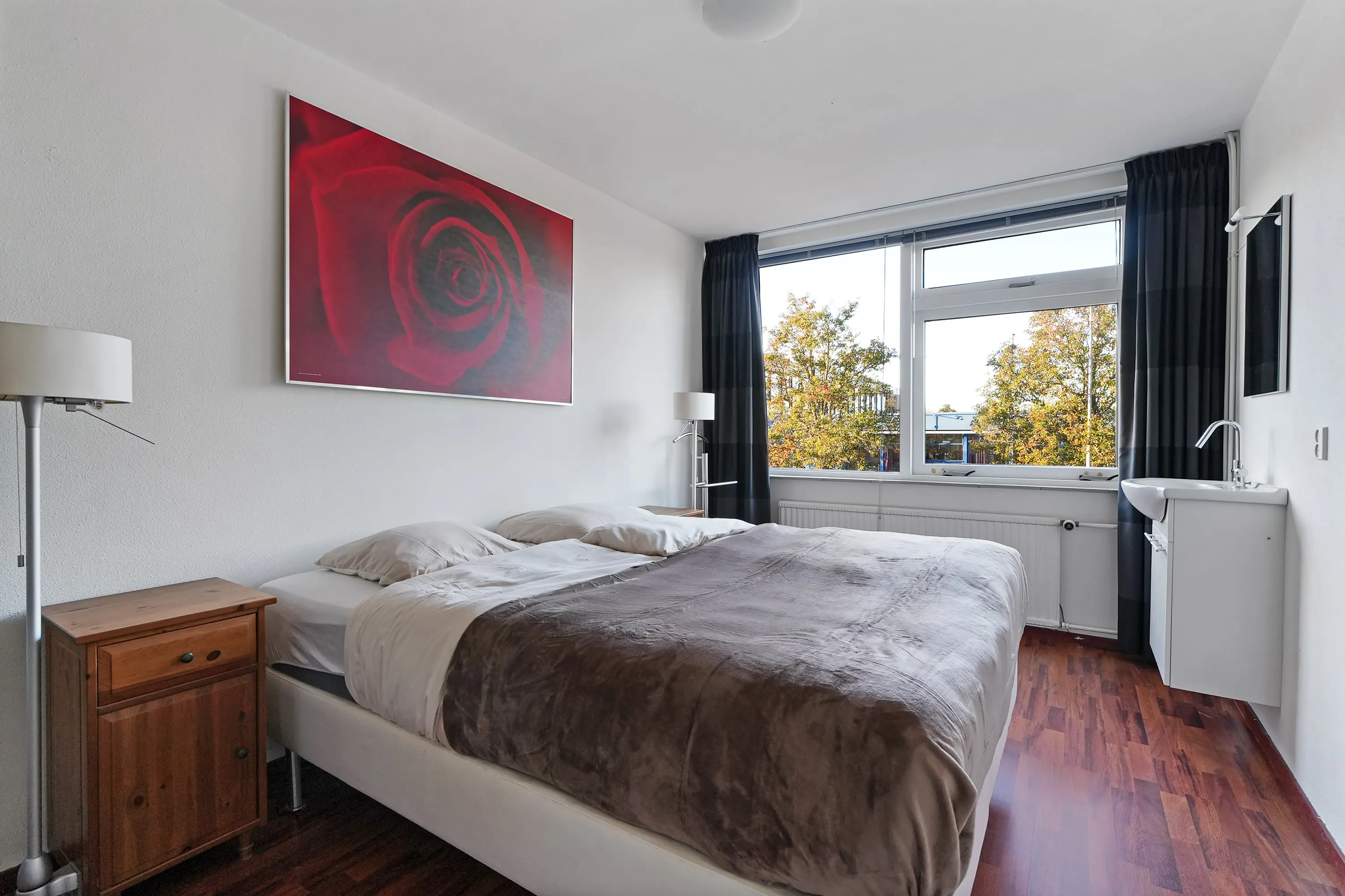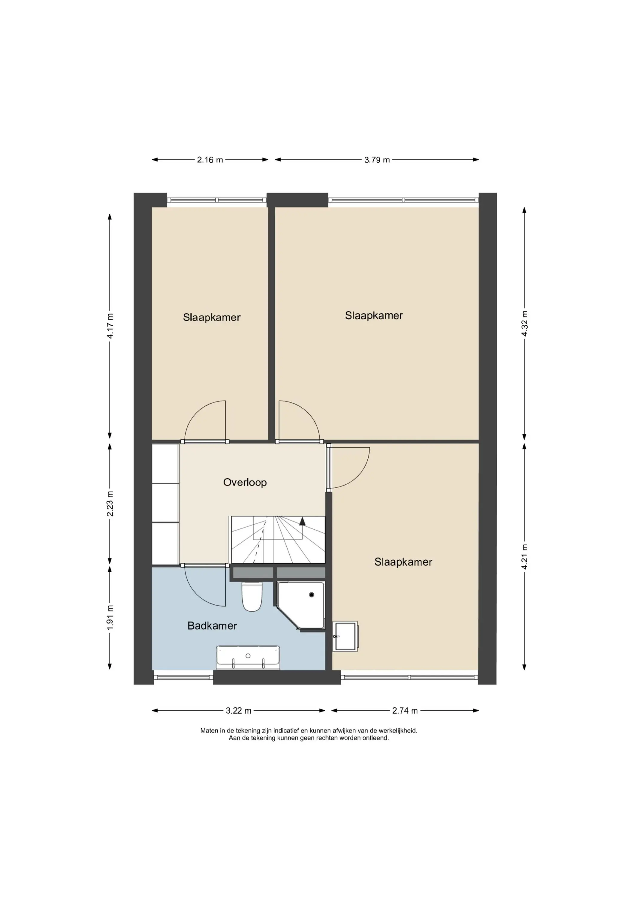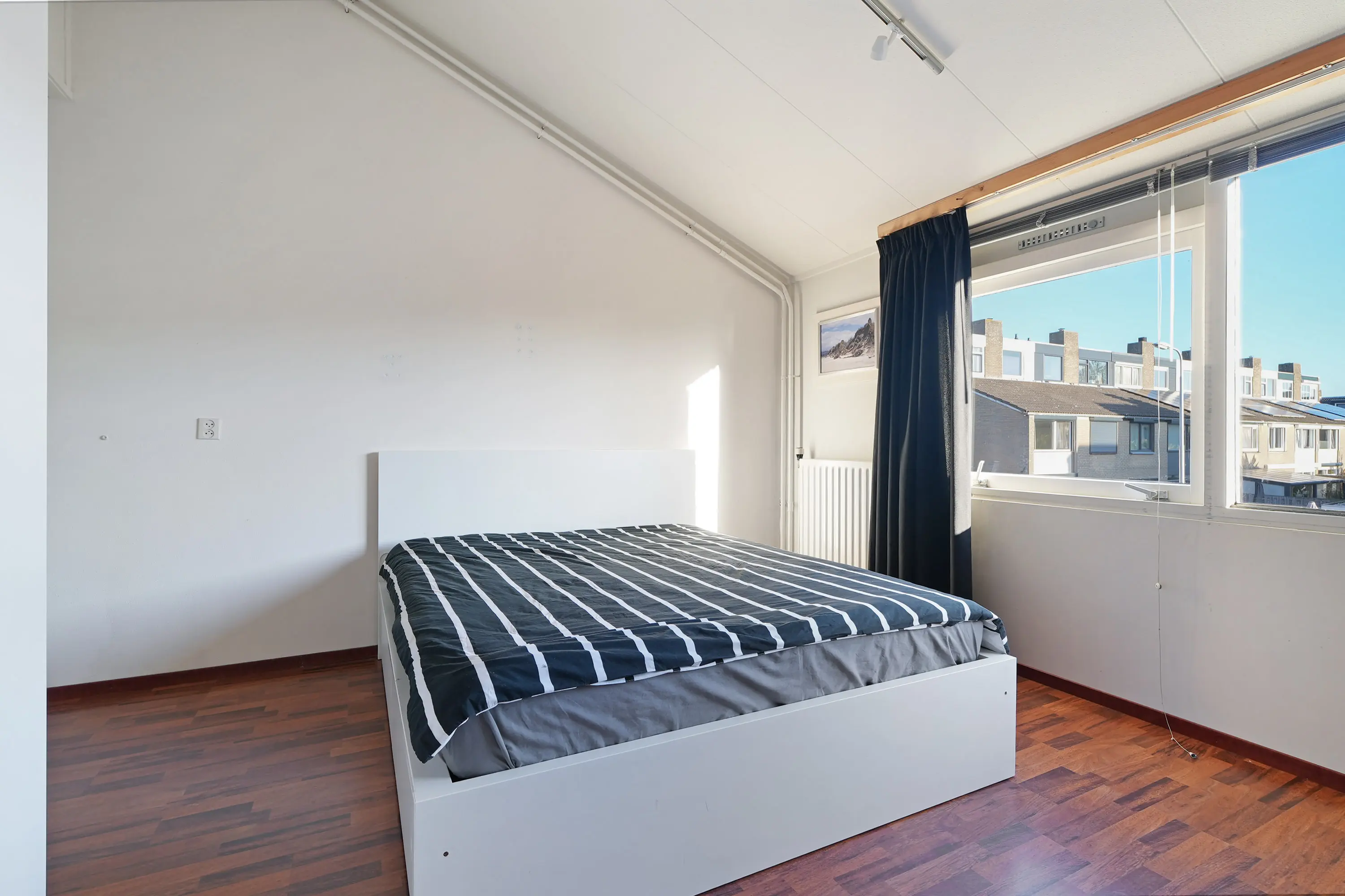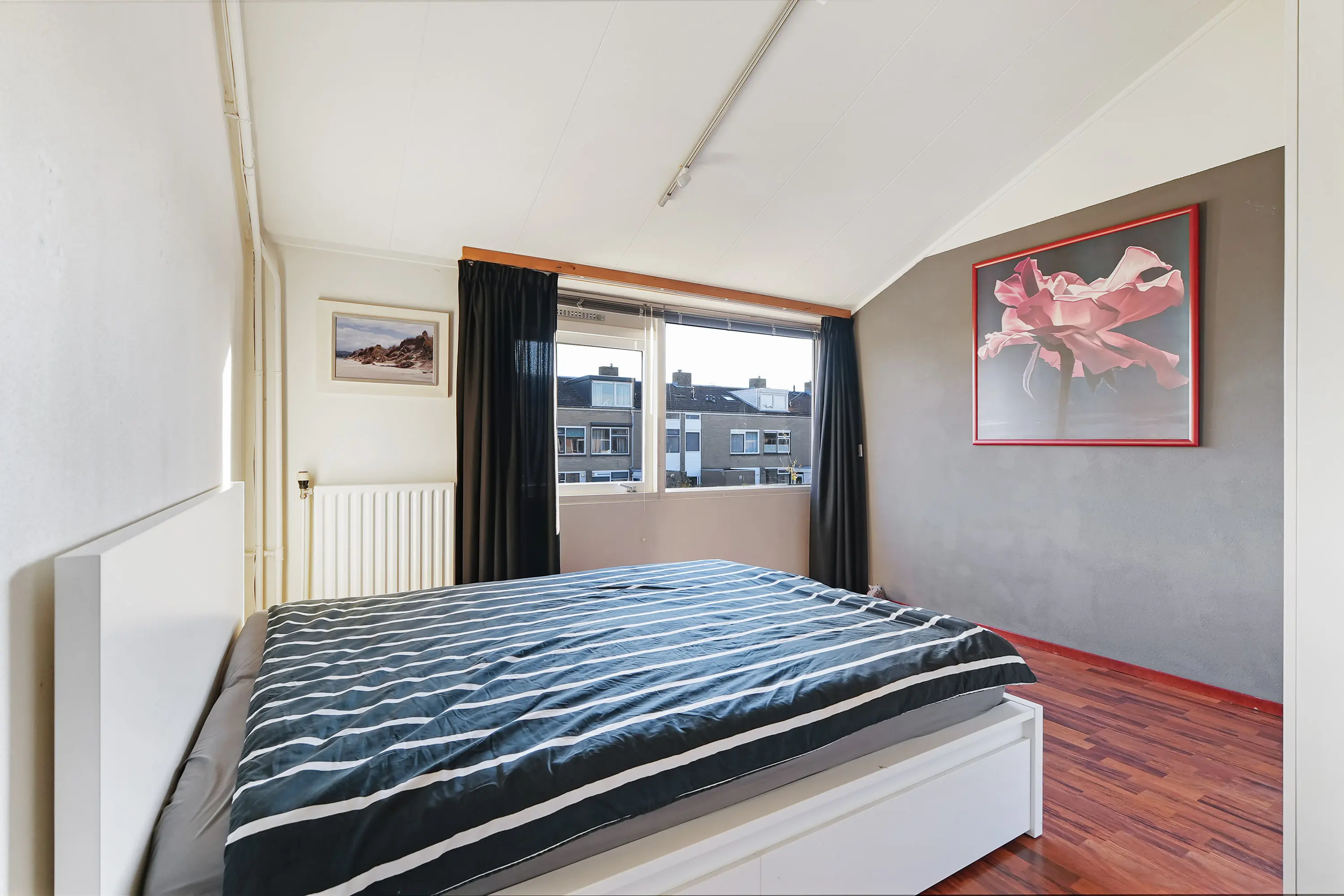 De overloop met vaste kastenwand geeft toegang tot drie ruime slaapkamers, waaronder de royale ouderslaapkamer (ca. 4,30 x 3,75 m). De kamers aan de tuinzijde bieden door de hoog oplopende plafonds een bijzondere ruimtebeleving.