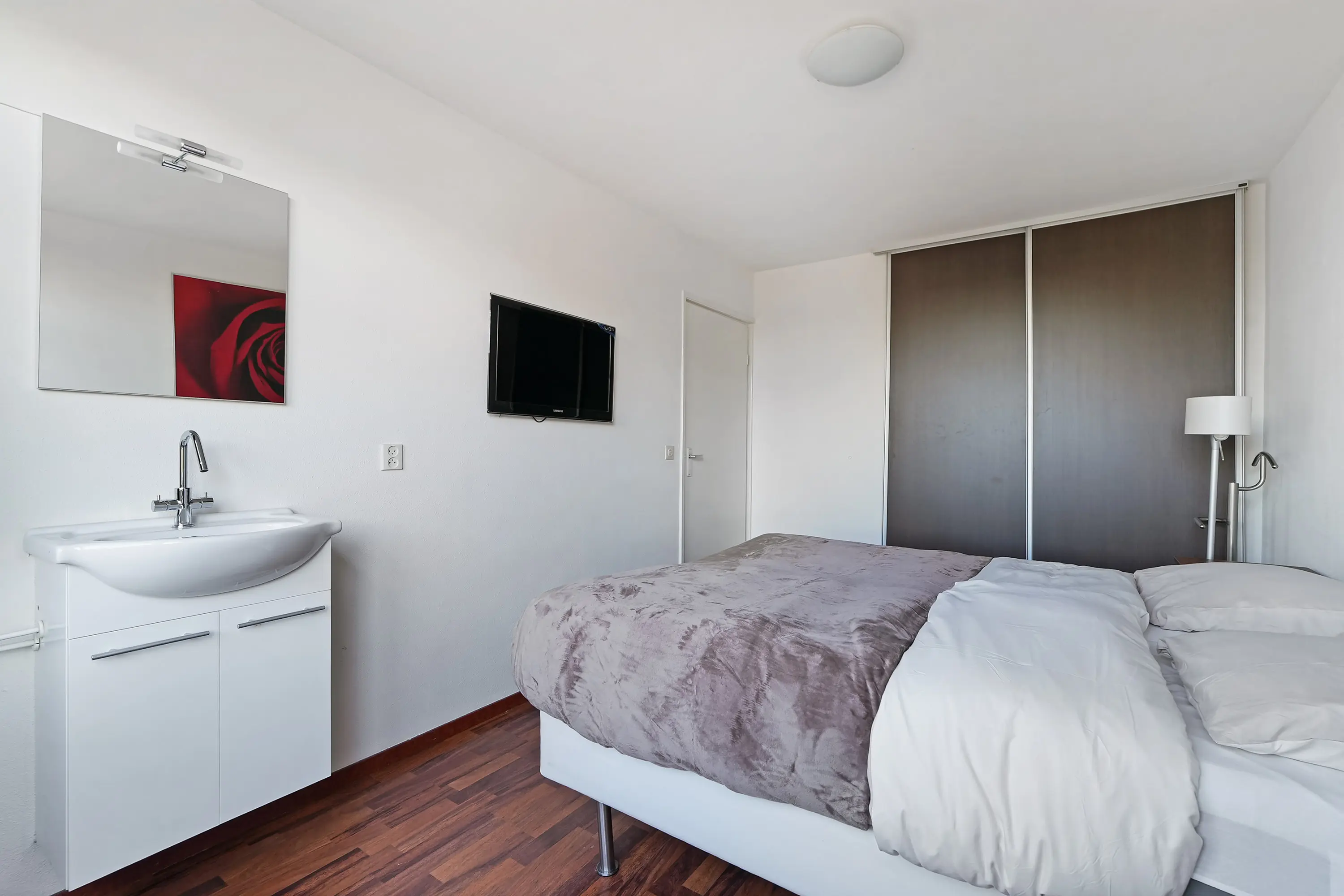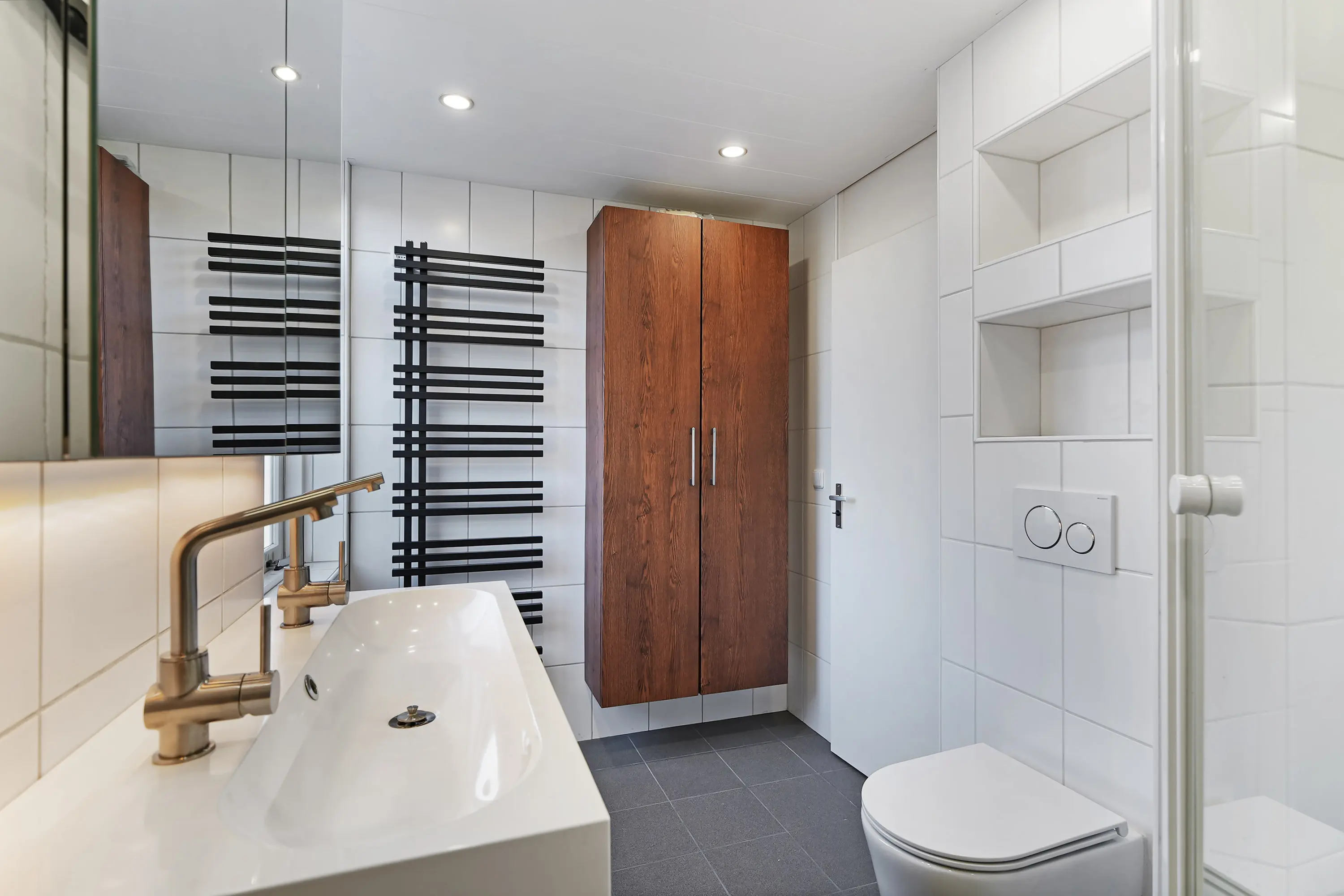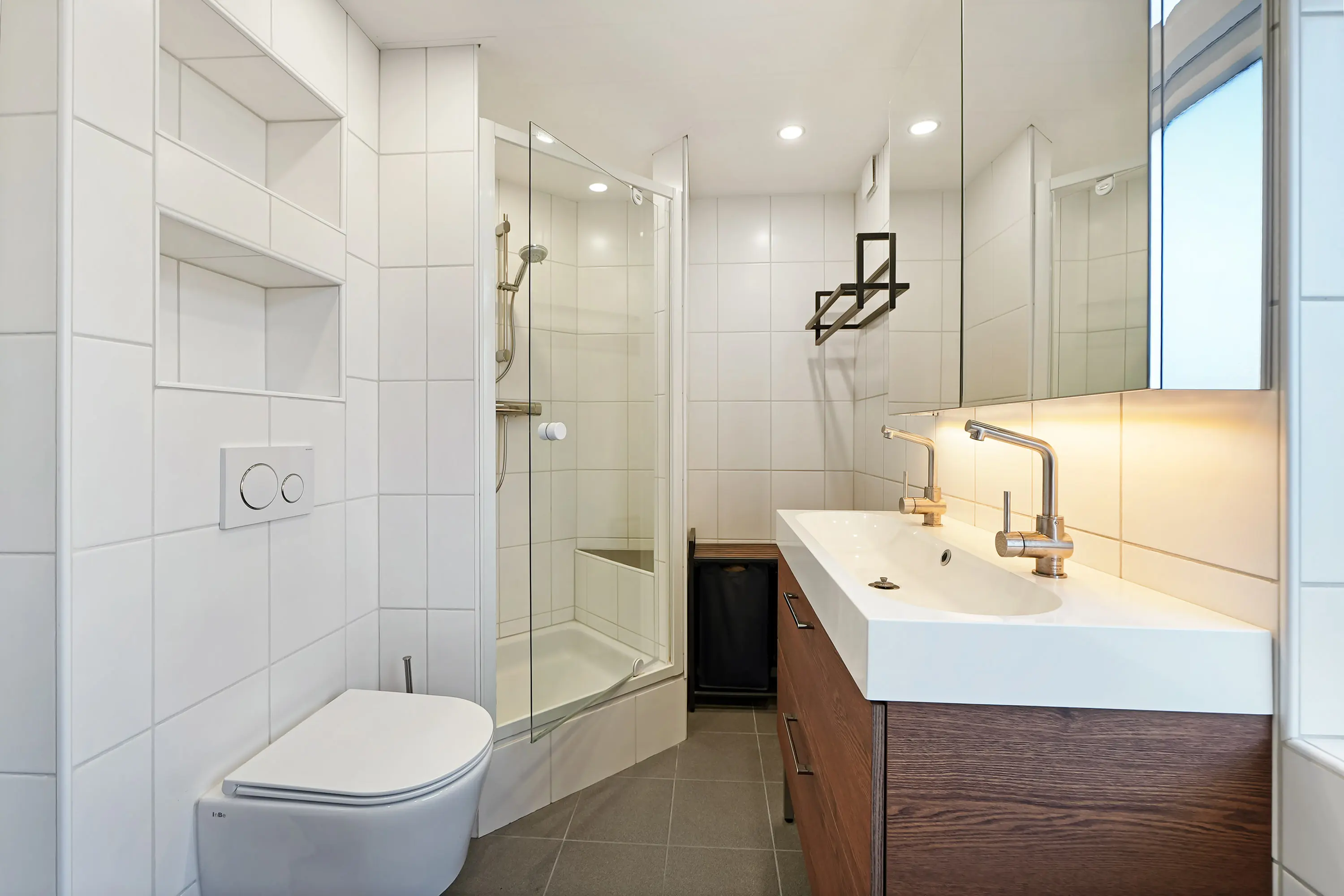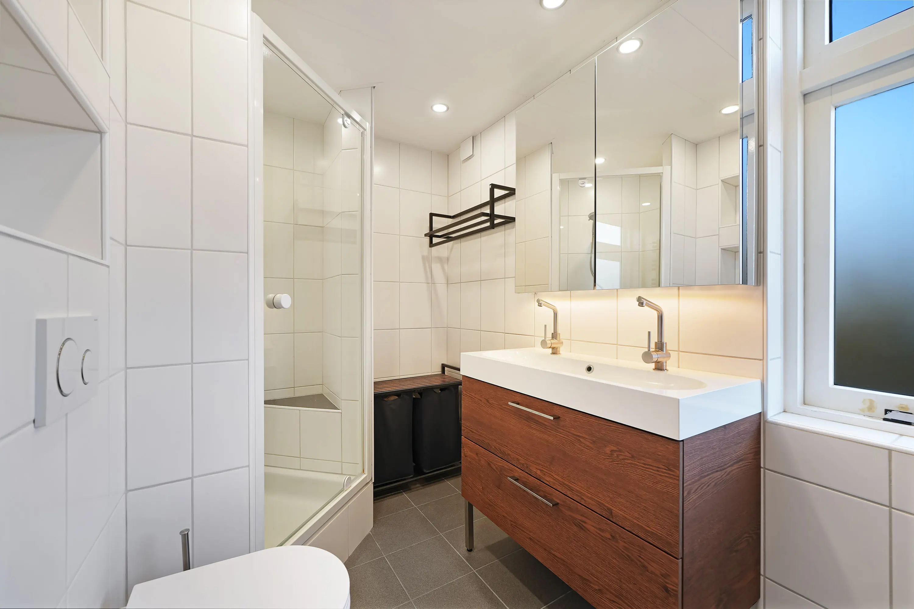De recent vernieuwde badkamer is ruim van opzet en voorzien van een douche, tweede toilet en dubbel wastafelmeubel.