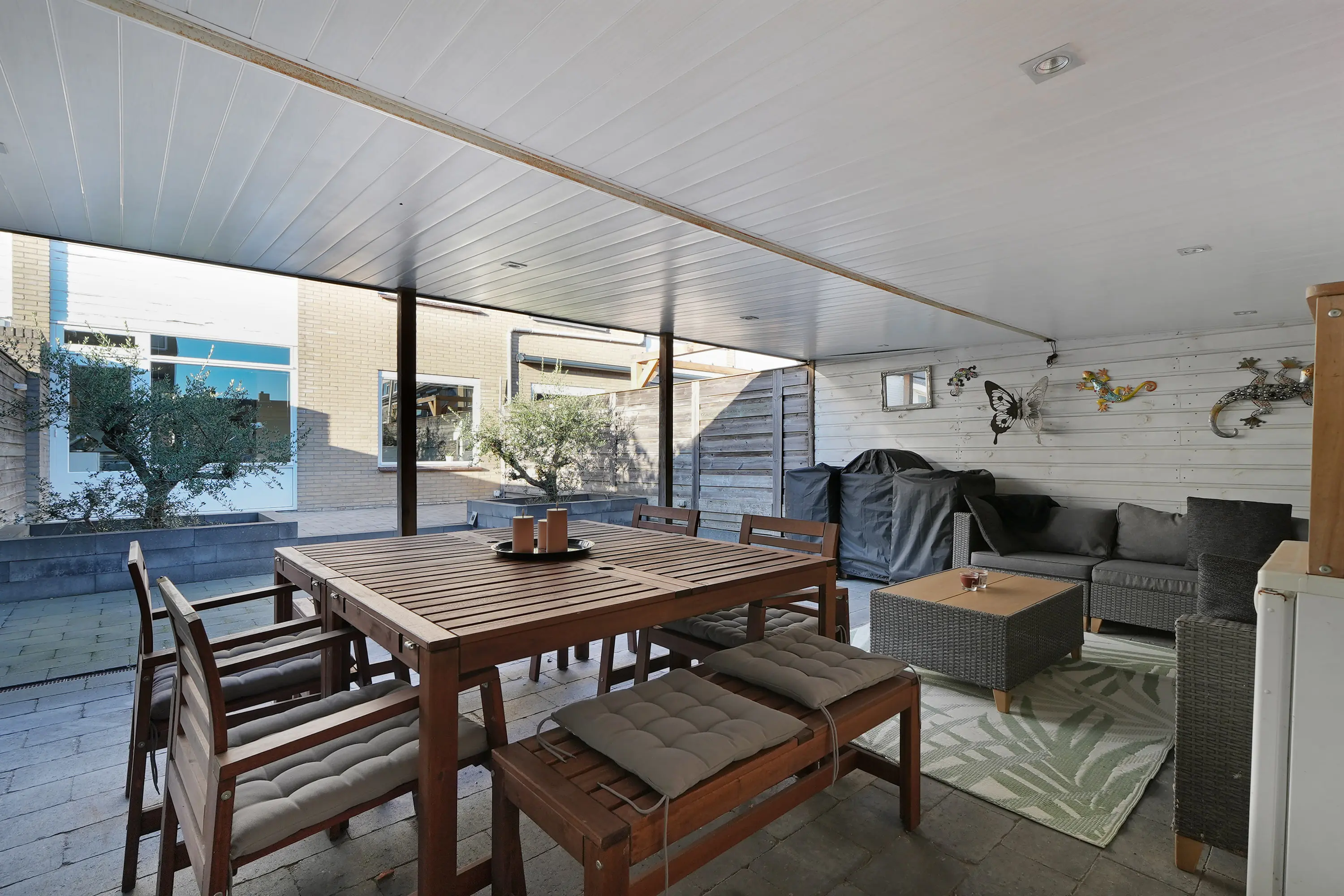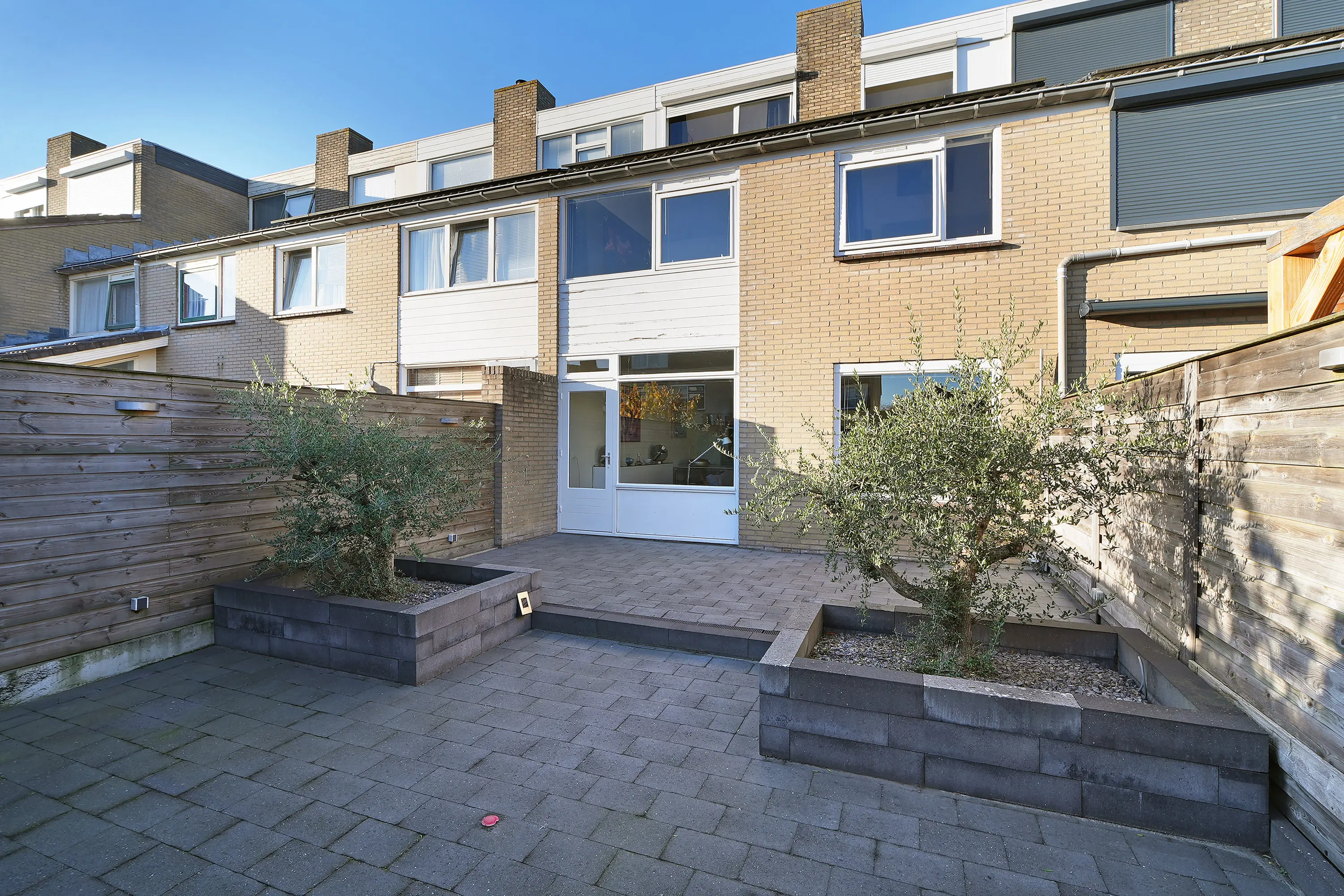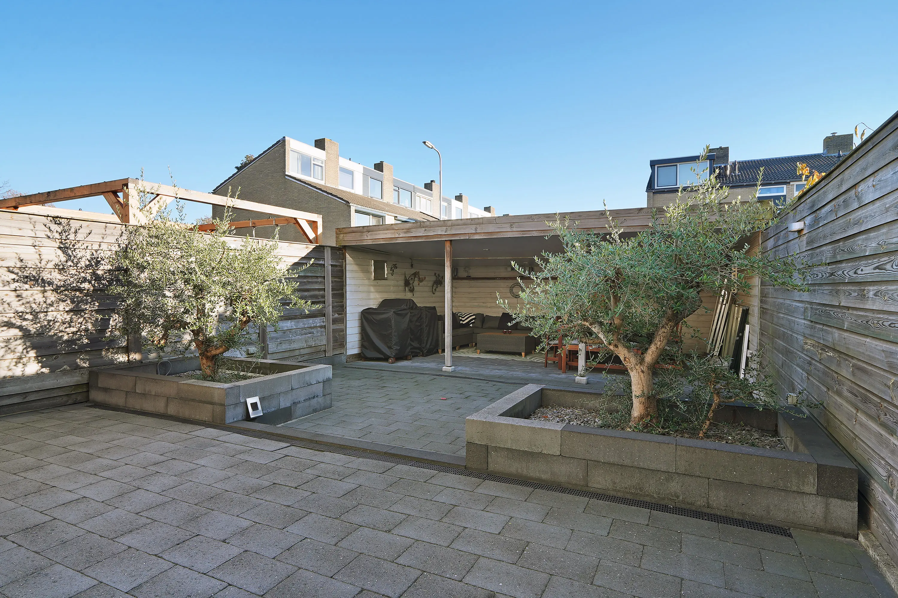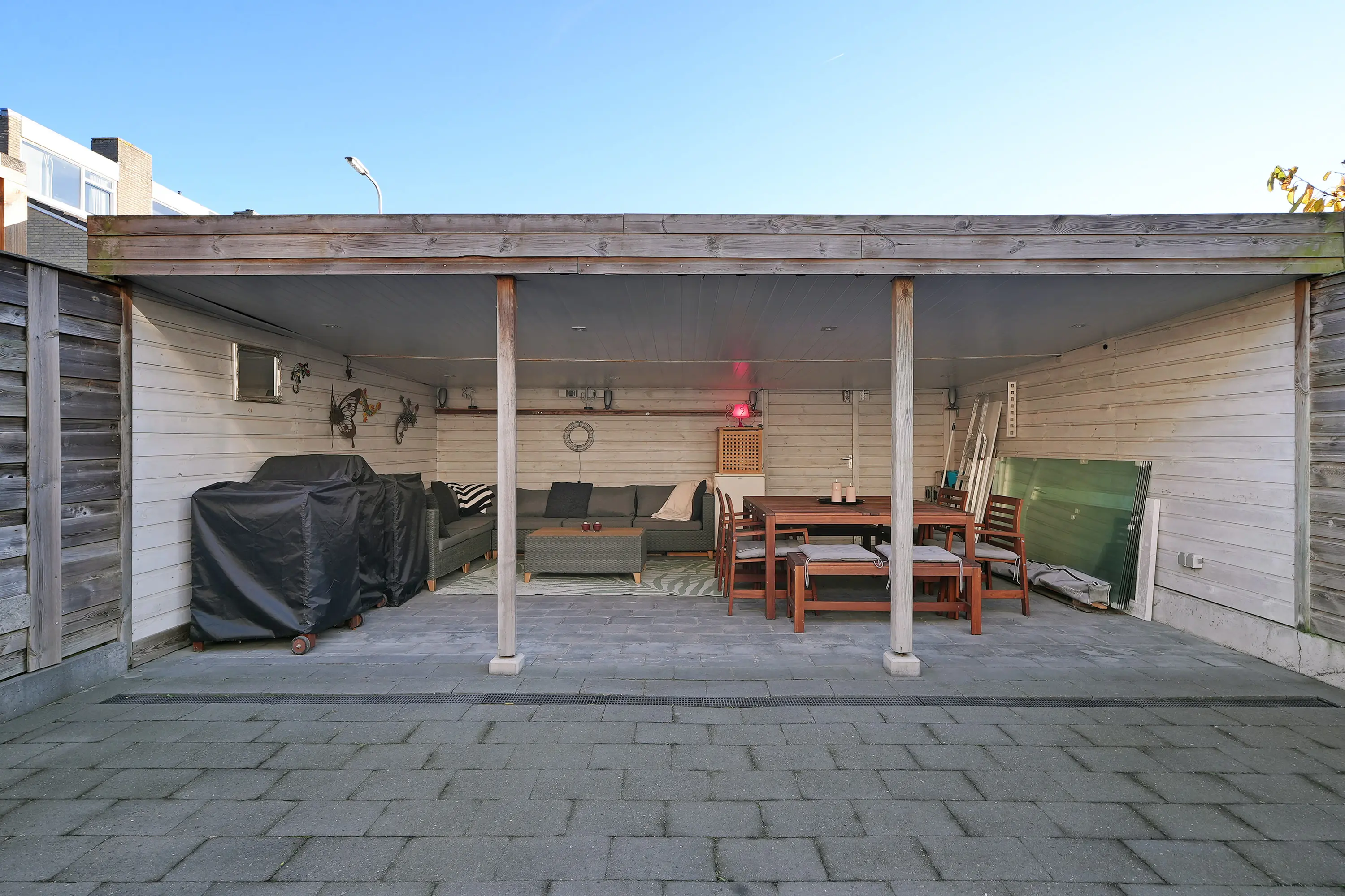 De zonnige, fraai aangelegde achtertuin is volledig gebruiksklaar. Achterin de tuin bevindt zich een royale overkapping over de volledige breedte van het perceel, waardoor u hier tot in de late uurtjes kunt genieten. Via de achtergelegen poort beschikt u over een vrije achterom.