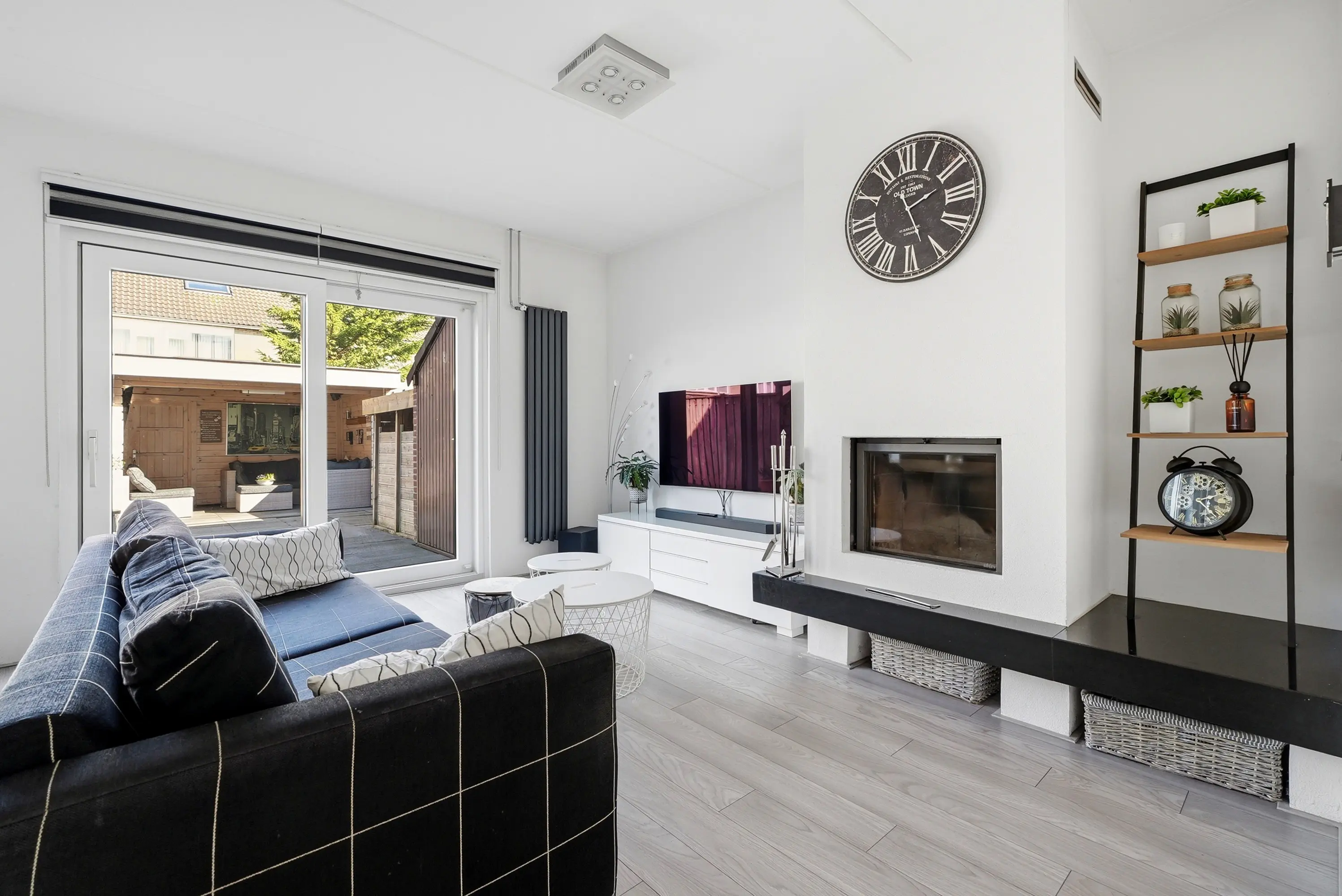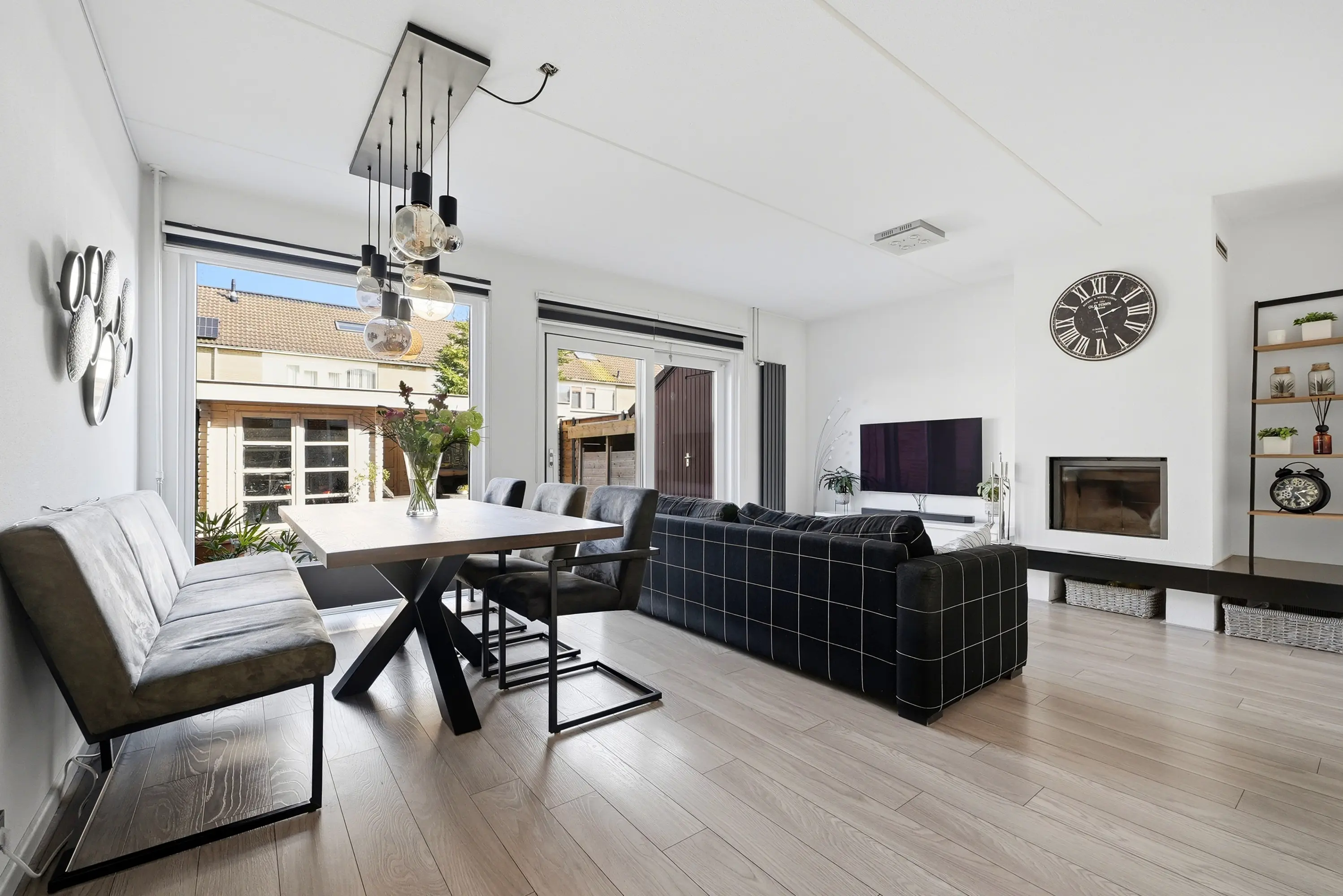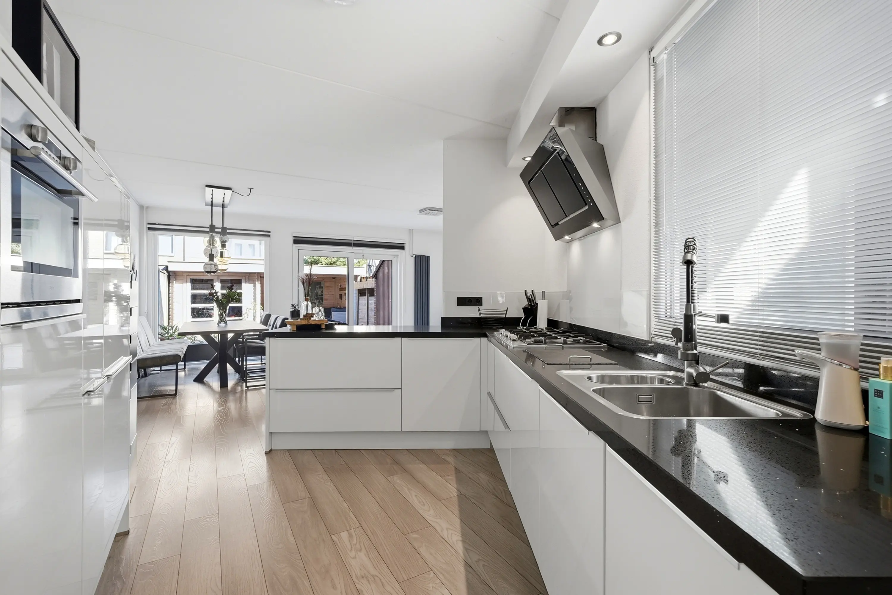 Hal met trap naar de 1e verdieping, modern toilet met fonteintje, lichte, tuingerichte woonkamer met gezellige open haard en grote schuifpui naar de tuin, open luxe keuken met inbouwapparatuur: combi-magnetron / koelkast / vaatwasser / 5-pits gaskookplaat / wasemkap en deur naar de bijkeuken met meterkast en deur naar de voortuin.