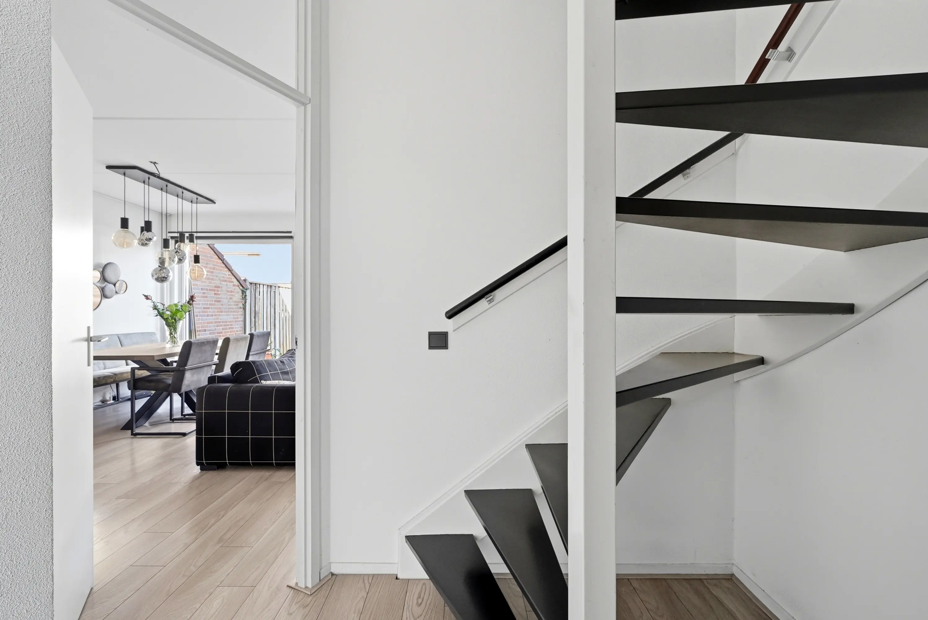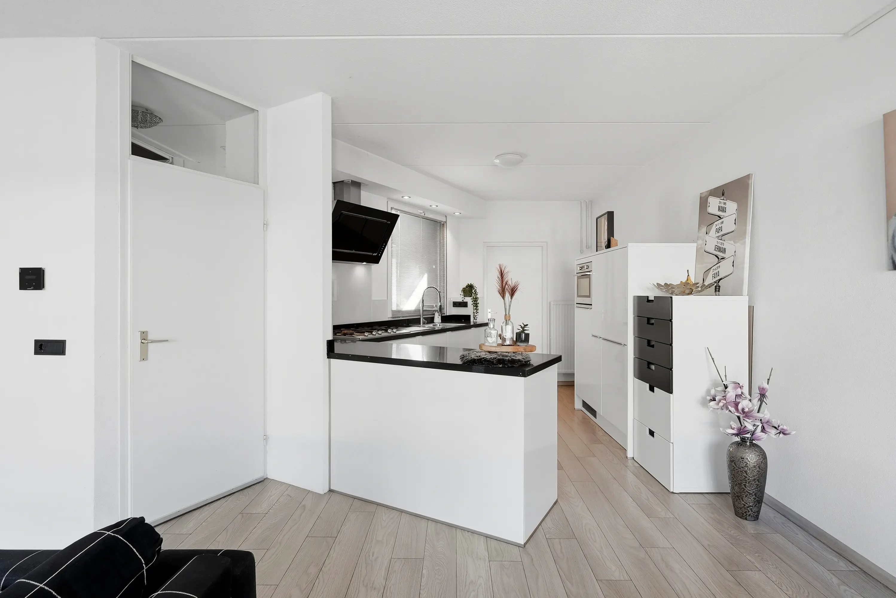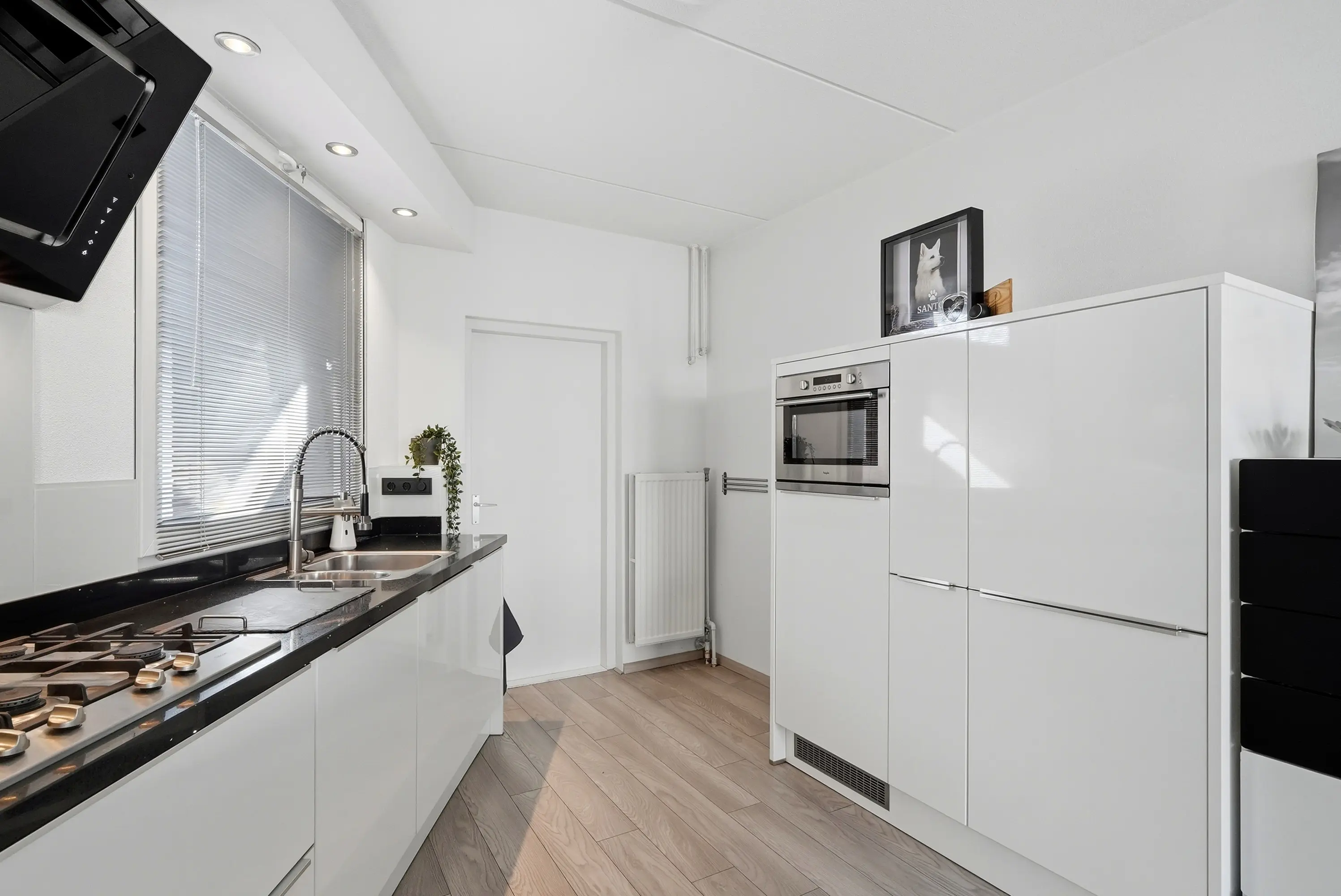 Hal met trap naar de 1e verdieping, modern toilet met fonteintje, lichte, tuingerichte woonkamer met gezellige open haard en grote schuifpui naar de tuin, open luxe keuken met inbouwapparatuur: combi-magnetron / koelkast / vaatwasser / 5-pits gaskookplaat / wasemkap en deur naar de bijkeuken met meterkast en deur naar de voortuin.