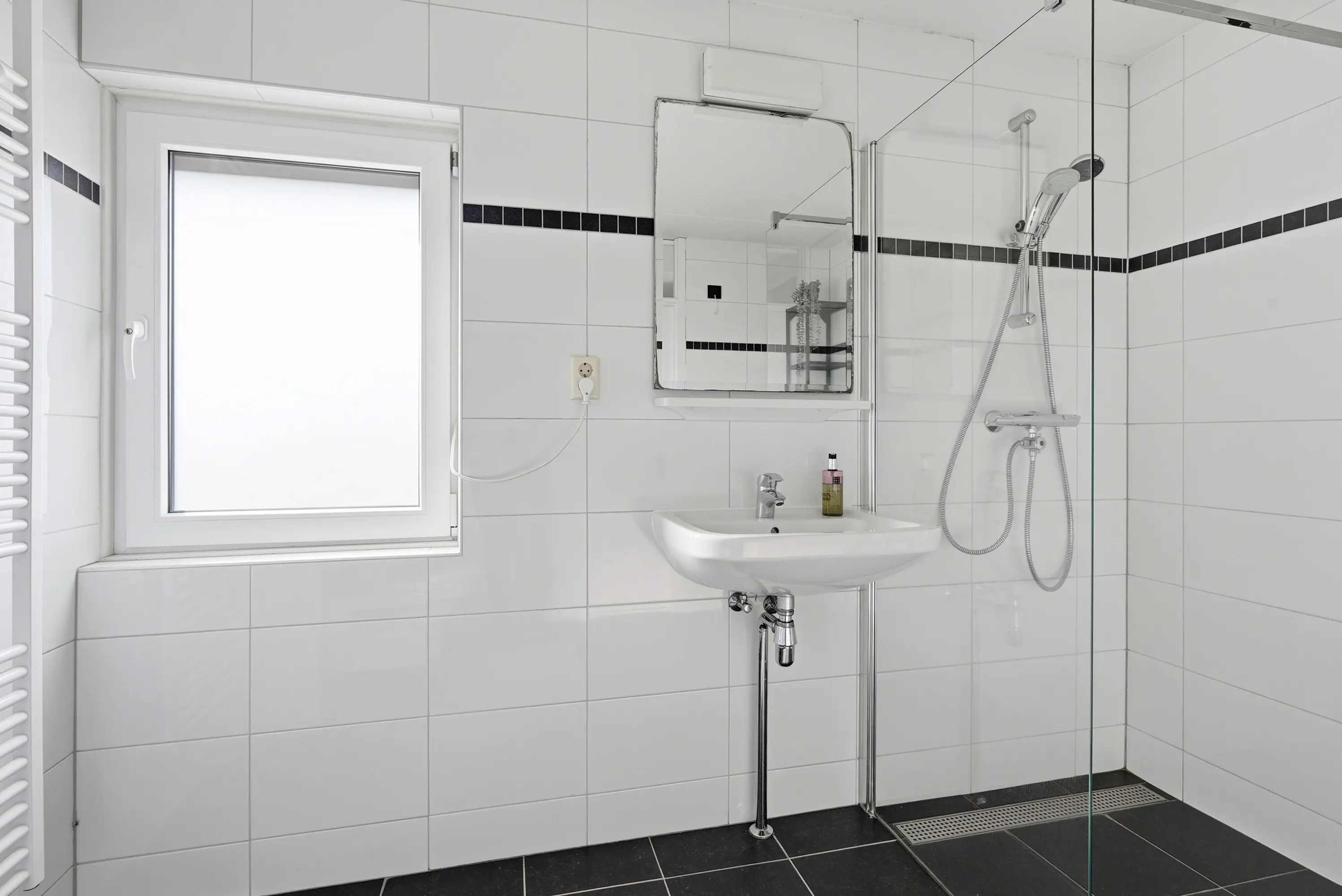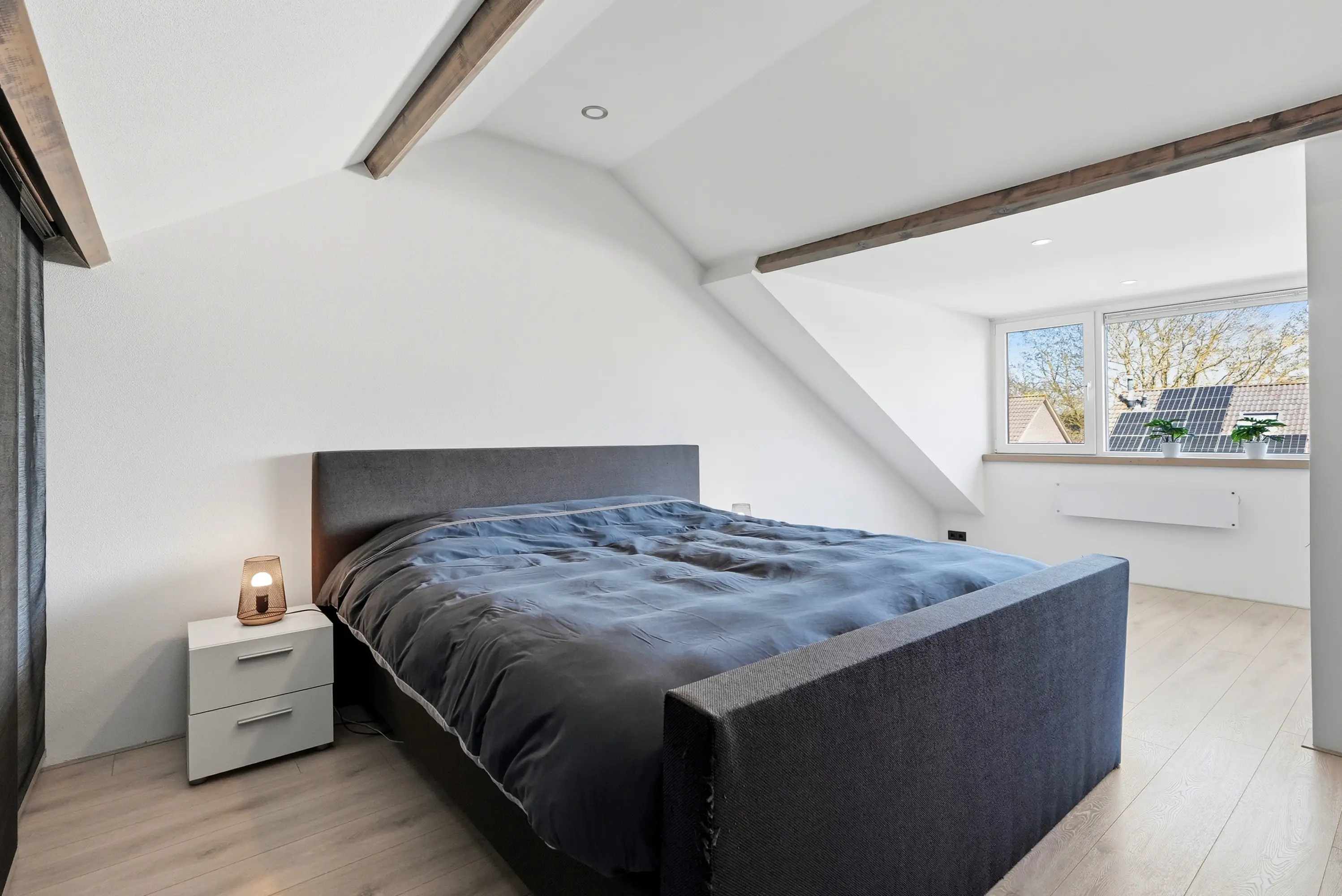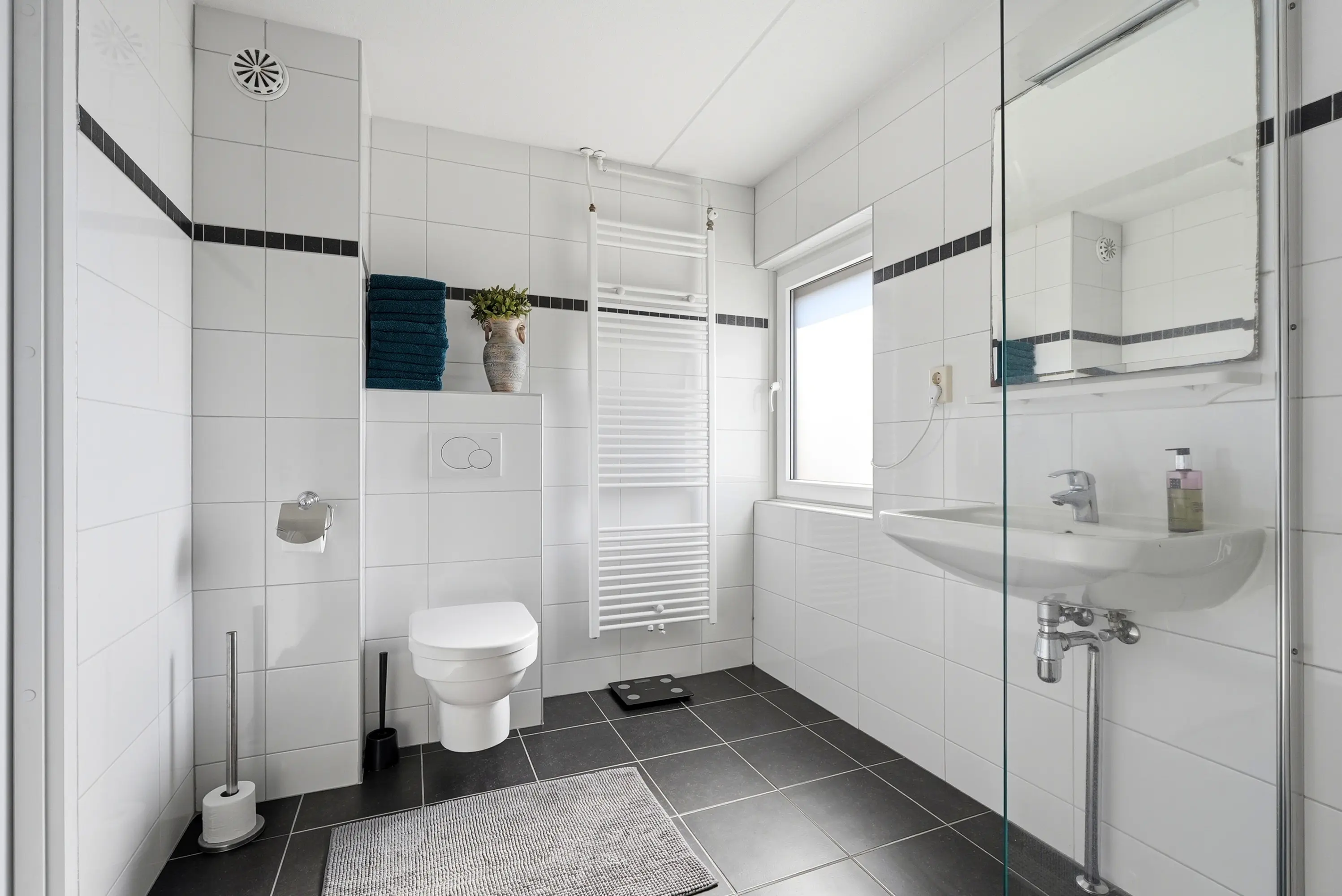 Overloop met vaste trap naar de 2e verdieping, drie ruime slaapkamers, alledrie met elektrisch bedienbaar rolluik en een moderne, volledig betegelde badkamer voorzien van toilet, inloopdouche, wastafel en designradiator.