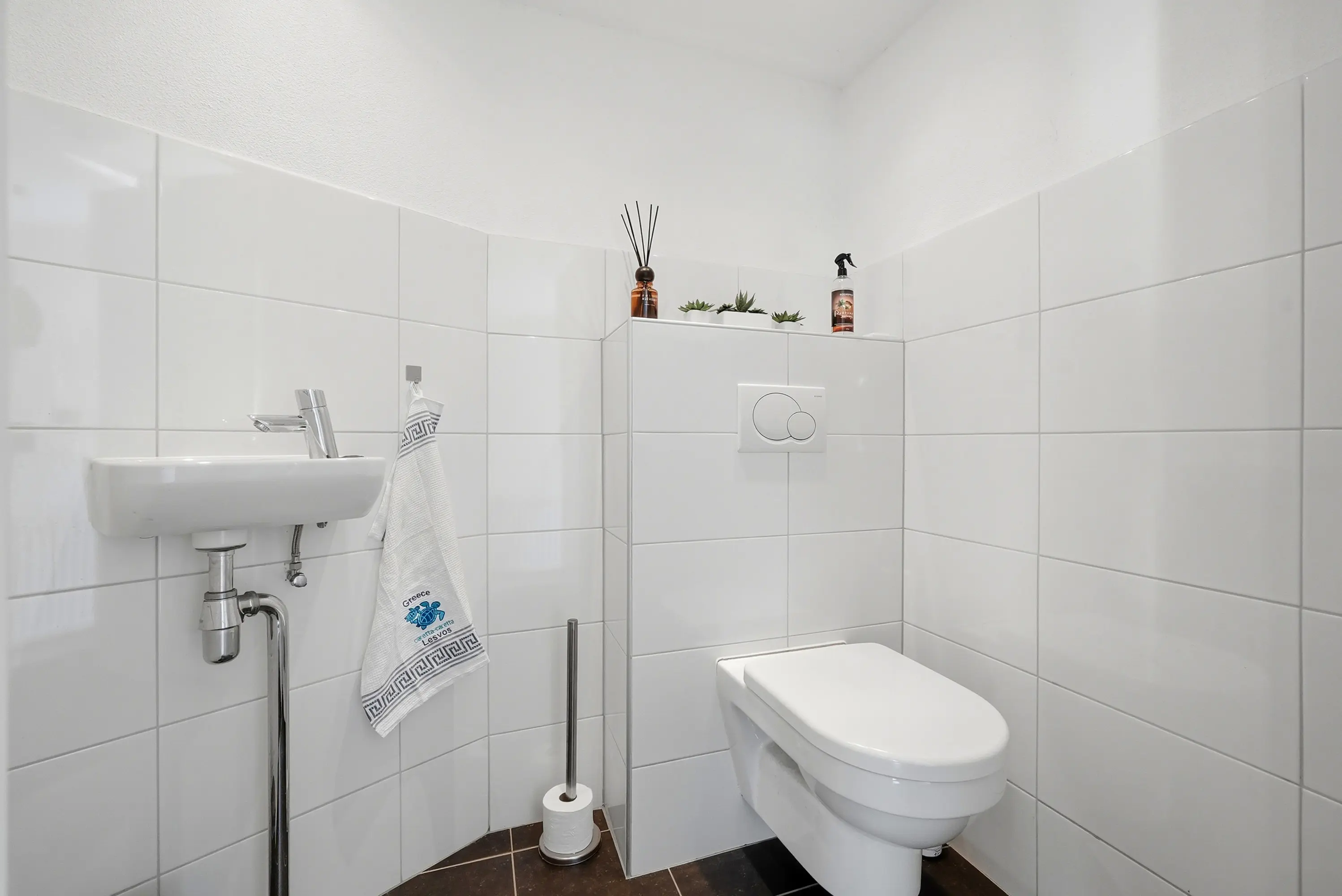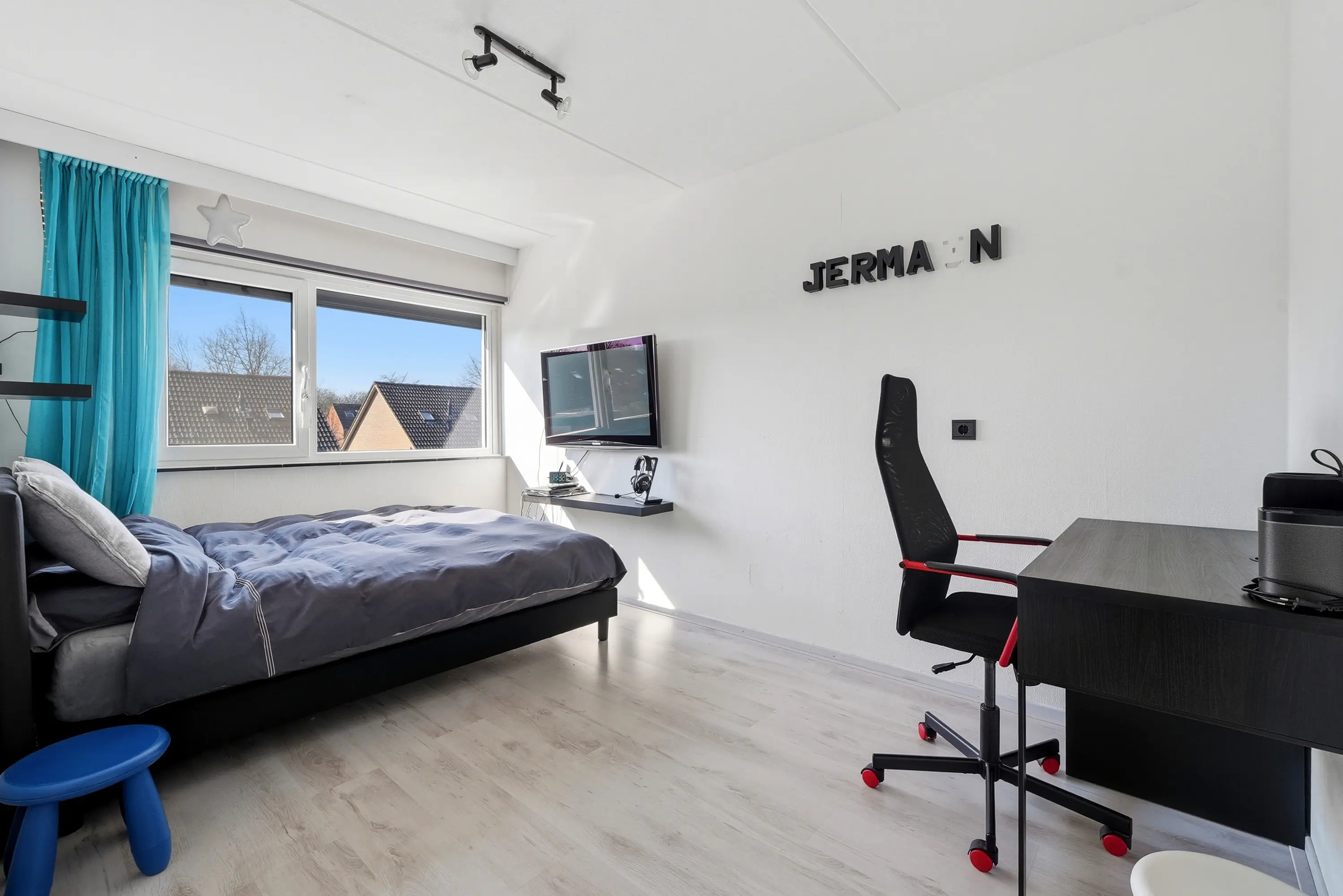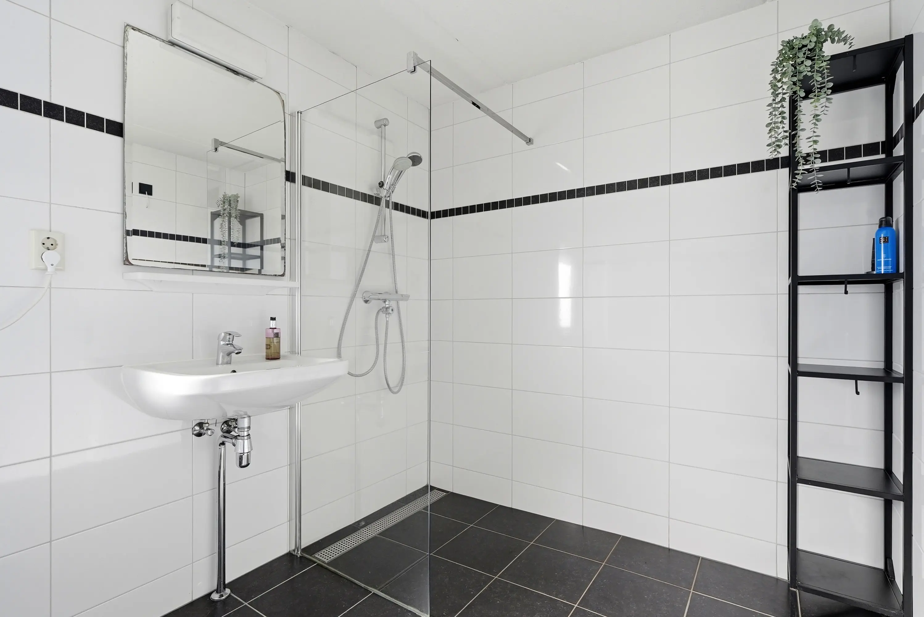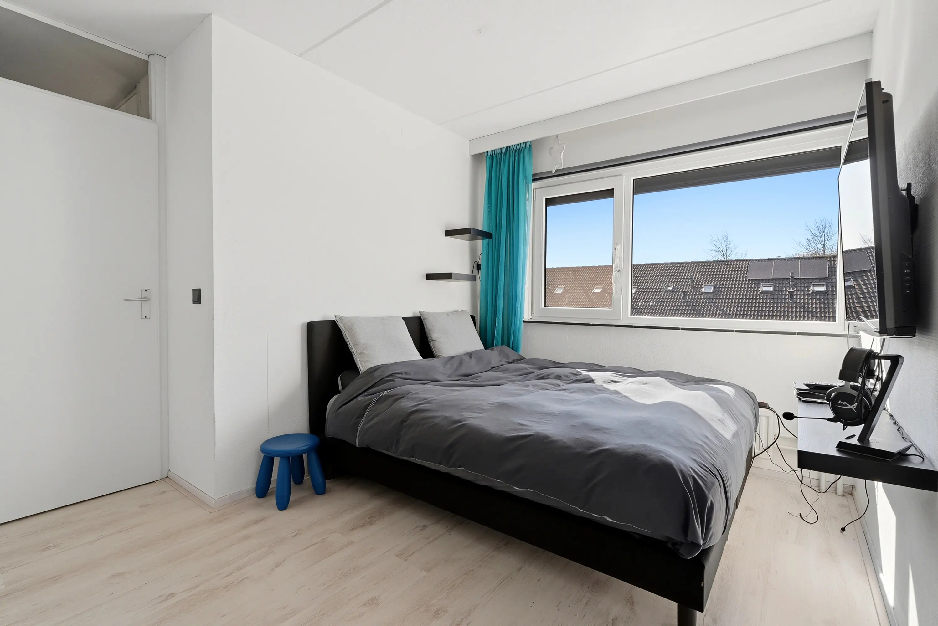 Overloop met vaste trap naar de 2e verdieping, drie ruime slaapkamers, alledrie met elektrisch bedienbaar rolluik en een moderne, volledig betegelde badkamer voorzien van toilet, inloopdouche, wastafel en designradiator.