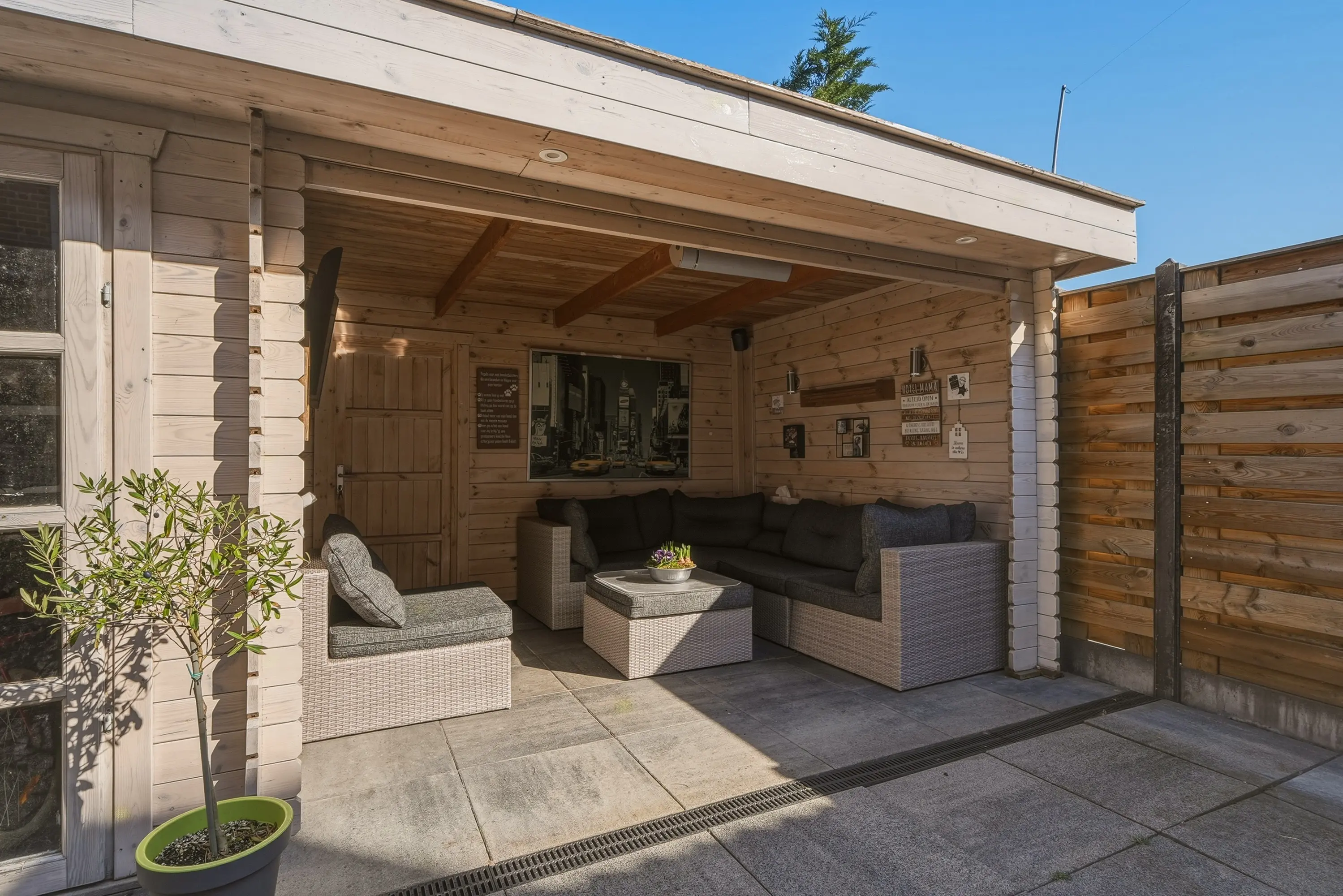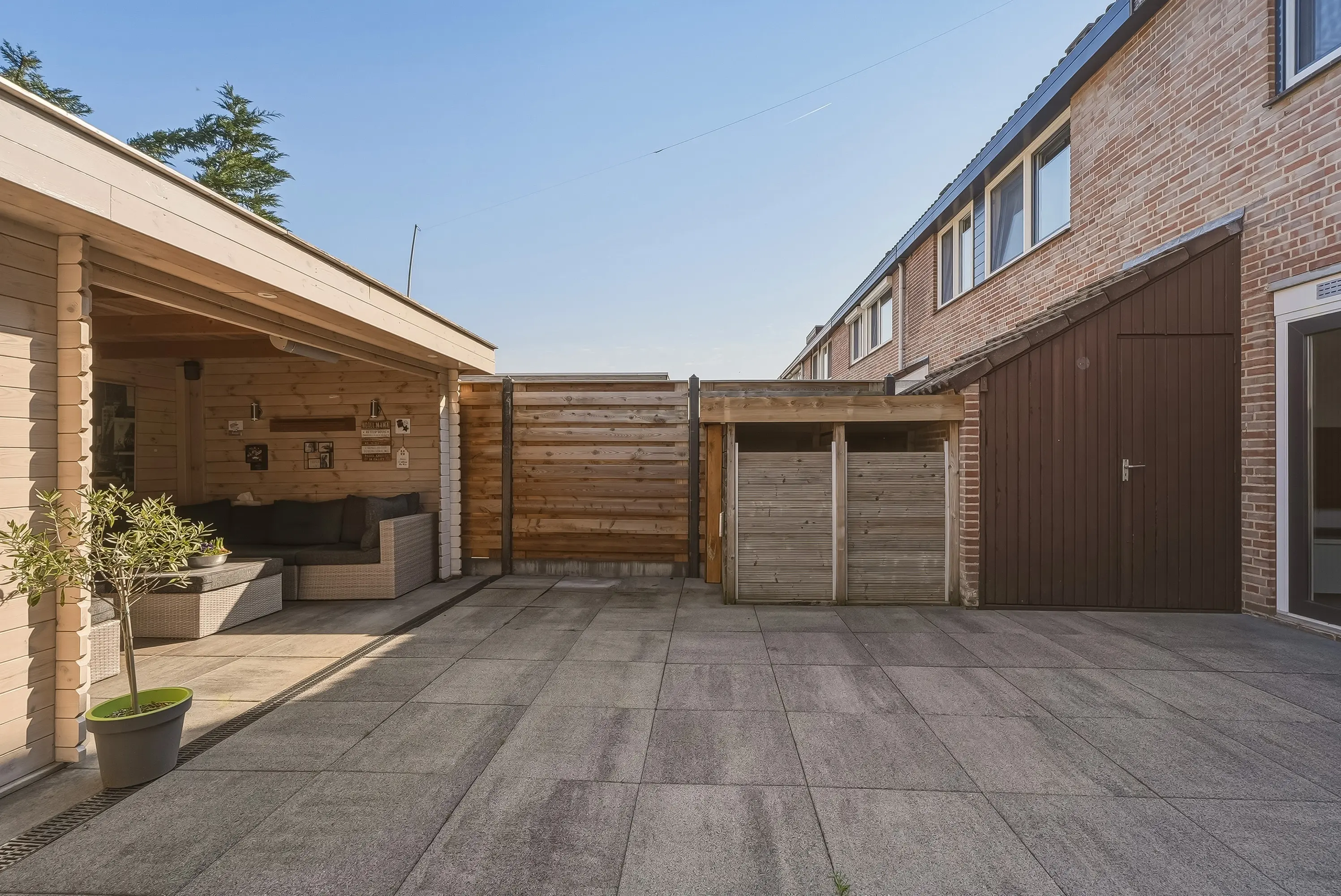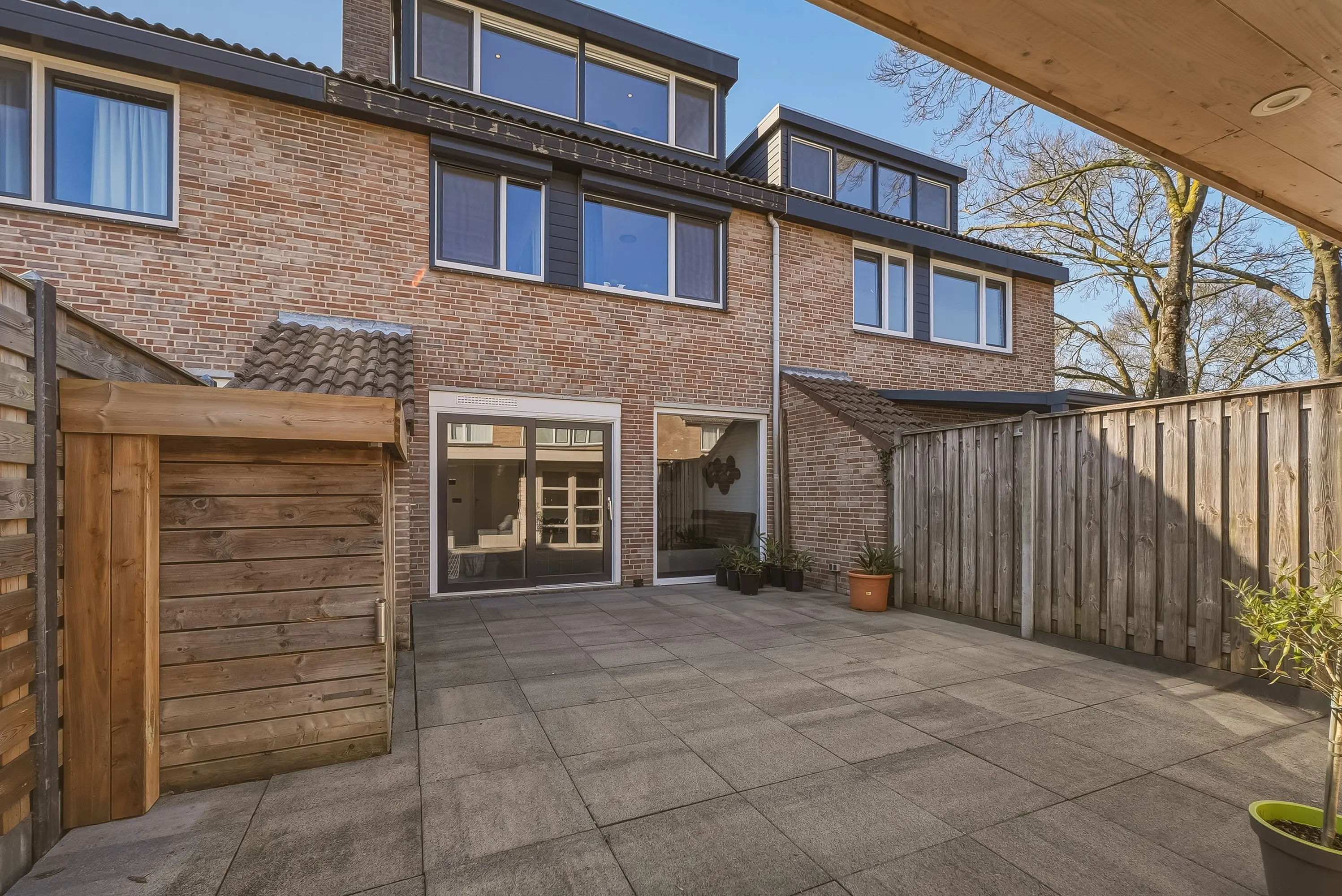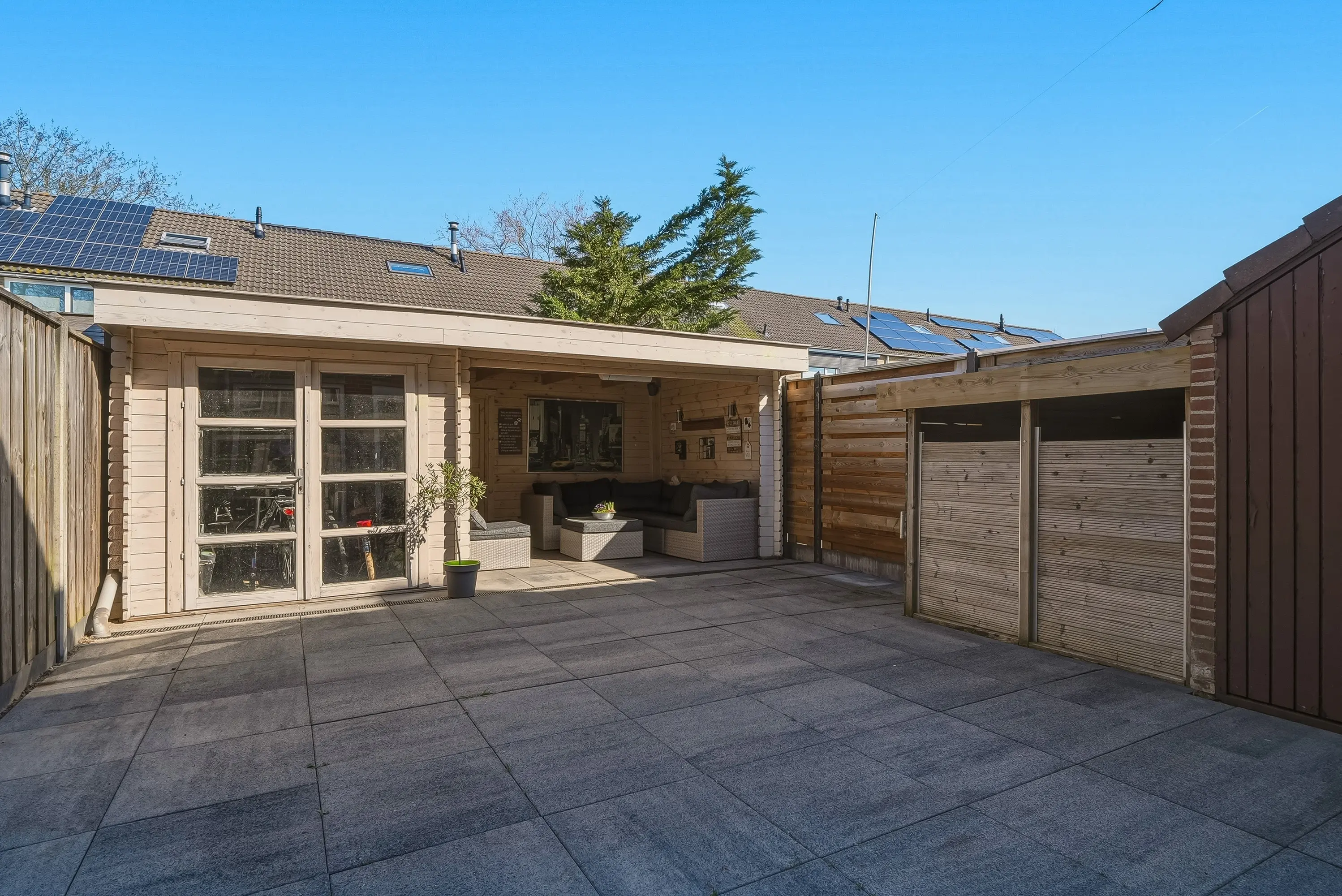 De verzorgde achtertuin is voorzien van houthok, aangebouwde stenen berging met elektra, verlichting en water en tenslotte een heerlijke overkapping met aangebouwde houten berging en poort naar de brandgang. Er is tevens een diepe voortuin met buitenkraan en carport voorzien van lichtkoepel.