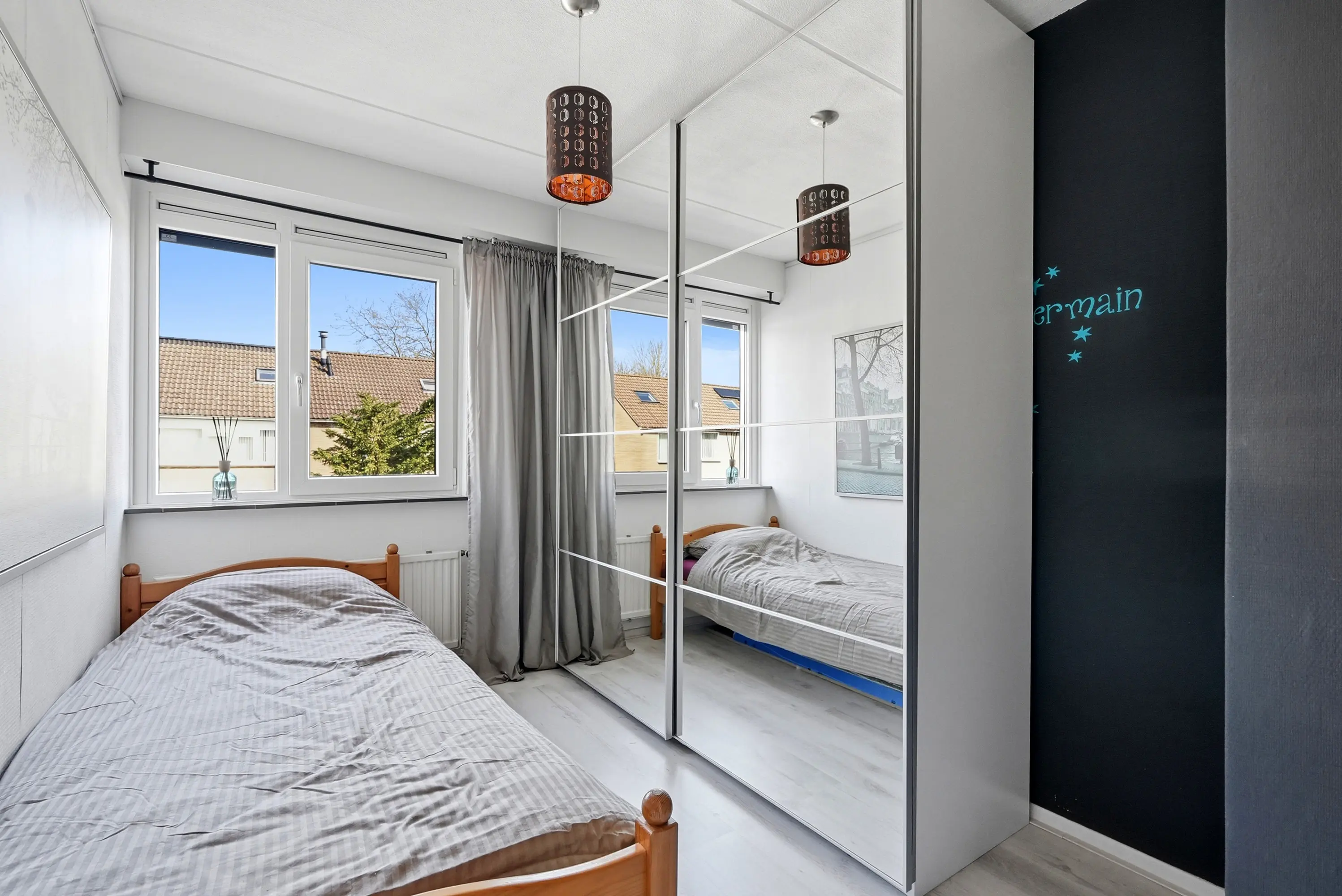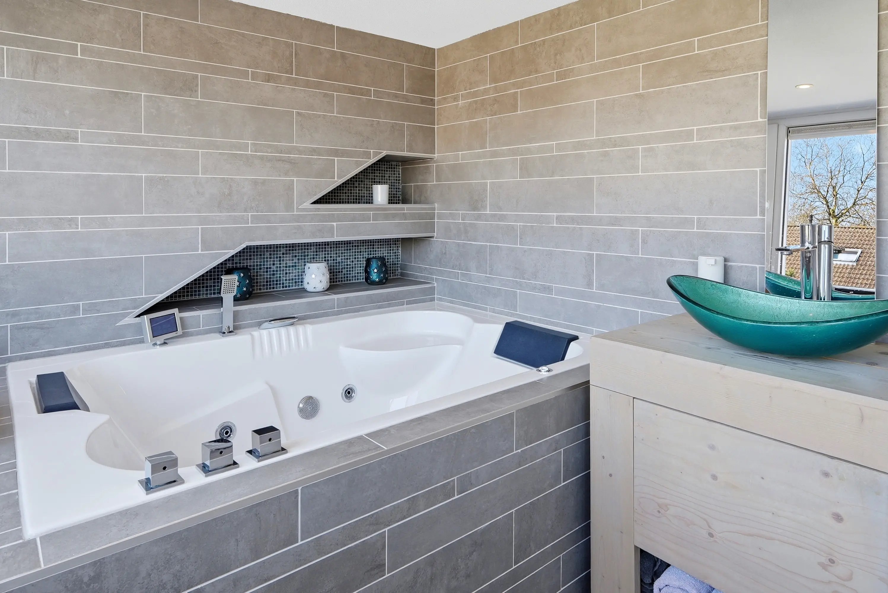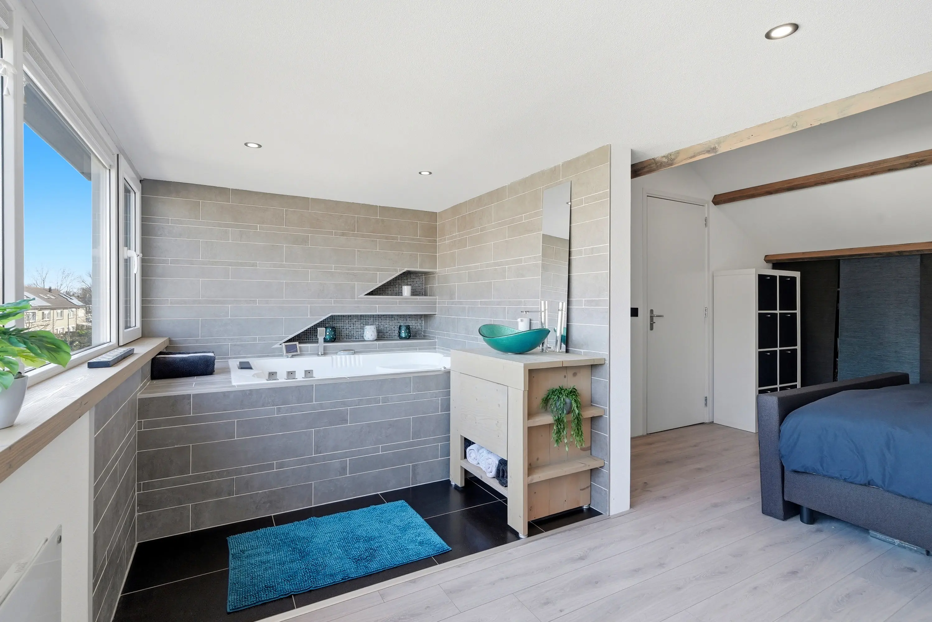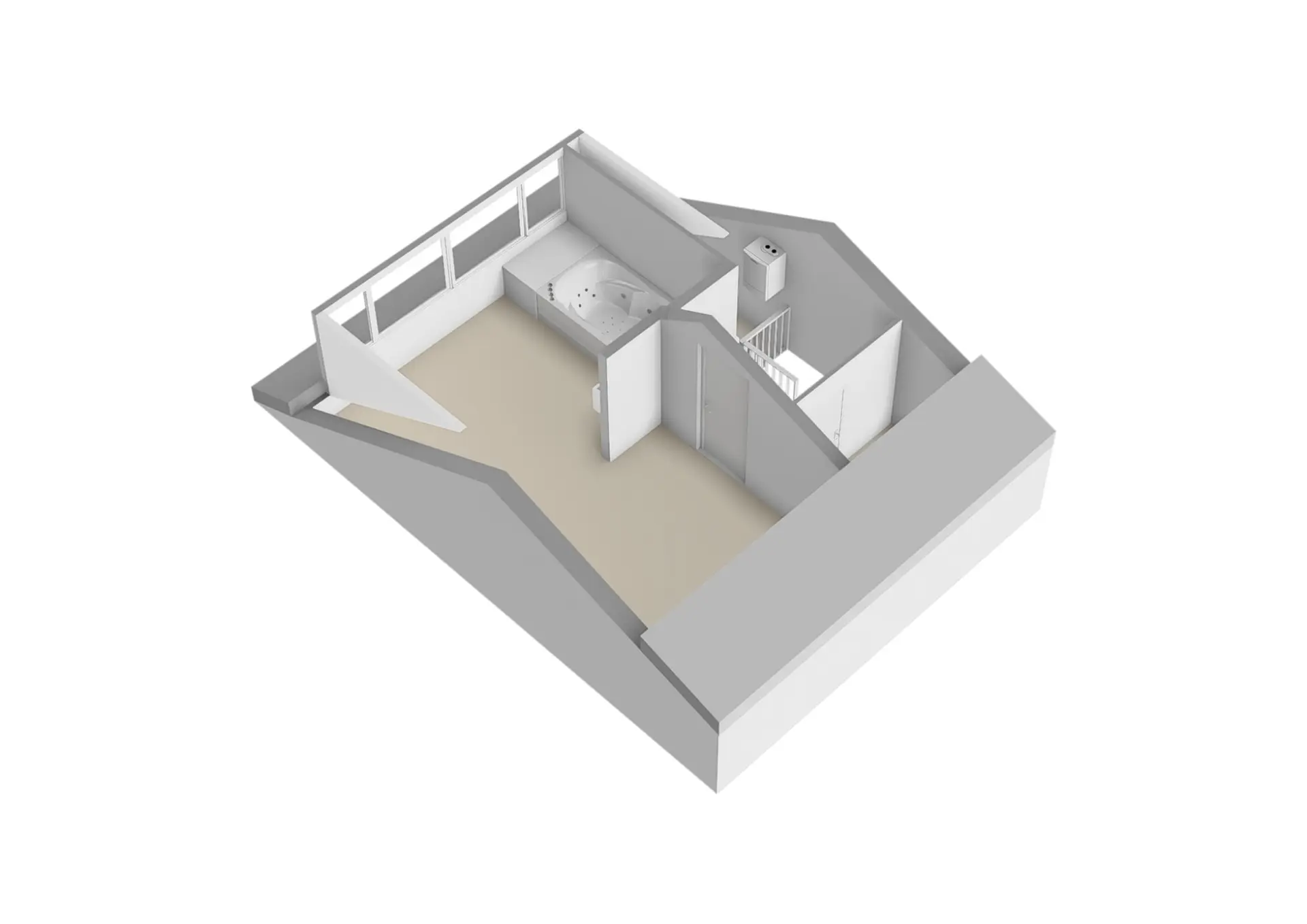 Overloop met wasmachineaansluiting, opstelling c.v.-ketel en inloopkast en tenslotte een ruime vierde slaapkamer met dakkapel, schuifkasten, wastafelmeubel en tweepersoons ligbad met whirlpool.