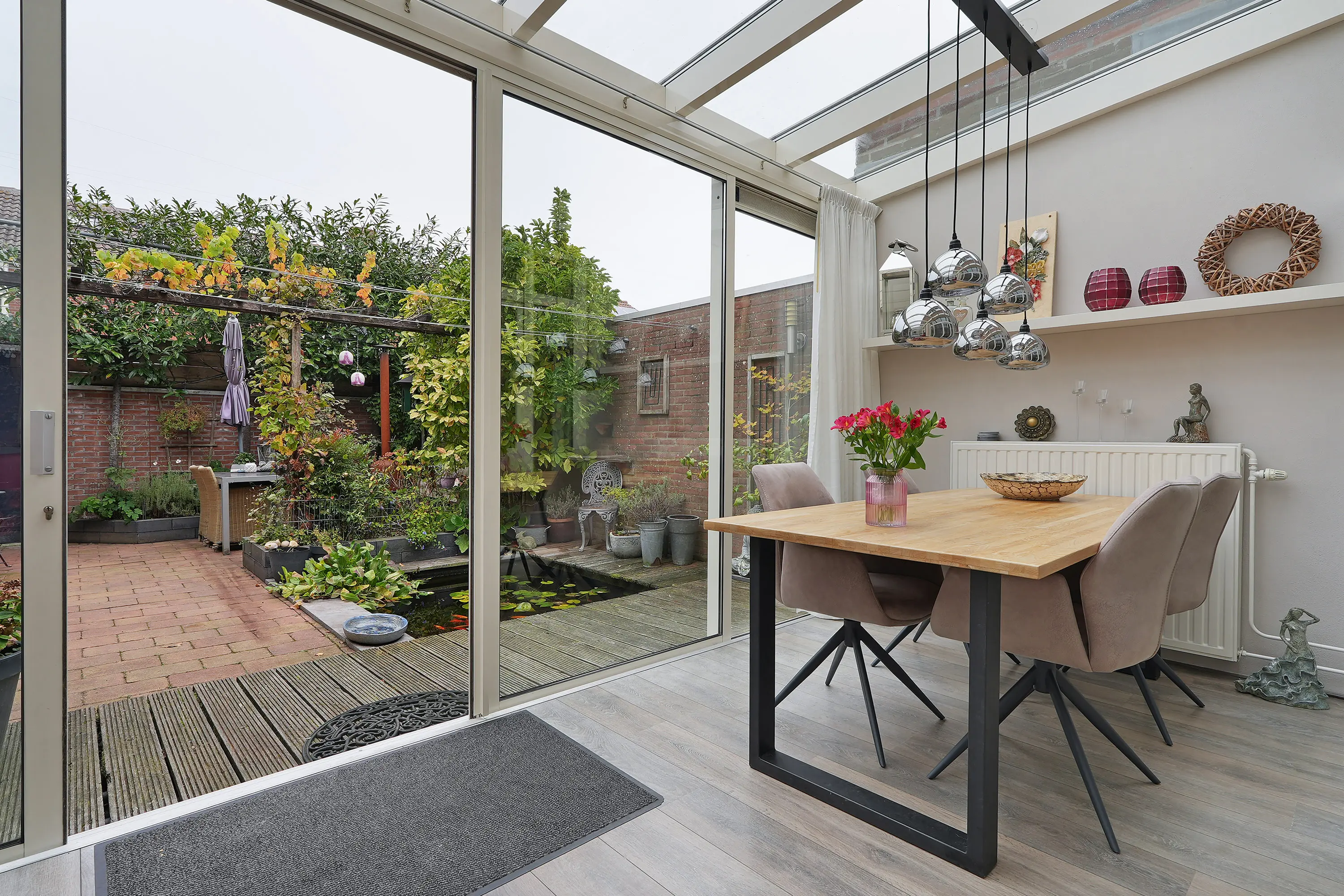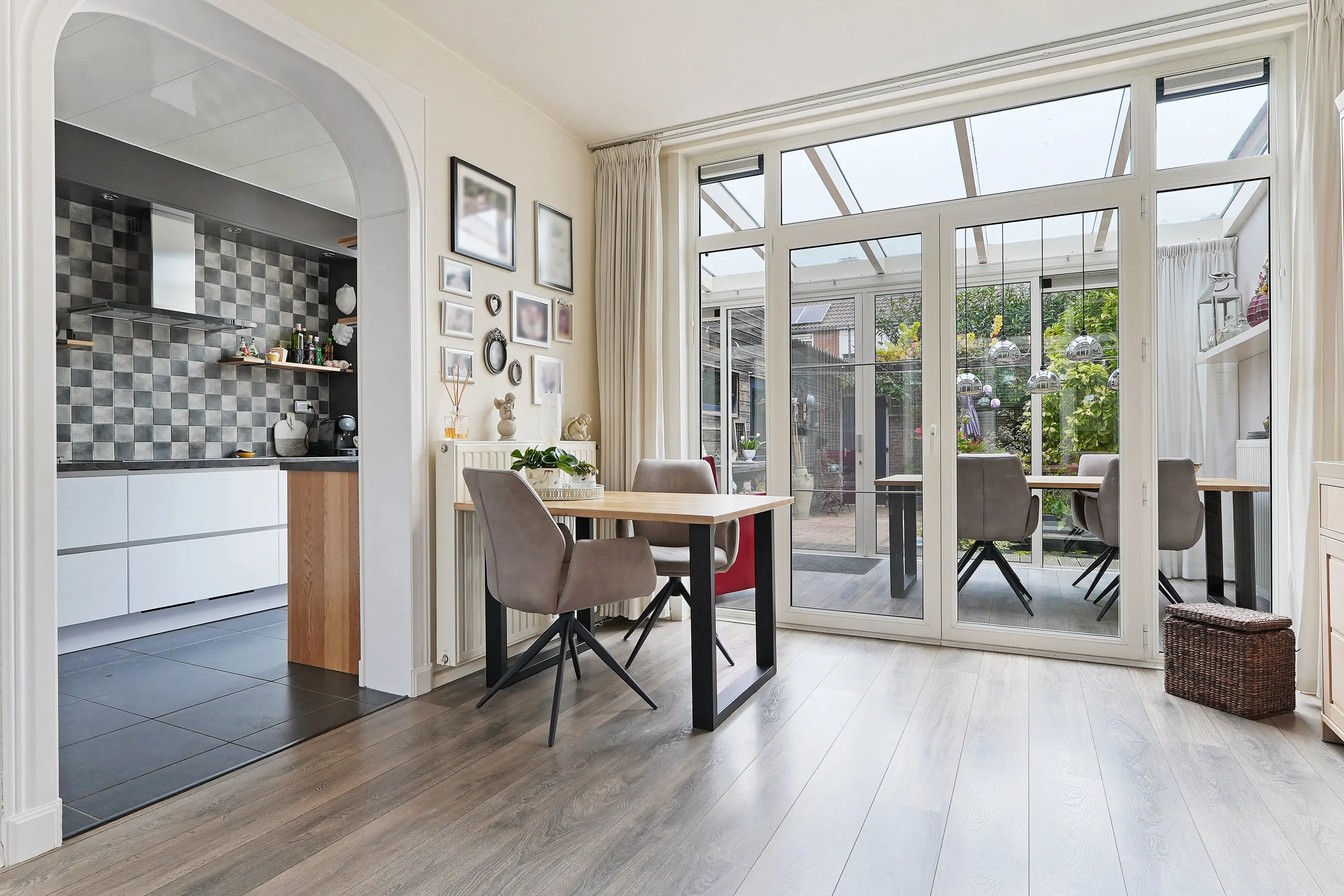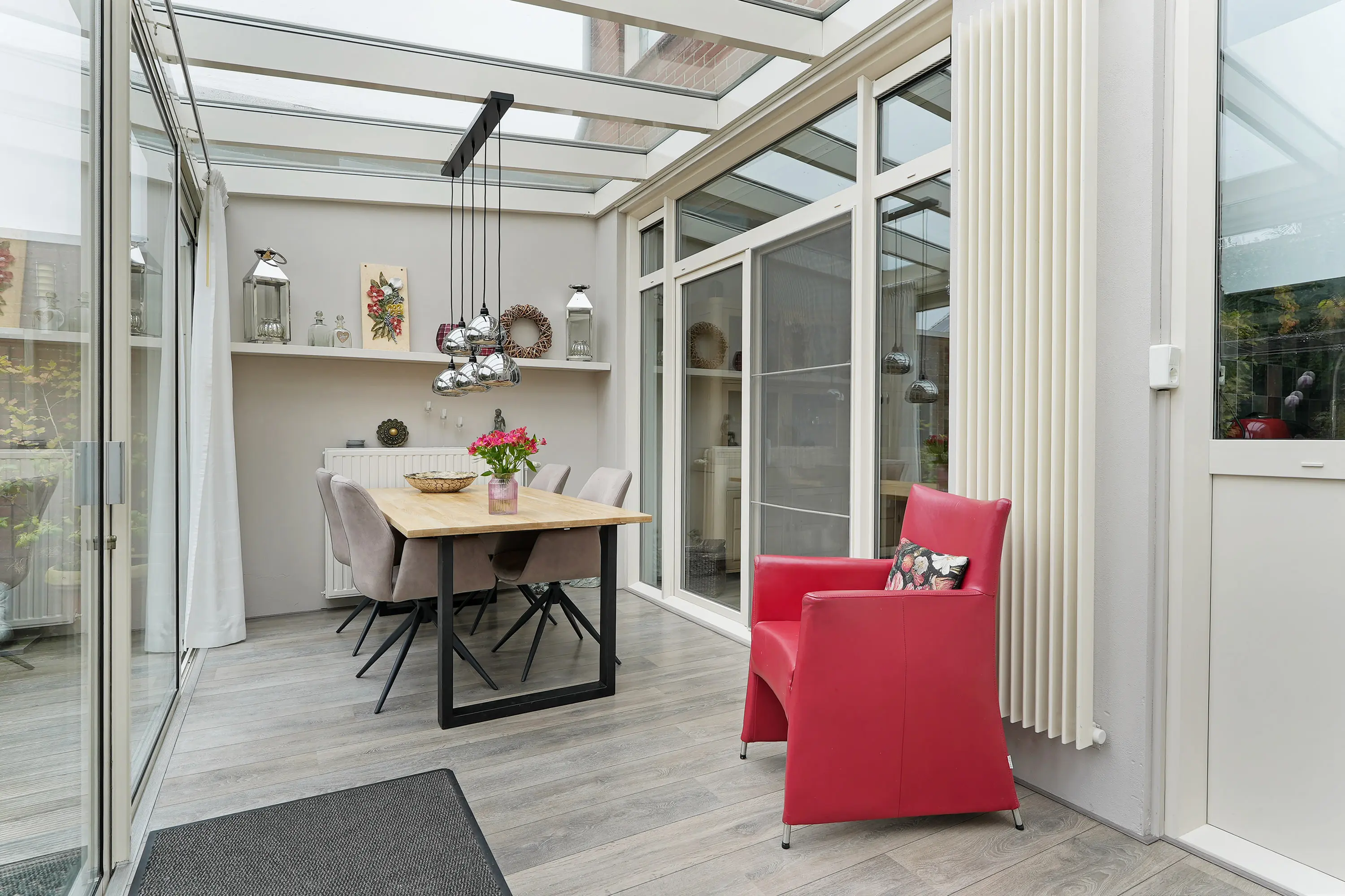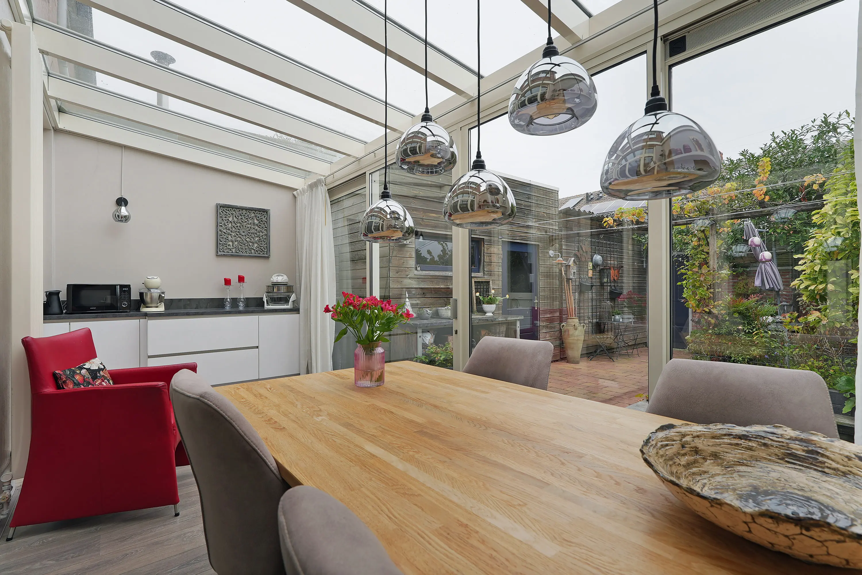 De serre maakt deze woning helemaal compleet. Volledig in glas uitgevoerd met schuifpui naar de tuin. Hierdoor geniet u het hele jaar door van een prachtige lichtinval en een optimaal contact met de achtertuin. In de zomer opent u eenvoudig de deuren om buiten en binnen met elkaar te verbinden, terwijl u in de winter behaaglijk kunt blijven genieten van de serre.