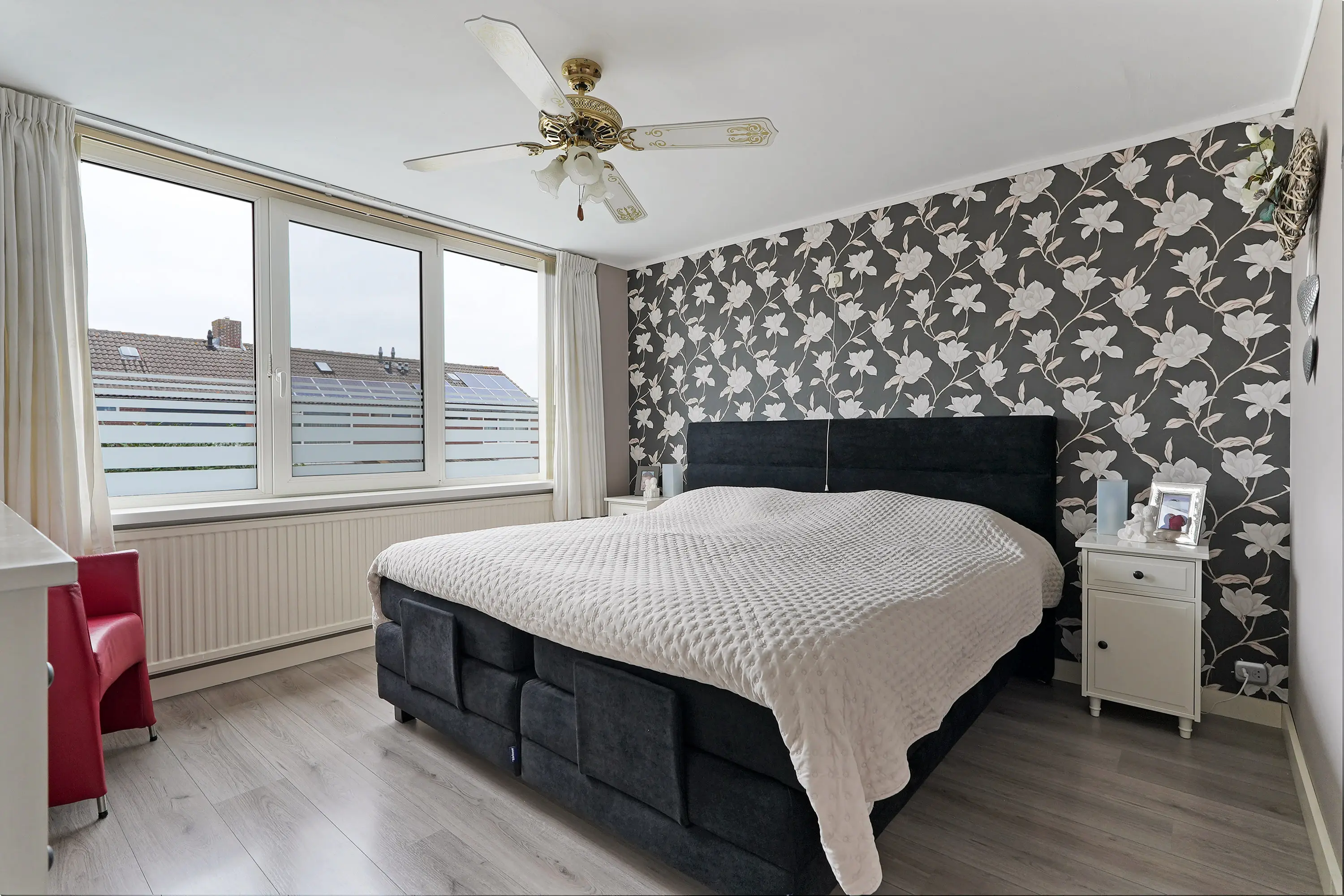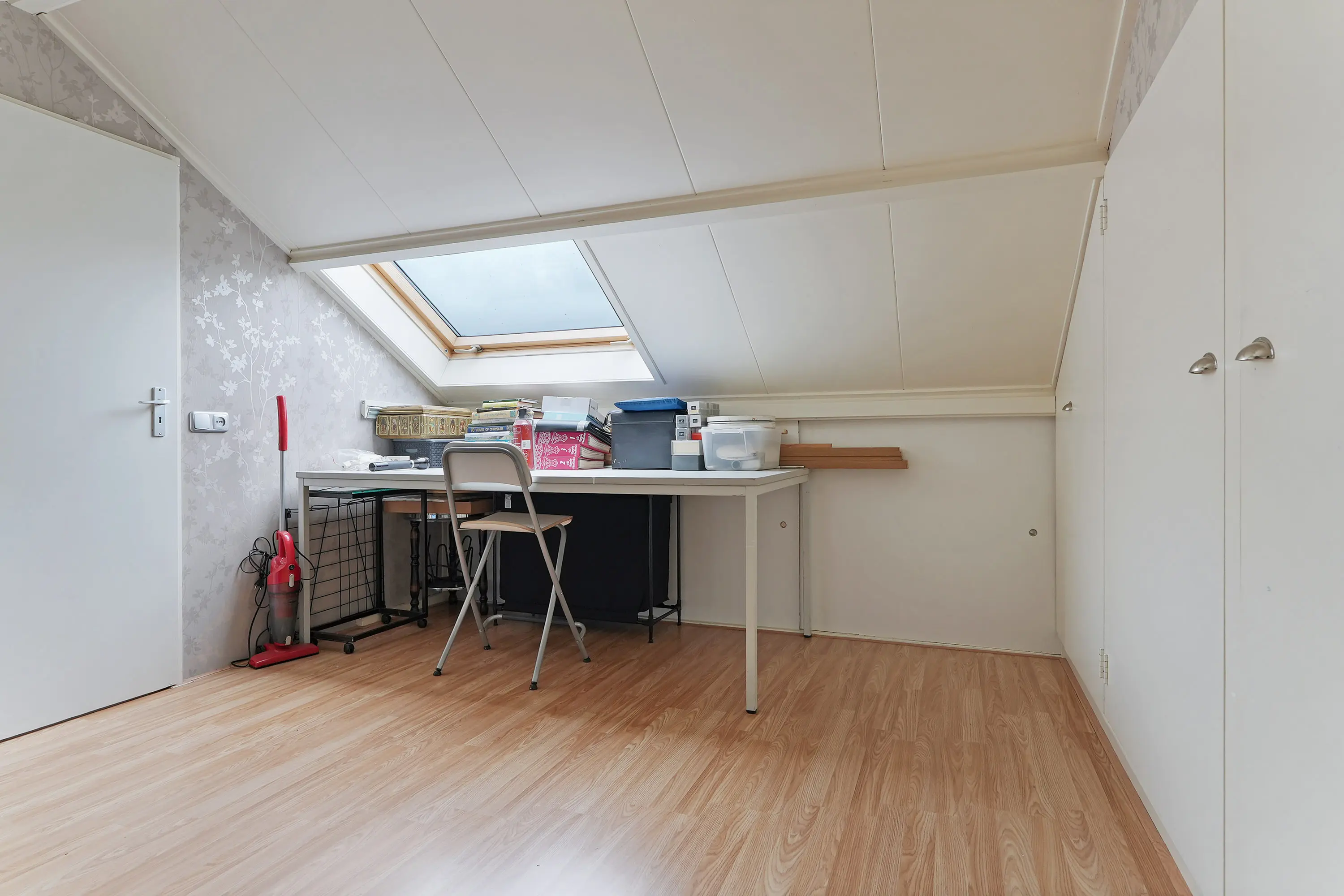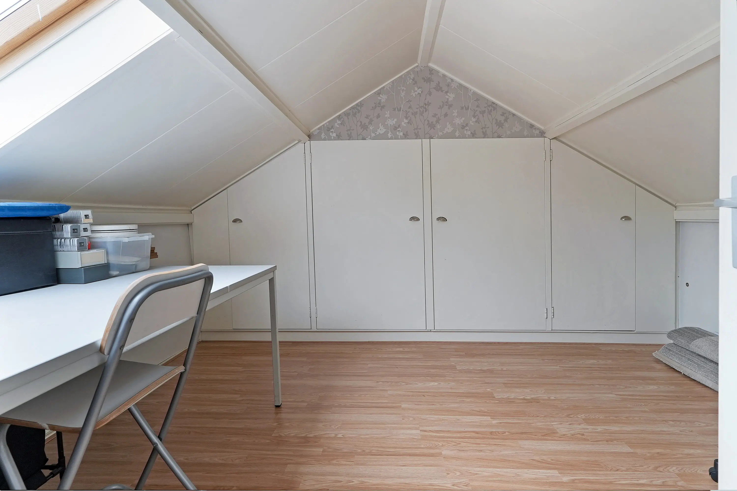 Via de vaste trap bereikt u de zolderverdieping. Deze verdieping biedt verrassend veel ruimte en is ingedeeld met een overloop en een royale vierde slaapkamer. Deze kamer kan uitstekend dienen als tienerkamer of hobbyruimte. Achter de knieschotten is volop bergruimte aanwezig voor koffers, seizoensspullen en andere zaken die u niet dagelijks nodig heeft.