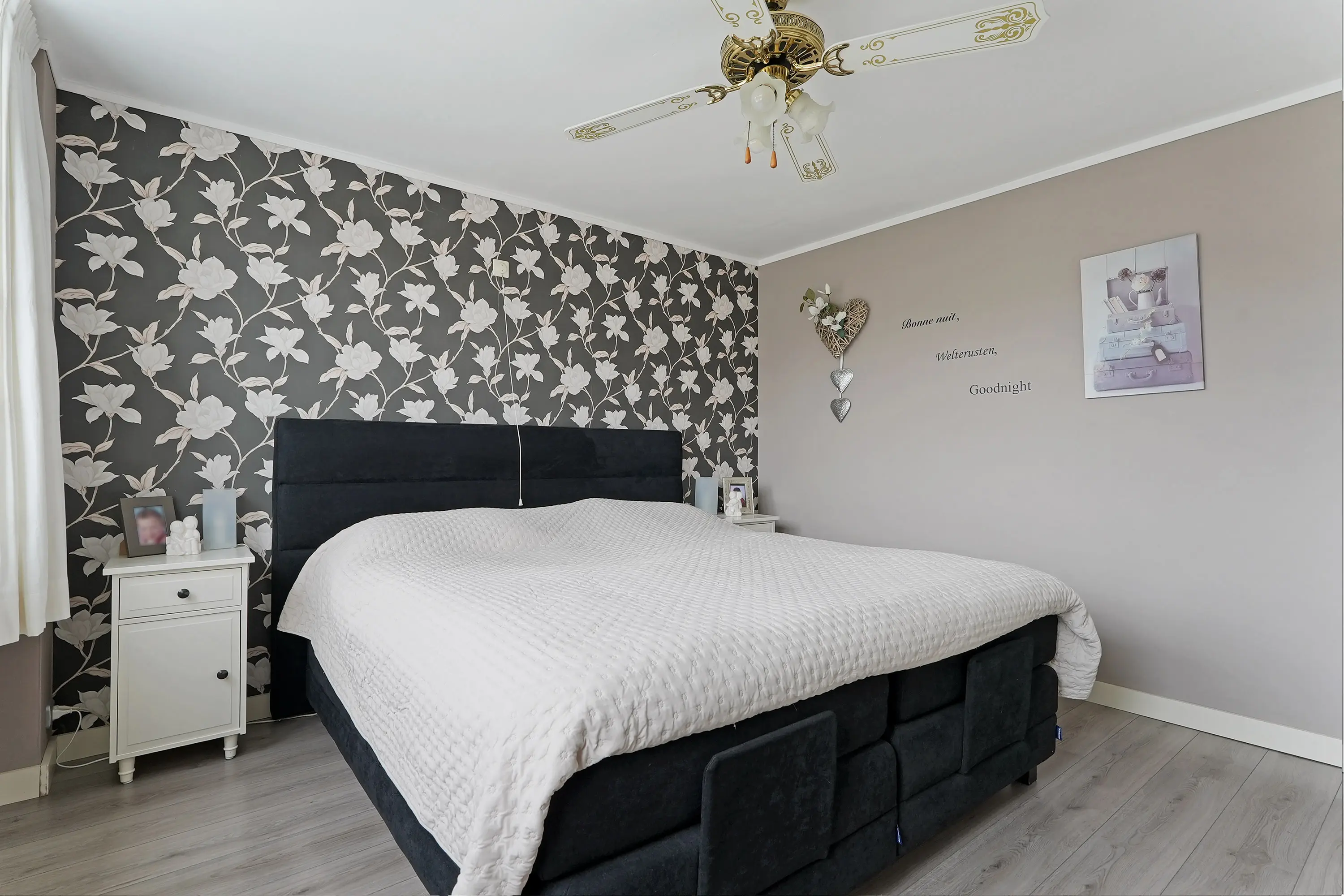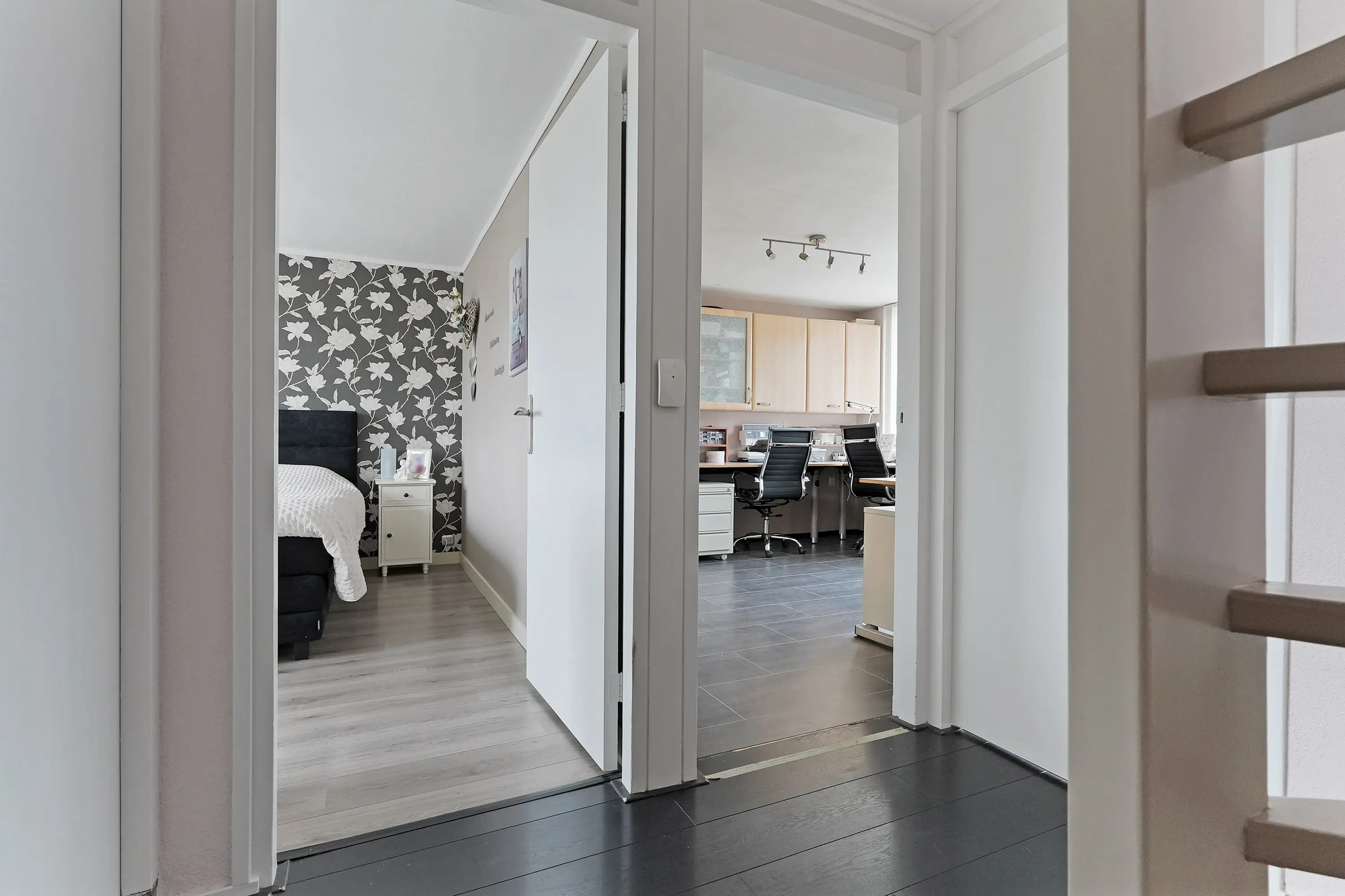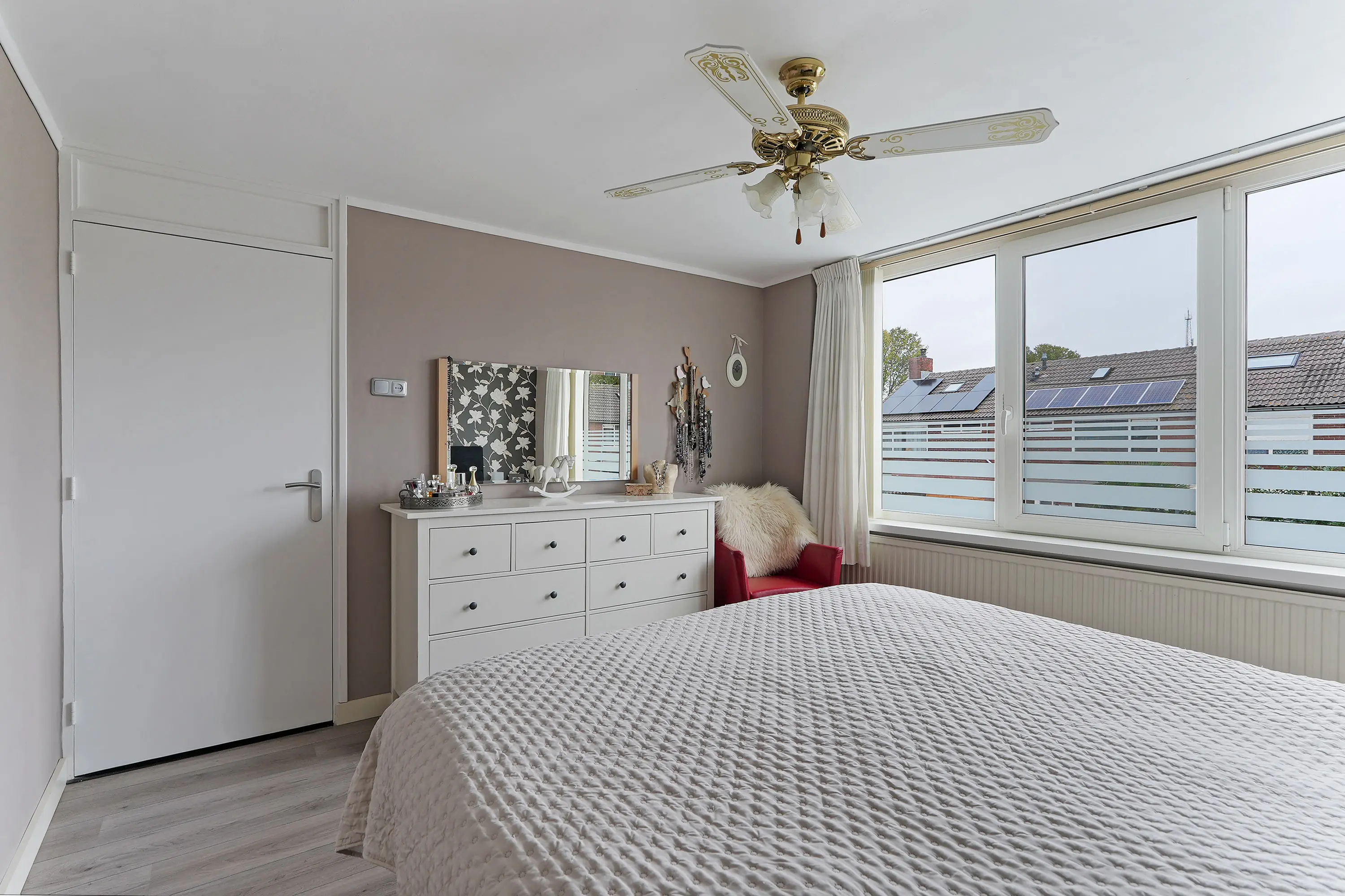 Via de vaste trap bereikt u de zolderverdieping. Deze verdieping biedt verrassend veel ruimte en is ingedeeld met een overloop en een royale vierde slaapkamer. Deze kamer kan uitstekend dienen als tienerkamer of hobbyruimte. Achter de knieschotten is volop bergruimte aanwezig voor koffers, seizoensspullen en andere zaken die u niet dagelijks nodig heeft.