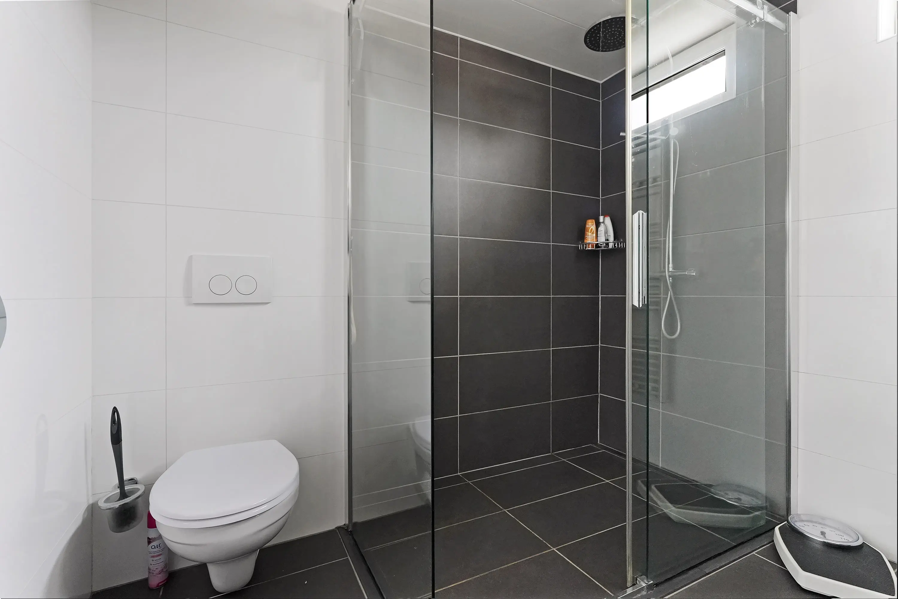 De eerste verdieping is bereikbaar via de vaste trap en biedt toegang tot drie slaapkamers en de badkamer. De drie slaapkamers zijn stuk voor stuk comfortabel van formaat. Twee kamers zijn zeer ruim opgezet en ideaal als master bedroom en kinderkamer, terwijl de derde kamer perfect gebruikt kan worden als werkkamer of logeerkamer. Alle kamers profiteren van grote raampartijen, waardoor ze aangenaam licht zijn. De badkamer is eveneens ruim van opzet en modern en neutraal afgewerkt. Hier treft u een ruime inloopdouche met glaswand, tweede toilet en fraai wastafelmeubel met dubbele kraan.