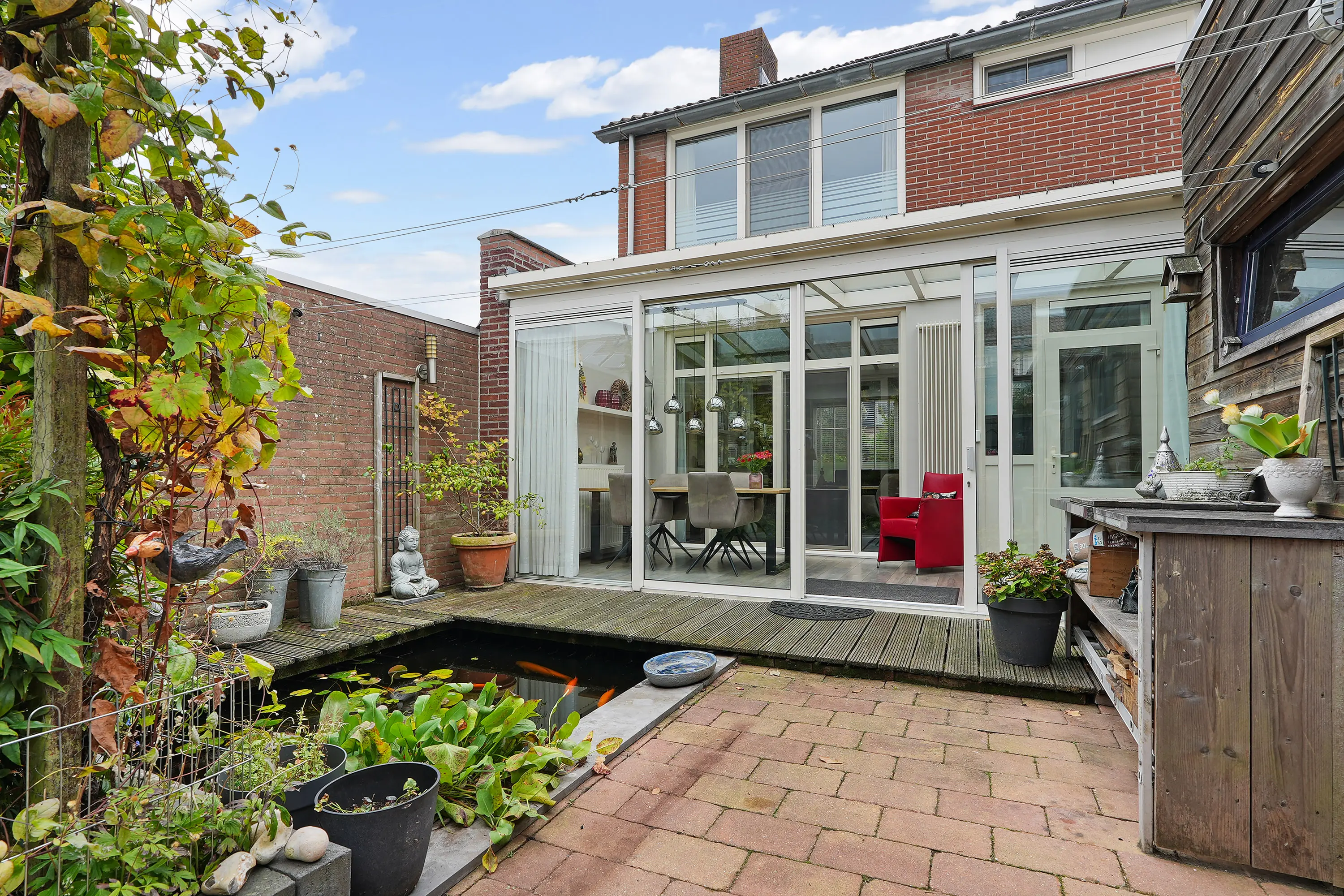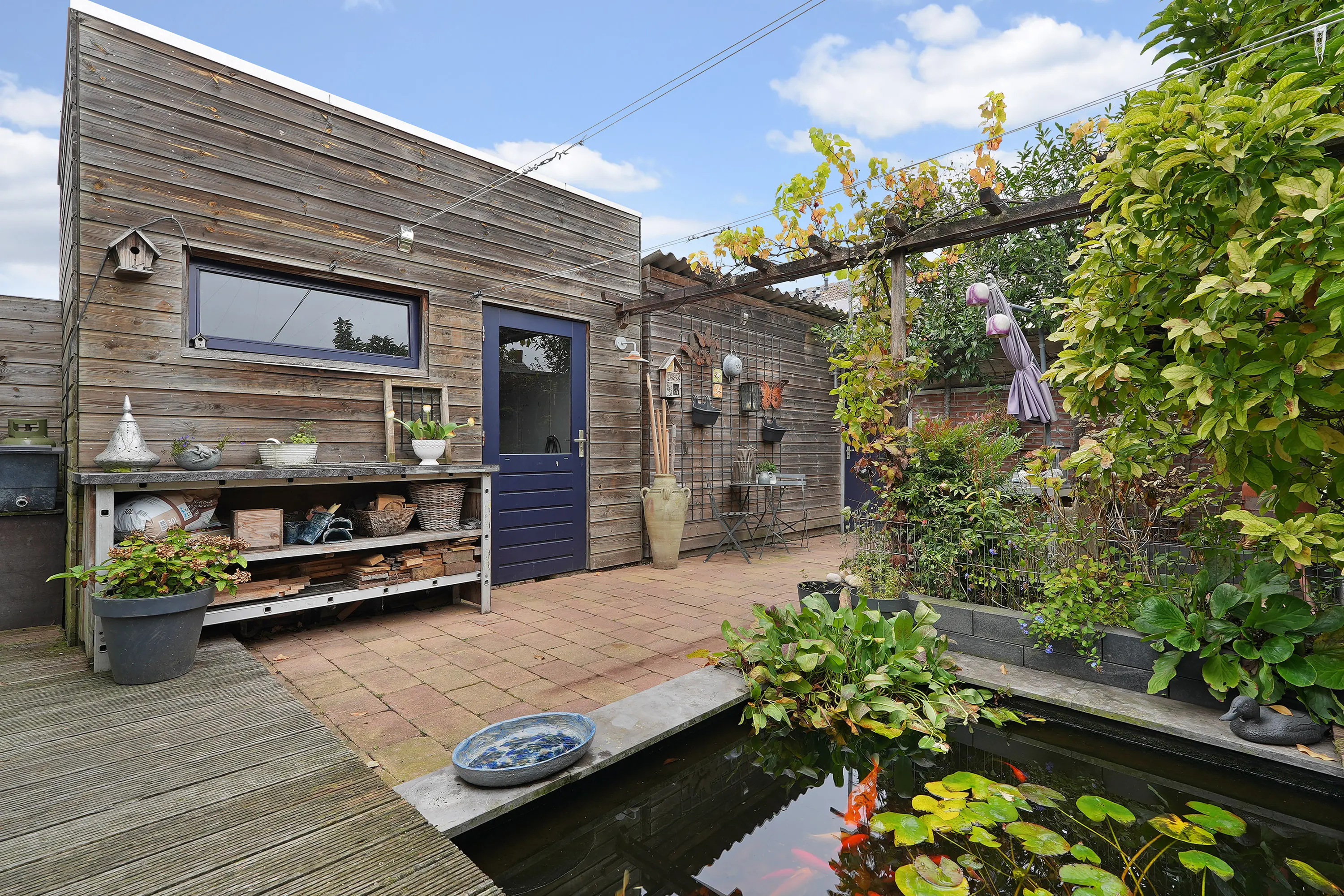 De achtertuin is keurig aangelegd en biedt een fijne combinatie van terrassen, groen en een waterpartij. Dankzij de ligging en indeling is er altijd wel een plek in de zon of schaduw te vinden. De tuin is ruim biedt genoeg ruimte voor een loungehoek en een eettafel om lange zomeravonden buiten door te brengen. Achter in de tuin bevindt zich de ruime (fietsen)berging, ideaal voor het stallen van fietsen, gereedschap of tuinmeubilair. De vrije achterom maakt het gemakkelijk om met de fiets langs achteren de tuin te bereiken.