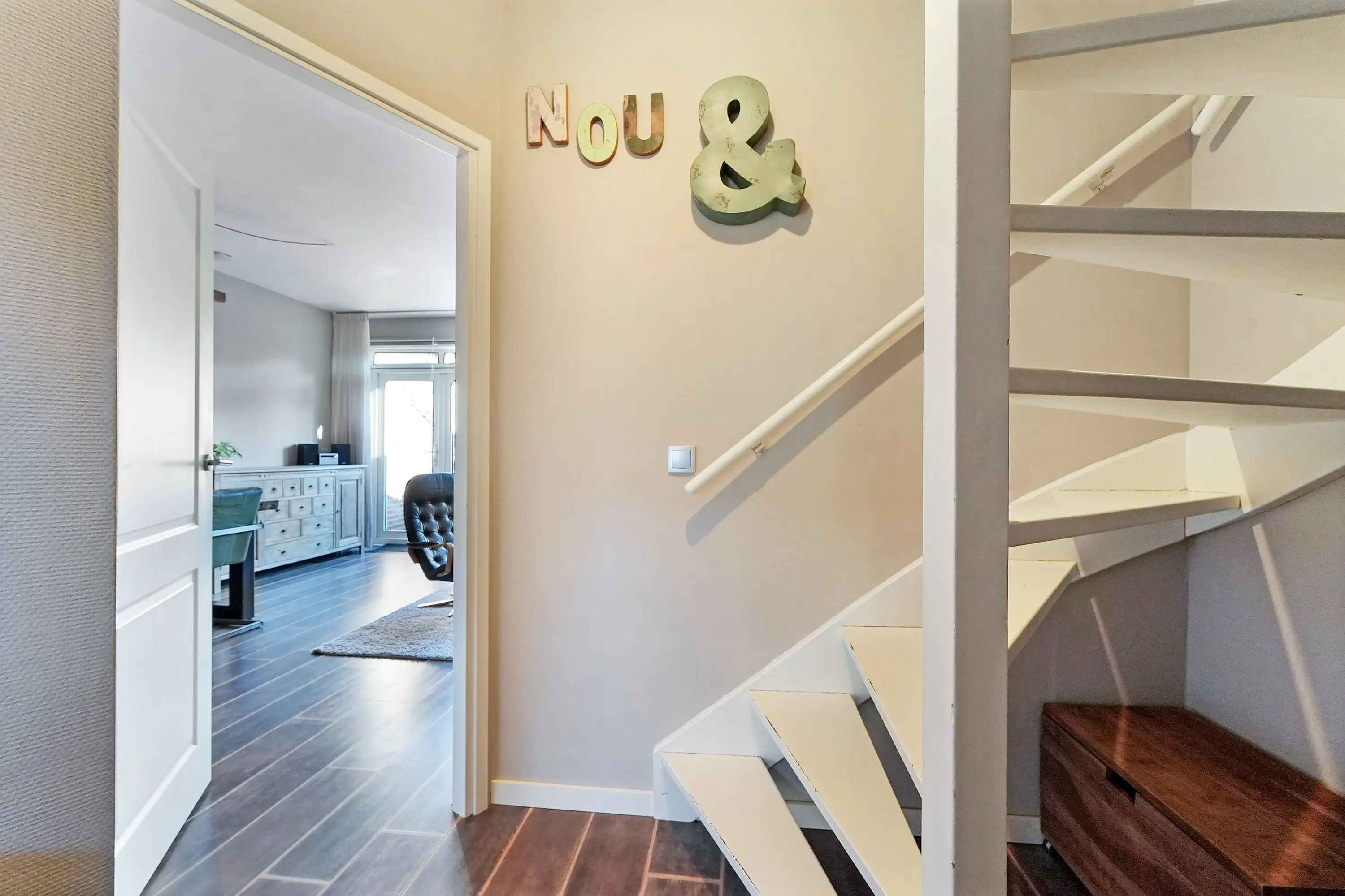 Via de carport bereikt u de entree van de woning. In de hal bevinden zich het toilet, de trapopgang en toegang tot de woonkamer. De ruime en lichte woonkamer is prettig ingedeeld en profiteert van grote raampartijen aan de achterzijde. De openslaande deuren zorgen voor een directe verbinding met de tuin, waardoor binnen en buiten op een natuurlijke manier in elkaar overlopen. Het terras in de tuin biedt volop ruimte voor een zitgedeelte en vormt een fijne plek om in alle rust van de zon te genieten.