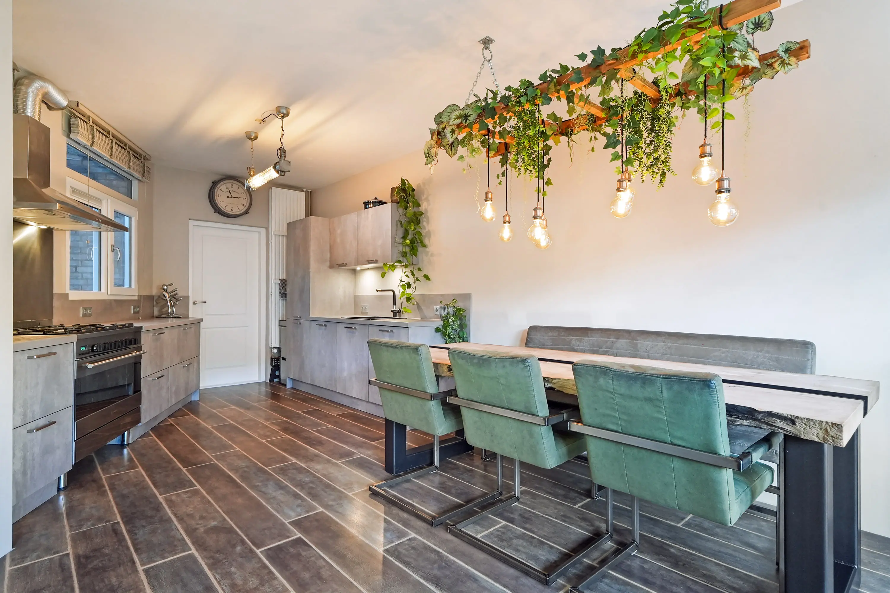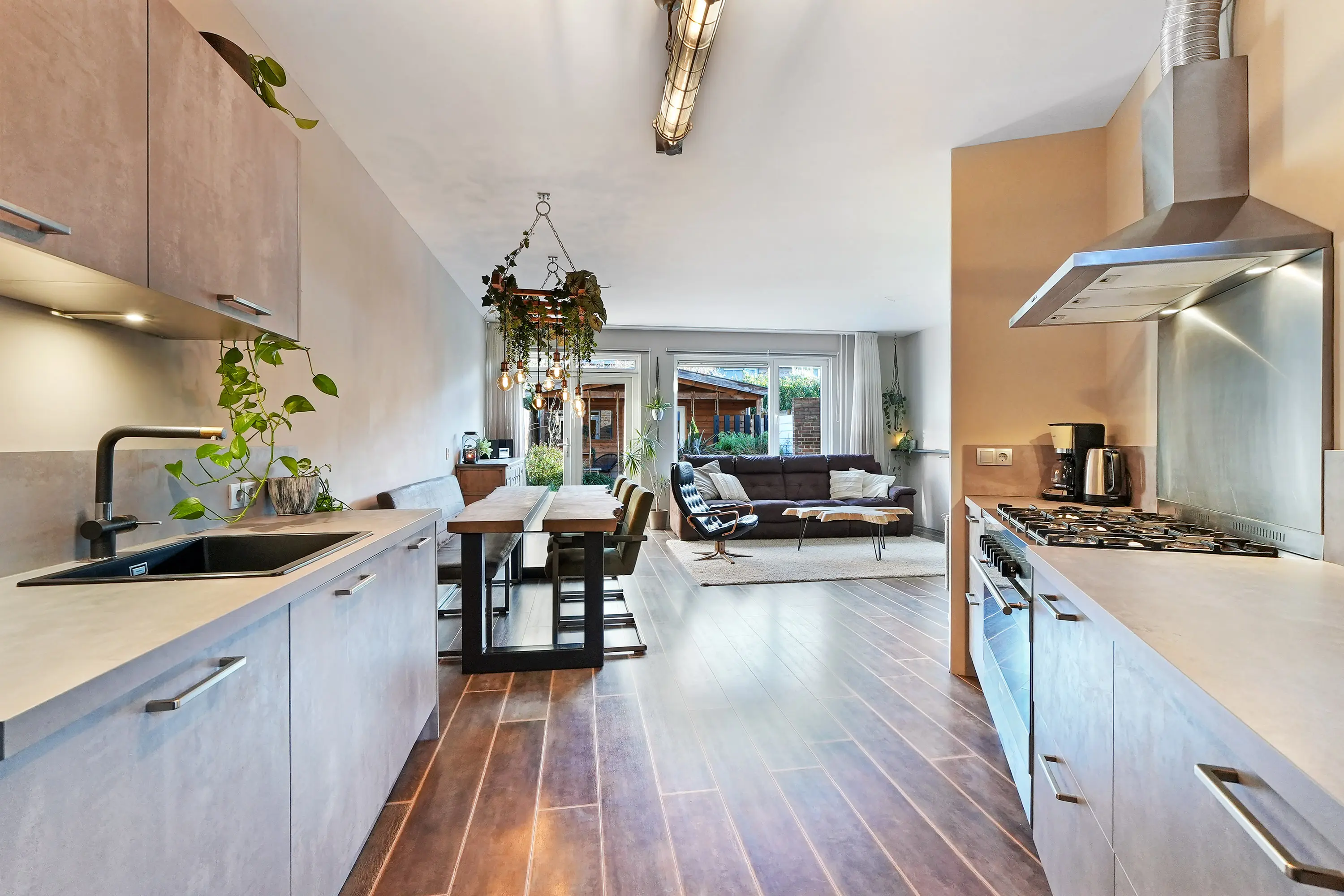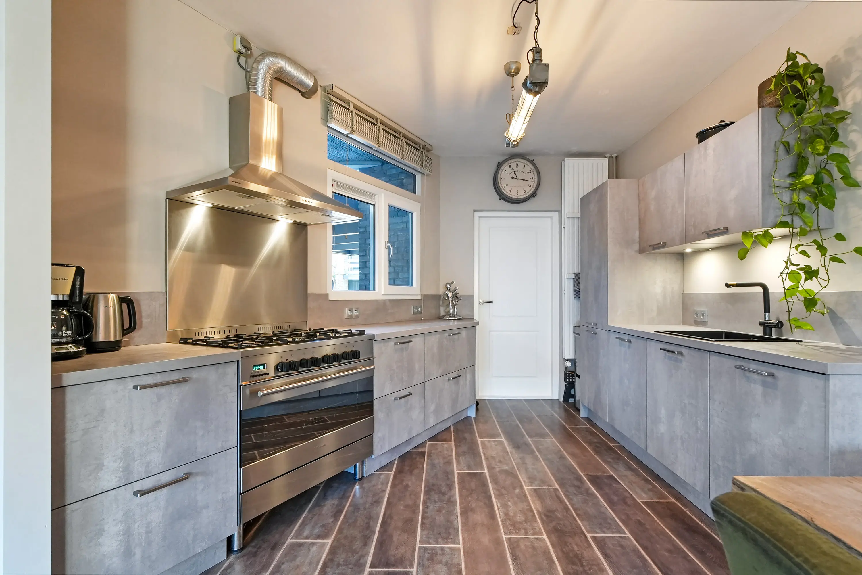 De open keuken is praktisch opgesteld en voorzien van een modern keukenblok met diverse inbouwapparatuur. Aansluitend bevindt zich de bijkeuken, ideaal voor extra bergruimte, voorraad en het plaatsen van witgoed.