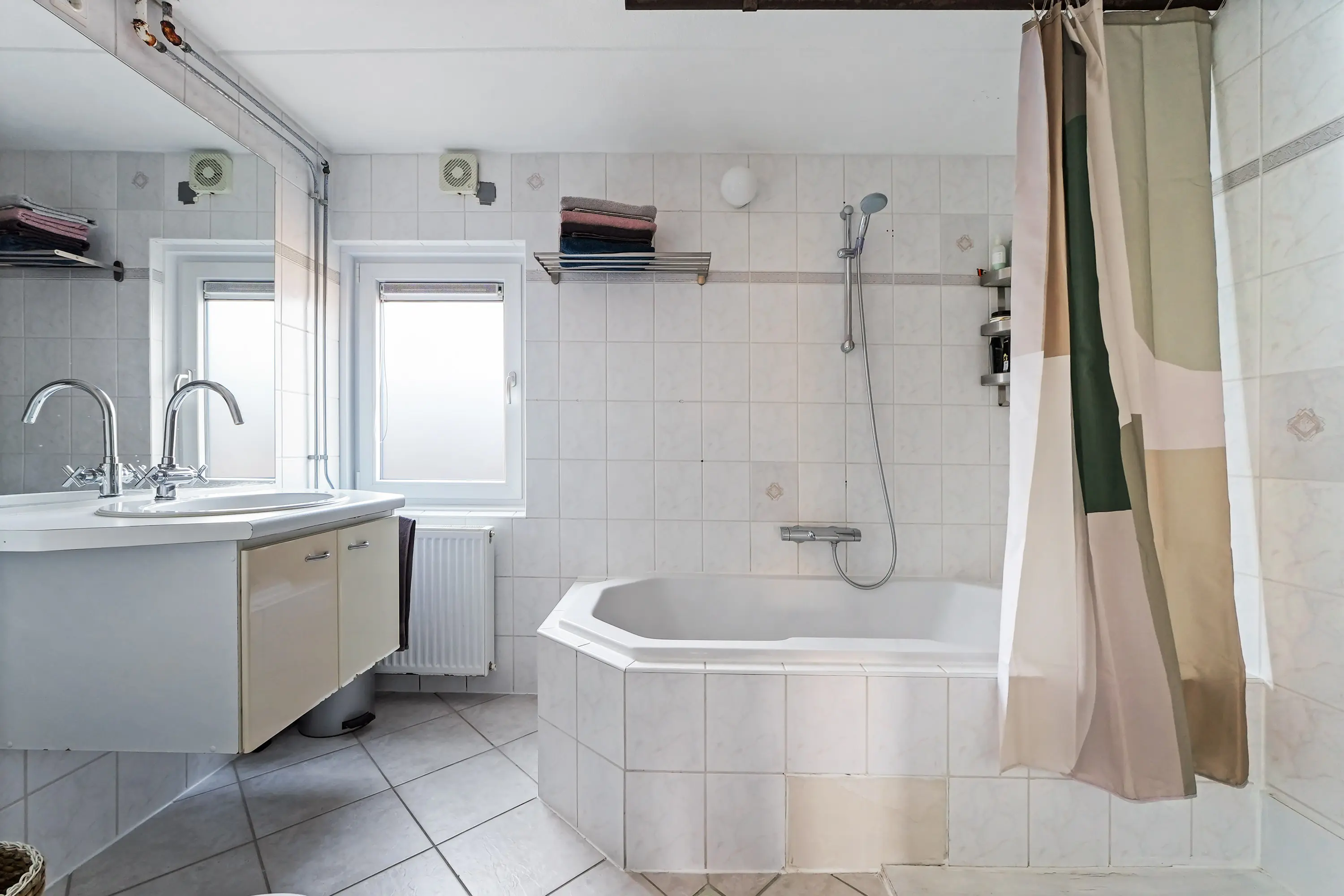 Op de eerste verdieping zijn drie volwaardige slaapkamers gesitueerd, allen van goed formaat en flexibel in te delen. De badkamer is uitgerust met een ligbad met douche, wastafel en toilet en beschikt over mechanische ventilatie, wat bijdraagt aan een prettig en gezond binnenklimaat. De overloop biedt toegang tot alle vertrekken en beschikt over extra kastruimte.