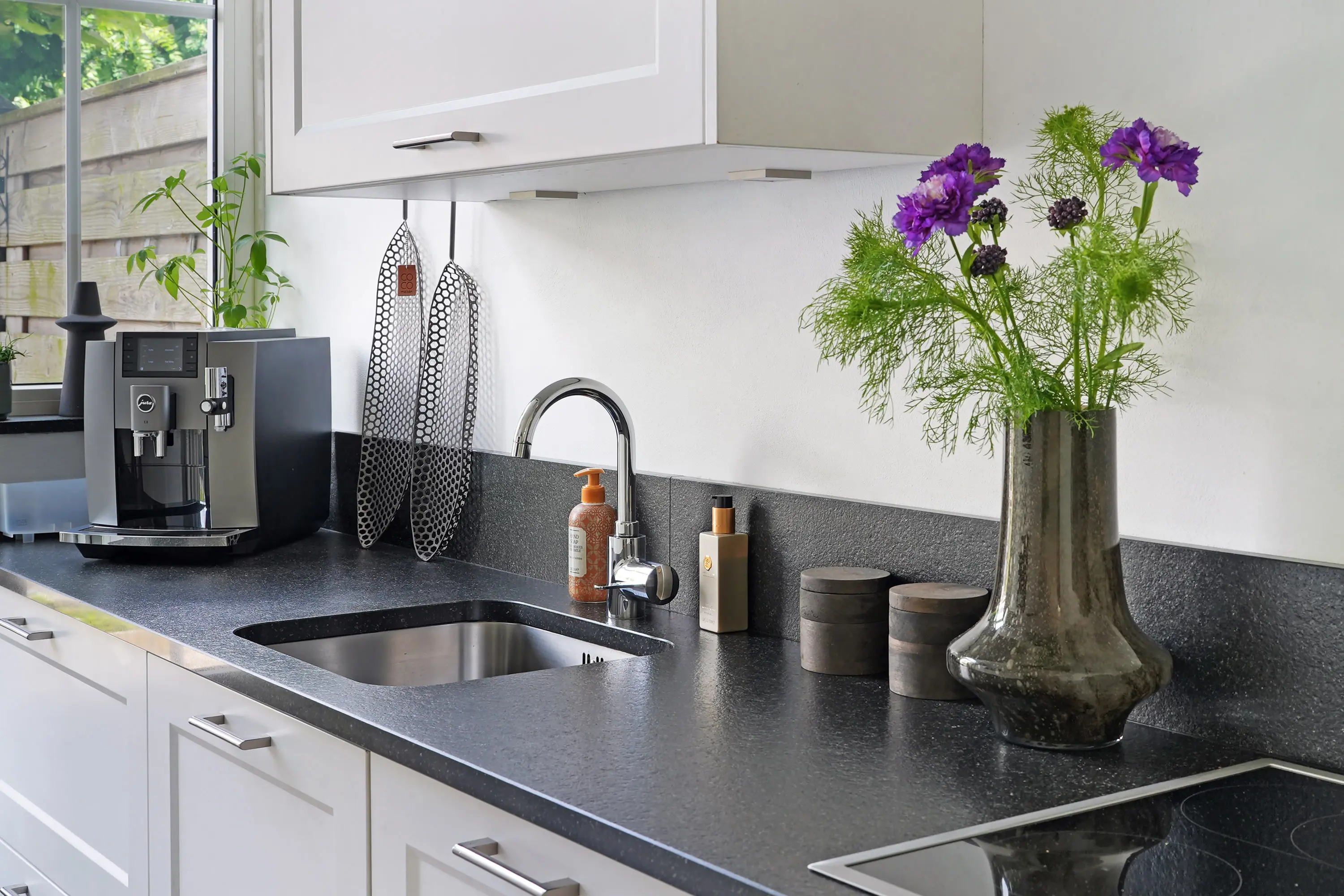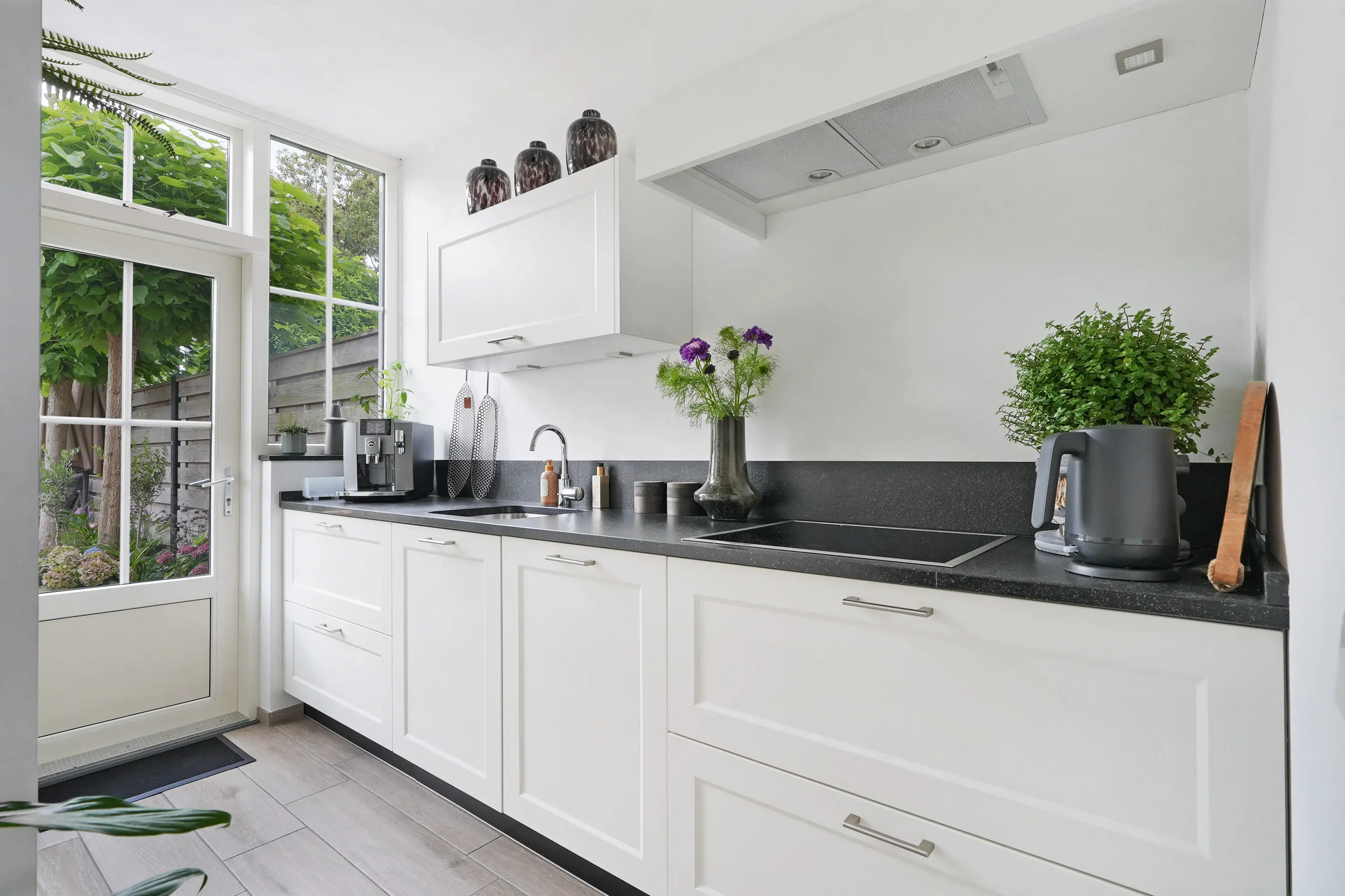 Via de hal, waar zich de vernieuwde meterkast, het toilet en de trapopgang met trapkast bevinden, bereikt u de woonkamer. Deze ligt aan de linkerzijde, is ruim opgezet en voorzien van grote raampartijen, wat zorgt voor een aangename lichtinval en een prettige sfeer. De keuken, gelegen aan de achterzijde, verkeert in zeer nette staat en is voorzien van een granieten aanrechtblad en diverse inbouwapparaten, waaronder een vaatwasser, inductiekookplaat, afzuigkap, koelkast, vriezer en combi-oven. Vanuit de keuken heeft u toegang tot de achtertuin. De begane grond afwerking is van PVC waar in de keuken tegels aanwezig zijn.
