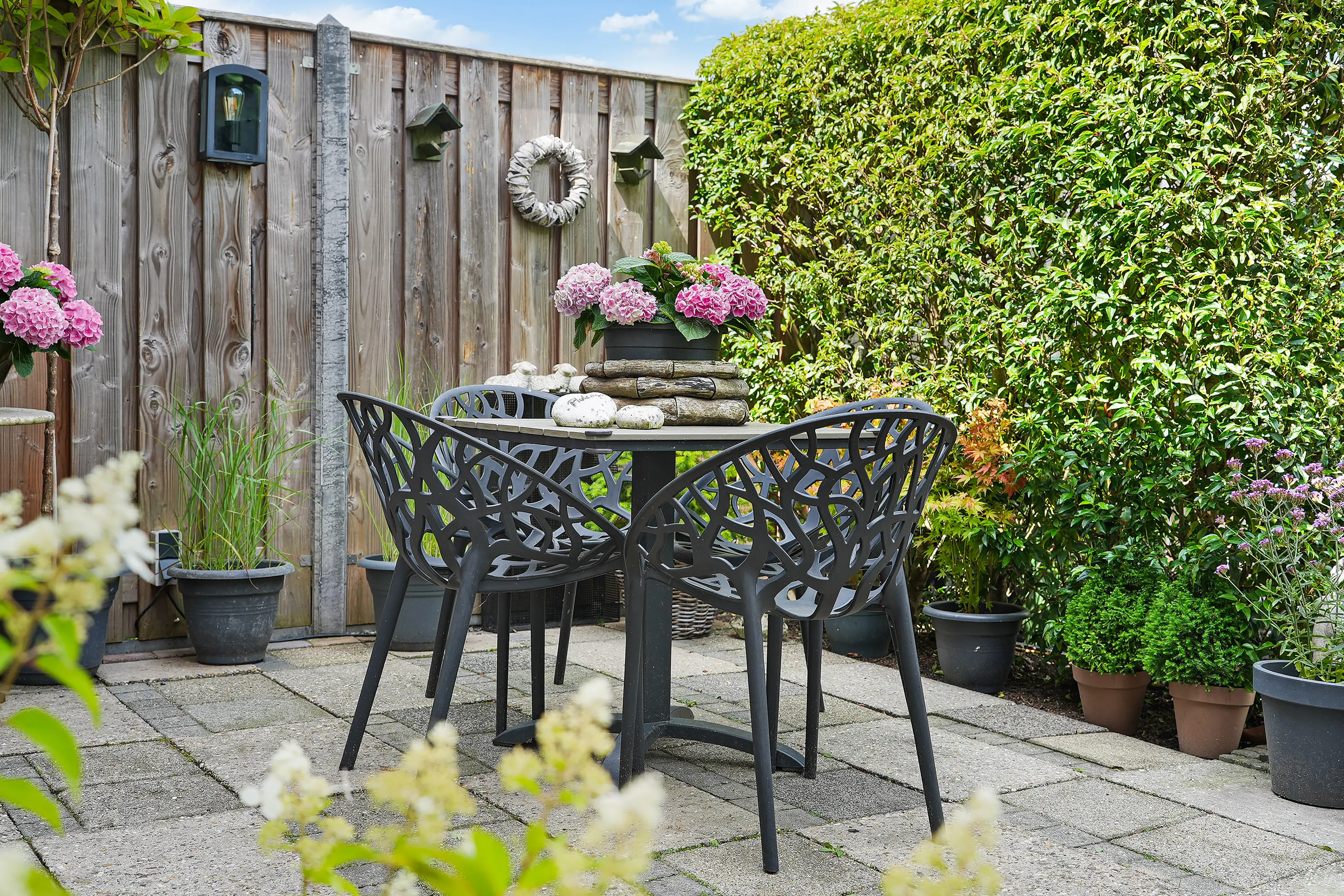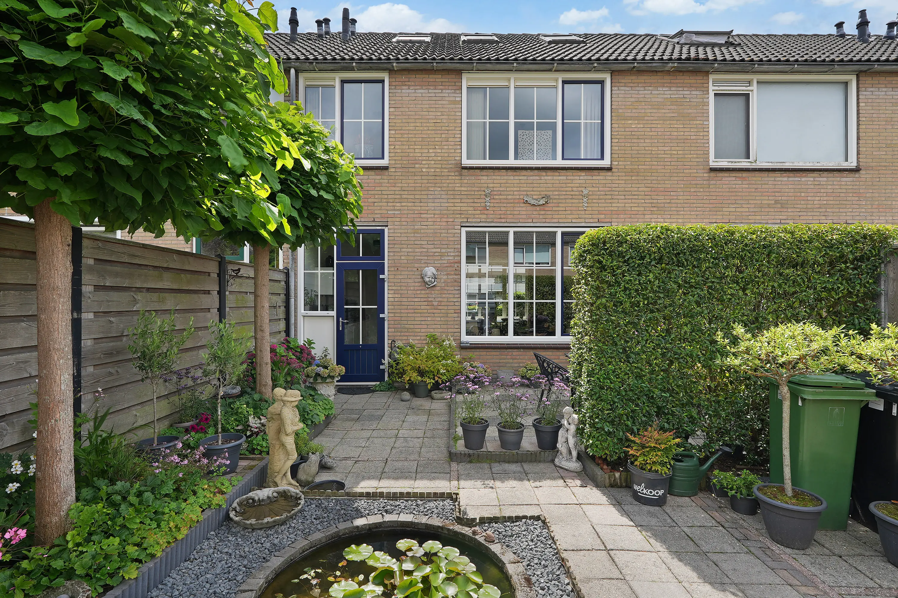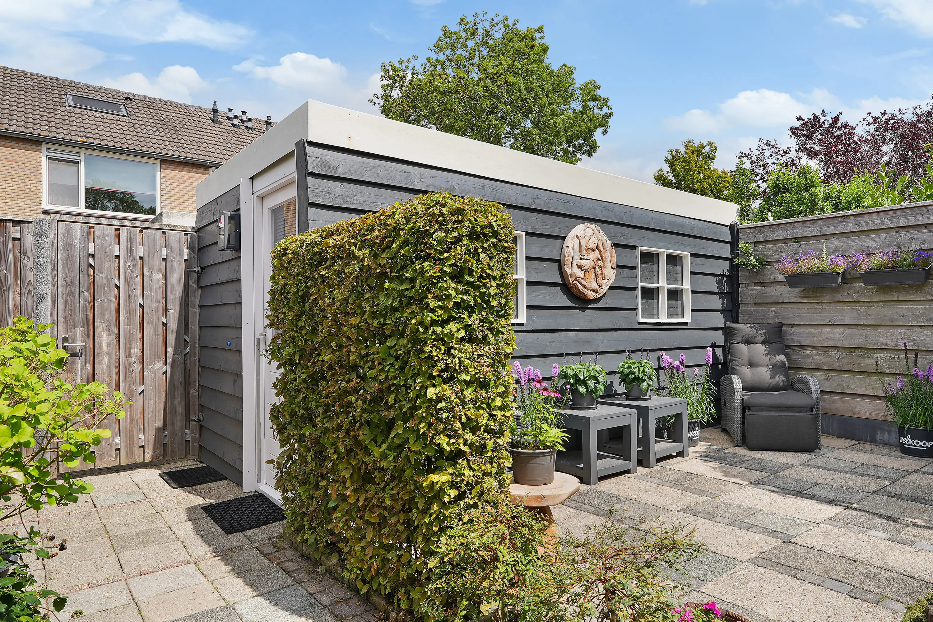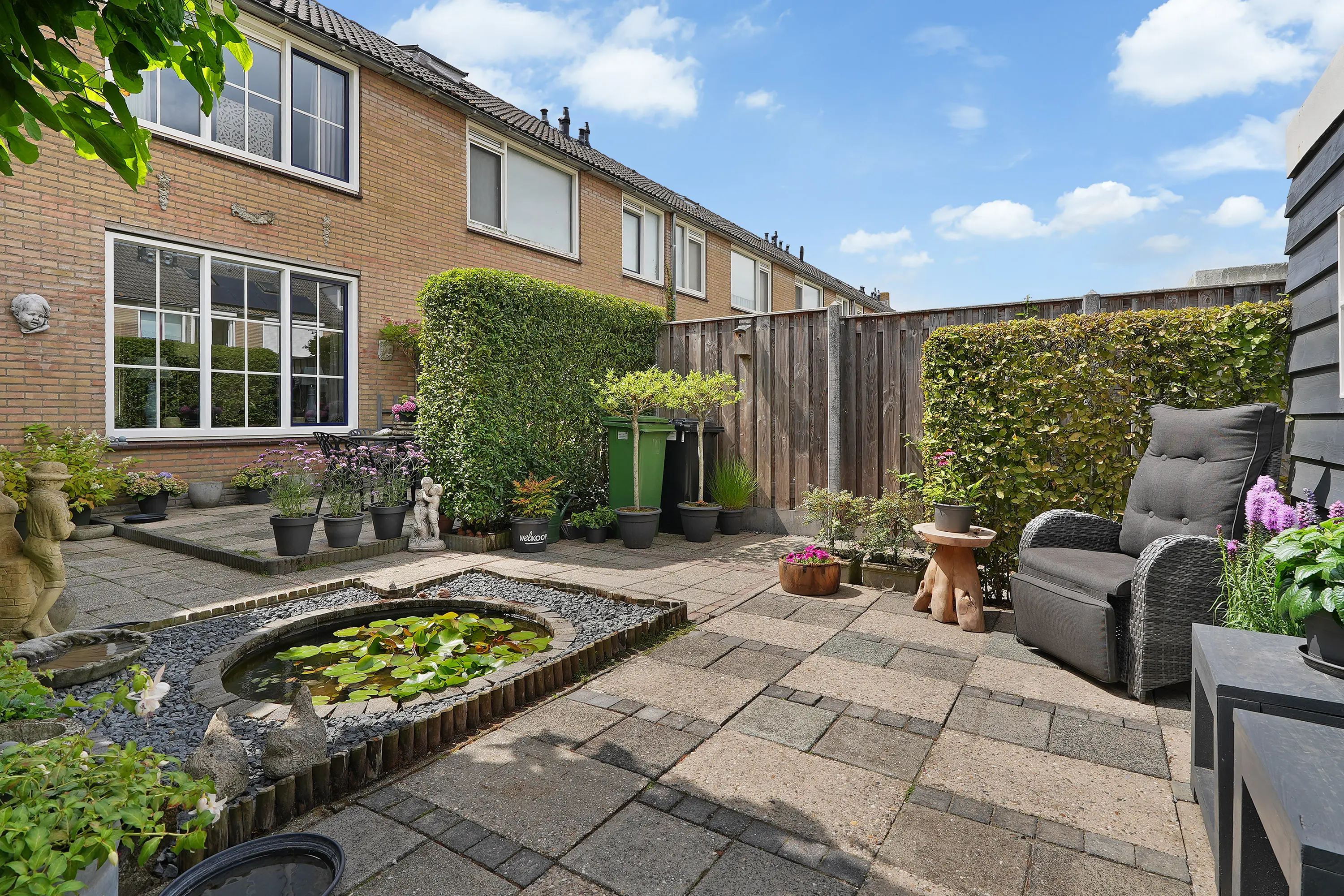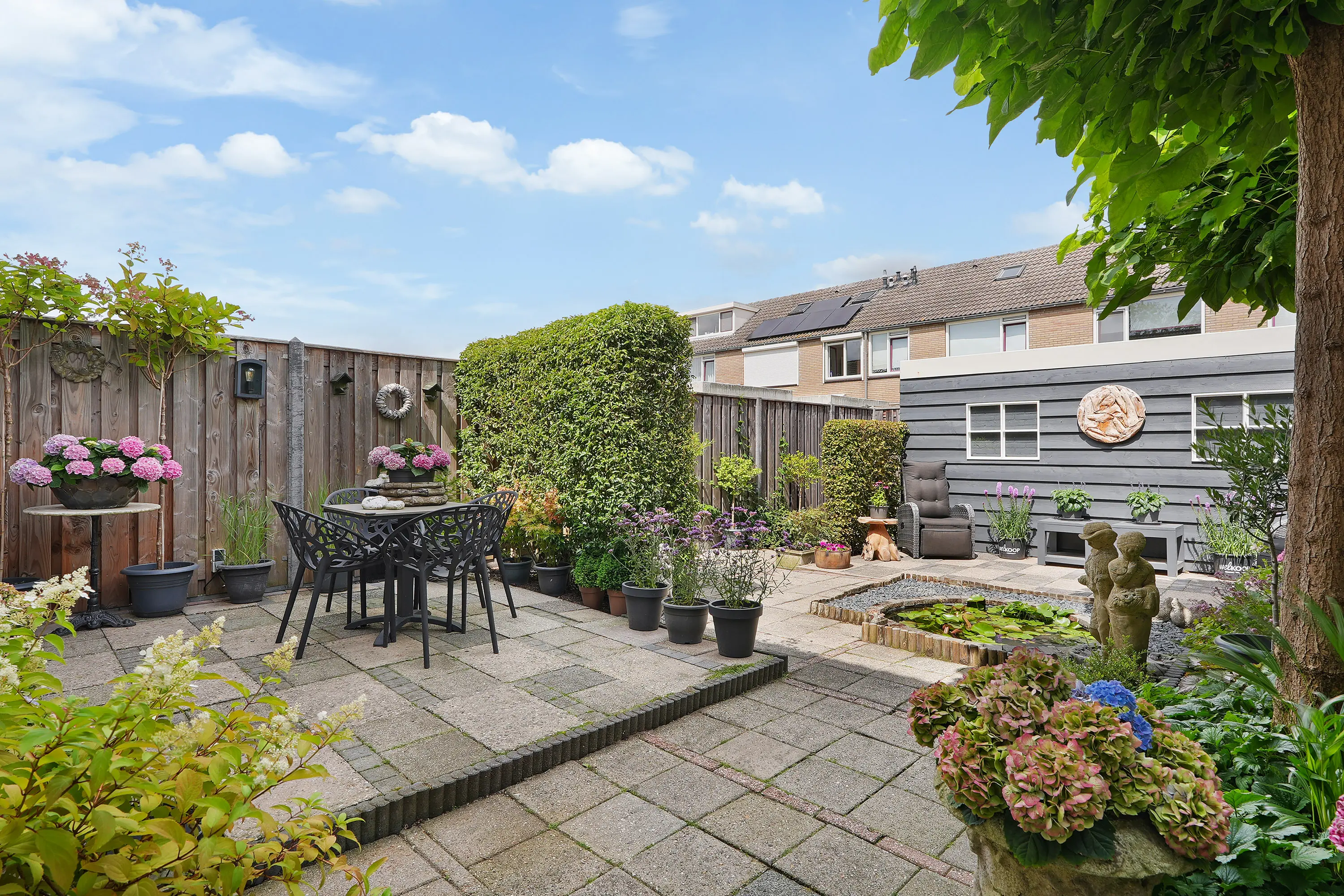 De achtertuin, ca. 8 meter diep en 6 meter breed, is gelegen op het noordoosten en ontvangt veel zonlicht. De stenen berging met elektra biedt ruimte voor fietsen, gereedschap en tuinspullen. Het dak van de schuur is bekleed met kunststof dakbedekking. Via de vrije achterom is de tuin gemakkelijk bereikbaar.