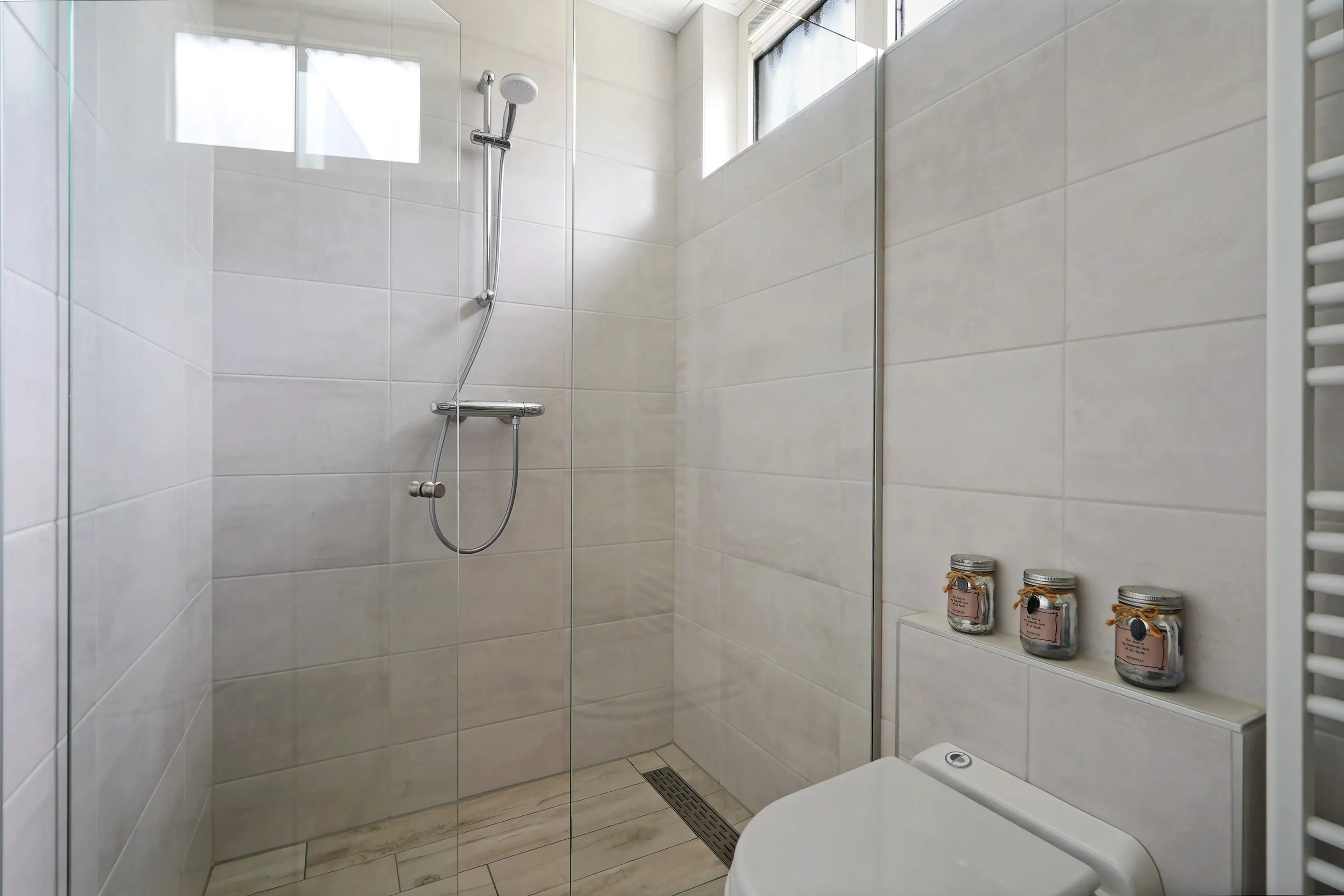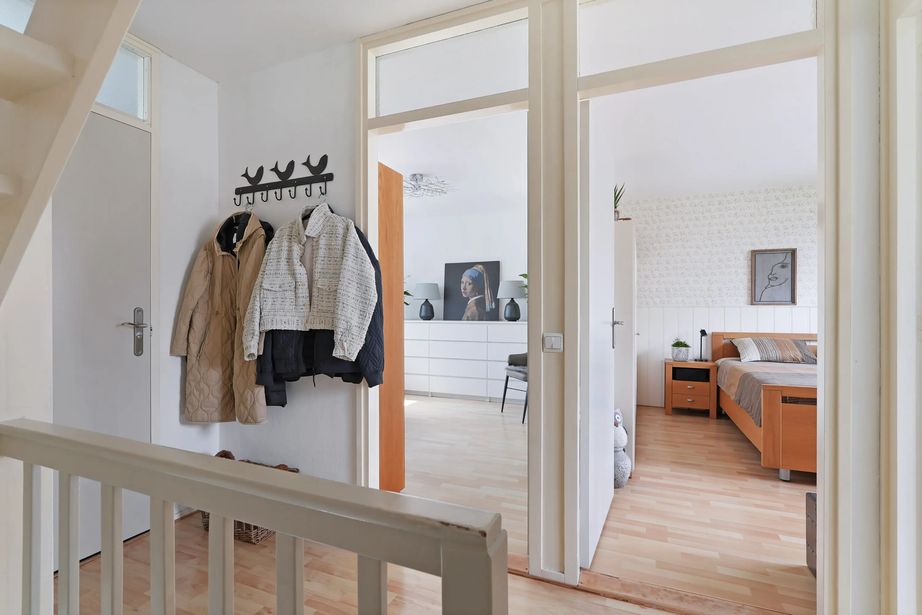 De overloop biedt toegang tot drie ruime slaapkamers en een badkamer. De badkamer is vernieuwd in 2021, extra groot gemaakt en beschikt over een douche, wastafel, sanibroyeur-toilet en vloerverwarming. Via een vaste trap bereikt u de tweede verdieping.