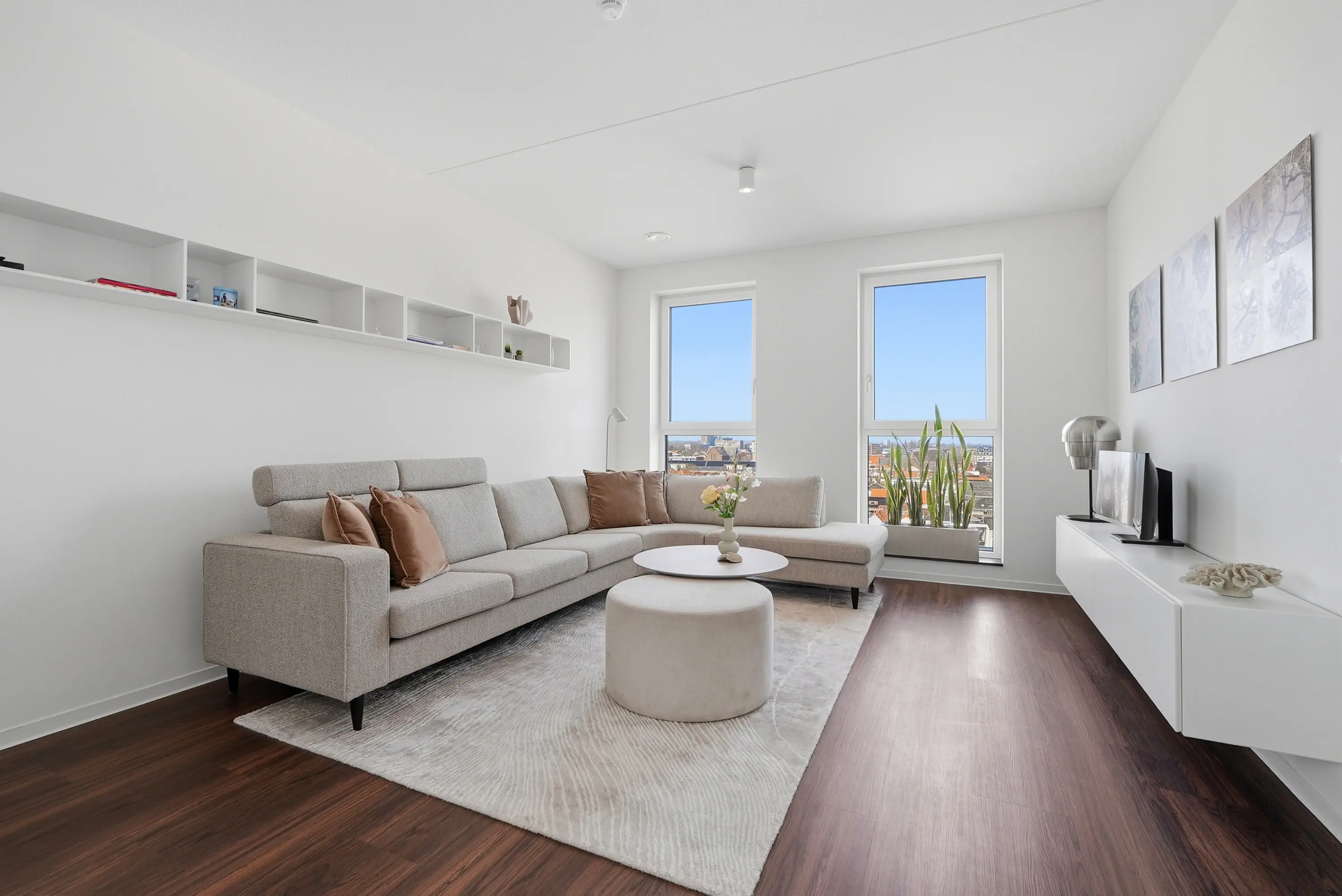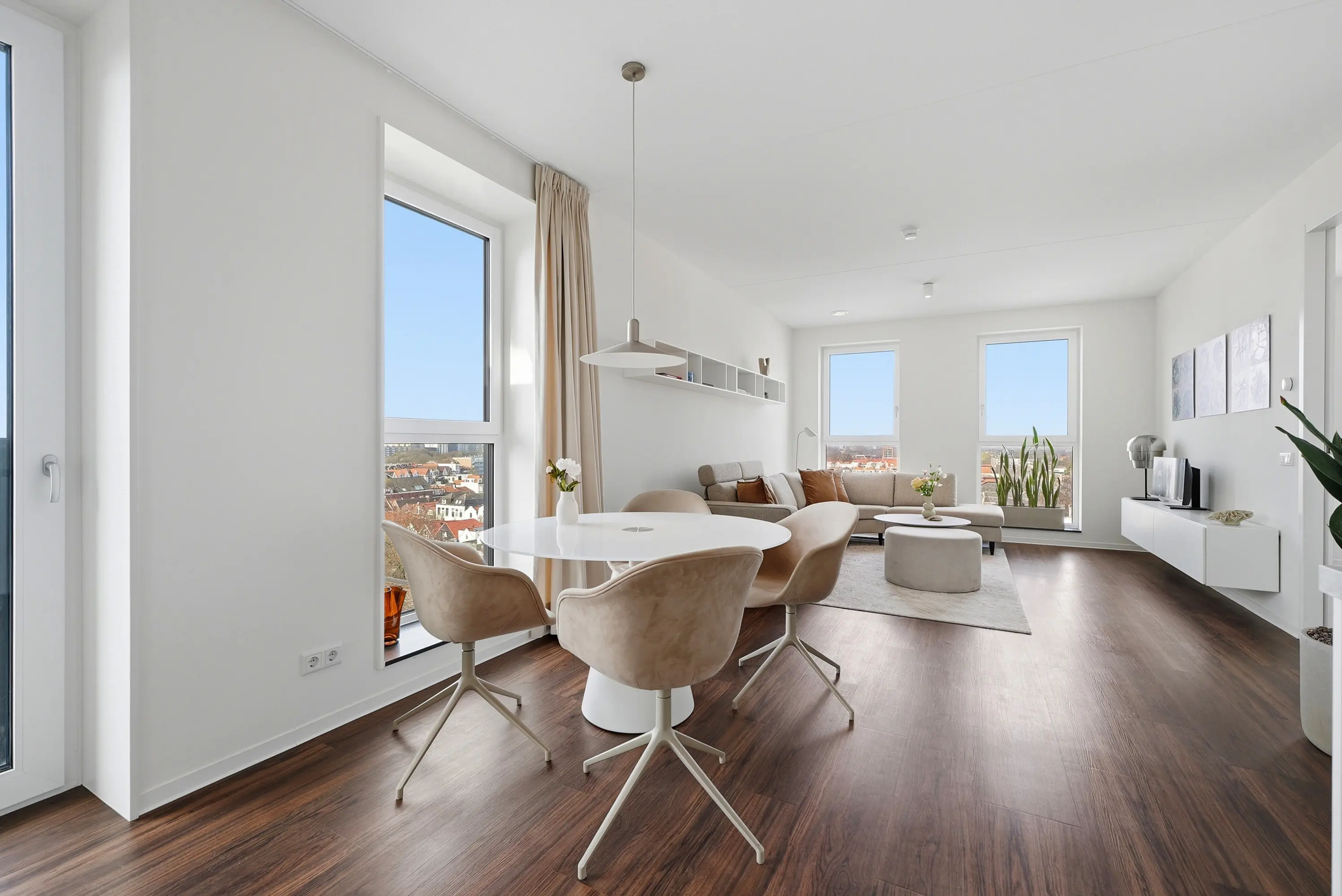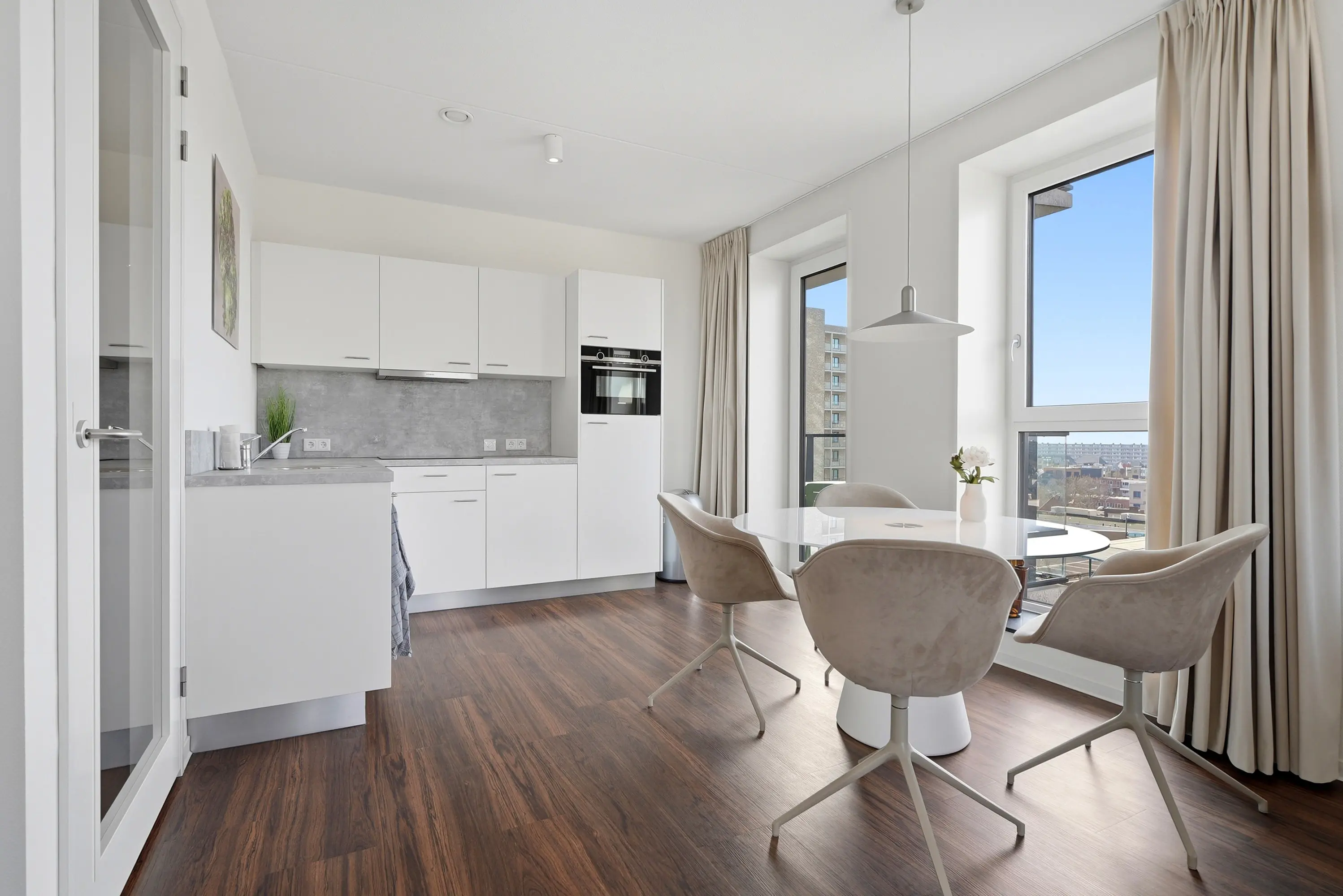 De woonkamer vormt het centrale leefgedeelte en staat in open verbinding met de moderne keuken, die royaal is opgezet en voorzien van hoogwaardige inbouwapparatuur. Het balkon sluit hier naadloos op aan en vormt een verlengstuk van de leefruimte; een heerlijke plek om te genieten van de middag- en avondzon en het uitzicht over de stad.