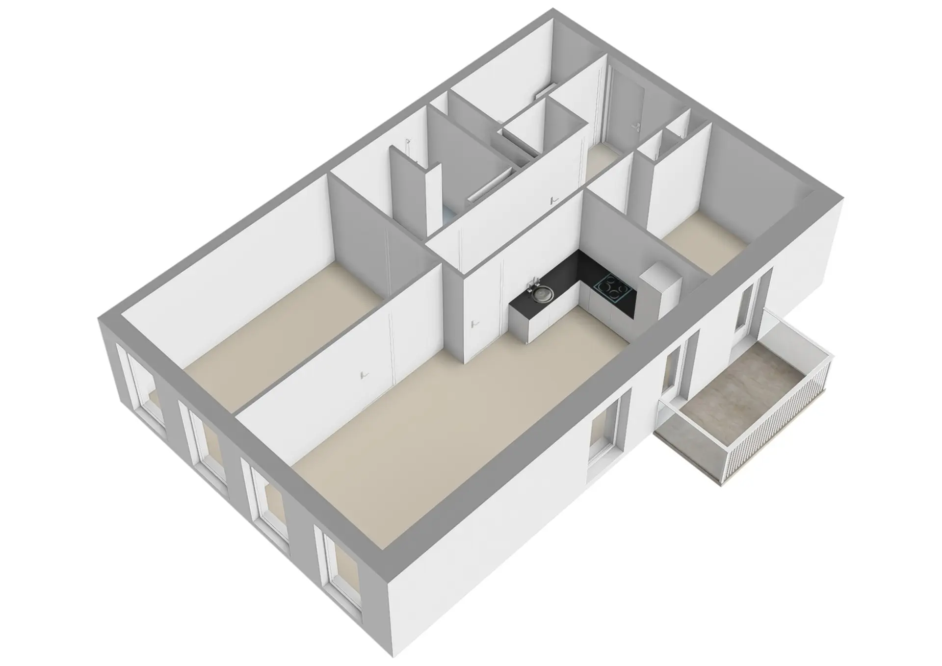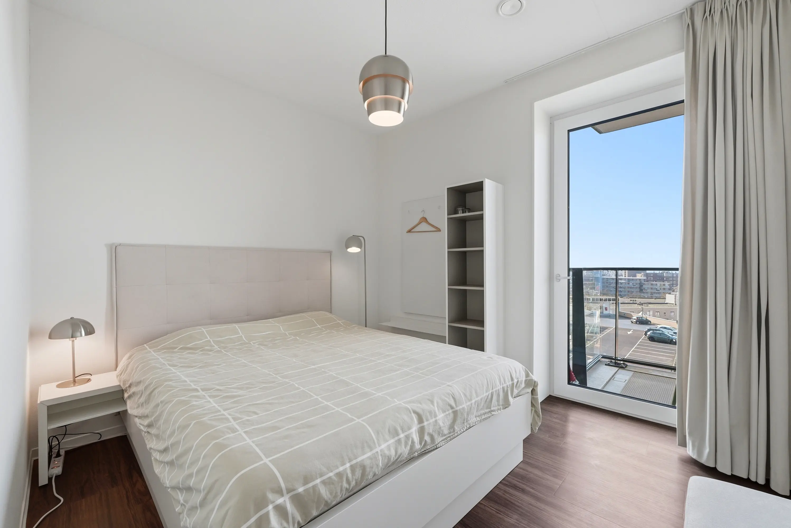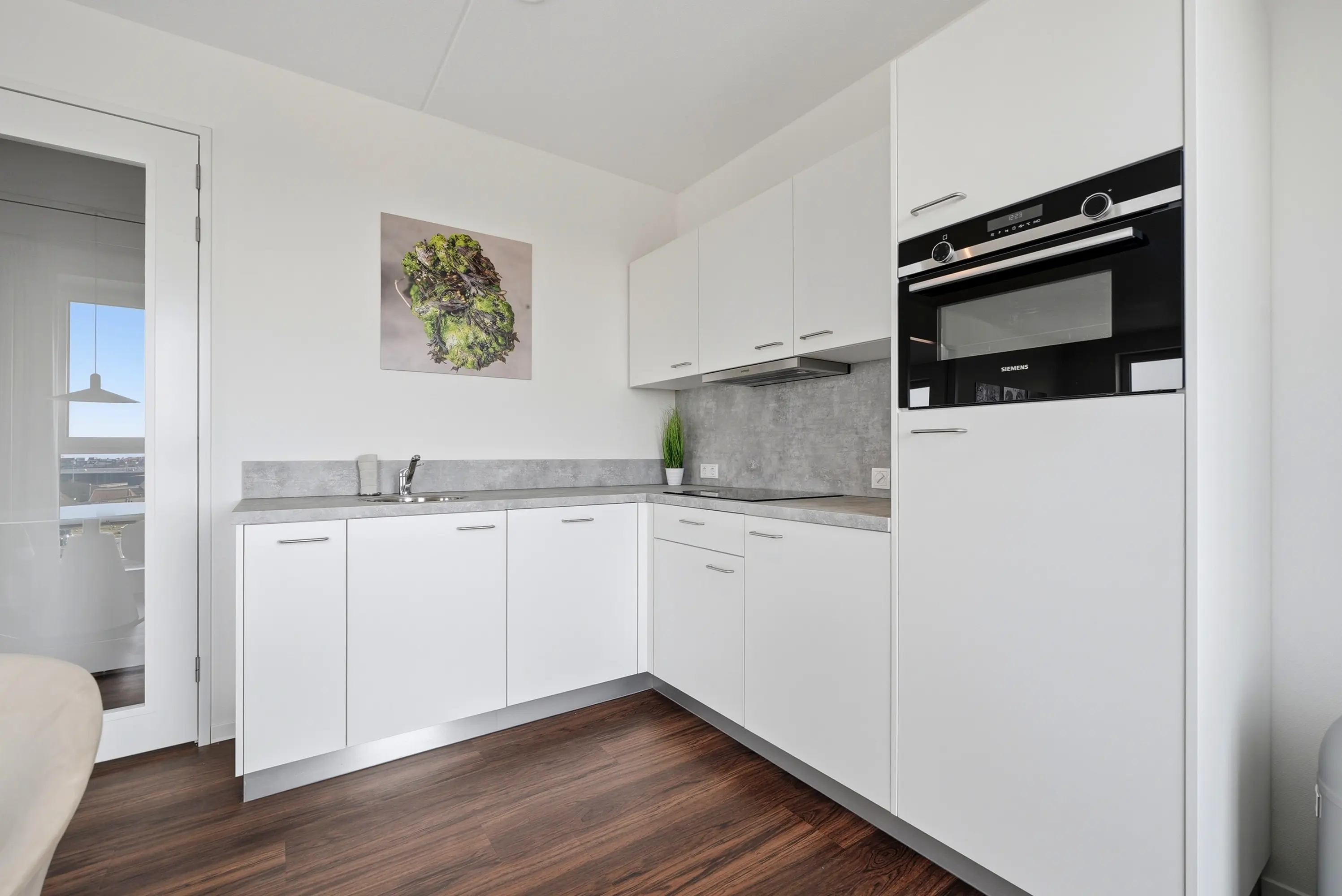 De woonkamer vormt het centrale leefgedeelte en staat in open verbinding met de moderne keuken, die royaal is opgezet en voorzien van hoogwaardige inbouwapparatuur. Het balkon sluit hier naadloos op aan en vormt een verlengstuk van de leefruimte; een heerlijke plek om te genieten van de middag- en avondzon en het uitzicht over de stad.