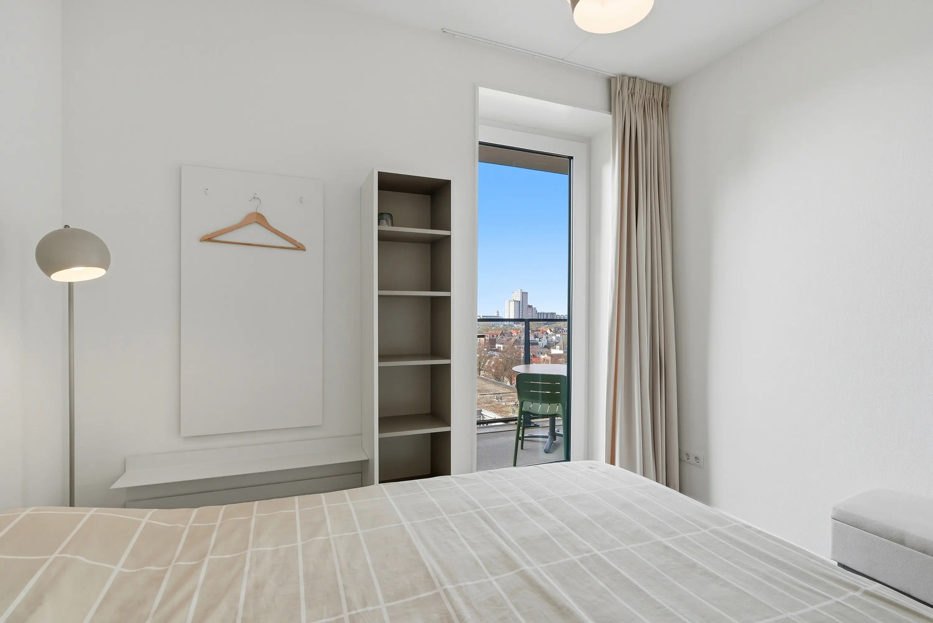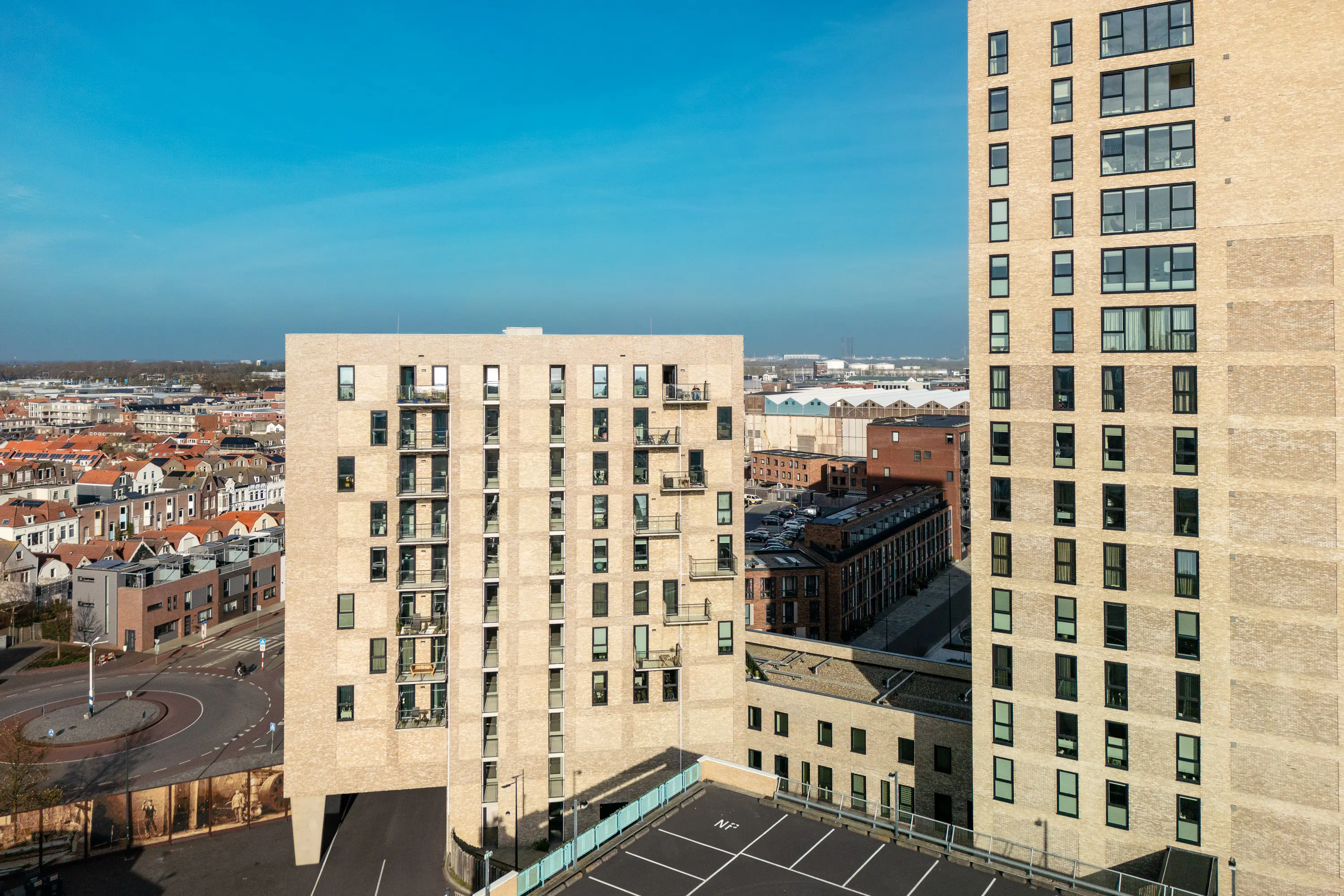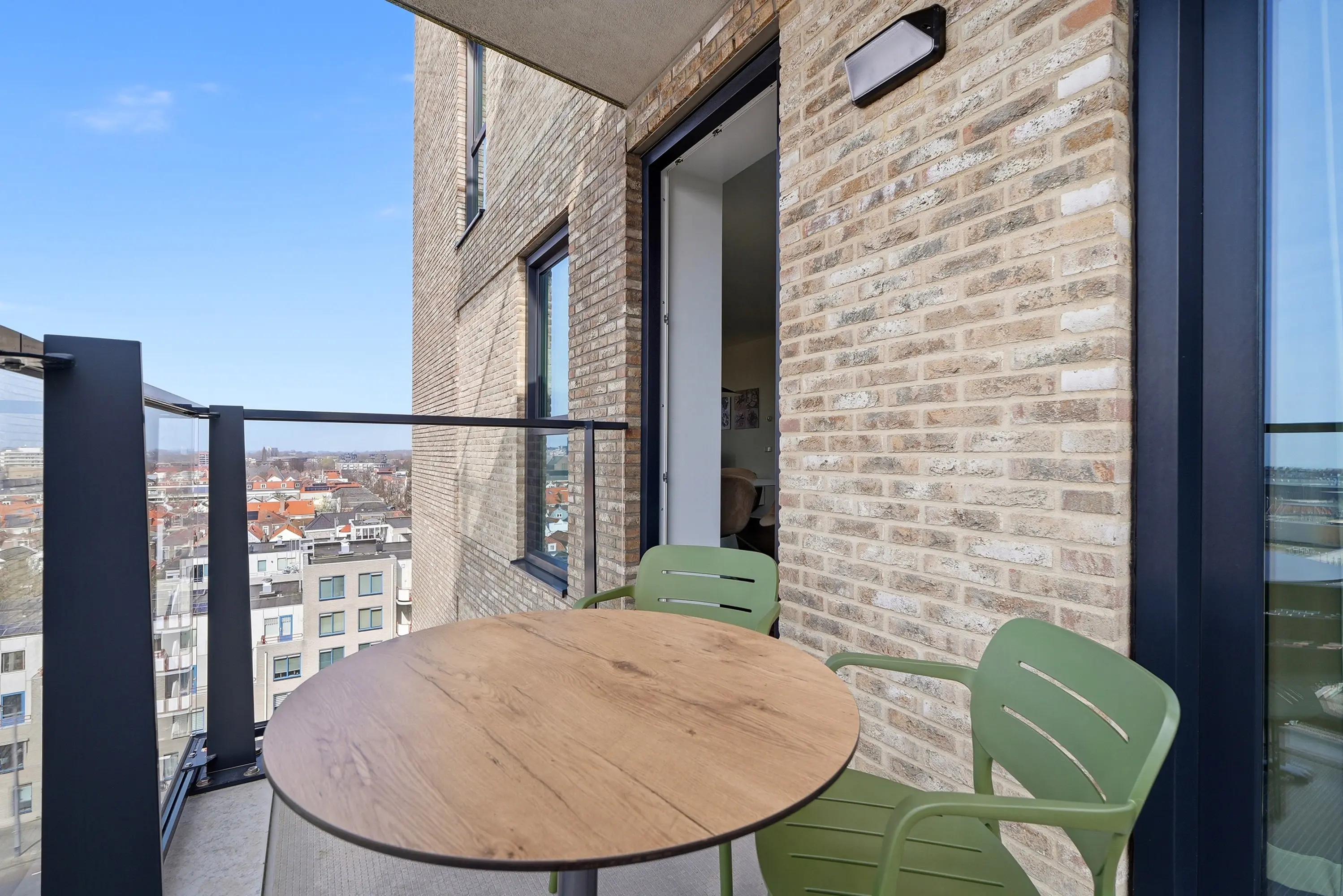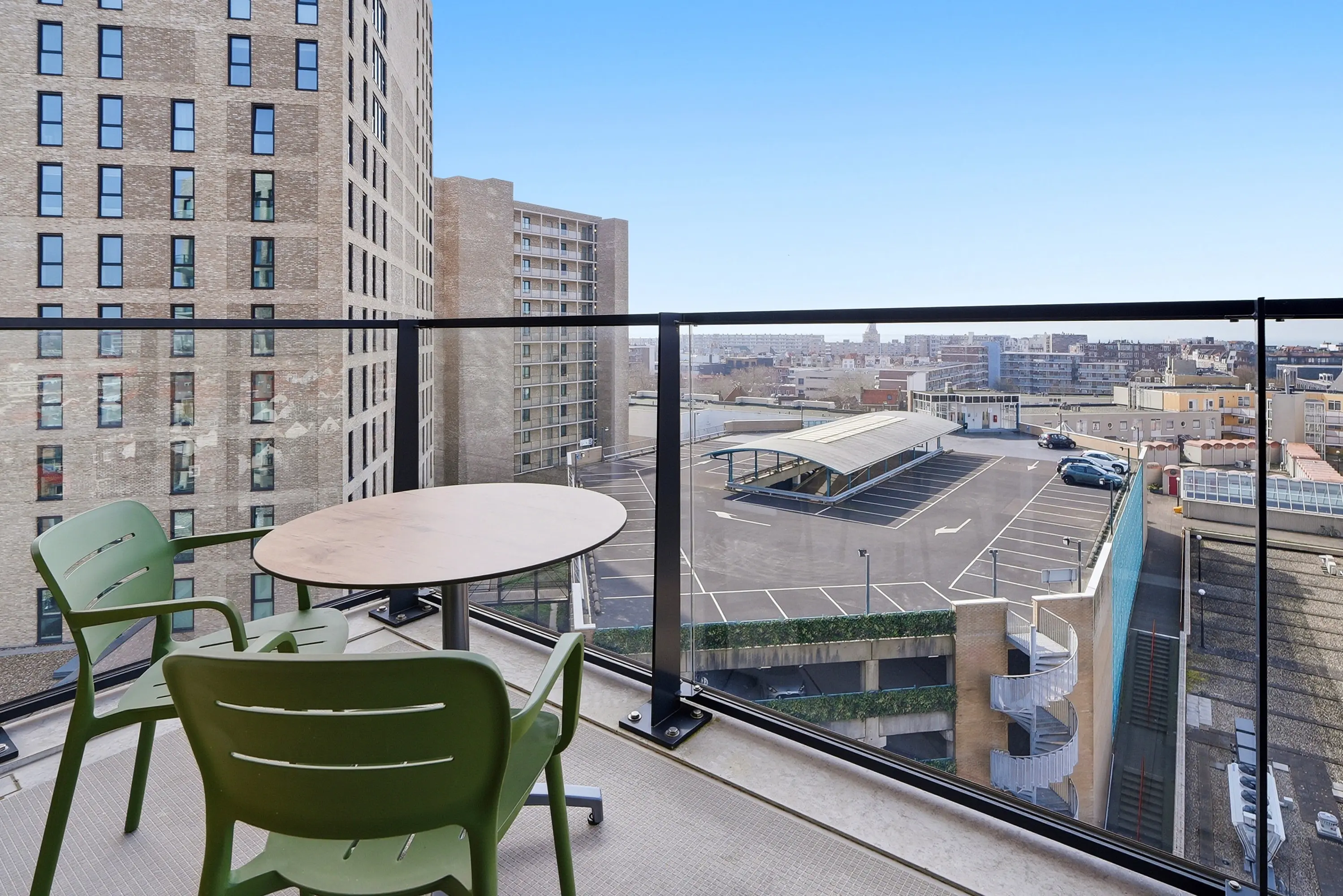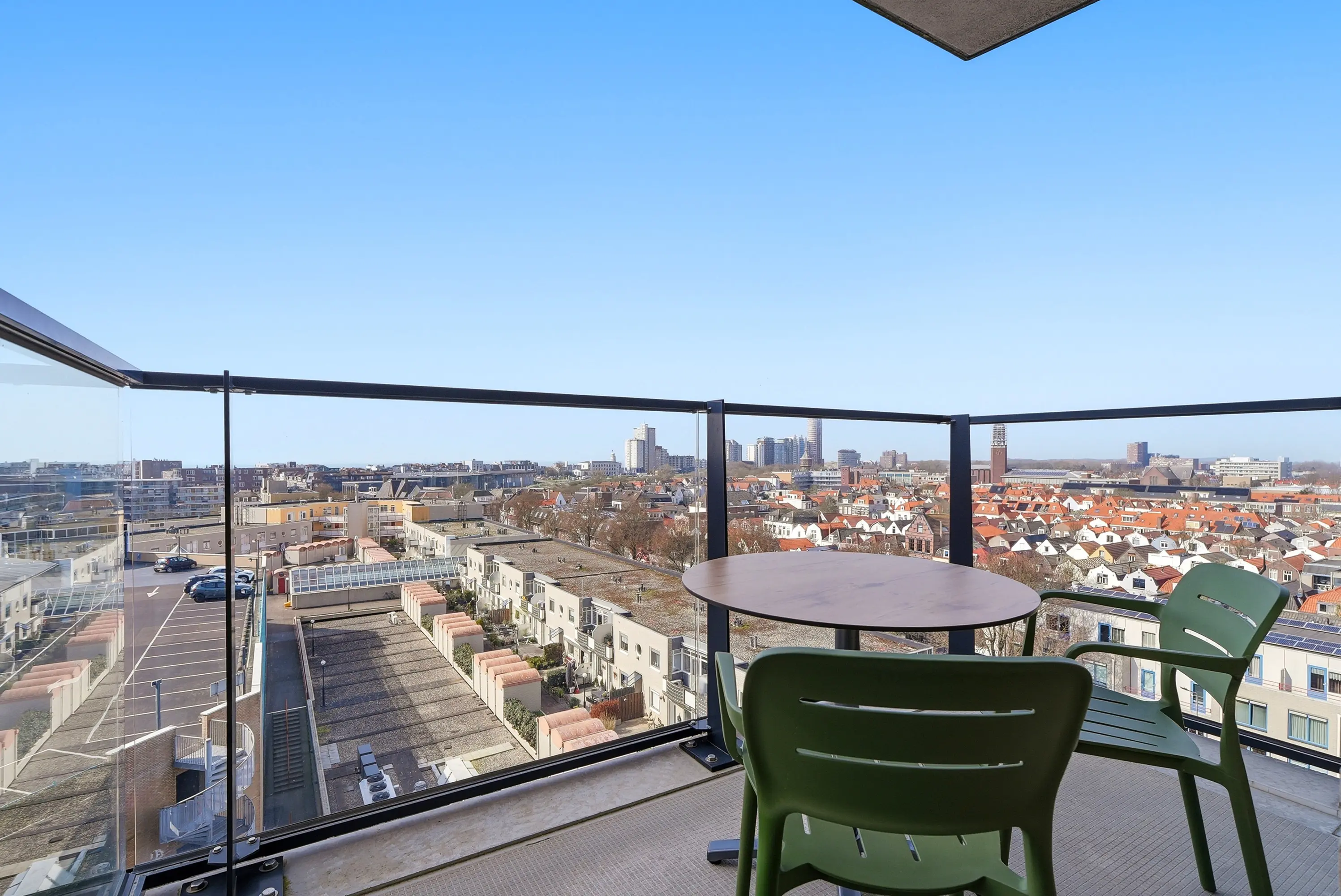 Vanuit de woonruimte en vanaf het balkon ontvouwt zich een prachtig uitzicht richting de oude binnenstad, de boulevard en de duinen. De ligging biedt een unieke balans tussen levendigheid en privacy. U woont hier midden in de stad, maar ervaart tegelijkertijd rust en ruimte.